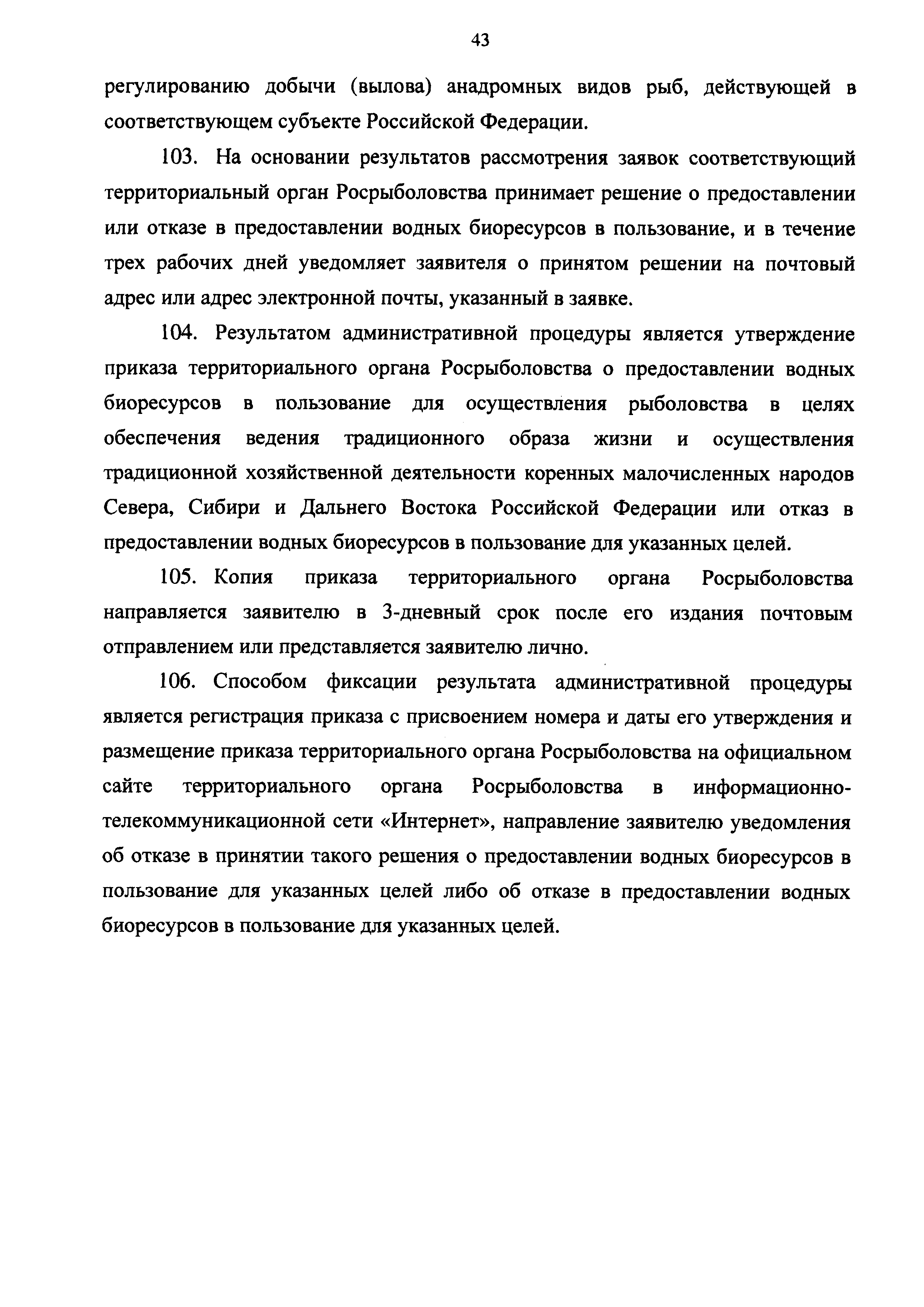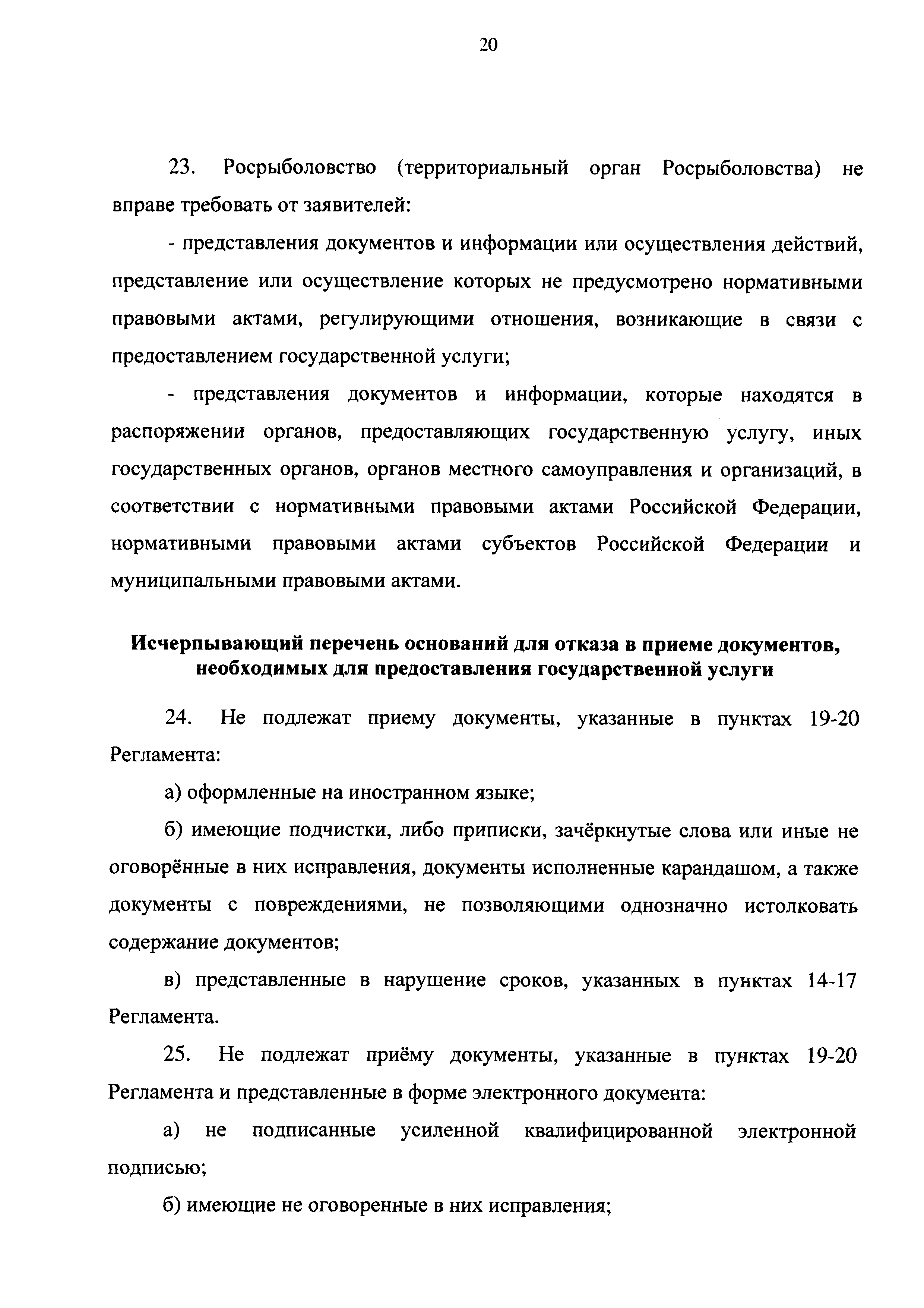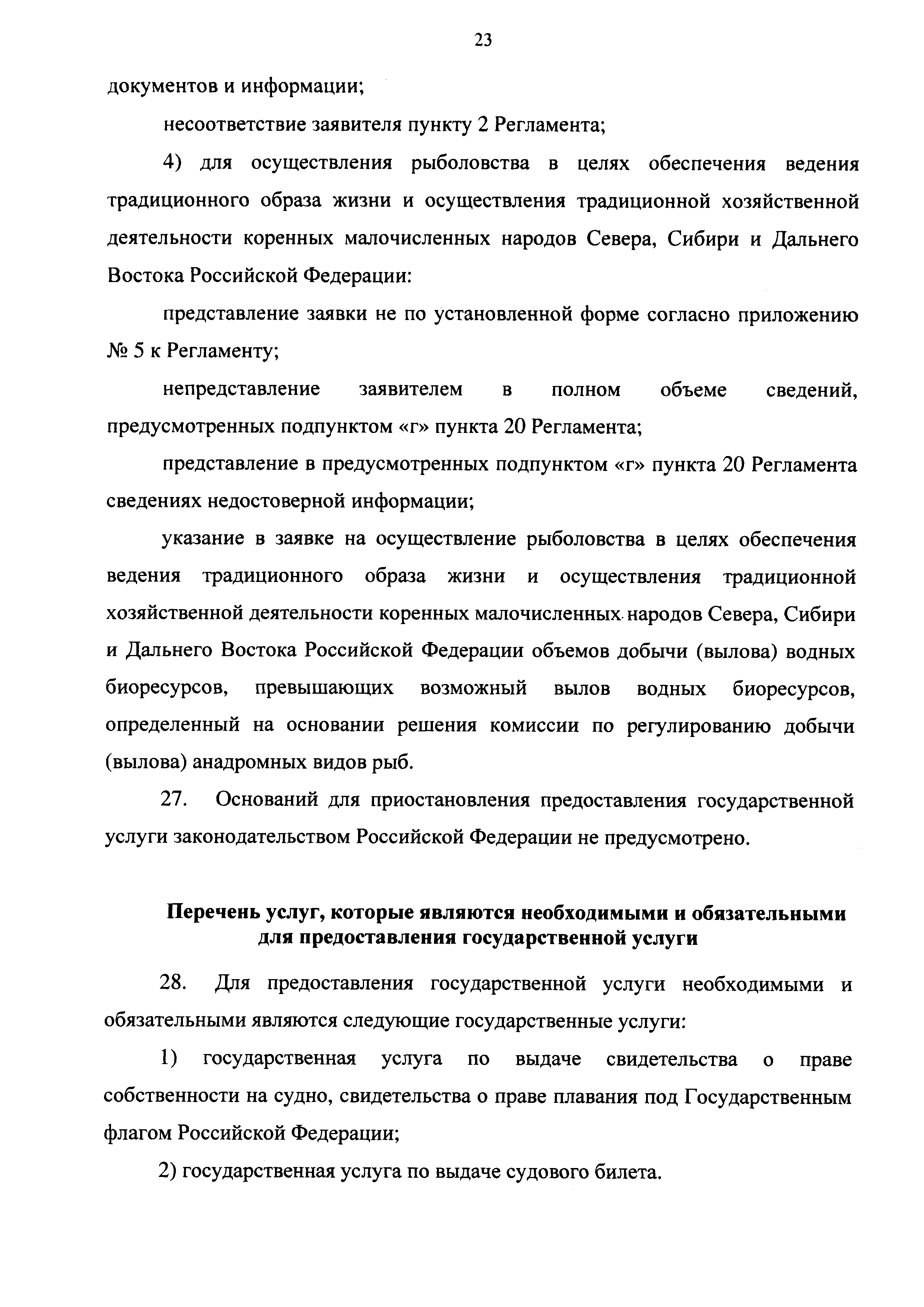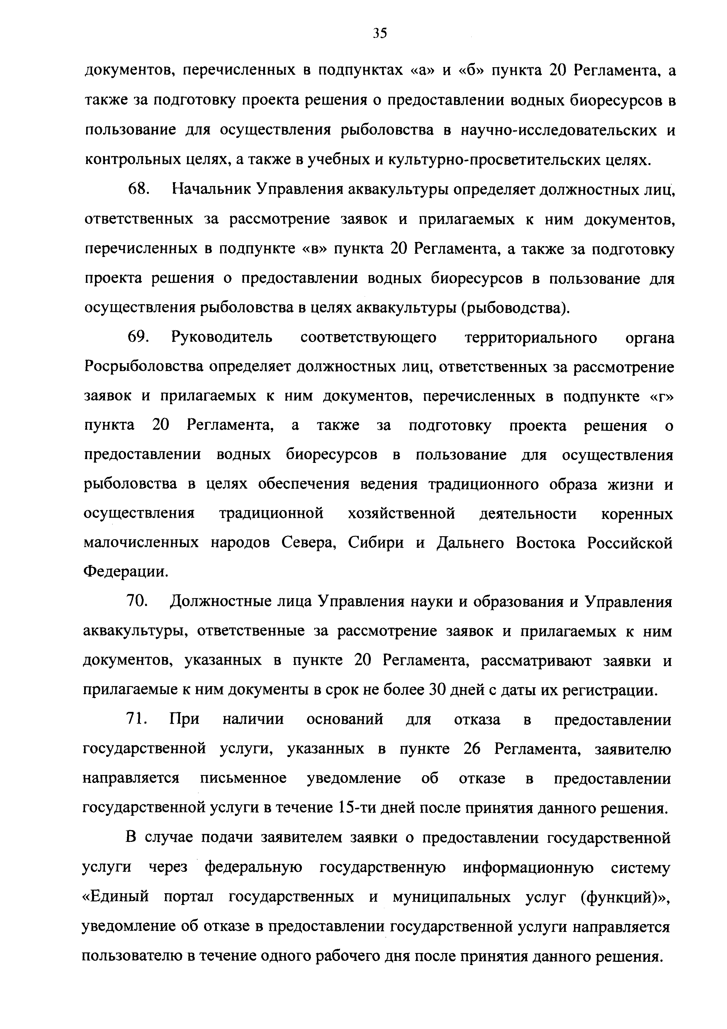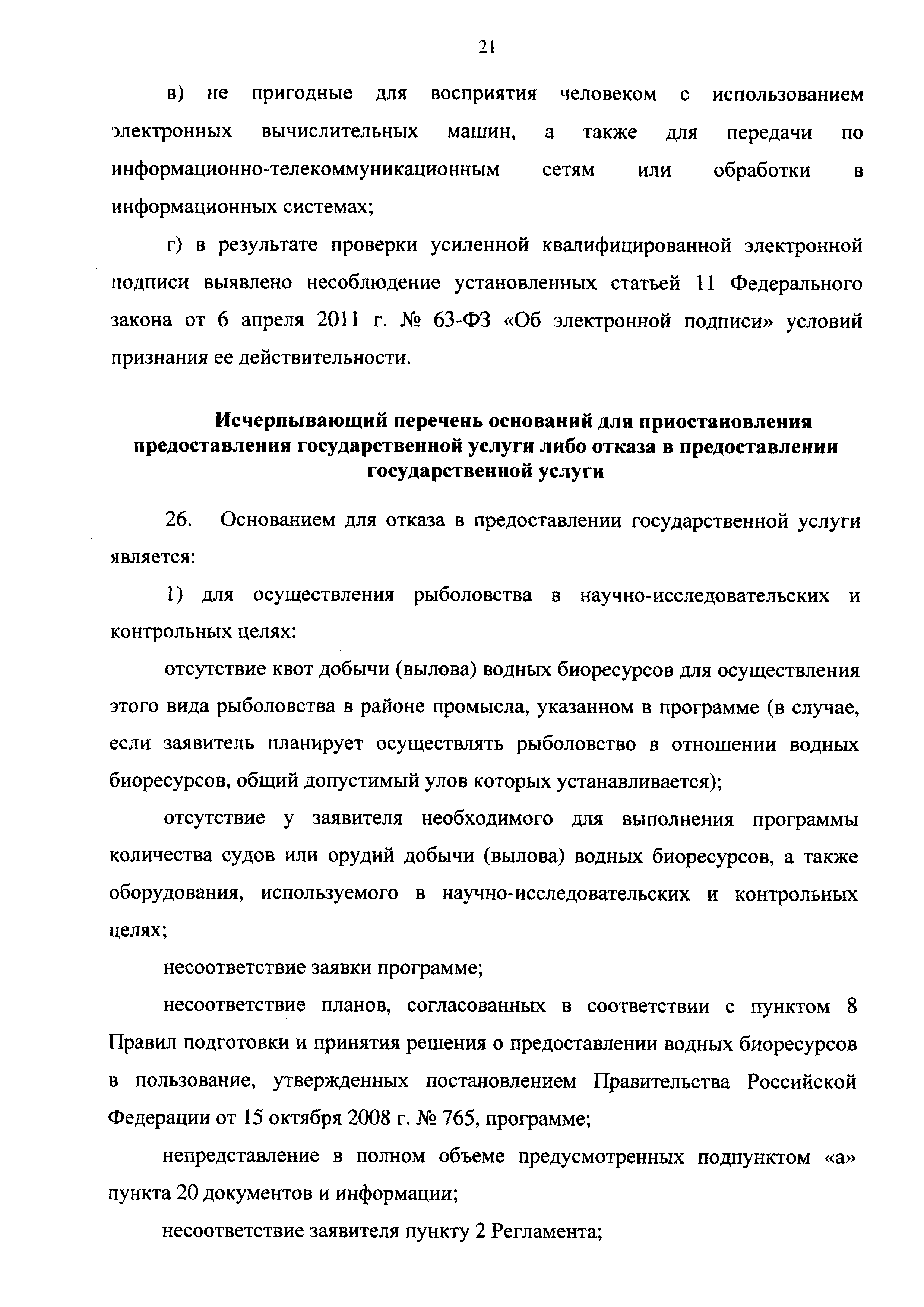 | | Нормативные ссылки: |   Федеральный закон 181-ФЗ «О социальной защите инвалидов в Российской Федерации» Кодекс «Кодекс внутреннего водного транспорта Российской Федерации» «Правила подготовки и принятия решения о предоставлении водных биологических ресурсов в пользование»  Федеральный закон 152-ФЗ «О персональных данных»  Федеральный закон 59-ФЗ «О порядке рассмотрения обращений граждан Российской Федерации»  Федеральный закон 63-ФЗ «Об электронной подписи»  Федеральный закон 166-ФЗ «О рыболовстве и сохранении водных биологических ресурсов» Постановление 373 «О разработке и утверждении административных регламентов осуществления государственного контроля (надзора) и административных регламентов предоставления государственных услуг»  «Требования к предоставлению в электронной форме государственных и муниципальных услуг» Распоряжение 631-р «Об утверждении перечня мест традиционного проживания и традиционной хозяйственной деятельности коренных малочисленных народов Российской Федерации и перечня видов традиционной хозяйственной деятельности коренных малочисленных народов Российской Федерации»  Федеральный закон 57-ФЗ «О порядке осуществления иностранных инвестиций в хозяйственные общества, имеющие стратегическое значение для обеспечения обороны страны и безопасности государства» Постановление 352 «Об утверждении перечня услуг, которые являются необходимыми и обязательными для предоставления федеральными органами исполнительной власти, Государственной корпорацией по атомной энергии "Росатом" государственных услуг и предоставляются организациями, участвующими в предоставлении государственных услуг, и определении размера платы за их оказание» «Положение о единой системе межведомственного электронного взаимодействия» «Правила подачи и рассмотрения жалоб на решения и действия (бездействие) федеральных органов исполнительной власти и их должностных лиц, федеральных государственных служащих, должностных лиц государственных внебюджетных фондов Российской Федерации, государственных корпораций, наделенных в соответствии с федеральными законами полномочиями по предоставлению государственных услуг в установленной сфере деятельности, и их должностных лиц, организаций, предусмотренных частью 1.1 статьи 16 Федерального закона "Об организации предоставления государственных и муниципальных услуг", и их работников, а также многофункциональных центров предоставления государственных и муниципальных услуг и их работников»  «Правила использования усиленной квалифицированной электронной подписи при обращении за получением государственных и муниципальных услуг»  Постановление 444 «О Федеральном агентстве по рыболовству» «Правила организации искусственного воспроизводства водных биологических ресурсов»