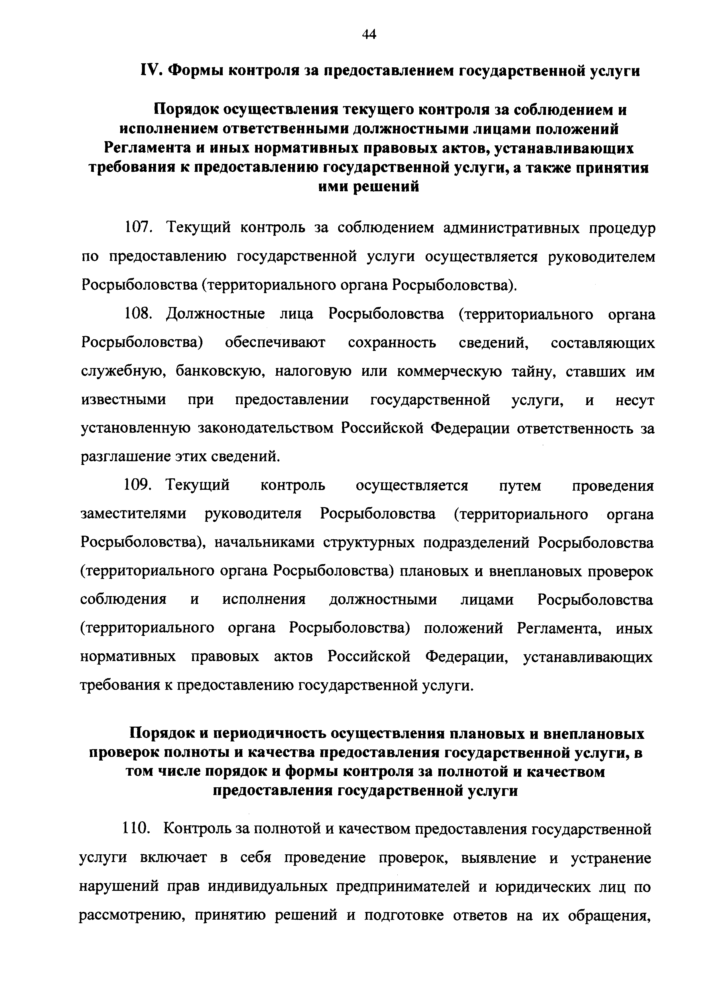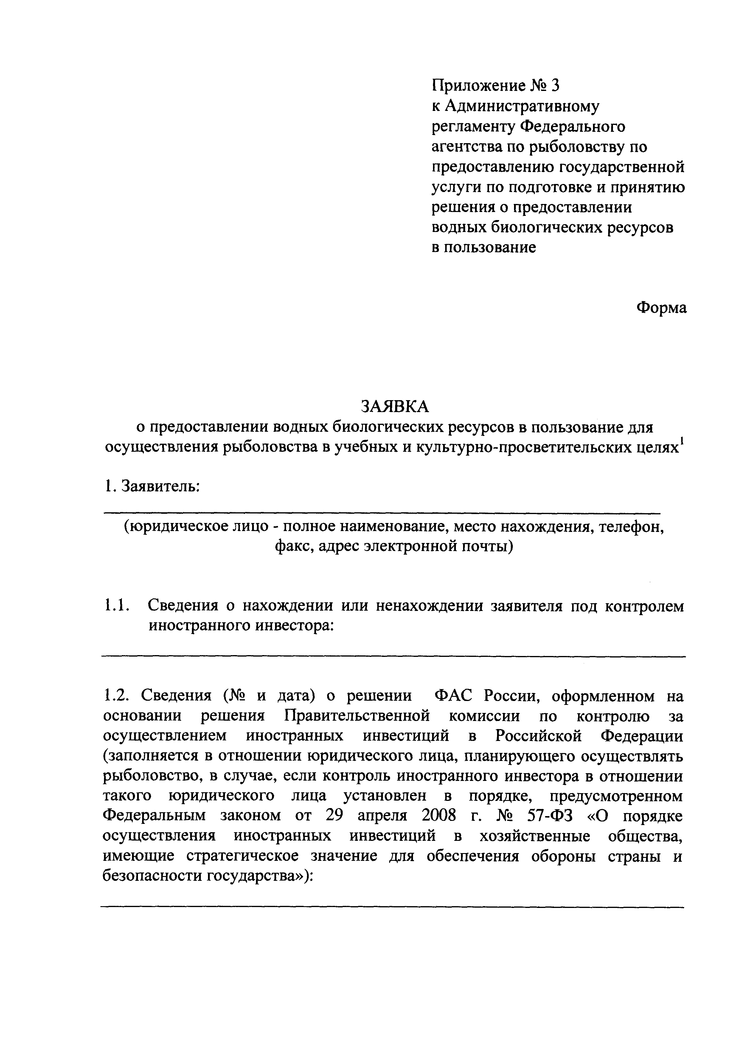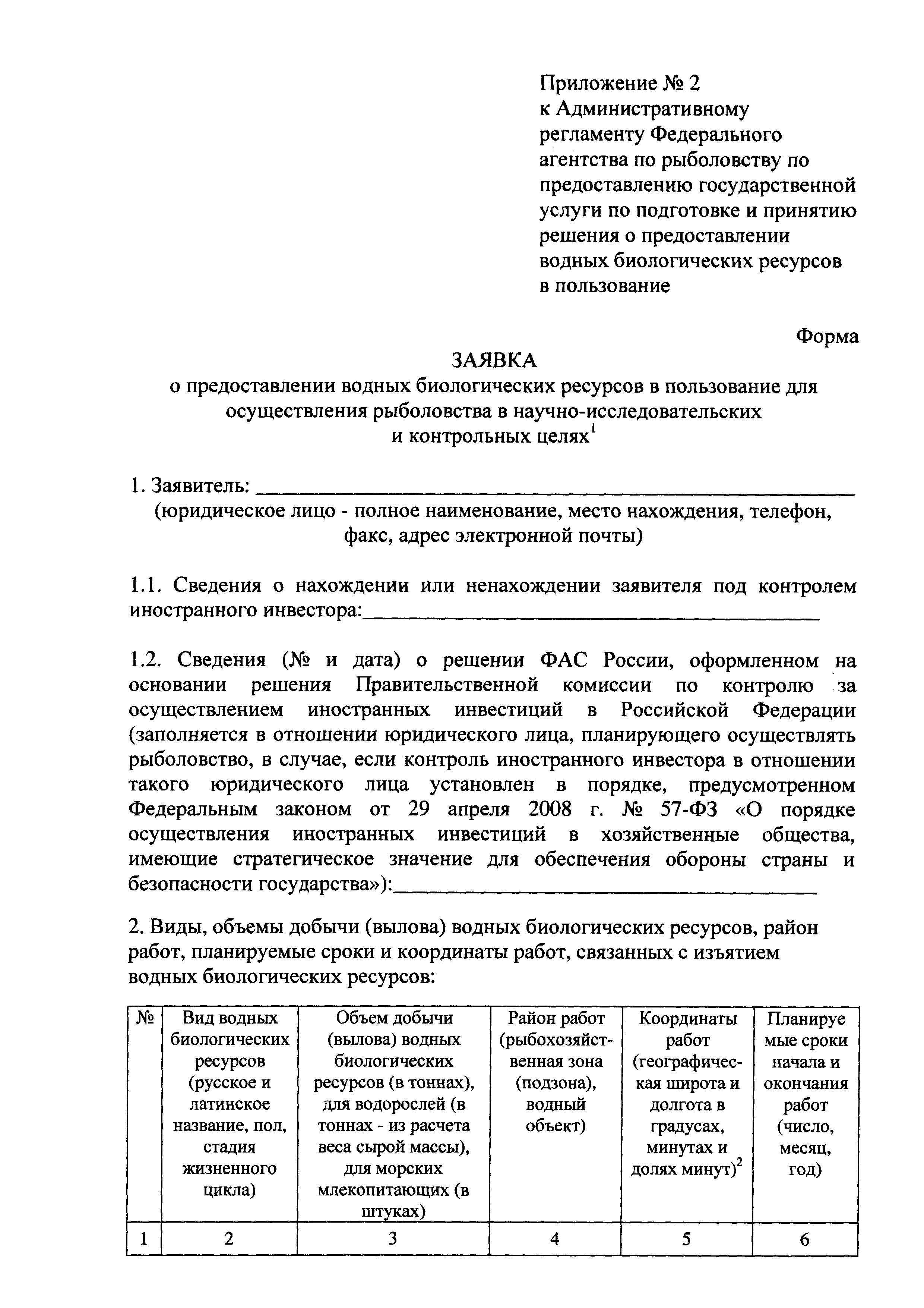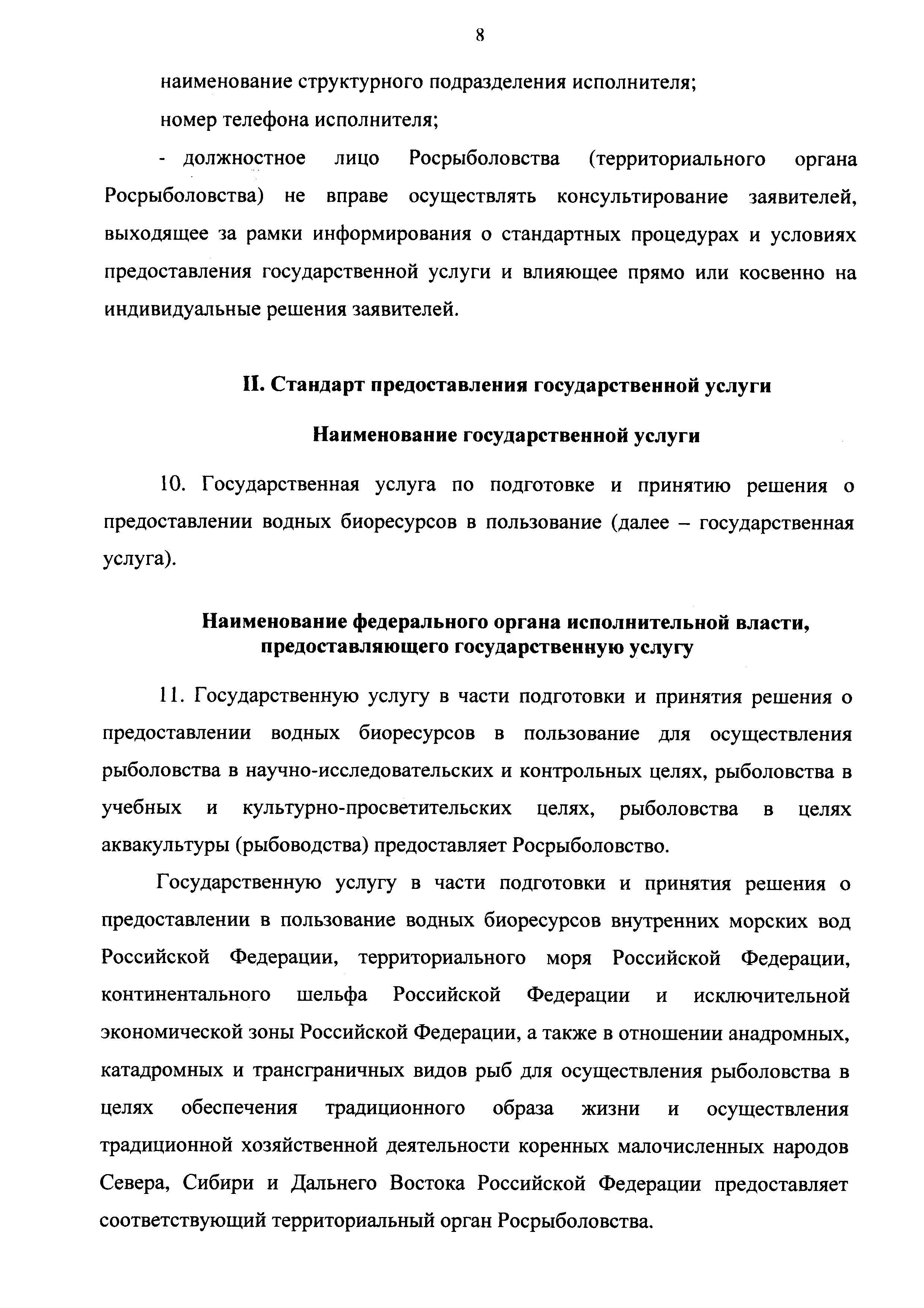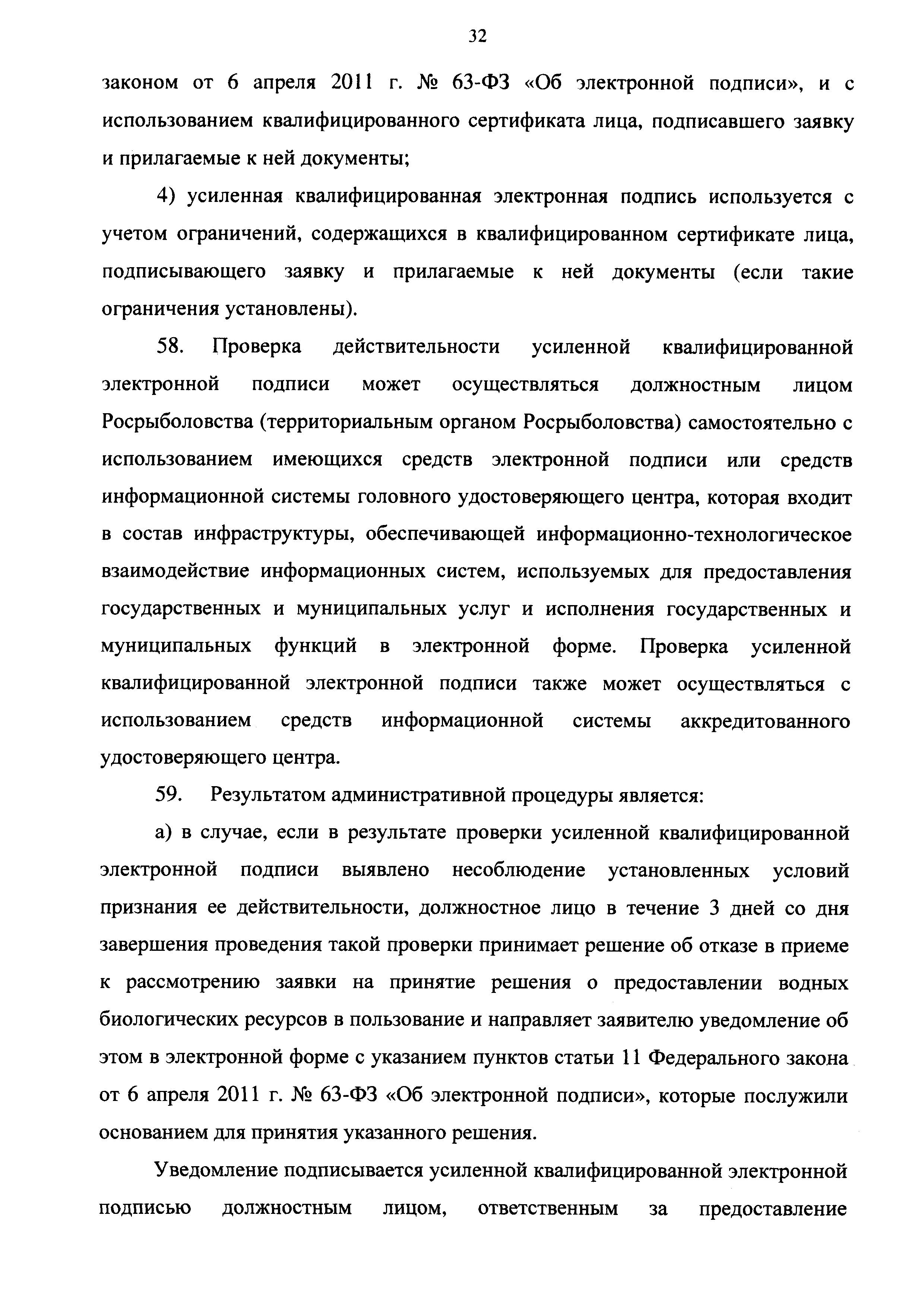 | | Нормативные ссылки: |   Федеральный закон 181-ФЗ «О социальной защите инвалидов в Российской Федерации» Кодекс «Кодекс внутреннего водного транспорта Российской Федерации» «Правила подготовки и принятия решения о предоставлении водных биологических ресурсов в пользование»  Федеральный закон 152-ФЗ «О персональных данных»  Федеральный закон 59-ФЗ «О порядке рассмотрения обращений граждан Российской Федерации»  Федеральный закон 63-ФЗ «Об электронной подписи»  Федеральный закон 166-ФЗ «О рыболовстве и сохранении водных биологических ресурсов» Постановление 373 «О разработке и утверждении административных регламентов осуществления государственного контроля (надзора) и административных регламентов предоставления государственных услуг»  «Требования к предоставлению в электронной форме государственных и муниципальных услуг» Распоряжение 631-р «Об утверждении перечня мест традиционного проживания и традиционной хозяйственной деятельности коренных малочисленных народов Российской Федерации и перечня видов традиционной хозяйственной деятельности коренных малочисленных народов Российской Федерации»  Федеральный закон 57-ФЗ «О порядке осуществления иностранных инвестиций в хозяйственные общества, имеющие стратегическое значение для обеспечения обороны страны и безопасности государства» Постановление 352 «Об утверждении перечня услуг, которые являются необходимыми и обязательными для предоставления федеральными органами исполнительной власти, Государственной корпорацией по атомной энергии "Росатом" государственных услуг и предоставляются организациями, участвующими в предоставлении государственных услуг, и определении размера платы за их оказание» «Положение о единой системе межведомственного электронного взаимодействия» «Правила подачи и рассмотрения жалоб на решения и действия (бездействие) федеральных органов исполнительной власти и их должностных лиц, федеральных государственных служащих, должностных лиц государственных внебюджетных фондов Российской Федерации, государственных корпораций, наделенных в соответствии с федеральными законами полномочиями по предоставлению государственных услуг в установленной сфере деятельности, и их должностных лиц, организаций, предусмотренных частью 1.1 статьи 16 Федерального закона "Об организации предоставления государственных и муниципальных услуг", и их работников, а также многофункциональных центров предоставления государственных и муниципальных услуг и их работников»  «Правила использования усиленной квалифицированной электронной подписи при обращении за получением государственных и муниципальных услуг»  Постановление 444 «О Федеральном агентстве по рыболовству» «Правила организации искусственного воспроизводства водных биологических ресурсов»