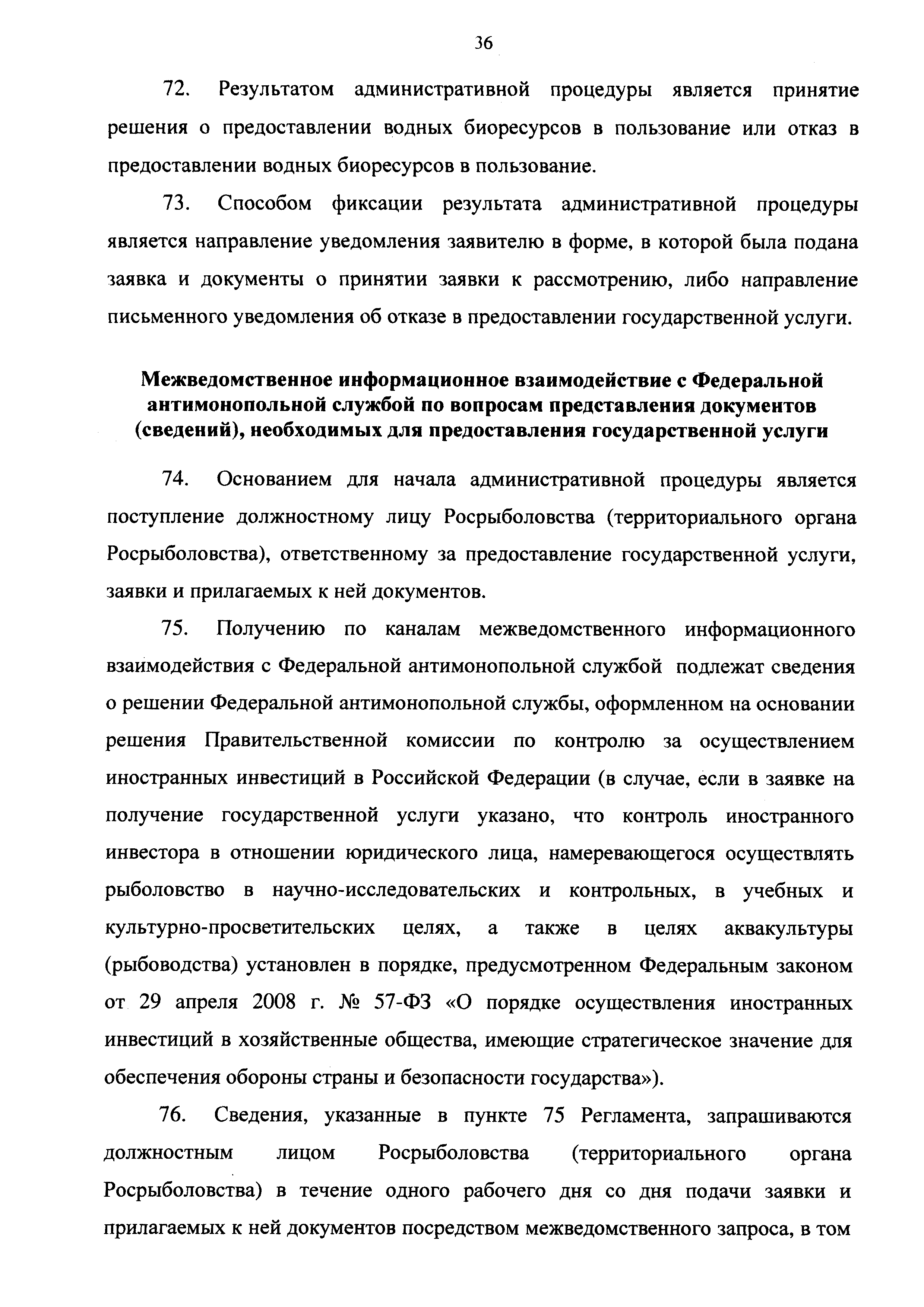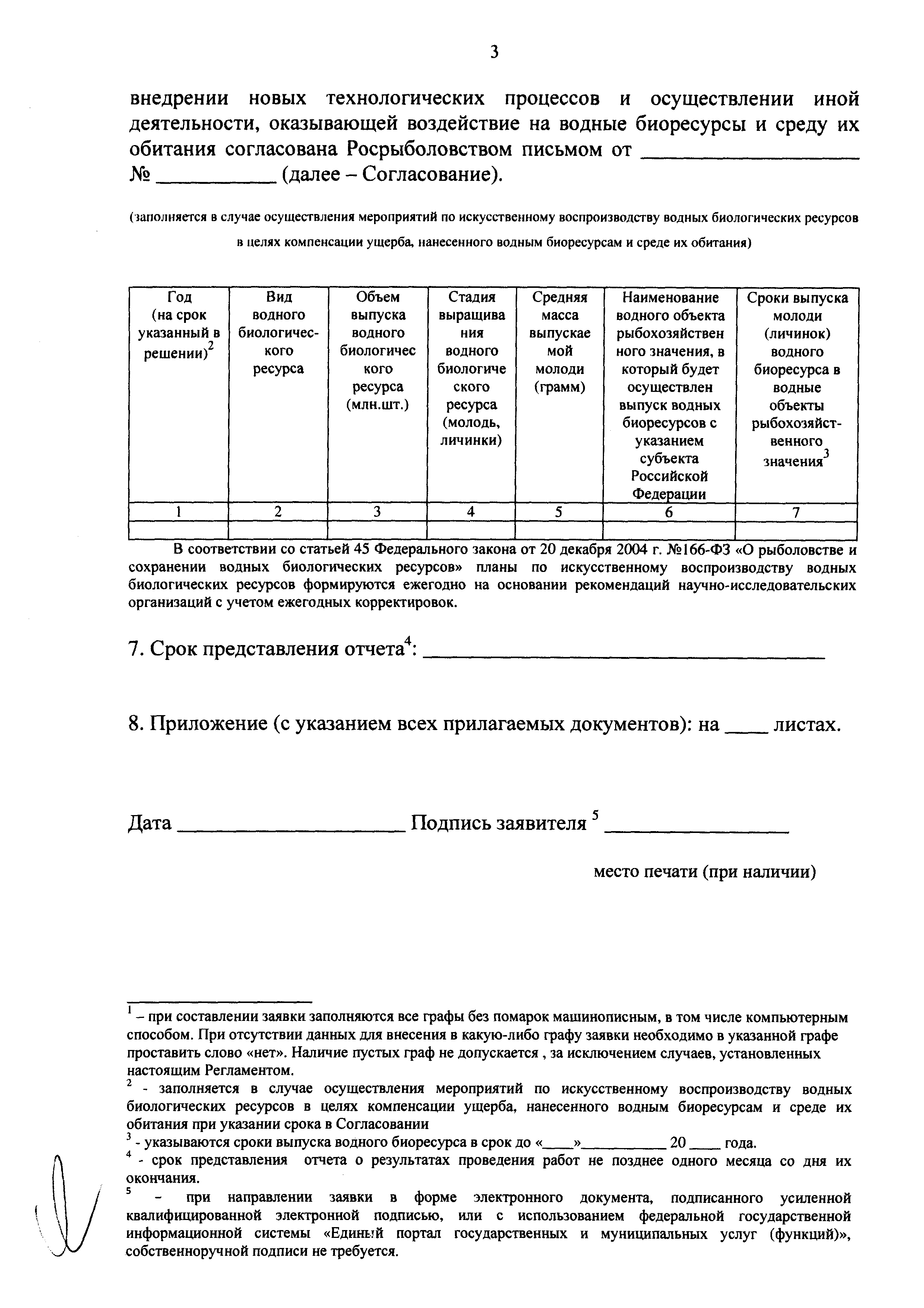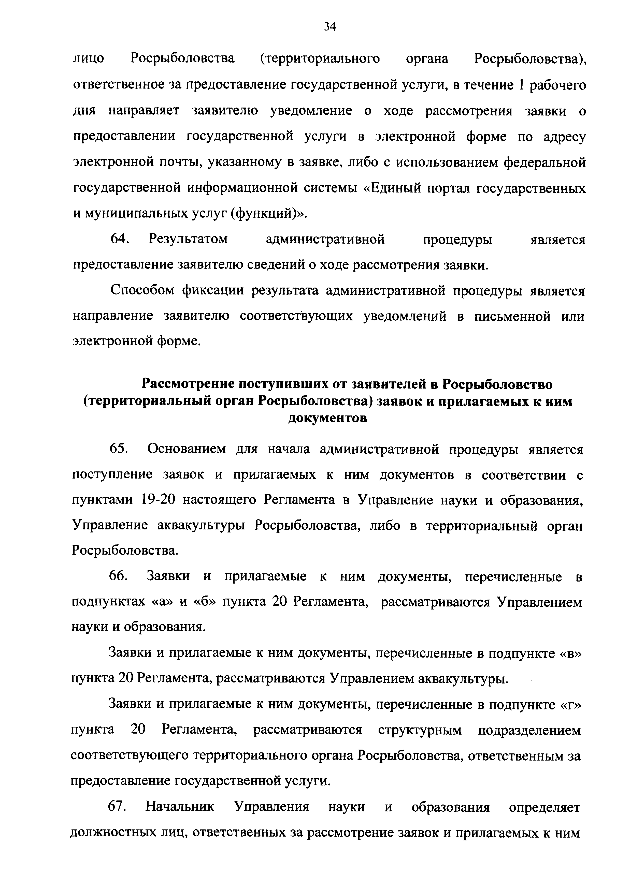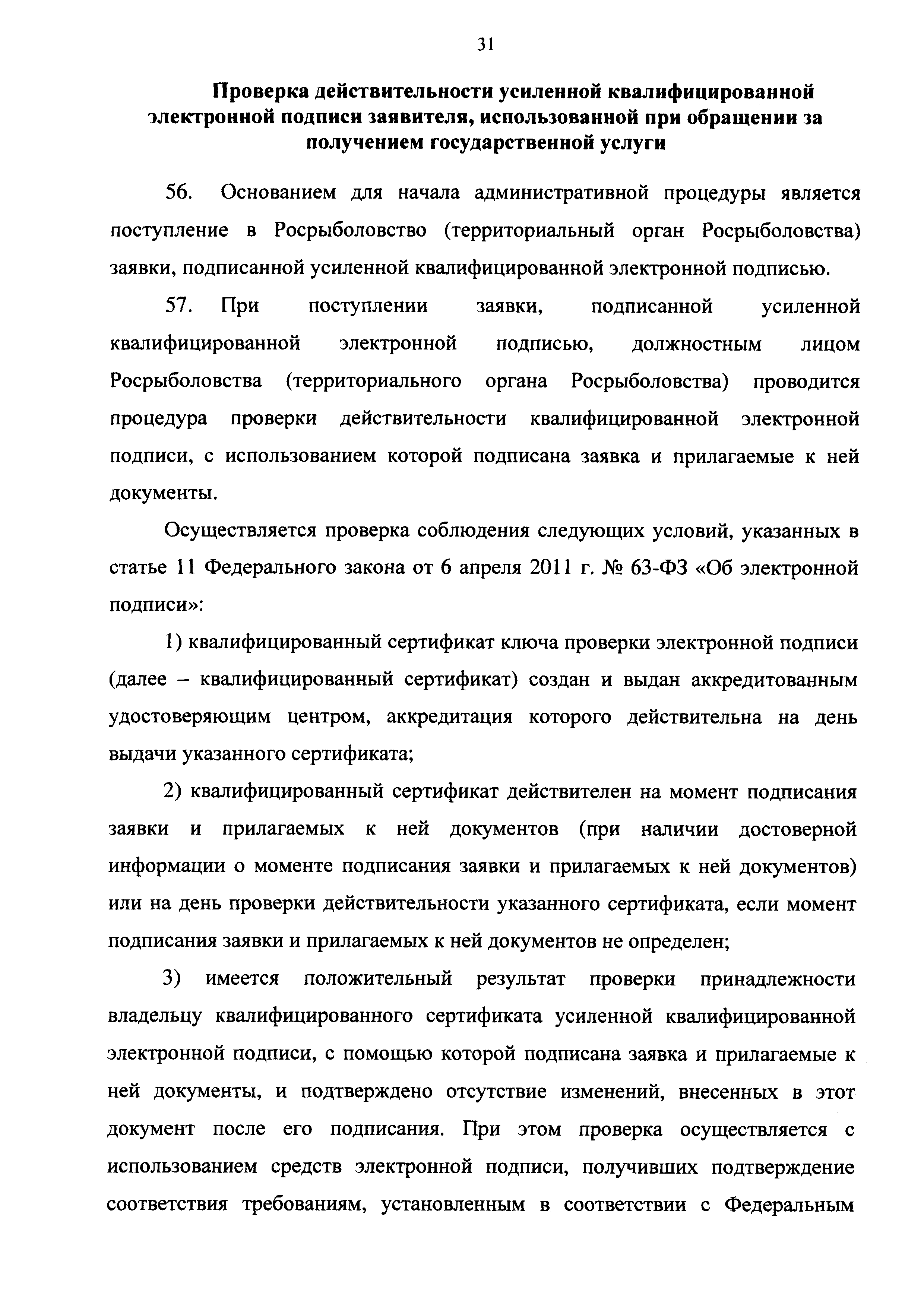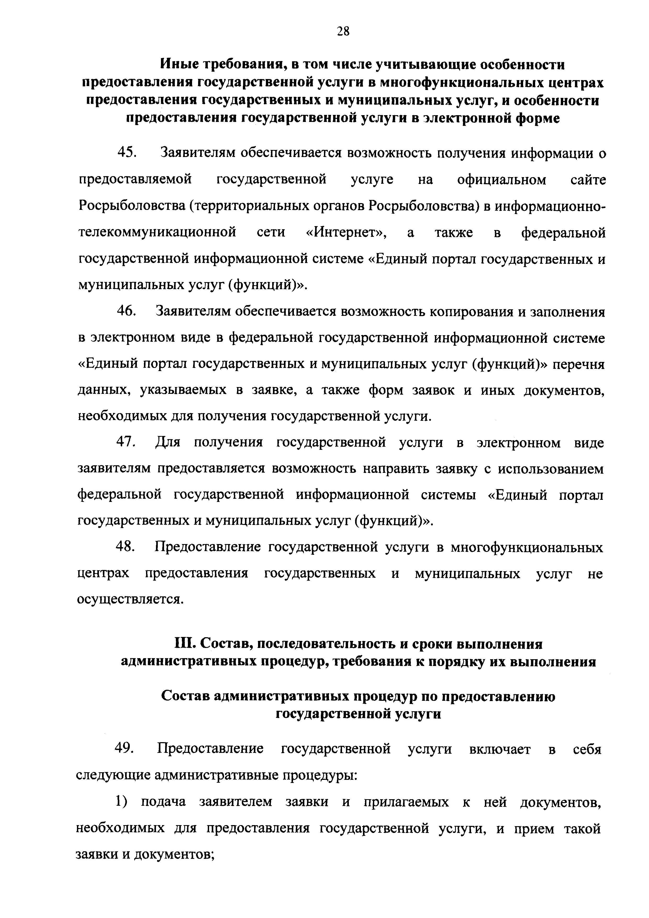 | | Нормативные ссылки: |   Федеральный закон 181-ФЗ «О социальной защите инвалидов в Российской Федерации» Кодекс «Кодекс внутреннего водного транспорта Российской Федерации» «Правила подготовки и принятия решения о предоставлении водных биологических ресурсов в пользование»  Федеральный закон 152-ФЗ «О персональных данных»  Федеральный закон 59-ФЗ «О порядке рассмотрения обращений граждан Российской Федерации»  Федеральный закон 63-ФЗ «Об электронной подписи»  Федеральный закон 166-ФЗ «О рыболовстве и сохранении водных биологических ресурсов» Постановление 373 «О разработке и утверждении административных регламентов осуществления государственного контроля (надзора) и административных регламентов предоставления государственных услуг»  «Требования к предоставлению в электронной форме государственных и муниципальных услуг» Распоряжение 631-р «Об утверждении перечня мест традиционного проживания и традиционной хозяйственной деятельности коренных малочисленных народов Российской Федерации и перечня видов традиционной хозяйственной деятельности коренных малочисленных народов Российской Федерации»  Федеральный закон 57-ФЗ «О порядке осуществления иностранных инвестиций в хозяйственные общества, имеющие стратегическое значение для обеспечения обороны страны и безопасности государства» Постановление 352 «Об утверждении перечня услуг, которые являются необходимыми и обязательными для предоставления федеральными органами исполнительной власти, Государственной корпорацией по атомной энергии "Росатом" государственных услуг и предоставляются организациями, участвующими в предоставлении государственных услуг, и определении размера платы за их оказание» «Положение о единой системе межведомственного электронного взаимодействия» «Правила подачи и рассмотрения жалоб на решения и действия (бездействие) федеральных органов исполнительной власти и их должностных лиц, федеральных государственных служащих, должностных лиц государственных внебюджетных фондов Российской Федерации, государственных корпораций, наделенных в соответствии с федеральными законами полномочиями по предоставлению государственных услуг в установленной сфере деятельности, и их должностных лиц, организаций, предусмотренных частью 1.1 статьи 16 Федерального закона "Об организации предоставления государственных и муниципальных услуг", и их работников, а также многофункциональных центров предоставления государственных и муниципальных услуг и их работников»  «Правила использования усиленной квалифицированной электронной подписи при обращении за получением государственных и муниципальных услуг»  Постановление 444 «О Федеральном агентстве по рыболовству» «Правила организации искусственного воспроизводства водных биологических ресурсов»