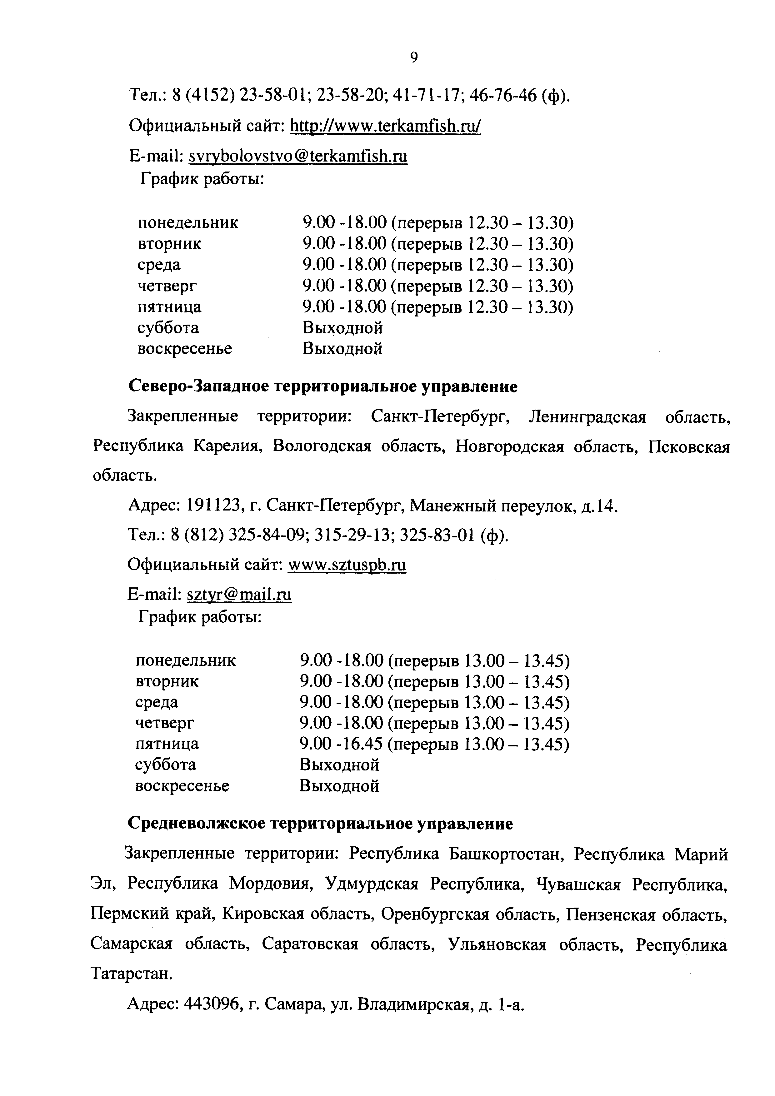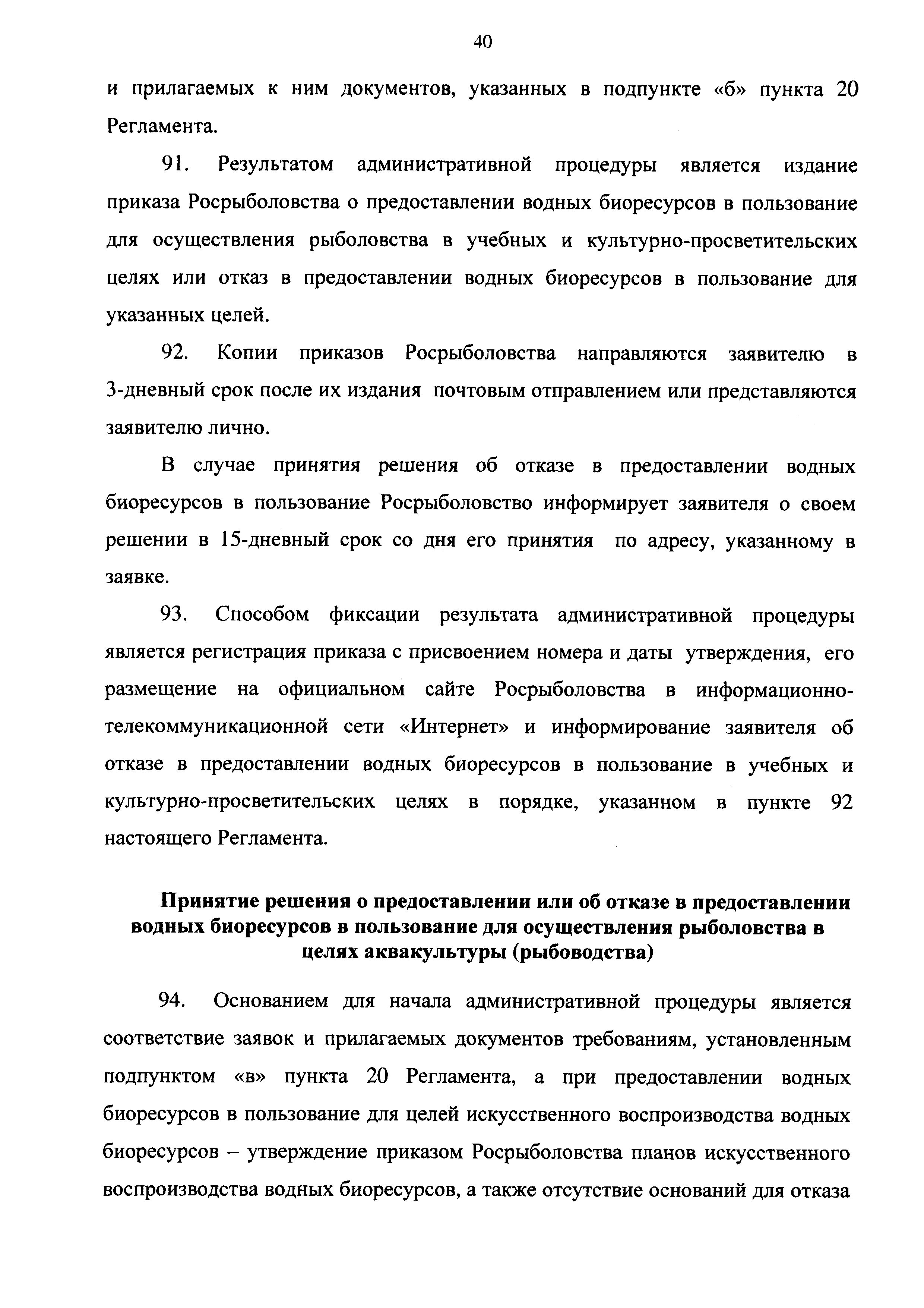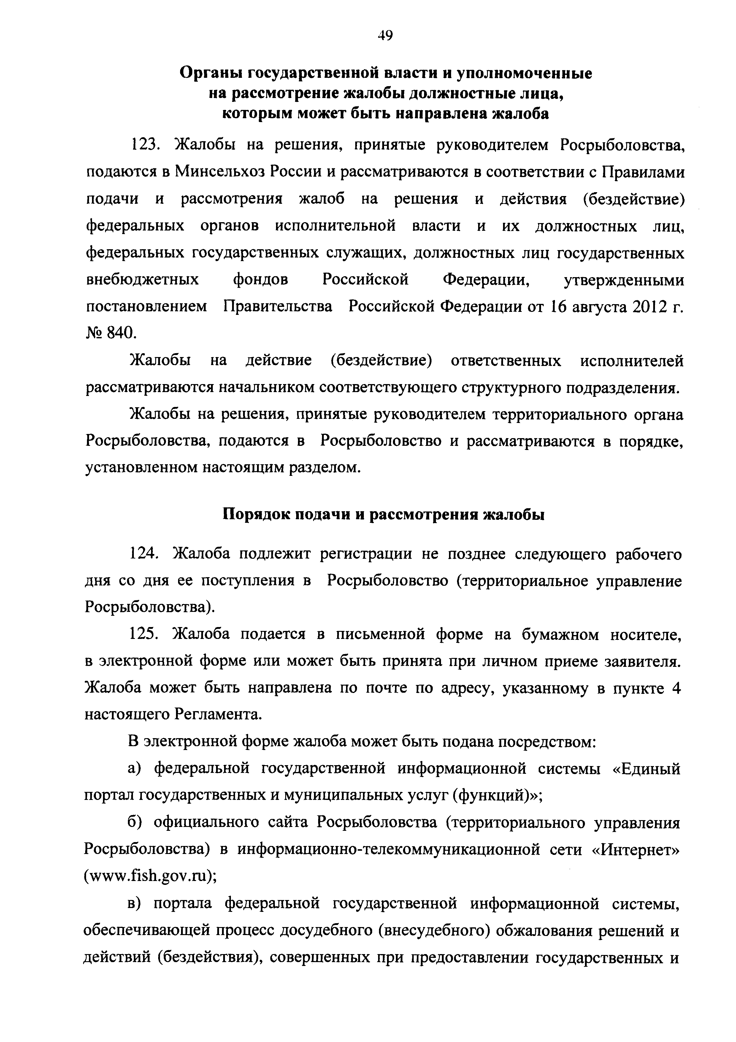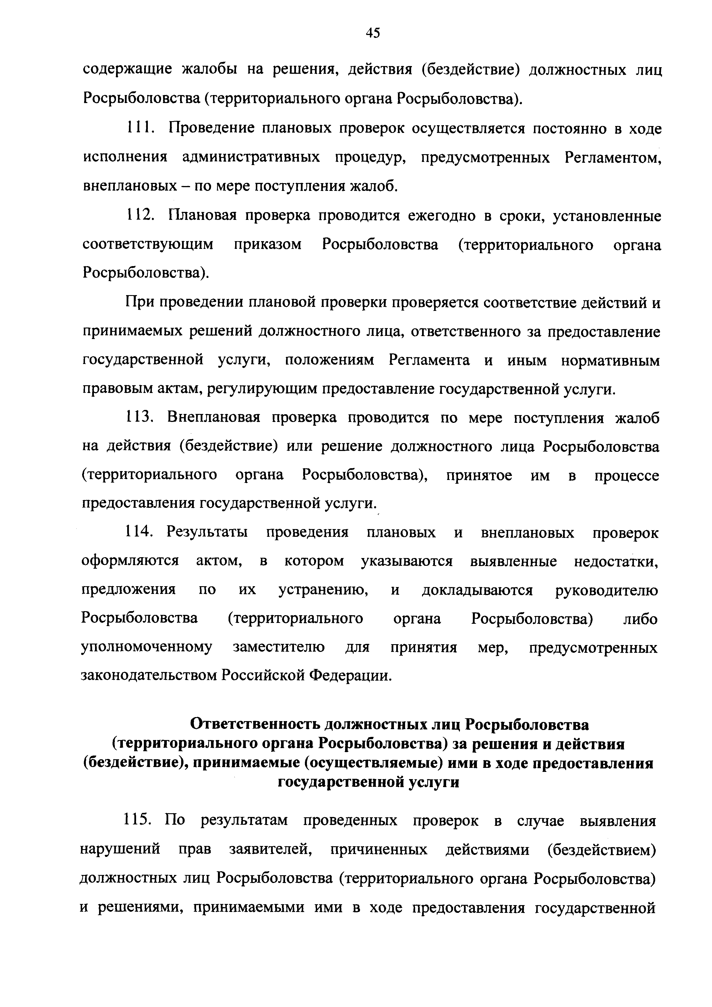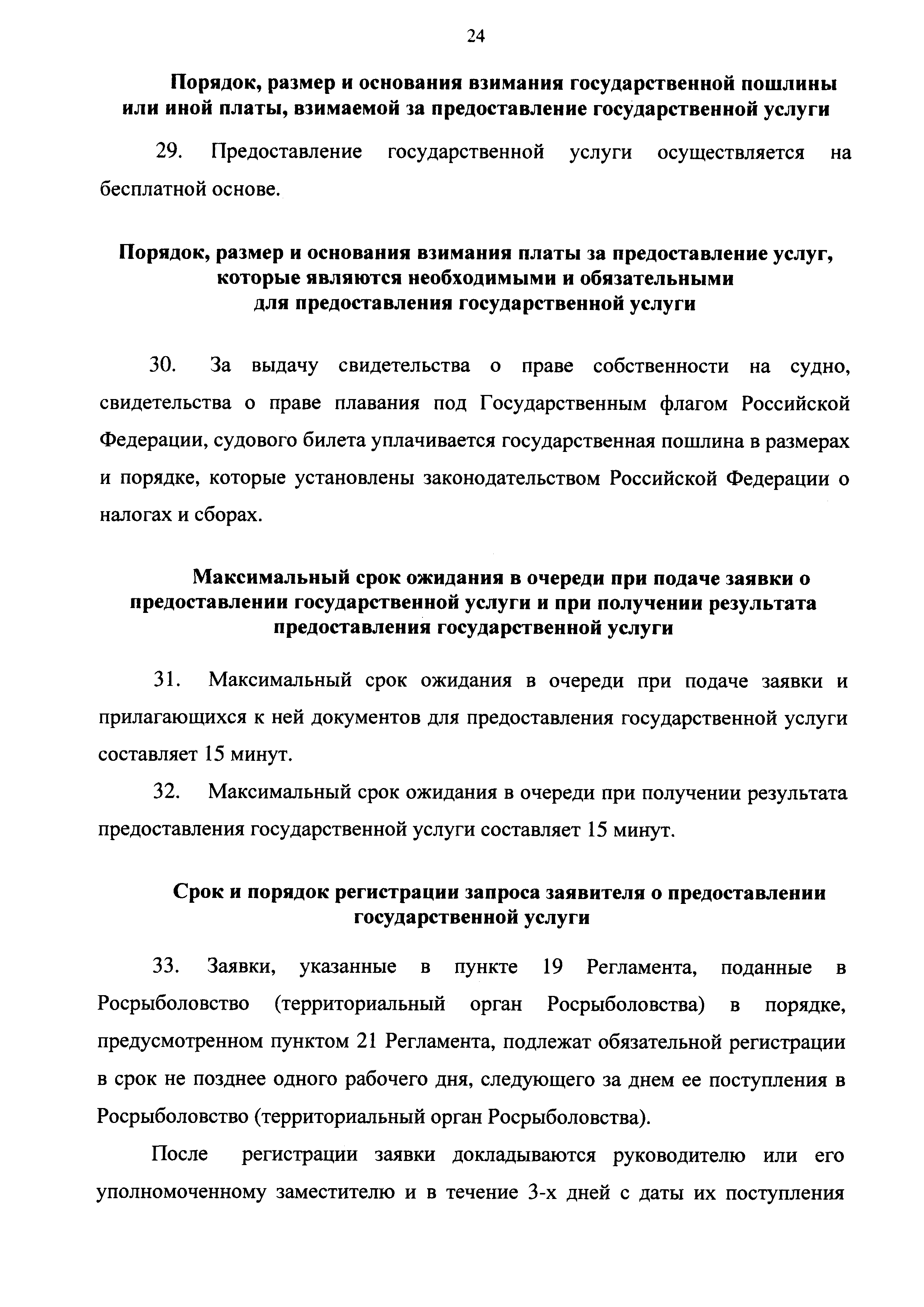 | | Нормативные ссылки: |   Федеральный закон 181-ФЗ «О социальной защите инвалидов в Российской Федерации» Кодекс «Кодекс внутреннего водного транспорта Российской Федерации» «Правила подготовки и принятия решения о предоставлении водных биологических ресурсов в пользование»  Федеральный закон 152-ФЗ «О персональных данных»  Федеральный закон 59-ФЗ «О порядке рассмотрения обращений граждан Российской Федерации»  Федеральный закон 63-ФЗ «Об электронной подписи»  Федеральный закон 166-ФЗ «О рыболовстве и сохранении водных биологических ресурсов» Постановление 373 «О разработке и утверждении административных регламентов осуществления государственного контроля (надзора) и административных регламентов предоставления государственных услуг»  «Требования к предоставлению в электронной форме государственных и муниципальных услуг» Распоряжение 631-р «Об утверждении перечня мест традиционного проживания и традиционной хозяйственной деятельности коренных малочисленных народов Российской Федерации и перечня видов традиционной хозяйственной деятельности коренных малочисленных народов Российской Федерации»  Федеральный закон 57-ФЗ «О порядке осуществления иностранных инвестиций в хозяйственные общества, имеющие стратегическое значение для обеспечения обороны страны и безопасности государства» Постановление 352 «Об утверждении перечня услуг, которые являются необходимыми и обязательными для предоставления федеральными органами исполнительной власти, Государственной корпорацией по атомной энергии "Росатом" государственных услуг и предоставляются организациями, участвующими в предоставлении государственных услуг, и определении размера платы за их оказание» «Положение о единой системе межведомственного электронного взаимодействия» «Правила подачи и рассмотрения жалоб на решения и действия (бездействие) федеральных органов исполнительной власти и их должностных лиц, федеральных государственных служащих, должностных лиц государственных внебюджетных фондов Российской Федерации, государственных корпораций, наделенных в соответствии с федеральными законами полномочиями по предоставлению государственных услуг в установленной сфере деятельности, и их должностных лиц, организаций, предусмотренных частью 1.1 статьи 16 Федерального закона "Об организации предоставления государственных и муниципальных услуг", и их работников, а также многофункциональных центров предоставления государственных и муниципальных услуг и их работников»  «Правила использования усиленной квалифицированной электронной подписи при обращении за получением государственных и муниципальных услуг»  Постановление 444 «О Федеральном агентстве по рыболовству» «Правила организации искусственного воспроизводства водных биологических ресурсов»