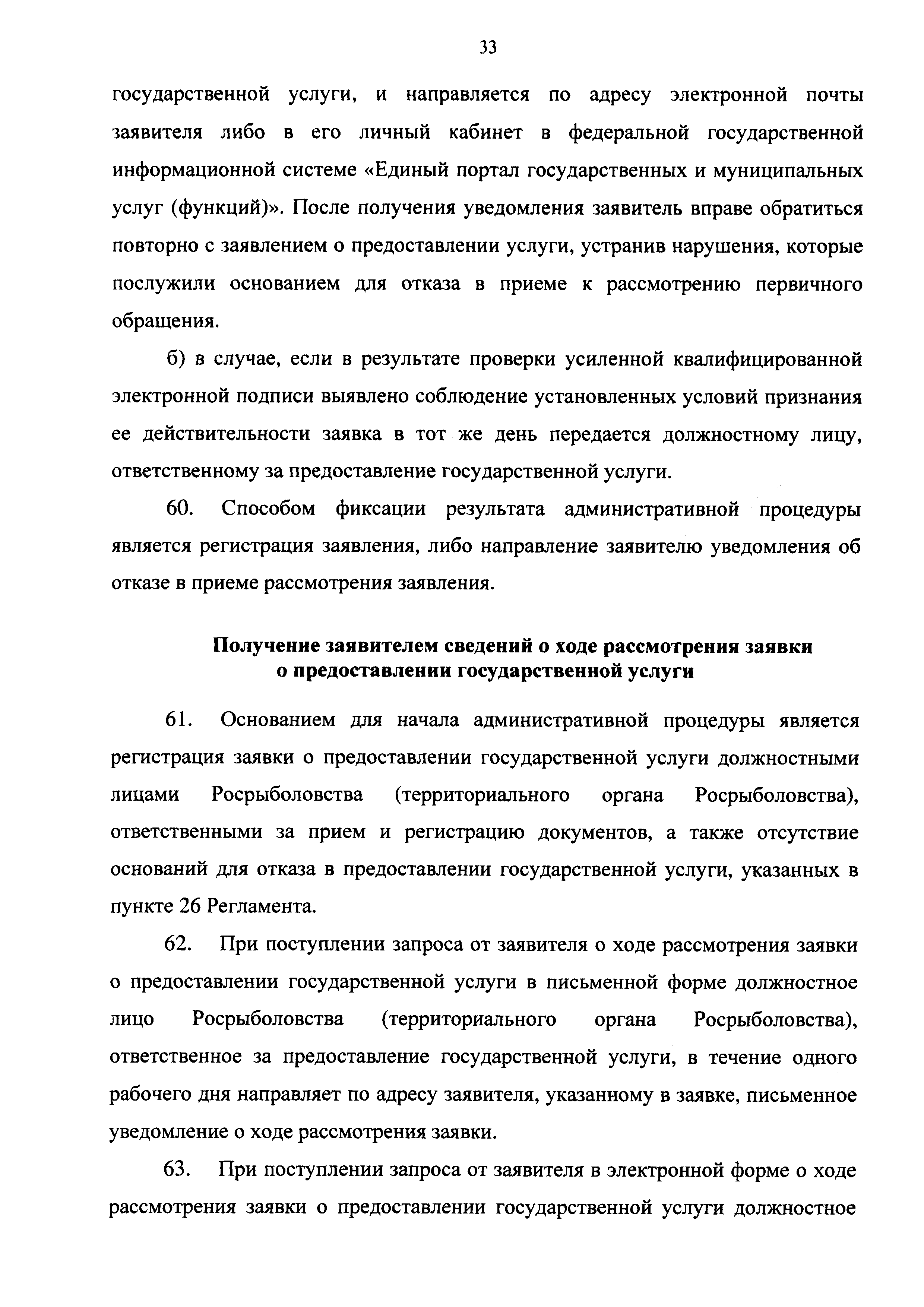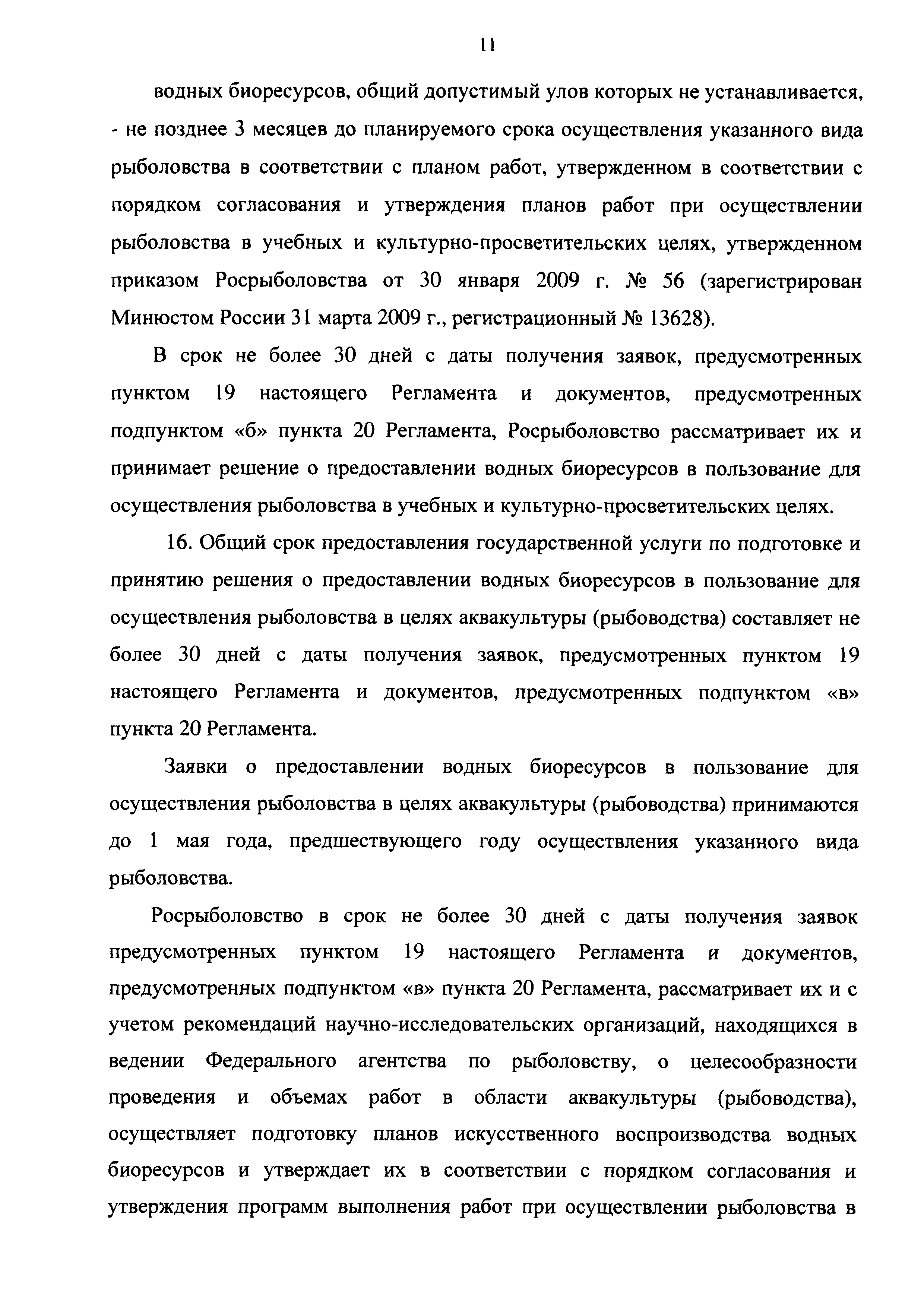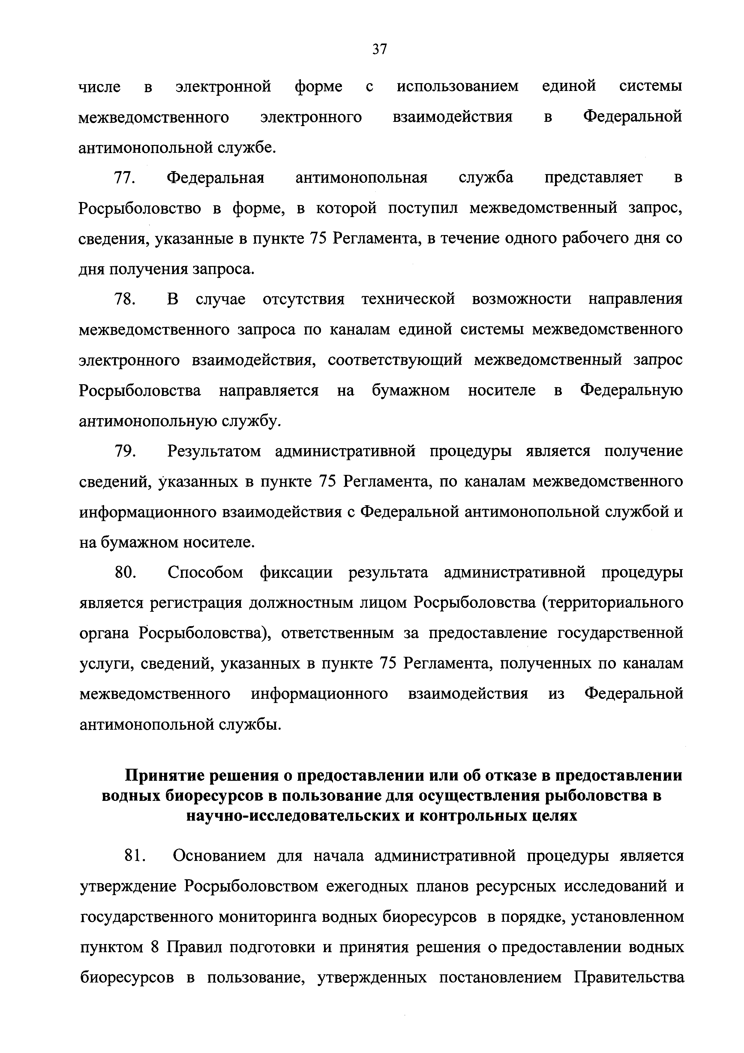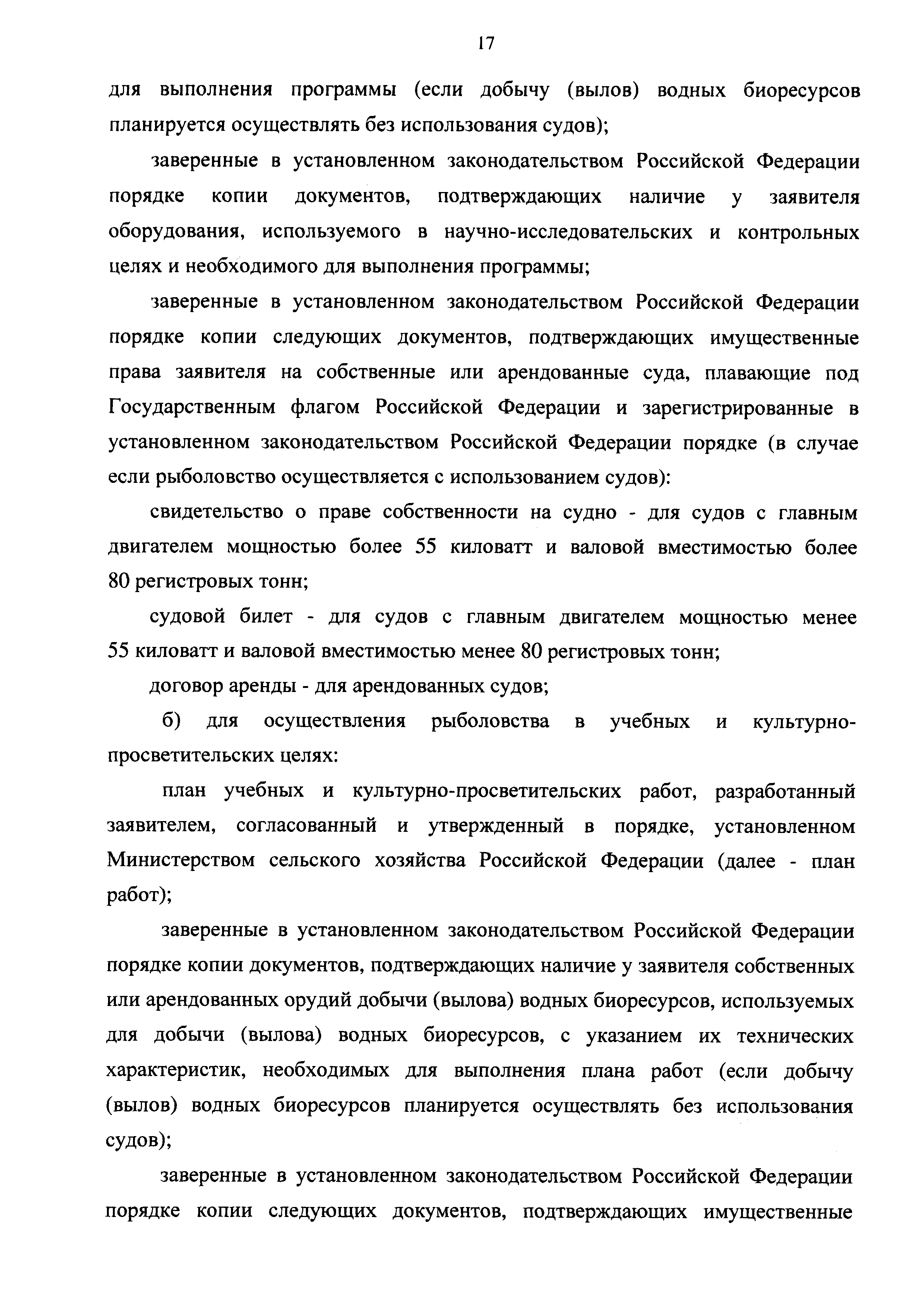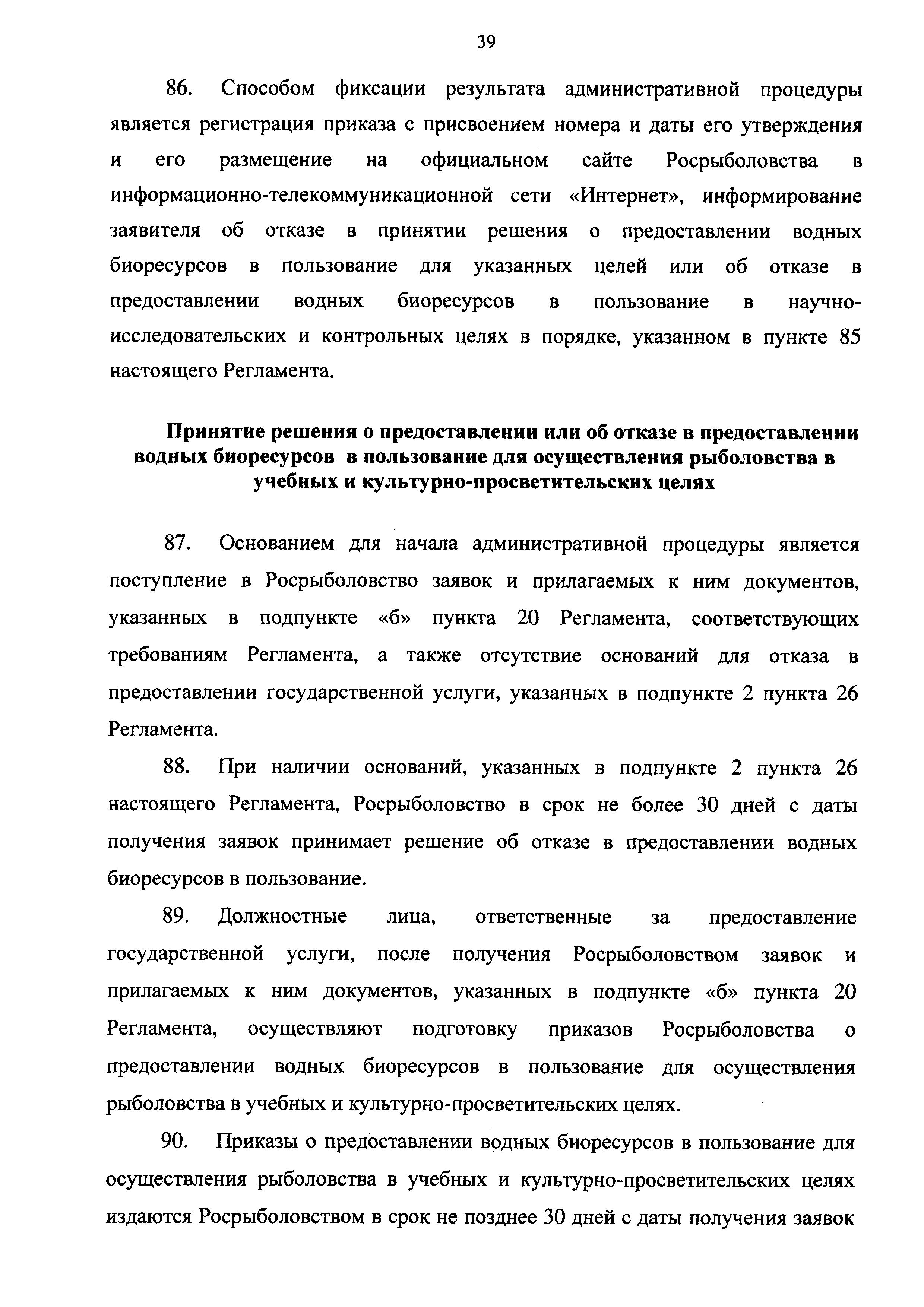 | | Нормативные ссылки: |   Федеральный закон 181-ФЗ «О социальной защите инвалидов в Российской Федерации» Кодекс «Кодекс внутреннего водного транспорта Российской Федерации» «Правила подготовки и принятия решения о предоставлении водных биологических ресурсов в пользование»  Федеральный закон 152-ФЗ «О персональных данных»  Федеральный закон 59-ФЗ «О порядке рассмотрения обращений граждан Российской Федерации»  Федеральный закон 63-ФЗ «Об электронной подписи»  Федеральный закон 166-ФЗ «О рыболовстве и сохранении водных биологических ресурсов» Постановление 373 «О разработке и утверждении административных регламентов осуществления государственного контроля (надзора) и административных регламентов предоставления государственных услуг»  «Требования к предоставлению в электронной форме государственных и муниципальных услуг» Распоряжение 631-р «Об утверждении перечня мест традиционного проживания и традиционной хозяйственной деятельности коренных малочисленных народов Российской Федерации и перечня видов традиционной хозяйственной деятельности коренных малочисленных народов Российской Федерации»  Федеральный закон 57-ФЗ «О порядке осуществления иностранных инвестиций в хозяйственные общества, имеющие стратегическое значение для обеспечения обороны страны и безопасности государства» Постановление 352 «Об утверждении перечня услуг, которые являются необходимыми и обязательными для предоставления федеральными органами исполнительной власти, Государственной корпорацией по атомной энергии "Росатом" государственных услуг и предоставляются организациями, участвующими в предоставлении государственных услуг, и определении размера платы за их оказание» «Положение о единой системе межведомственного электронного взаимодействия» «Правила подачи и рассмотрения жалоб на решения и действия (бездействие) федеральных органов исполнительной власти и их должностных лиц, федеральных государственных служащих, должностных лиц государственных внебюджетных фондов Российской Федерации, государственных корпораций, наделенных в соответствии с федеральными законами полномочиями по предоставлению государственных услуг в установленной сфере деятельности, и их должностных лиц, организаций, предусмотренных частью 1.1 статьи 16 Федерального закона "Об организации предоставления государственных и муниципальных услуг", и их работников, а также многофункциональных центров предоставления государственных и муниципальных услуг и их работников»  «Правила использования усиленной квалифицированной электронной подписи при обращении за получением государственных и муниципальных услуг»  Постановление 444 «О Федеральном агентстве по рыболовству» «Правила организации искусственного воспроизводства водных биологических ресурсов»