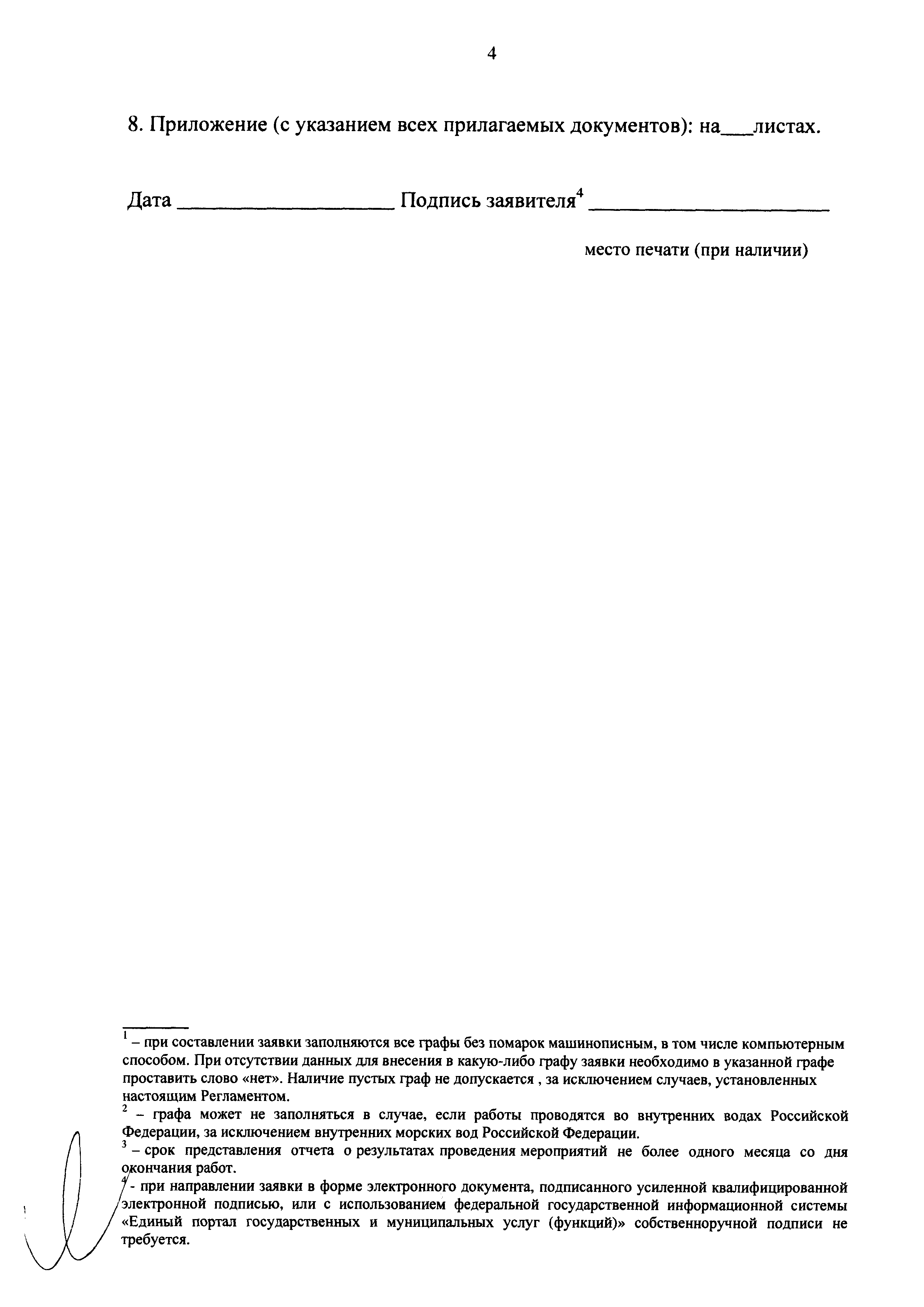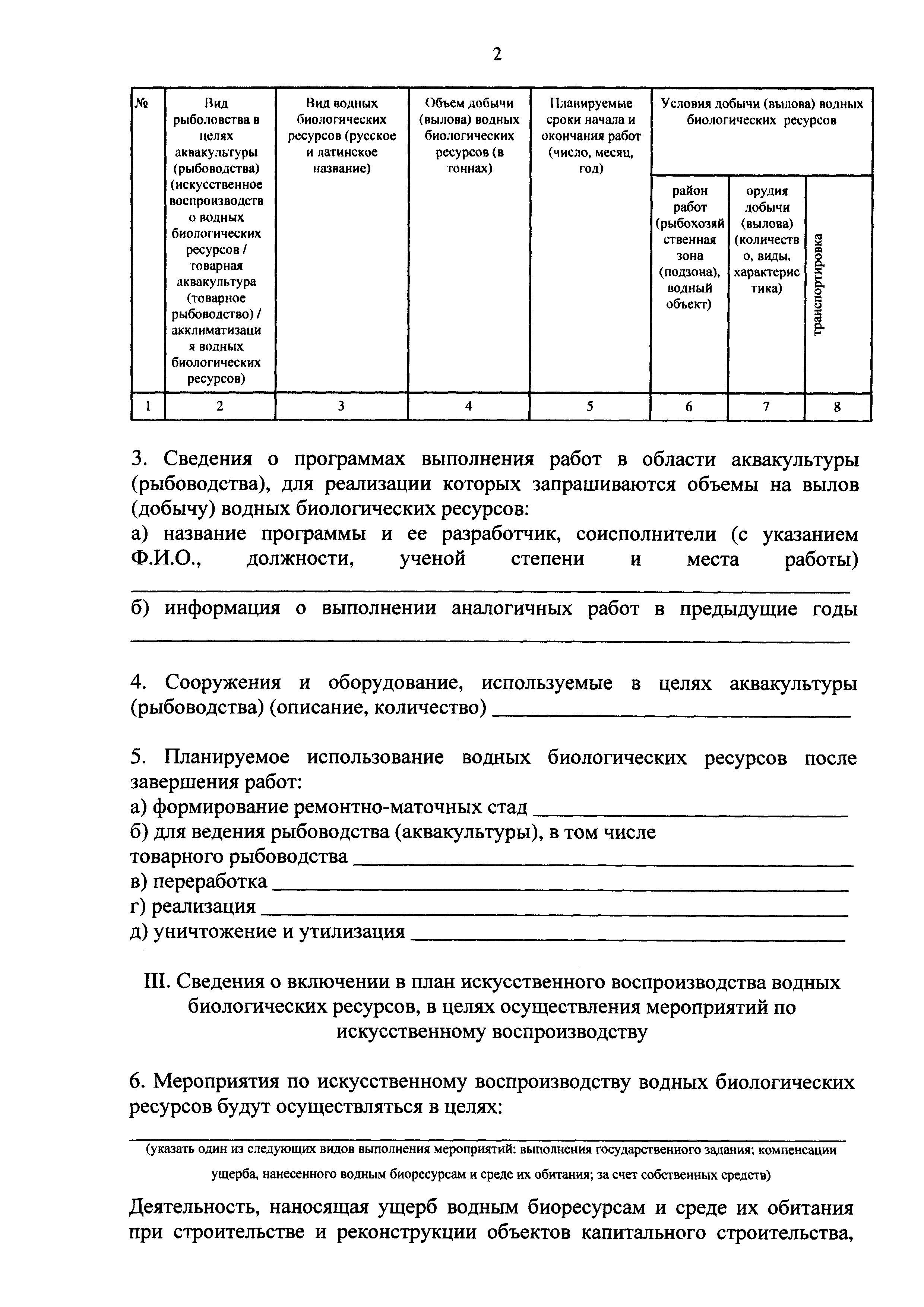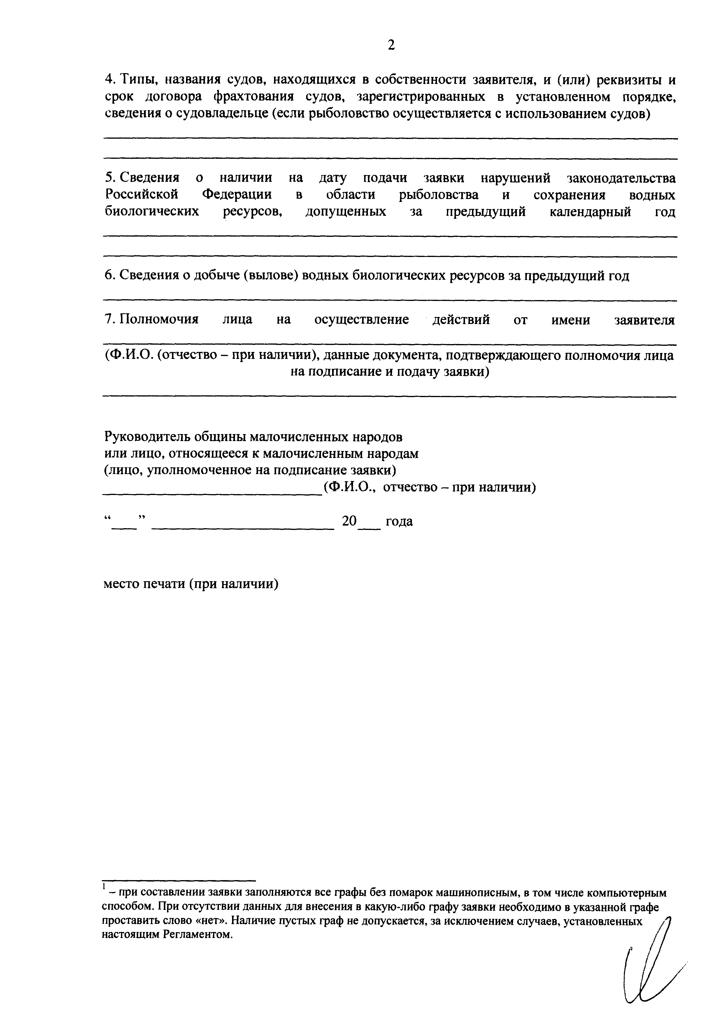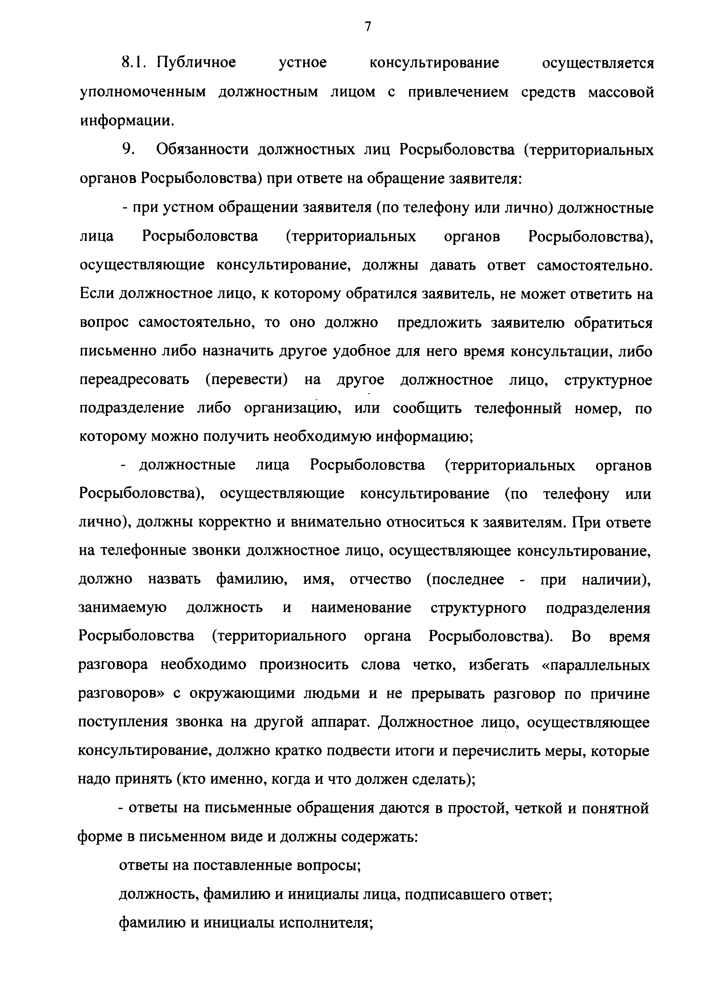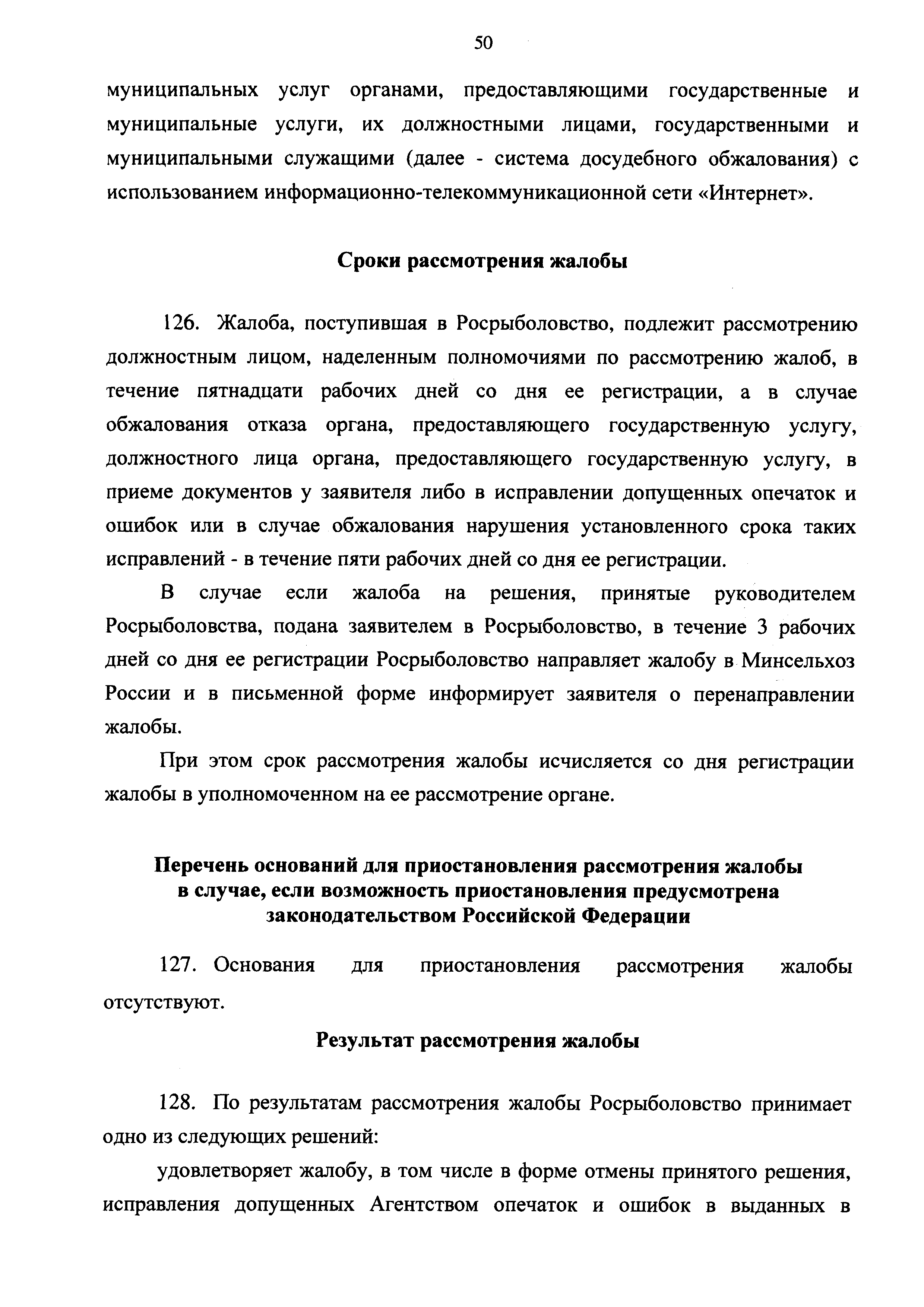 | | Нормативные ссылки: |   Федеральный закон 181-ФЗ «О социальной защите инвалидов в Российской Федерации» Кодекс «Кодекс внутреннего водного транспорта Российской Федерации» «Правила подготовки и принятия решения о предоставлении водных биологических ресурсов в пользование»  Федеральный закон 152-ФЗ «О персональных данных»  Федеральный закон 59-ФЗ «О порядке рассмотрения обращений граждан Российской Федерации»  Федеральный закон 63-ФЗ «Об электронной подписи»  Федеральный закон 166-ФЗ «О рыболовстве и сохранении водных биологических ресурсов» Постановление 373 «О разработке и утверждении административных регламентов осуществления государственного контроля (надзора) и административных регламентов предоставления государственных услуг»  «Требования к предоставлению в электронной форме государственных и муниципальных услуг» Распоряжение 631-р «Об утверждении перечня мест традиционного проживания и традиционной хозяйственной деятельности коренных малочисленных народов Российской Федерации и перечня видов традиционной хозяйственной деятельности коренных малочисленных народов Российской Федерации»  Федеральный закон 57-ФЗ «О порядке осуществления иностранных инвестиций в хозяйственные общества, имеющие стратегическое значение для обеспечения обороны страны и безопасности государства» Постановление 352 «Об утверждении перечня услуг, которые являются необходимыми и обязательными для предоставления федеральными органами исполнительной власти, Государственной корпорацией по атомной энергии "Росатом" государственных услуг и предоставляются организациями, участвующими в предоставлении государственных услуг, и определении размера платы за их оказание» «Положение о единой системе межведомственного электронного взаимодействия» «Правила подачи и рассмотрения жалоб на решения и действия (бездействие) федеральных органов исполнительной власти и их должностных лиц, федеральных государственных служащих, должностных лиц государственных внебюджетных фондов Российской Федерации, государственных корпораций, наделенных в соответствии с федеральными законами полномочиями по предоставлению государственных услуг в установленной сфере деятельности, и их должностных лиц, организаций, предусмотренных частью 1.1 статьи 16 Федерального закона "Об организации предоставления государственных и муниципальных услуг", и их работников, а также многофункциональных центров предоставления государственных и муниципальных услуг и их работников»  «Правила использования усиленной квалифицированной электронной подписи при обращении за получением государственных и муниципальных услуг»  Постановление 444 «О Федеральном агентстве по рыболовству» «Правила организации искусственного воспроизводства водных биологических ресурсов»