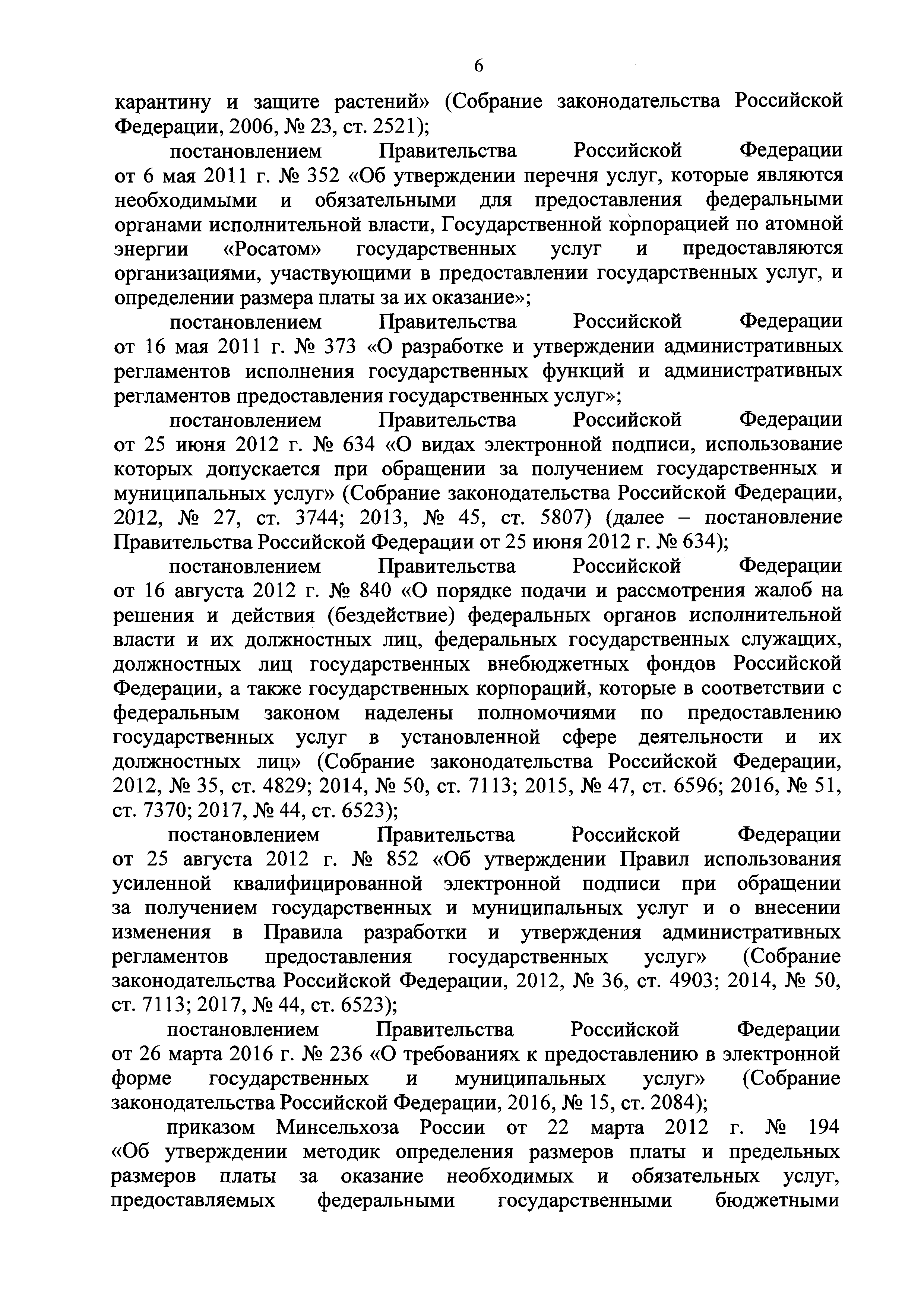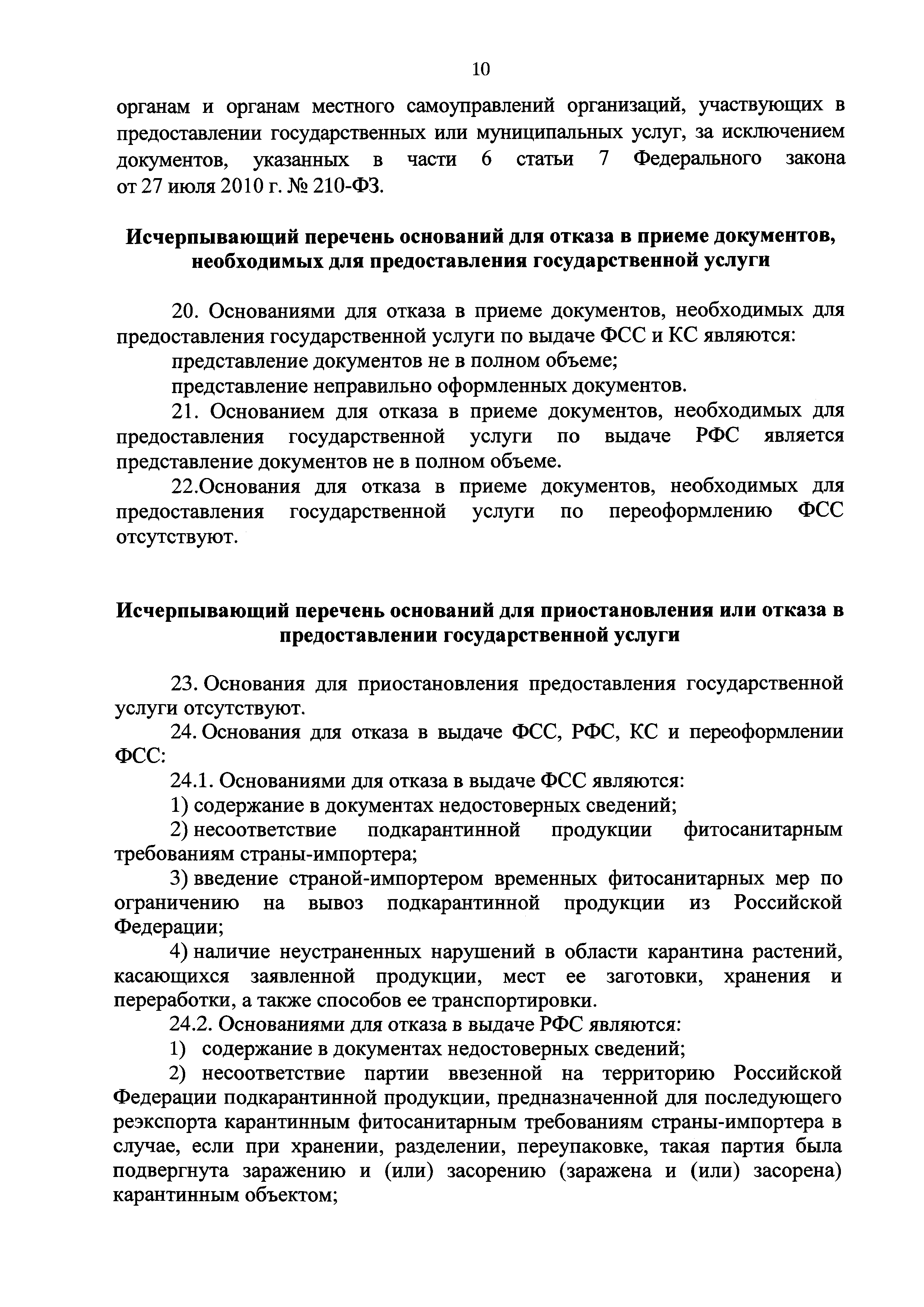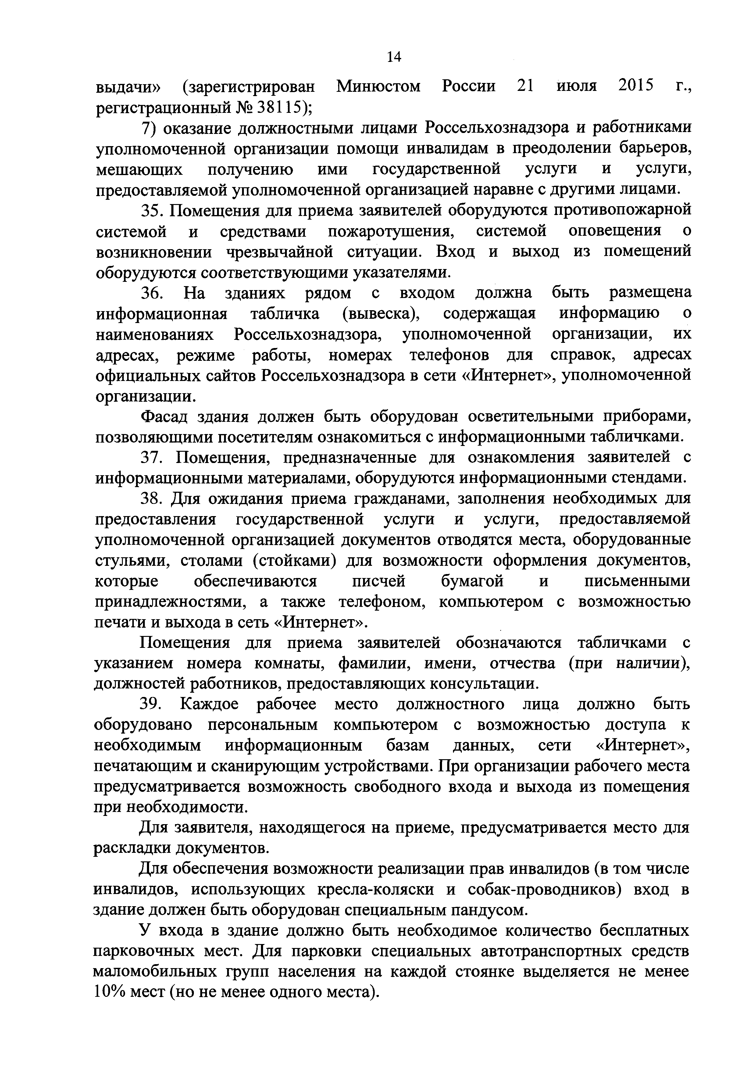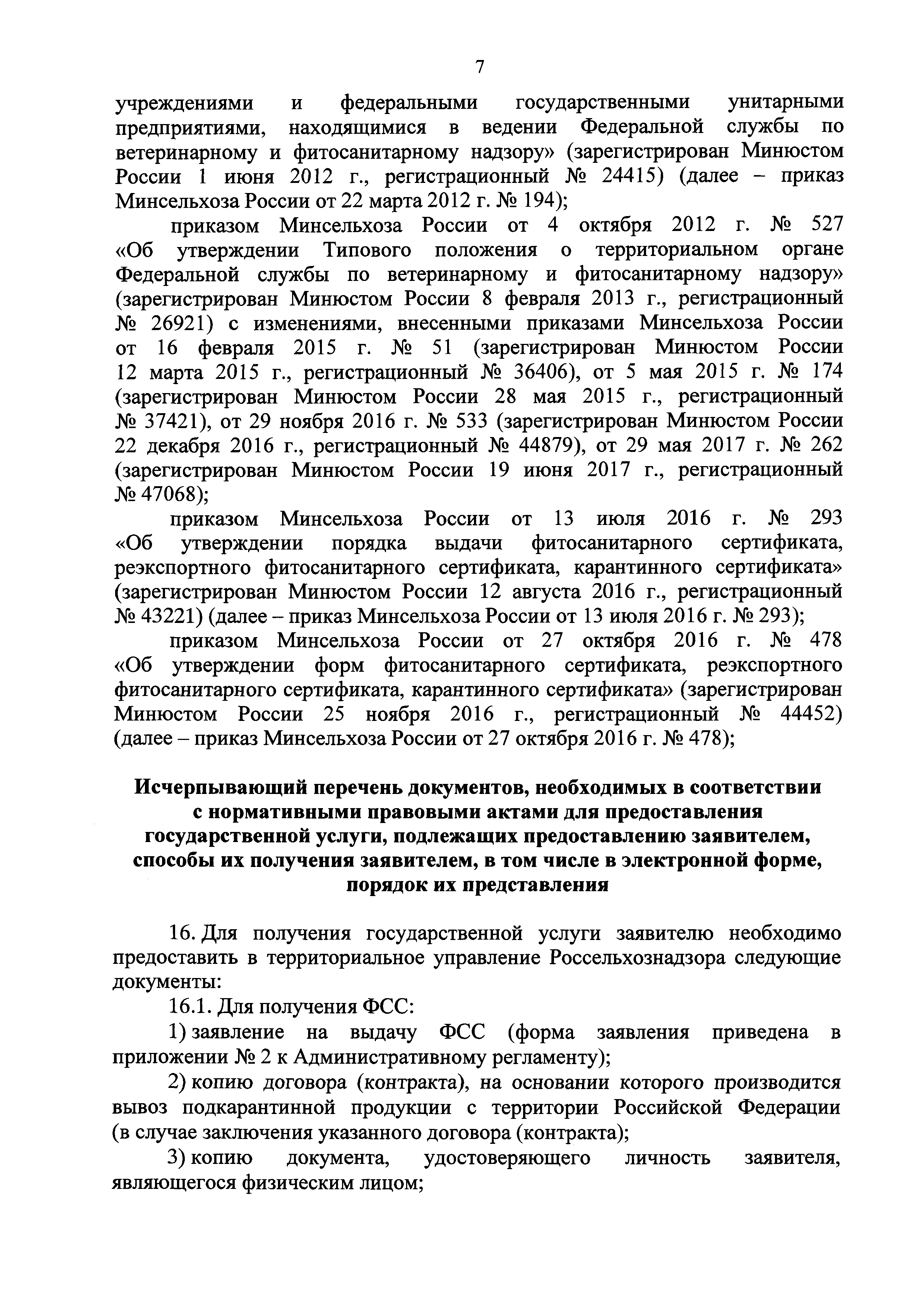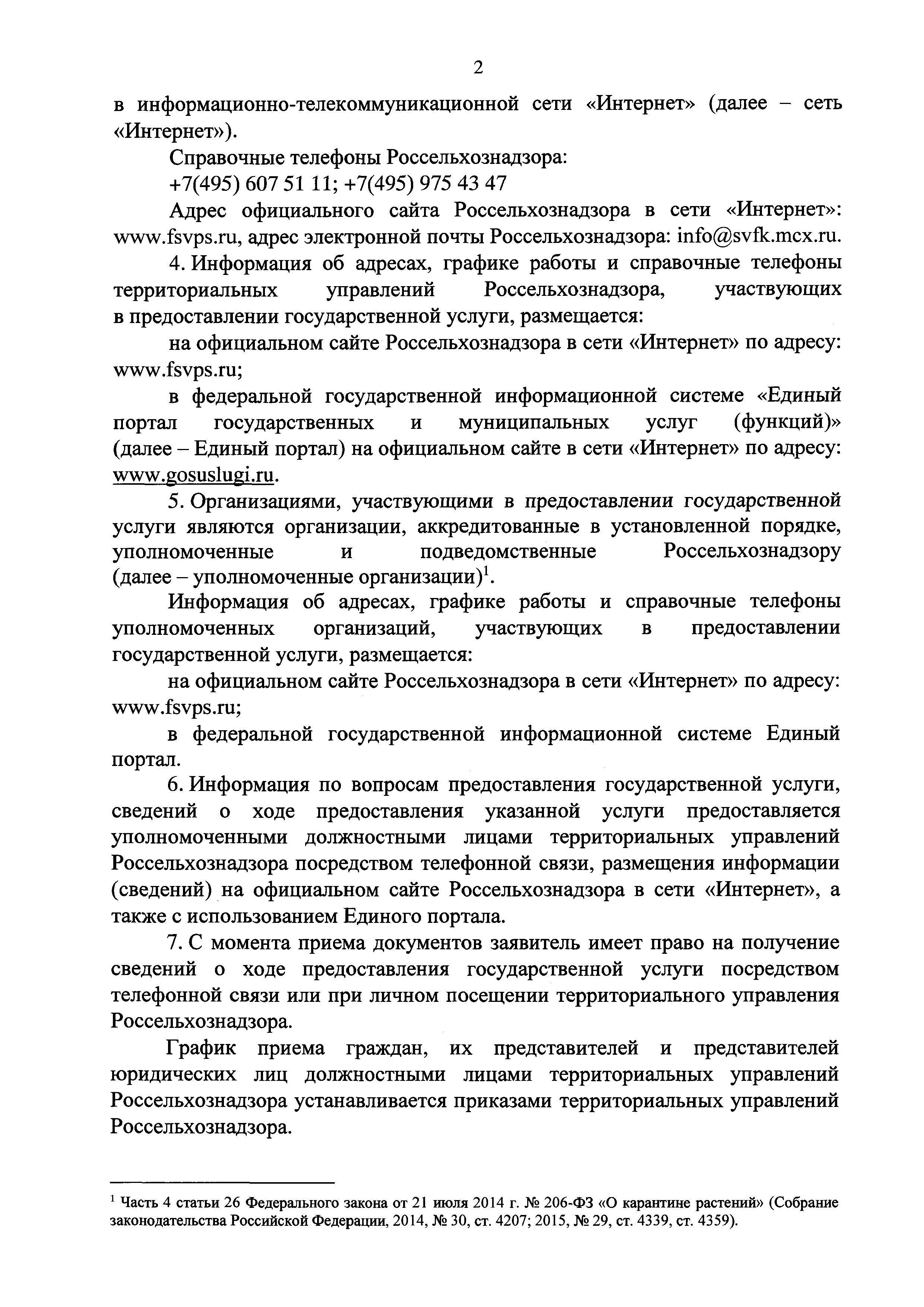 | | Нормативные ссылки: |   Федеральный закон 181-ФЗ «О социальной защите инвалидов в Российской Федерации»  Федеральный закон 152-ФЗ «О персональных данных»  Федеральный закон 63-ФЗ «Об электронной подписи» Постановление 373 «О разработке и утверждении административных регламентов осуществления государственного контроля (надзора) и административных регламентов предоставления государственных услуг»  Федеральный закон 210-ФЗ «Об организации предоставления государственных и муниципальных услуг»  Федеральный закон 8-ФЗ «Об обеспечении доступа к информации о деятельности государственных органов и органов местного самоуправления»  «Требования к предоставлению в электронной форме государственных и муниципальных услуг» Приказ 478 «Об утверждении форм фитосанитарного сертификата, реэкспортного фитосанитарного сертификата, карантинного сертификата» Постановление 352 «Об утверждении перечня услуг, которые являются необходимыми и обязательными для предоставления федеральными органами исполнительной власти, Государственной корпорацией по атомной энергии "Росатом" государственных услуг и предоставляются организациями, участвующими в предоставлении государственных услуг, и определении размера платы за их оказание»  Федеральный закон 206-ФЗ «О карантине растений» «Правила подачи и рассмотрения жалоб на решения и действия (бездействие) федеральных органов исполнительной власти и их должностных лиц, федеральных государственных служащих, должностных лиц государственных внебюджетных фондов Российской Федерации, государственных корпораций, наделенных в соответствии с федеральными законами полномочиями по предоставлению государственных услуг в установленной сфере деятельности, и их должностных лиц, организаций, предусмотренных частью 1.1 статьи 16 Федерального закона "Об организации предоставления государственных и муниципальных услуг", и их работников, а также многофункциональных центров предоставления государственных и муниципальных услуг и их работников»  «Правила использования усиленной квалифицированной электронной подписи при обращении за получением государственных и муниципальных услуг» «Правила определения видов электронной подписи, использование которых допускается при обращении за получением государственных и муниципальных услуг» «Порядок выдачи фитосанитарного сертификата, реэкспортного фитосанитарного сертификата, карантинного сертификата»