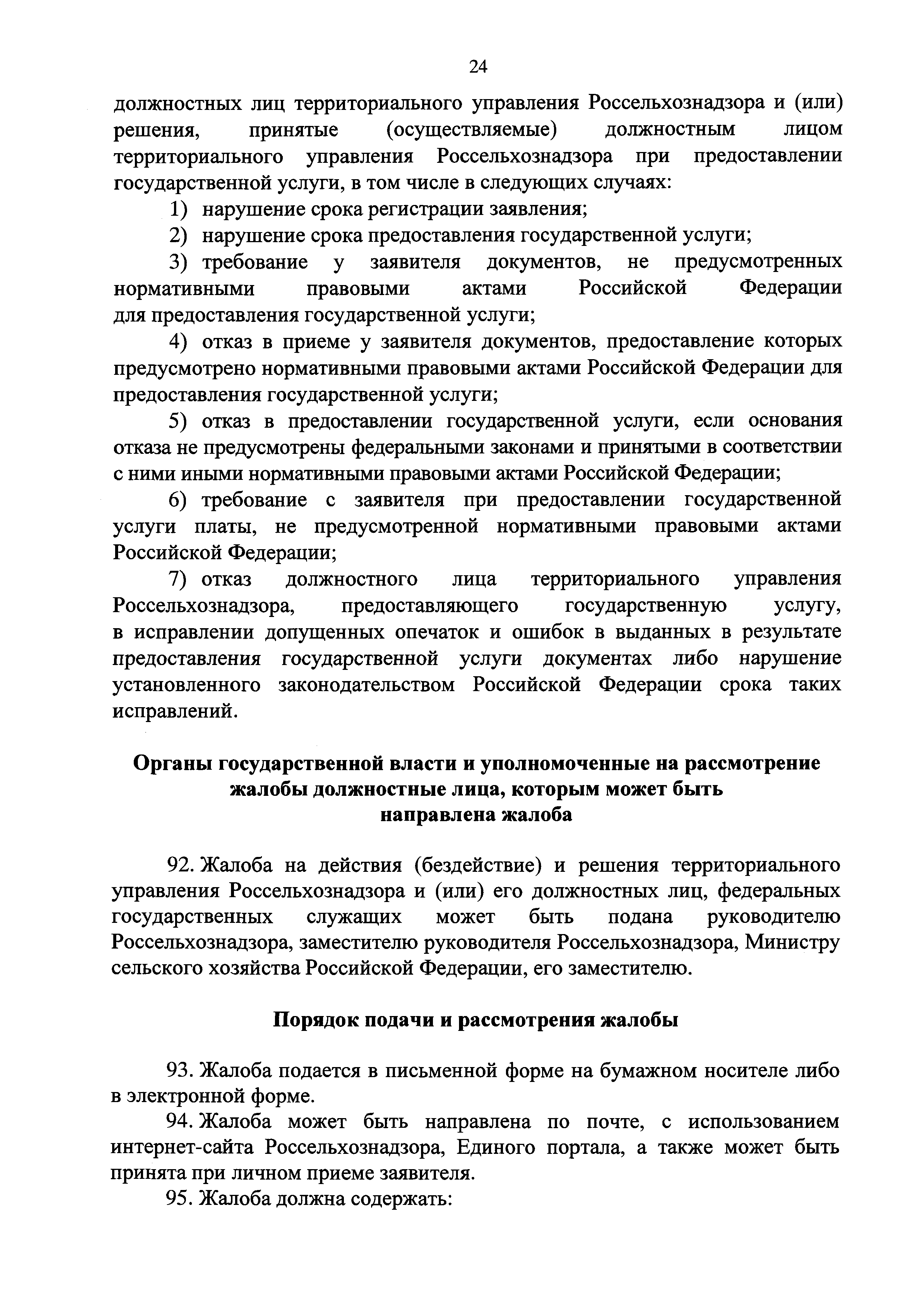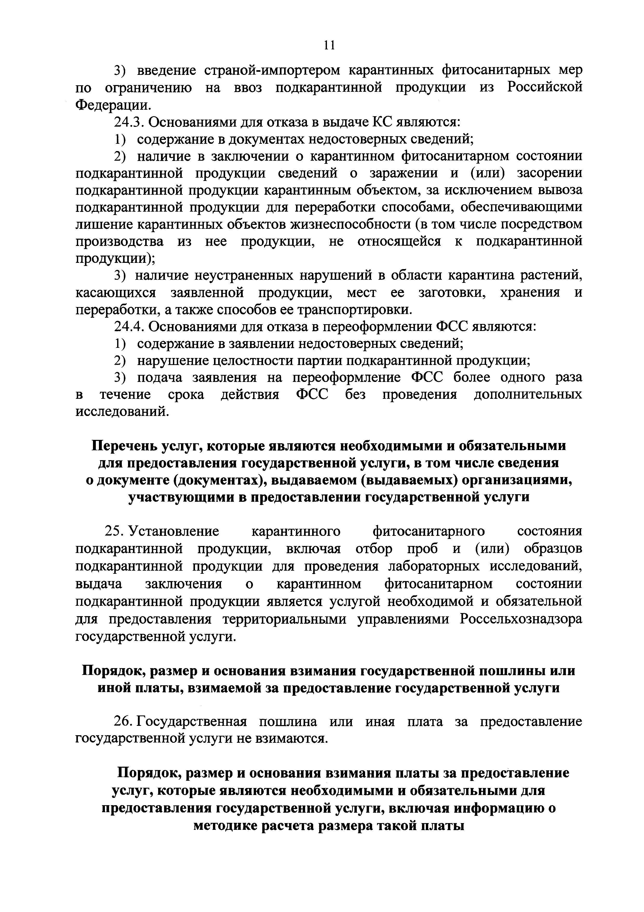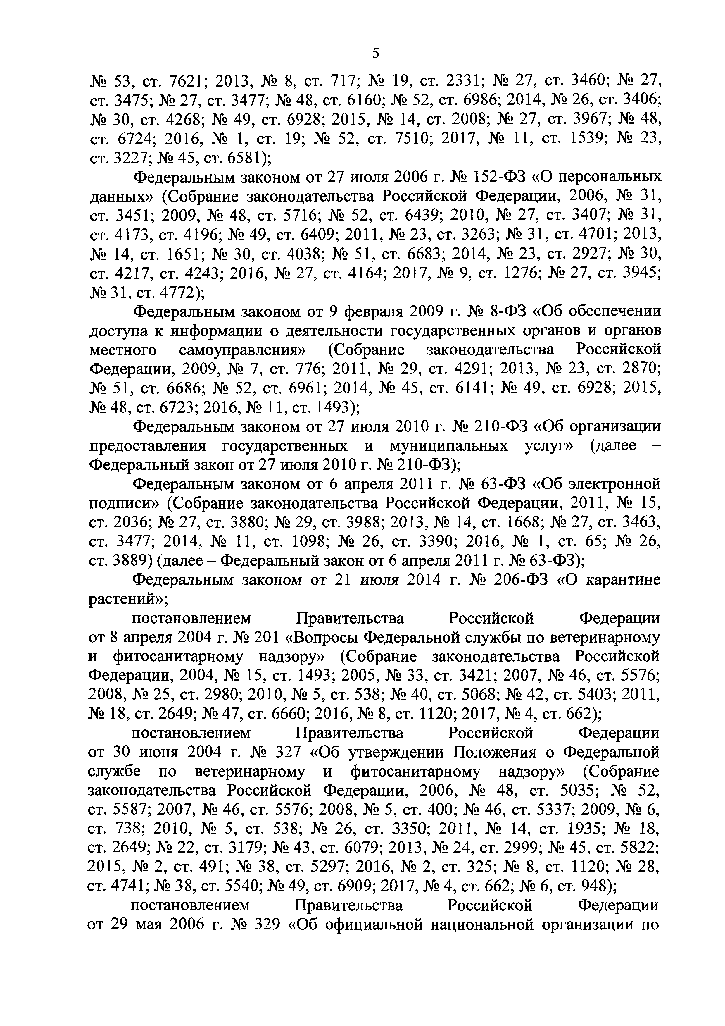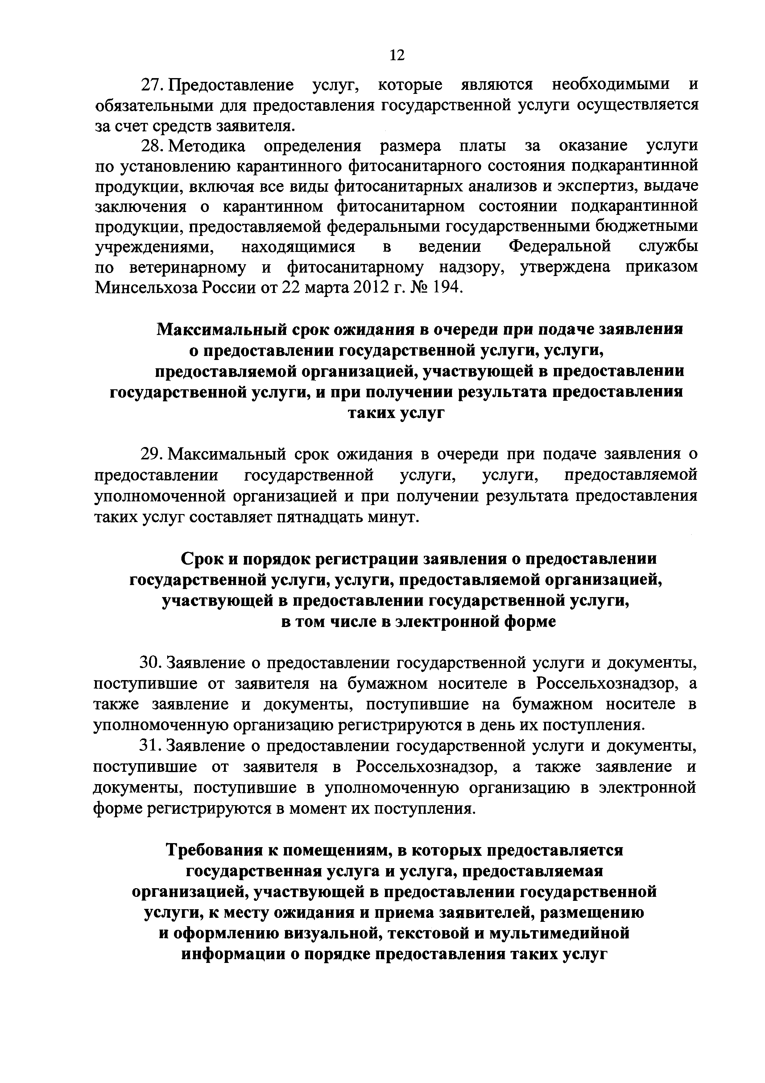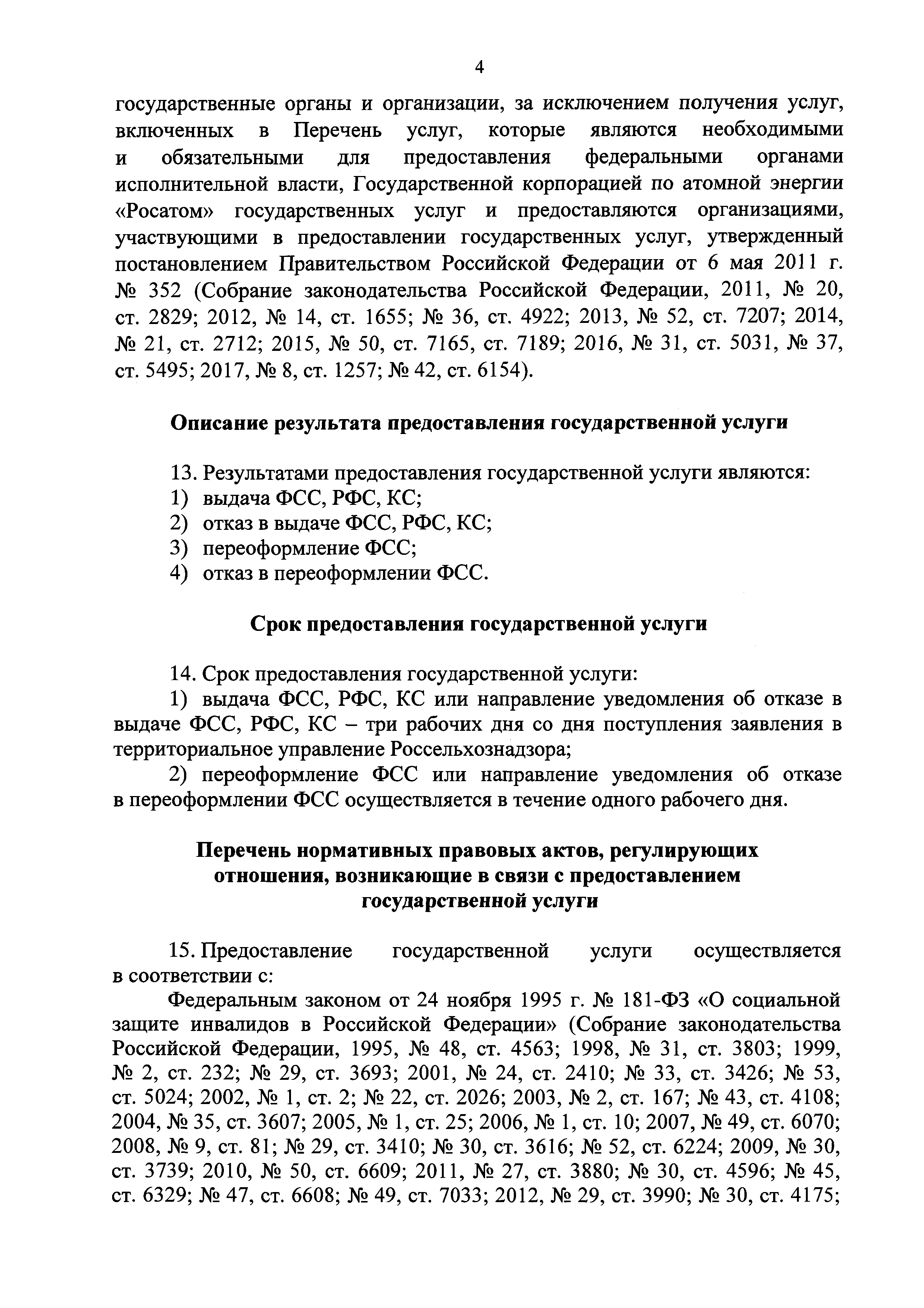 | | Нормативные ссылки: |   Федеральный закон 181-ФЗ «О социальной защите инвалидов в Российской Федерации»  Федеральный закон 152-ФЗ «О персональных данных»  Федеральный закон 63-ФЗ «Об электронной подписи» Постановление 373 «О разработке и утверждении административных регламентов осуществления государственного контроля (надзора) и административных регламентов предоставления государственных услуг»  Федеральный закон 210-ФЗ «Об организации предоставления государственных и муниципальных услуг»  Федеральный закон 8-ФЗ «Об обеспечении доступа к информации о деятельности государственных органов и органов местного самоуправления»  «Требования к предоставлению в электронной форме государственных и муниципальных услуг» Приказ 478 «Об утверждении форм фитосанитарного сертификата, реэкспортного фитосанитарного сертификата, карантинного сертификата» Постановление 352 «Об утверждении перечня услуг, которые являются необходимыми и обязательными для предоставления федеральными органами исполнительной власти, Государственной корпорацией по атомной энергии "Росатом" государственных услуг и предоставляются организациями, участвующими в предоставлении государственных услуг, и определении размера платы за их оказание»  Федеральный закон 206-ФЗ «О карантине растений» «Правила подачи и рассмотрения жалоб на решения и действия (бездействие) федеральных органов исполнительной власти и их должностных лиц, федеральных государственных служащих, должностных лиц государственных внебюджетных фондов Российской Федерации, государственных корпораций, наделенных в соответствии с федеральными законами полномочиями по предоставлению государственных услуг в установленной сфере деятельности, и их должностных лиц, организаций, предусмотренных частью 1.1 статьи 16 Федерального закона "Об организации предоставления государственных и муниципальных услуг", и их работников, а также многофункциональных центров предоставления государственных и муниципальных услуг и их работников»  «Правила использования усиленной квалифицированной электронной подписи при обращении за получением государственных и муниципальных услуг» «Правила определения видов электронной подписи, использование которых допускается при обращении за получением государственных и муниципальных услуг» «Порядок выдачи фитосанитарного сертификата, реэкспортного фитосанитарного сертификата, карантинного сертификата»