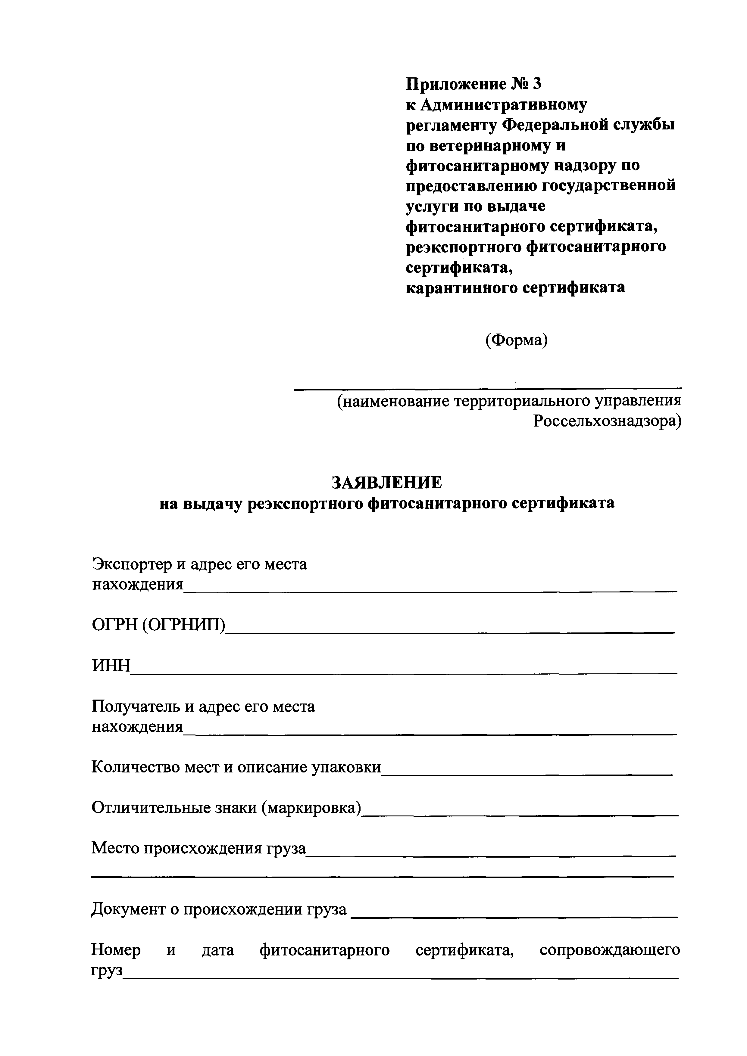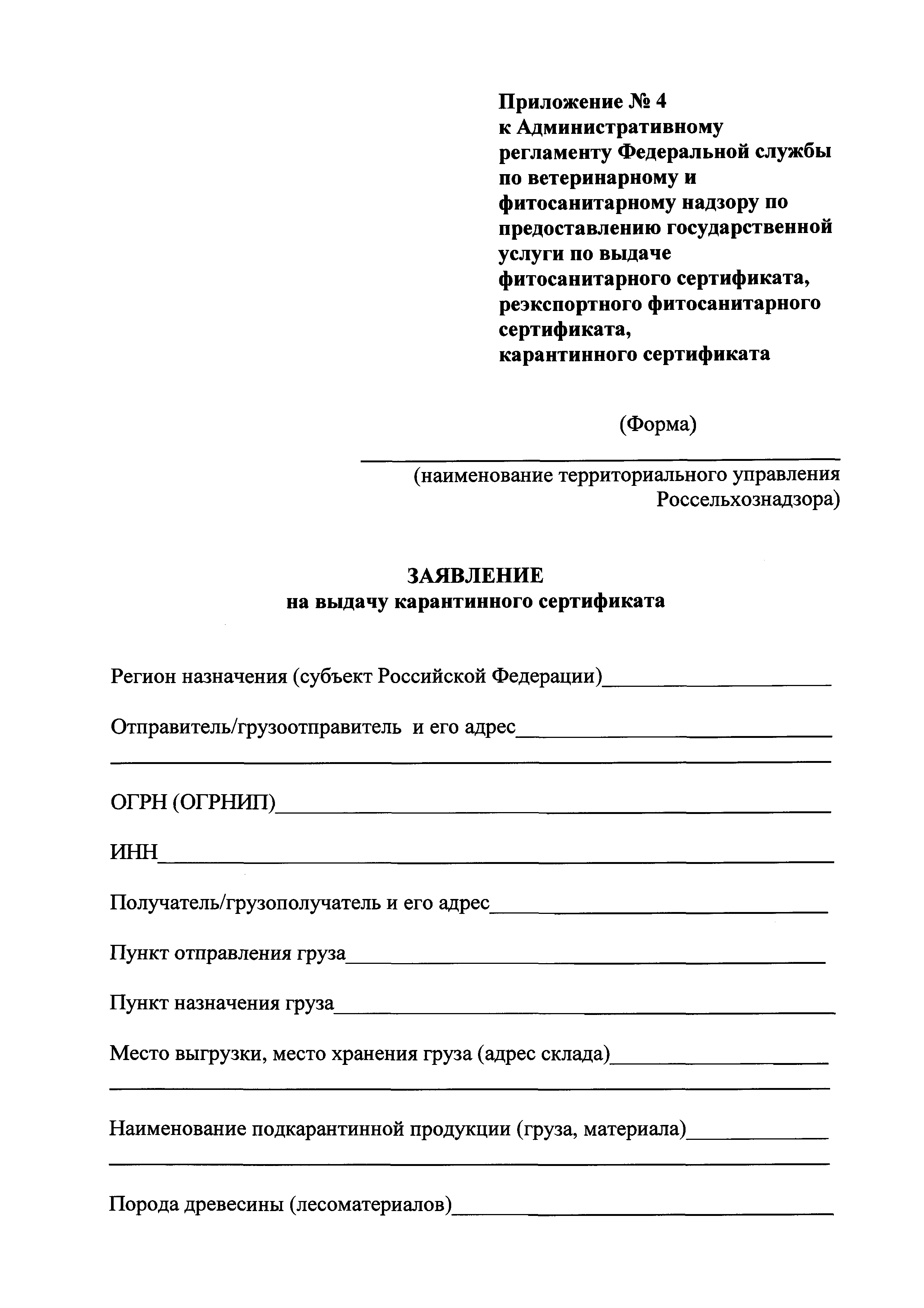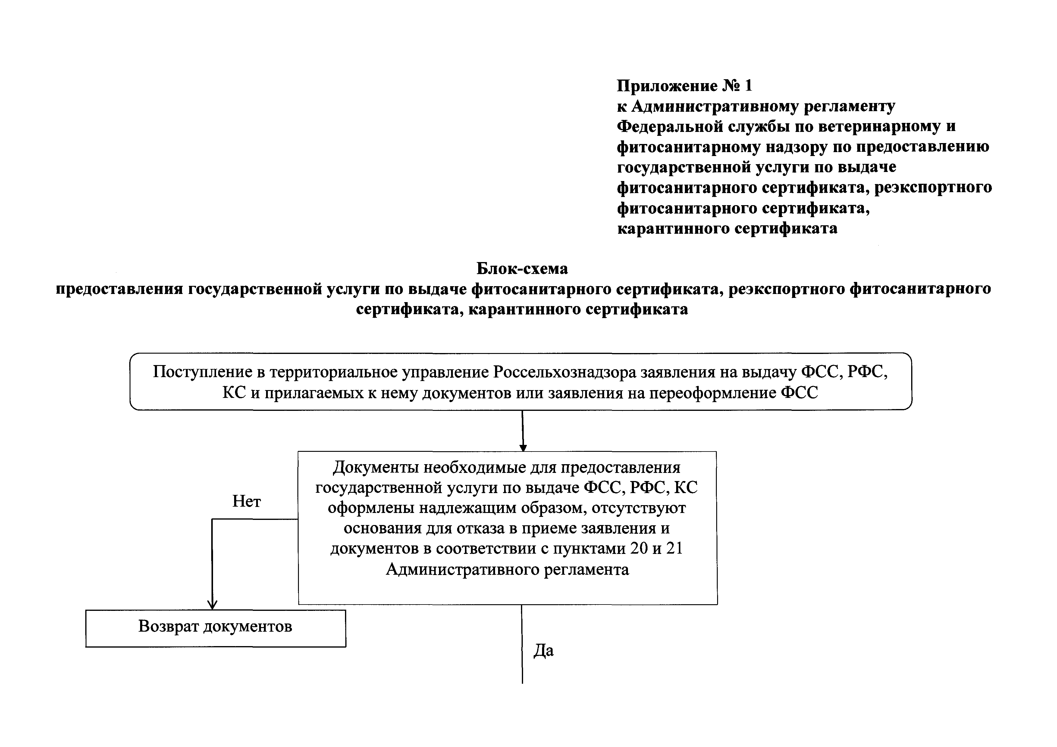 Административный регламент Федеральной службы по ветеринарному и фитосанитарному надзору по предоставлению государственной услуги по выдаче фитосанитарного сертификата, реэкспортного фитосанитарного сертификата, карантинного сертификата| Статус: | действует | | Название рус.: | Административный регламент Федеральной службы по ветеринарному и фитосанитарному надзору по предоставлению государственной услуги по выдаче фитосанитарного сертификата, реэкспортного фитосанитарного сертификата, карантинного сертификата | | Дата добавления в базу: | 01.01.2021 | | Дата актуализации: | 01.01.2021 | | Дата введения: | 07.01.2018 | | Область применения: | Административный регламент Федеральной службы по ветеринарному и фитосанитарному надзору по предоставлению государственной услуги по выдаче фитосанитарного сертификата, реэкспортного фитосанитарного сертификата, карантинного сертификата устанавливает сроки и последовательность административных процедур (действий), осуществляемых территориальными управлениями Россельхознадзора, а также порядок взаимодействия Россельхознадзора и его территориальных управлений с заявителями при предоставлении государственной услуги | | Оглавление: | I. Общие положения II. Стандарт предоставления государственной услуги III. Состав, последовательность и сроки выполнения административных процедур, а также требования к порядку их выполнения IV. Формы контроля за предоставлением государственной услуги V. Досудебный (внесудебный) порядок обжалования решений и действий (бездействия) федерального органа исполнительной власти, предоставляющего государственную услугу, а также их должностных лиц Приложение № 1. Блок-схема предоставления государственной услуги по выдаче фитосанитарного сертификата, реэкспортного фитосанитарного сертификата, карантинного сертификата Приложение № 2. Заявление на выдачу фитосанитарного сертификата Приложение № 3. Заявление на выдачу реэкспортного фитосанитарного сертификата Приложение № 4. Заявление на выдачу карантинного сертификата Приложение № 5. Заявление на переоформление фитосанитарного сертификата | | Утверждён: | 06.12.2017 Министерство сельского хозяйства Российской Федерации (612)