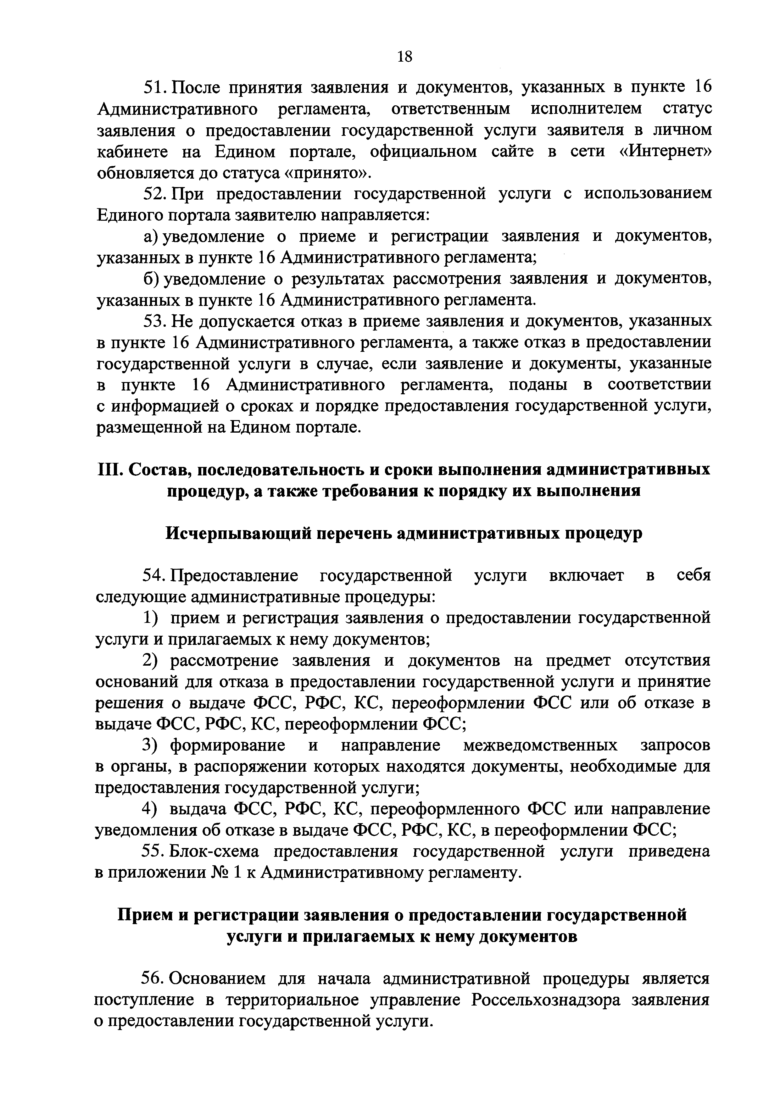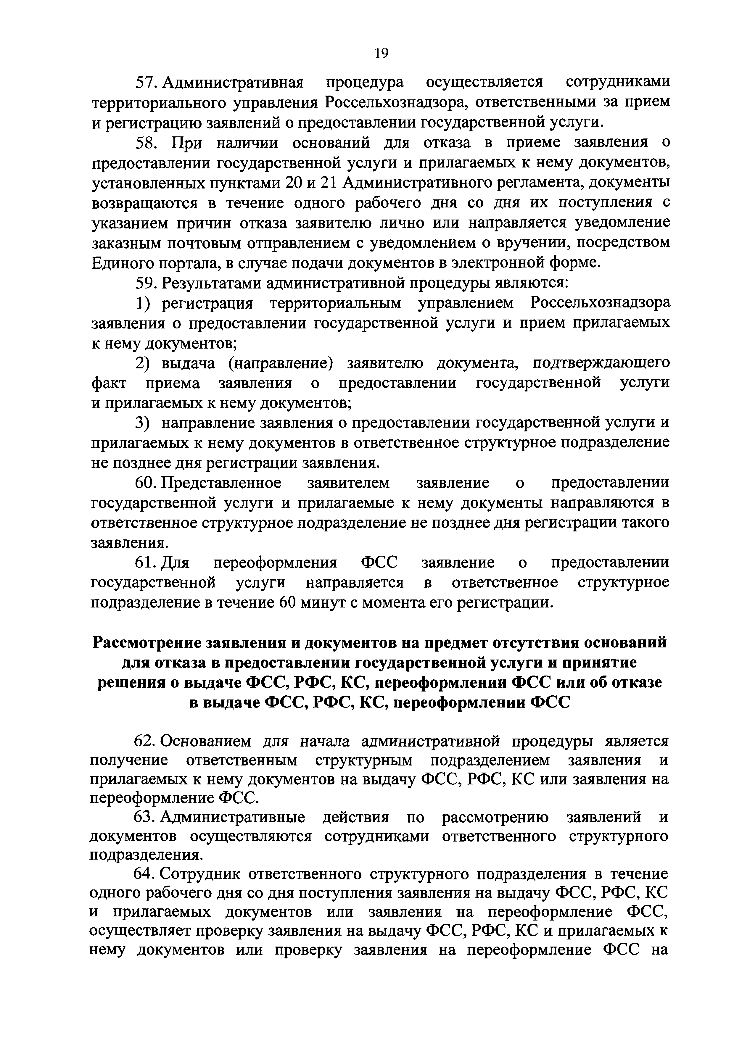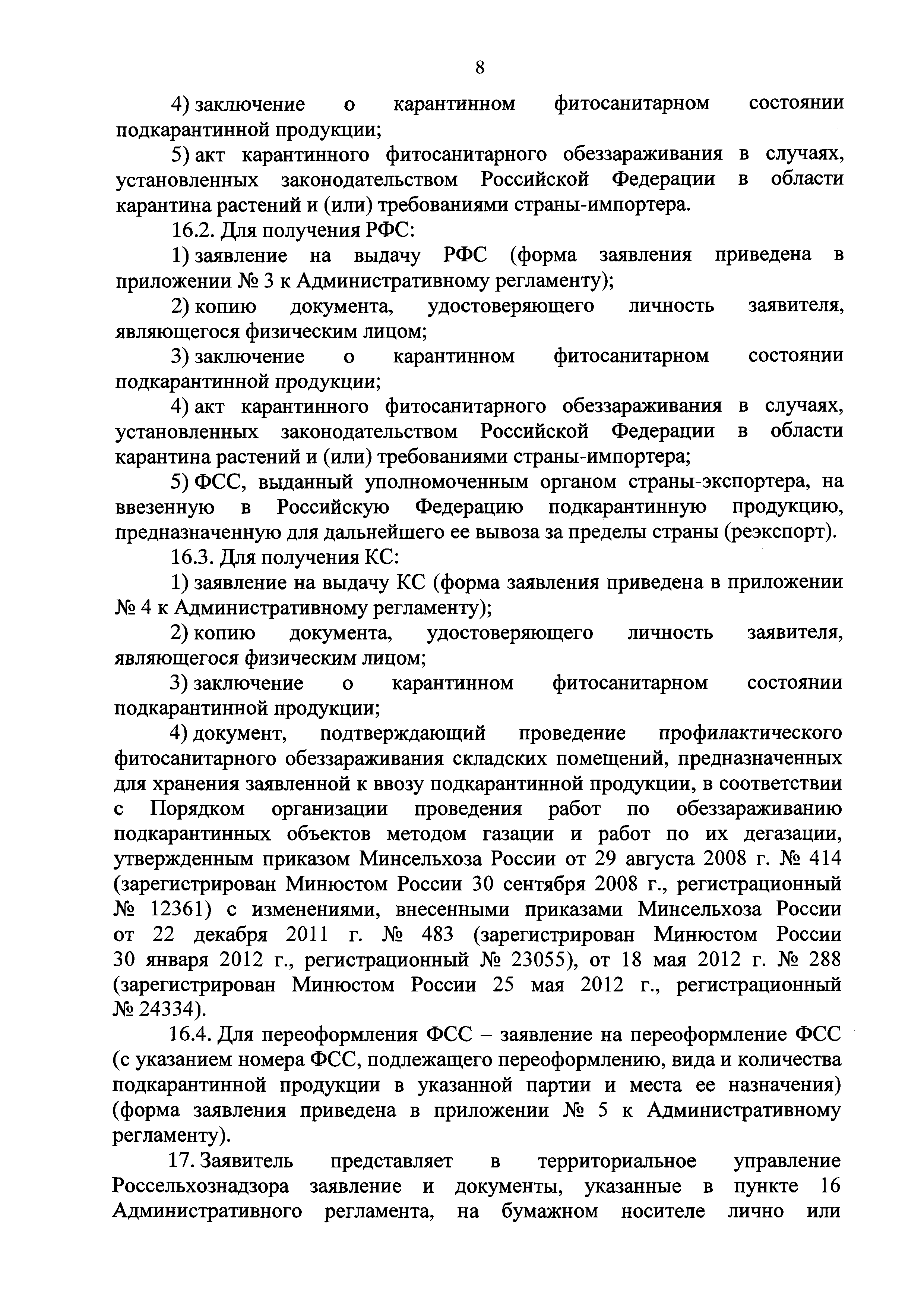 Административный регламент Федеральной службы по ветеринарному и фитосанитарному надзору по предоставлению государственной услуги по выдаче фитосанитарного сертификата, реэкспортного фитосанитарного сертификата, карантинного сертификата| Статус: | действует | | Название рус.: | Административный регламент Федеральной службы по ветеринарному и фитосанитарному надзору по предоставлению государственной услуги по выдаче фитосанитарного сертификата, реэкспортного фитосанитарного сертификата, карантинного сертификата | | Дата добавления в базу: | 01.01.2021 | | Дата актуализации: | 01.01.2021 | | Дата введения: | 07.01.2018 | | Область применения: | Административный регламент Федеральной службы по ветеринарному и фитосанитарному надзору по предоставлению государственной услуги по выдаче фитосанитарного сертификата, реэкспортного фитосанитарного сертификата, карантинного сертификата устанавливает сроки и последовательность административных процедур (действий), осуществляемых территориальными управлениями Россельхознадзора, а также порядок взаимодействия Россельхознадзора и его территориальных управлений с заявителями при предоставлении государственной услуги | | Оглавление: | I. Общие положения II. Стандарт предоставления государственной услуги III. Состав, последовательность и сроки выполнения административных процедур, а также требования к порядку их выполнения IV. Формы контроля за предоставлением государственной услуги V. Досудебный (внесудебный) порядок обжалования решений и действий (бездействия) федерального органа исполнительной власти, предоставляющего государственную услугу, а также их должностных лиц Приложение № 1. Блок-схема предоставления государственной услуги по выдаче фитосанитарного сертификата, реэкспортного фитосанитарного сертификата, карантинного сертификата Приложение № 2. Заявление на выдачу фитосанитарного сертификата Приложение № 3. Заявление на выдачу реэкспортного фитосанитарного сертификата Приложение № 4. Заявление на выдачу карантинного сертификата Приложение № 5. Заявление на переоформление фитосанитарного сертификата | | Утверждён: | 06.12.2017 Министерство сельского хозяйства Российской Федерации (612)