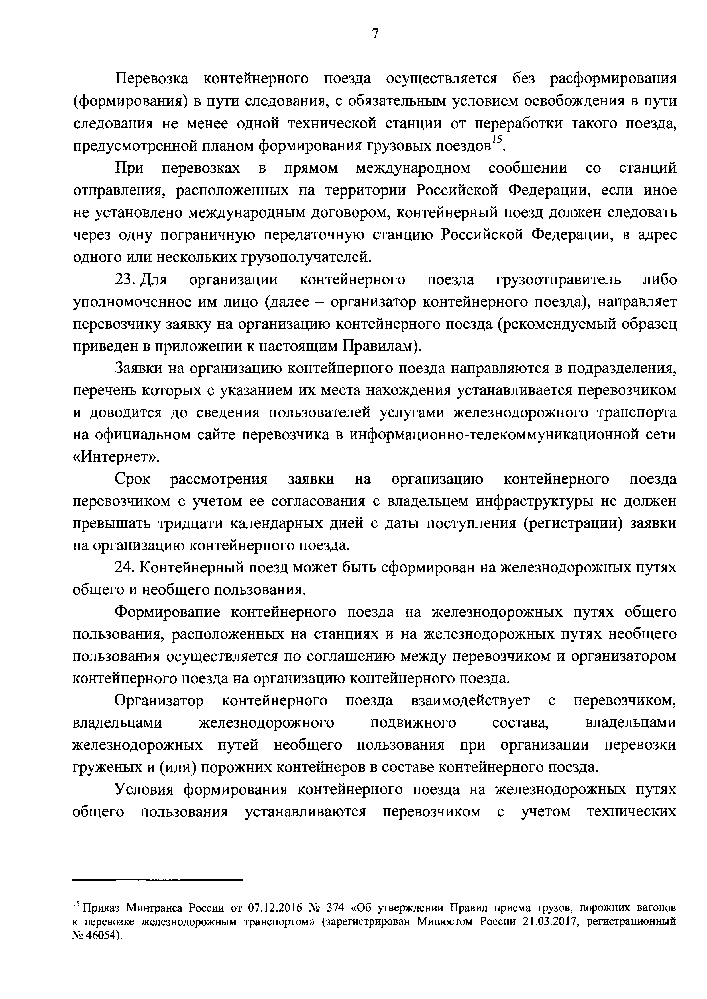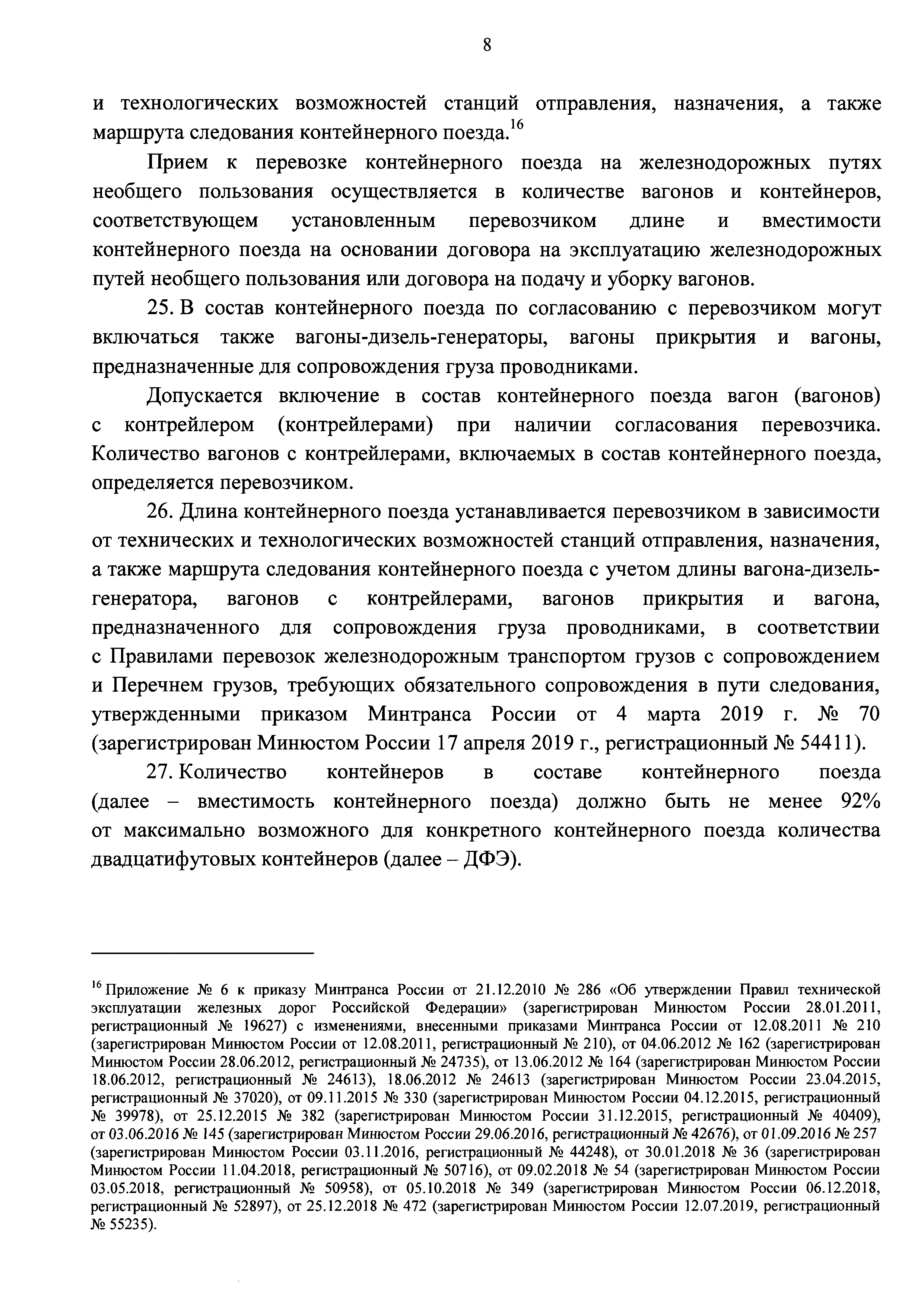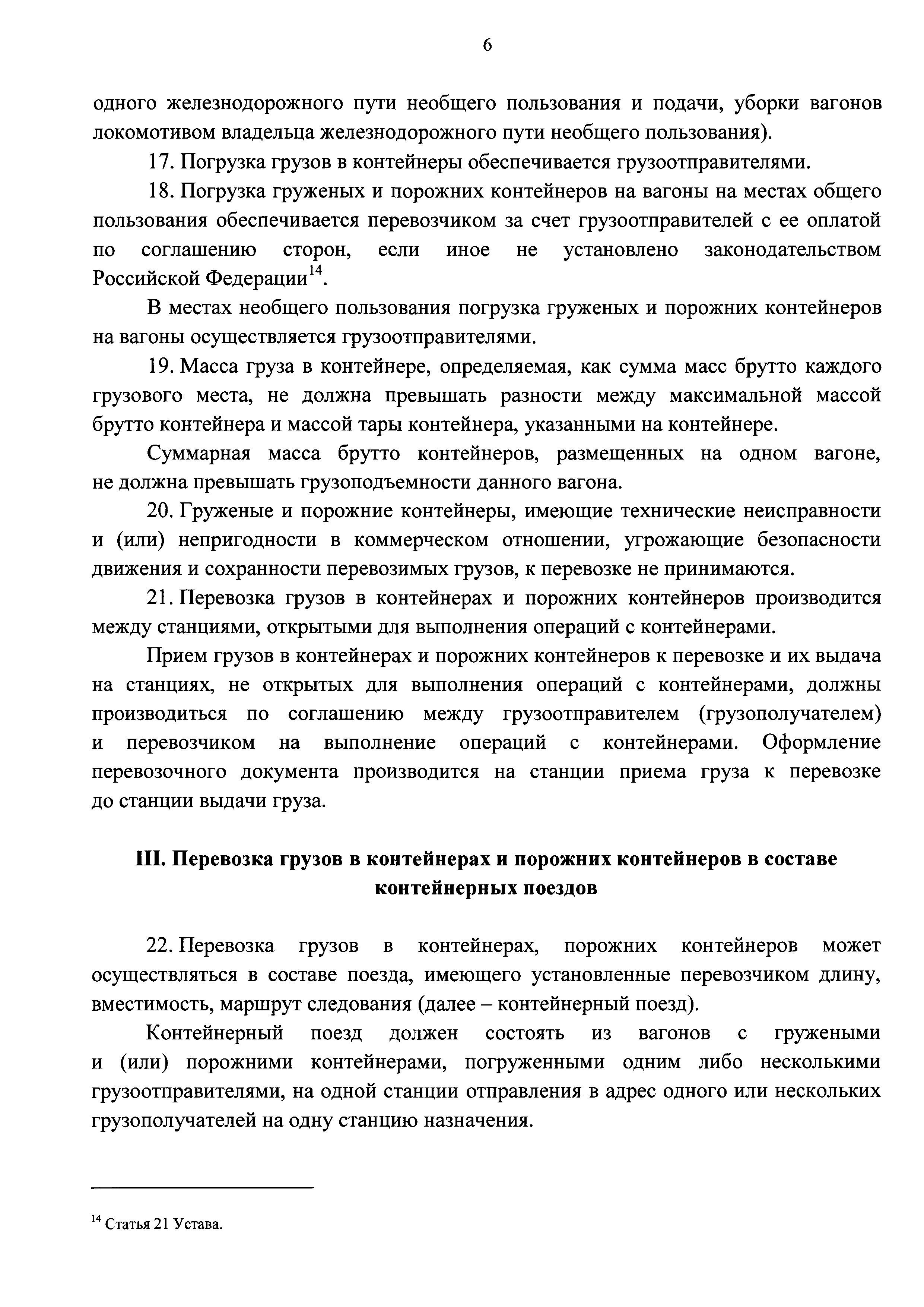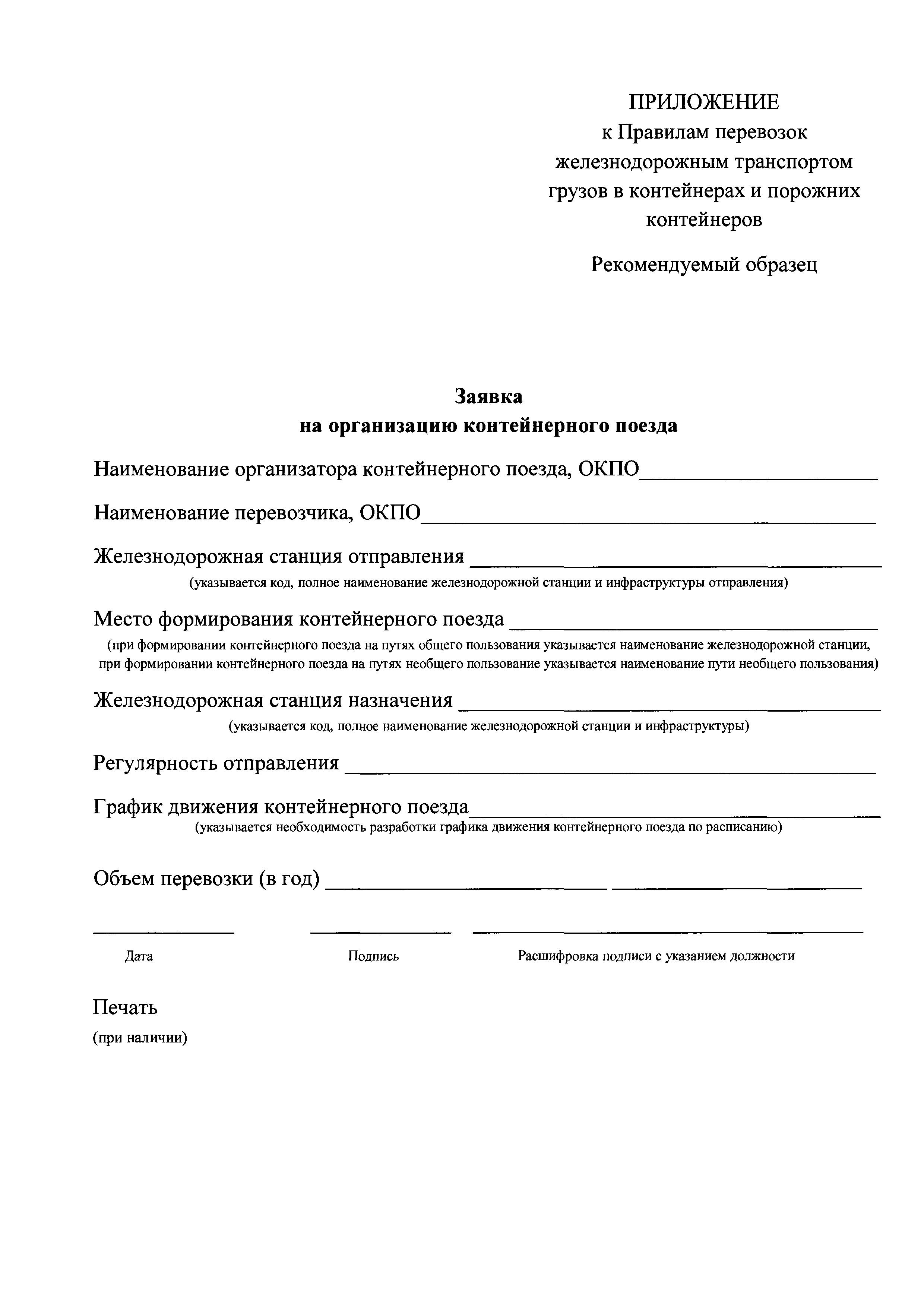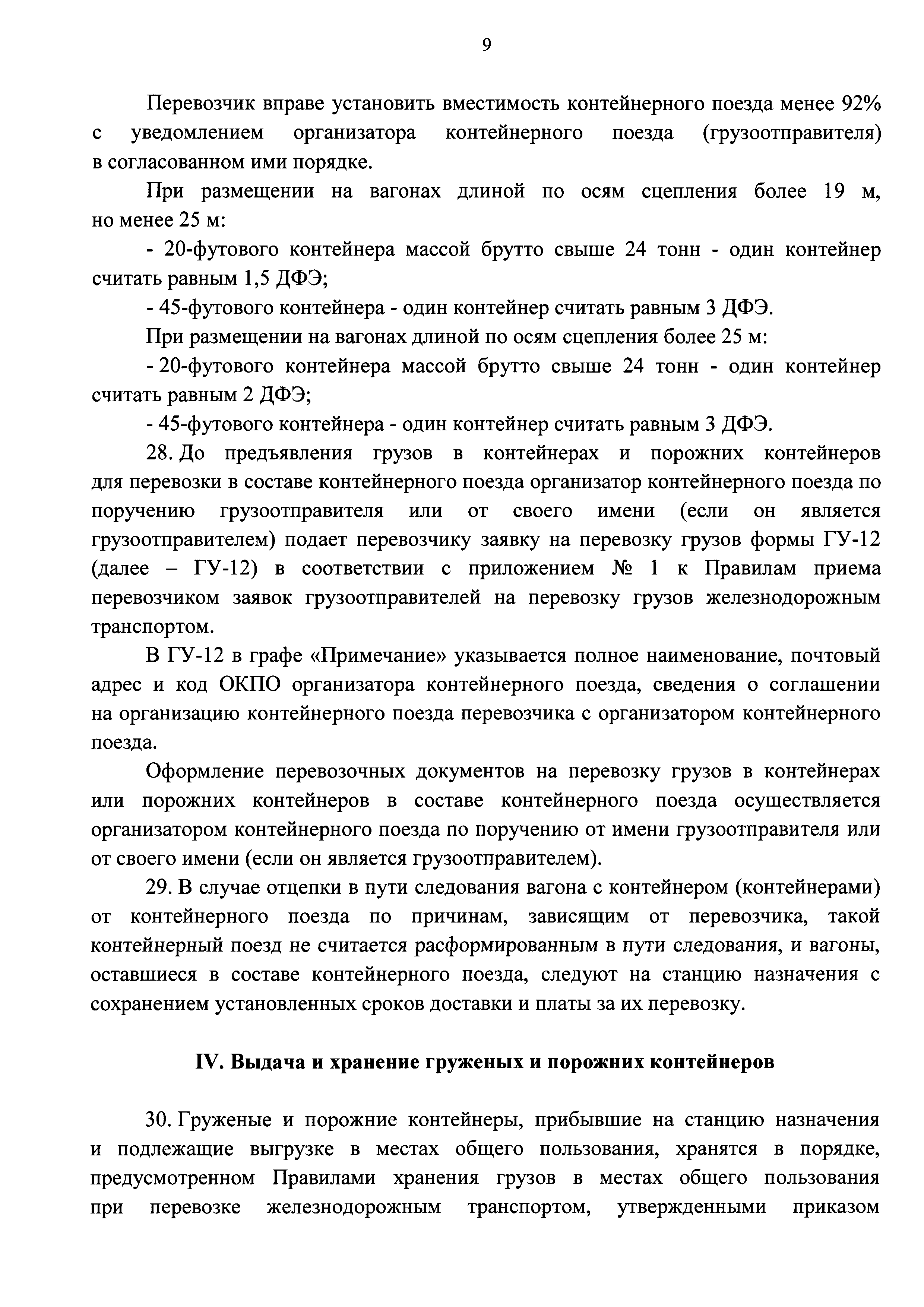 | Оглавление: | I. Общие положения II. Прием к перевозке грузов в контейнерах и порожних контейнеров III. Перевозка грузов в контейнерах и порожних контейнеров в составе контейнерных поездов IV. Выдача и хранение груженых и порожних контейнеров Приложение. Заявка на организацию контейнерного поезда |