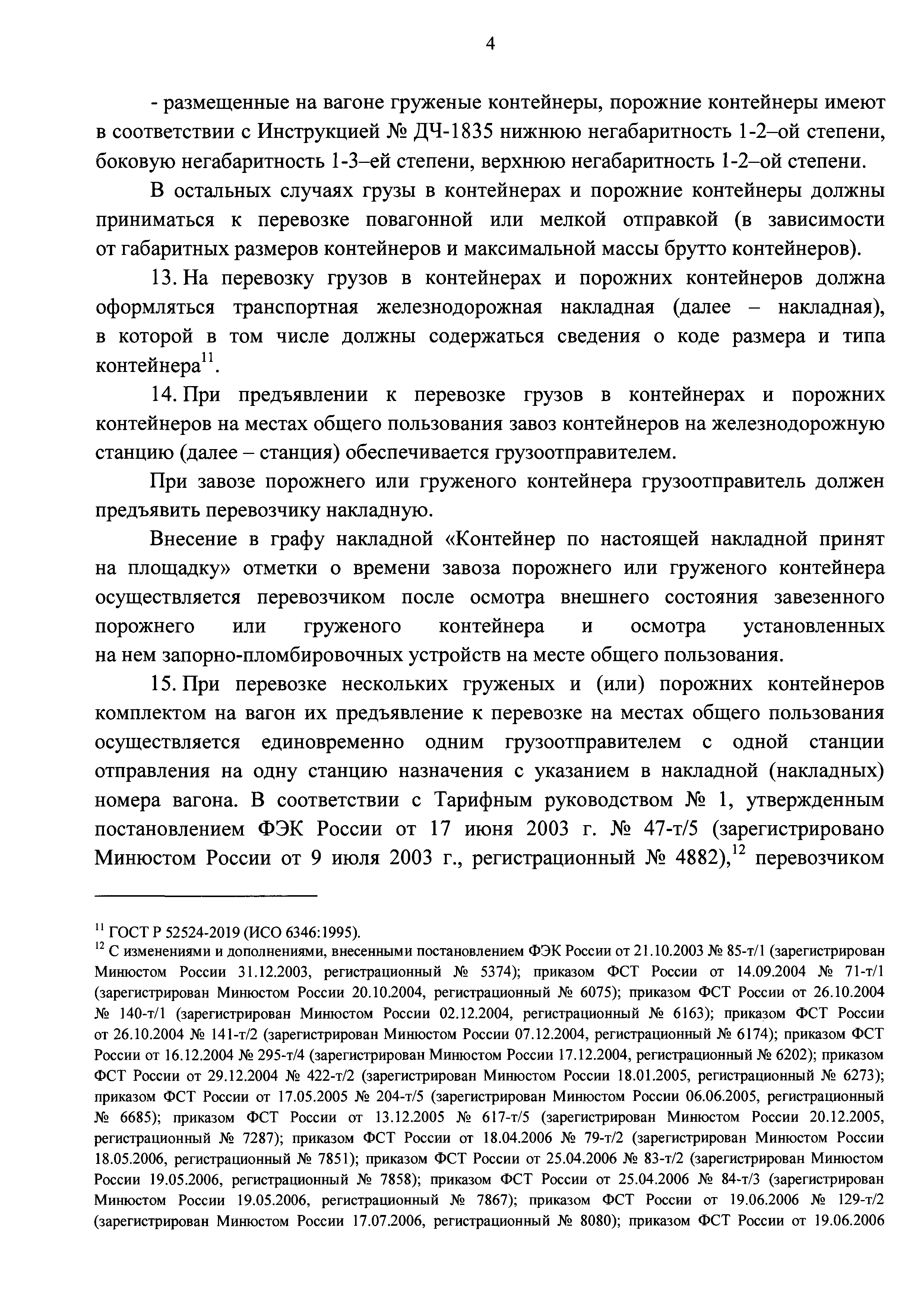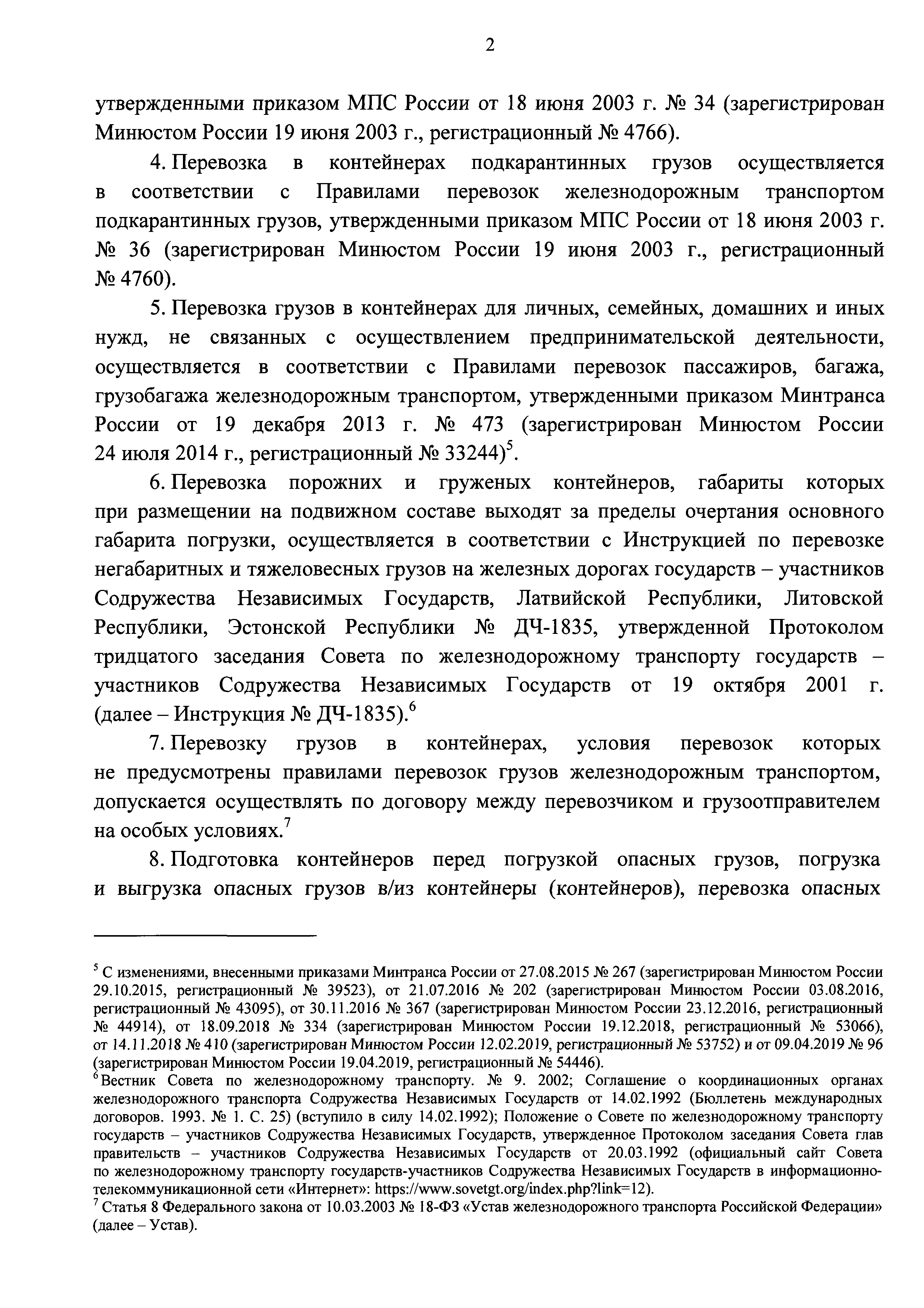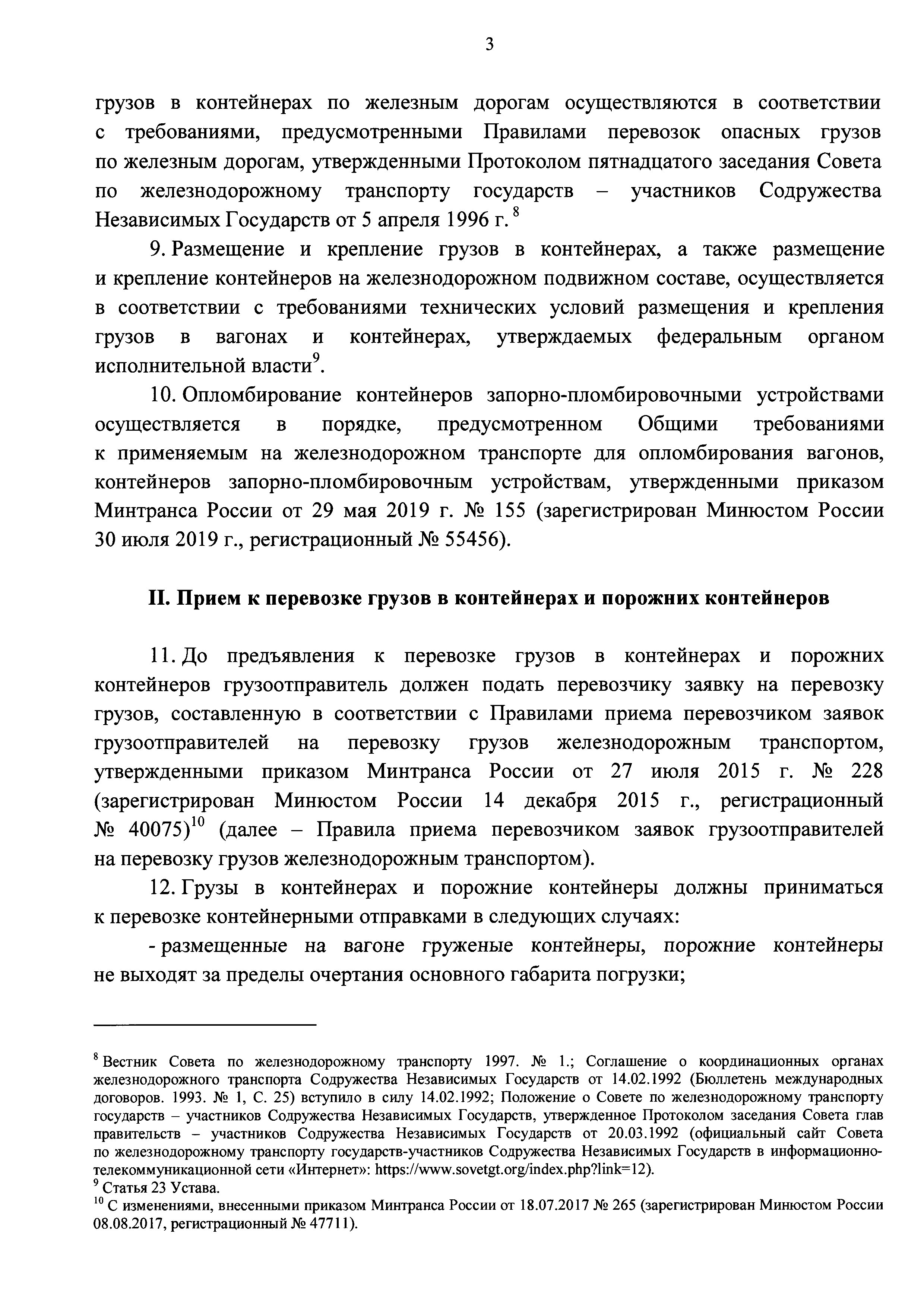 | Область применения: | Правила перевозок железнодорожным транспортом грузов в контейнерах и порожних контейнеров определяют порядок и условия перевозки железнодорожным транспортом грузов в контейнерах (универсальных, специальных и специализированных) и порожних контейнеров (универсальных, специальных и специализированных) |