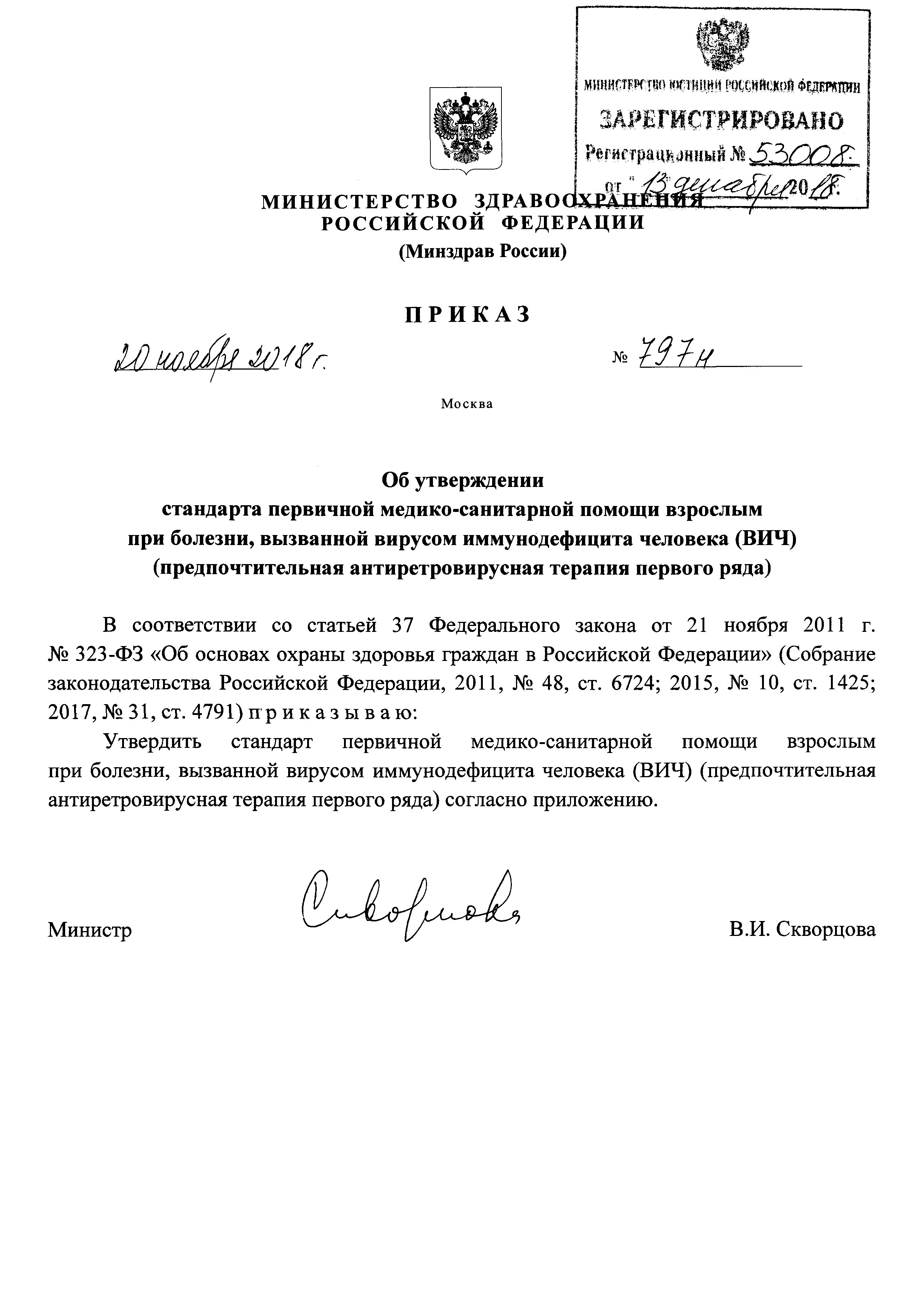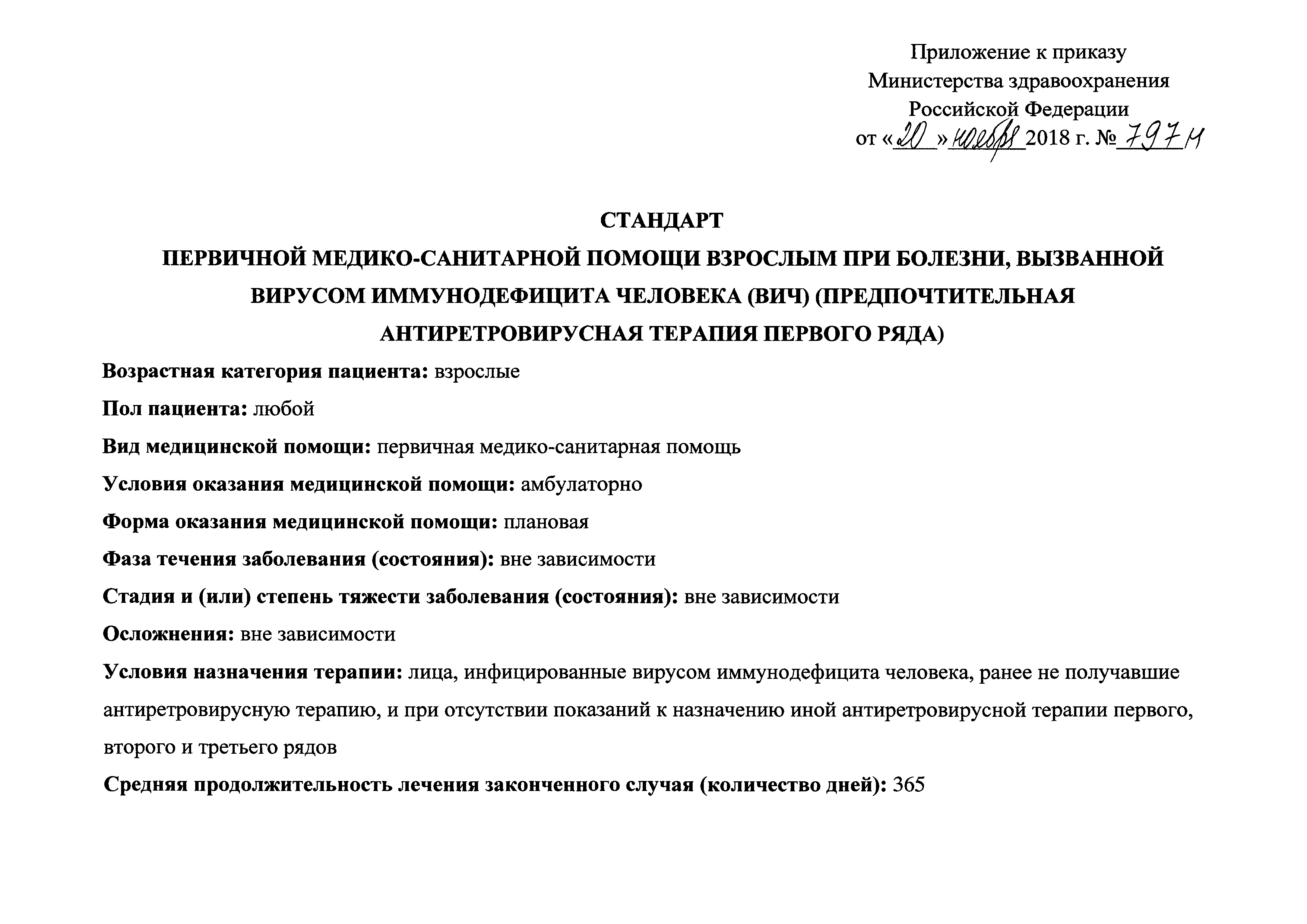 Стандарт первичной медико-санитарной помощи взрослым при болезни, вызванной вирусом иммунодефицита человека (ВИЧ) (предпочтительная антиретровирусная терапия первого ряда)| Статус: | действует | | Название рус.: | Стандарт первичной медико-санитарной помощи взрослым при болезни, вызванной вирусом иммунодефицита человека (ВИЧ) (предпочтительная антиретровирусная терапия первого ряда) | | Дата добавления в базу: | 01.01.2021 | | Дата актуализации: | 01.01.2021 | | Оглавление: | 1. Медицинские услуги для диагностики заболевания, состояния 2. Медицинские услуги для лечения заболевания, состояния и контроля за лечением 3. Перечень лекарственных препаратов для медицинского применения, зарегистрированных на территории Российской Федерации, с указанием средних суточных и курсовых доз | | Утверждён: | 20.11.2018 Минздрав России (Russian Federation Minzdrav 797н)