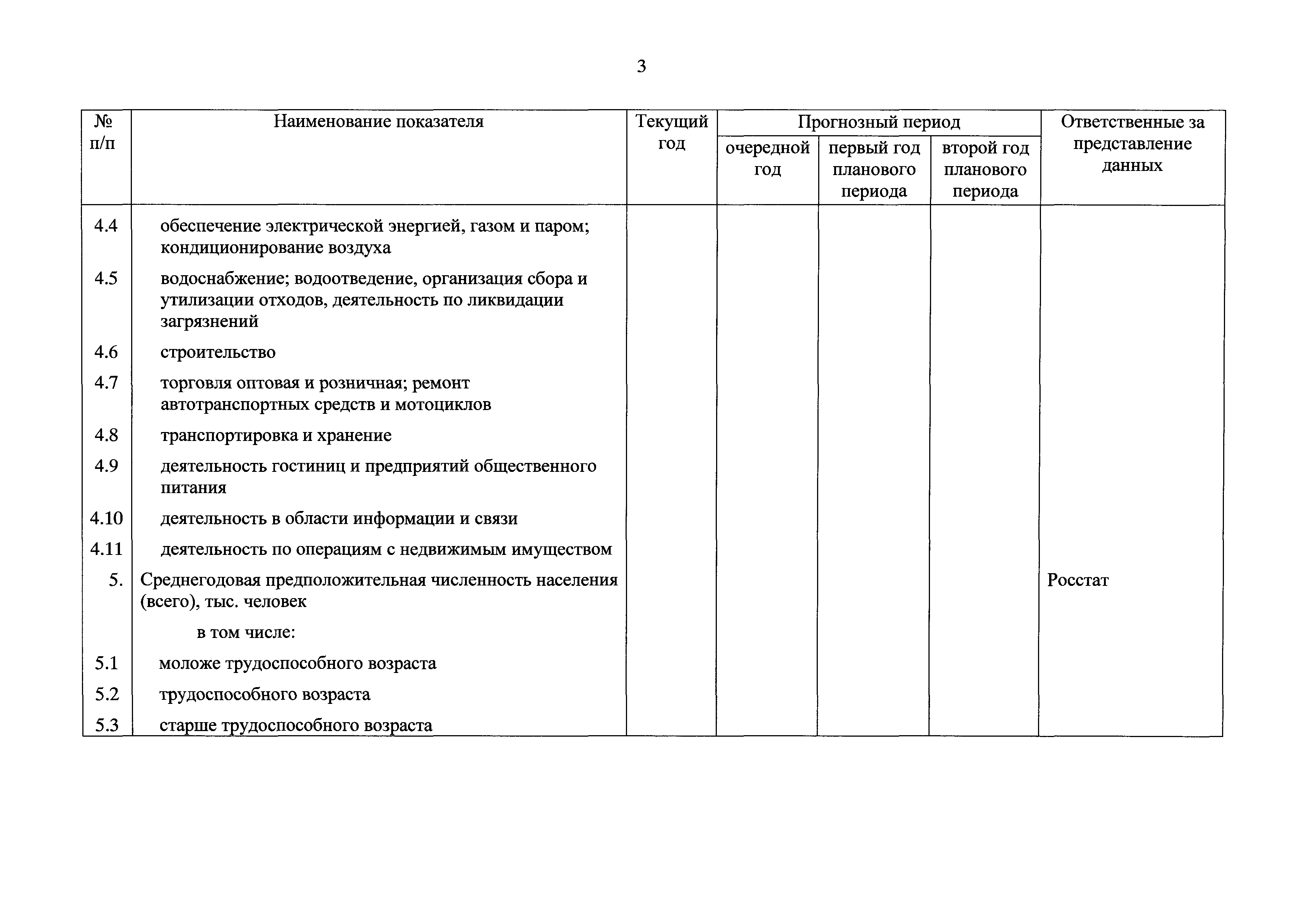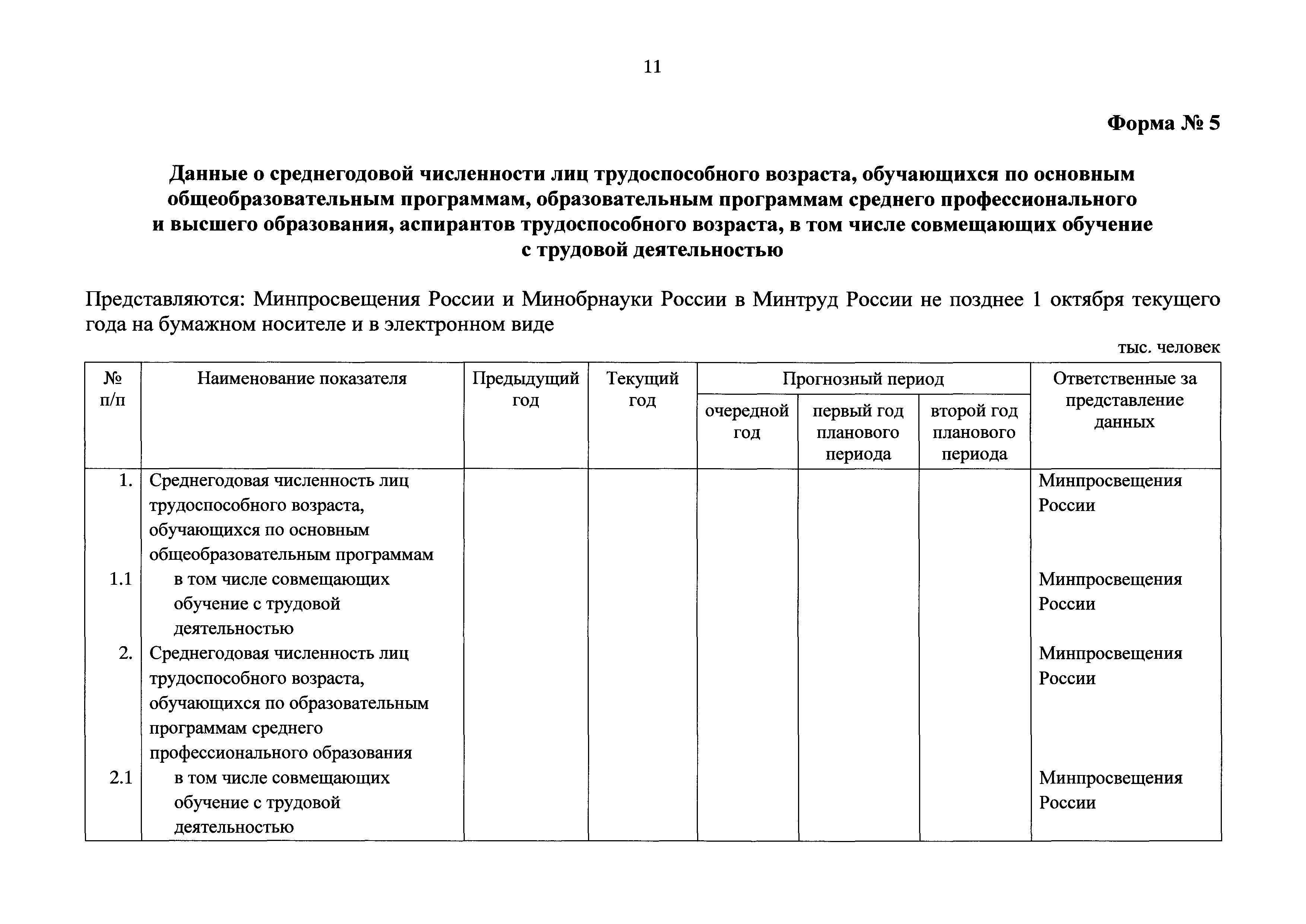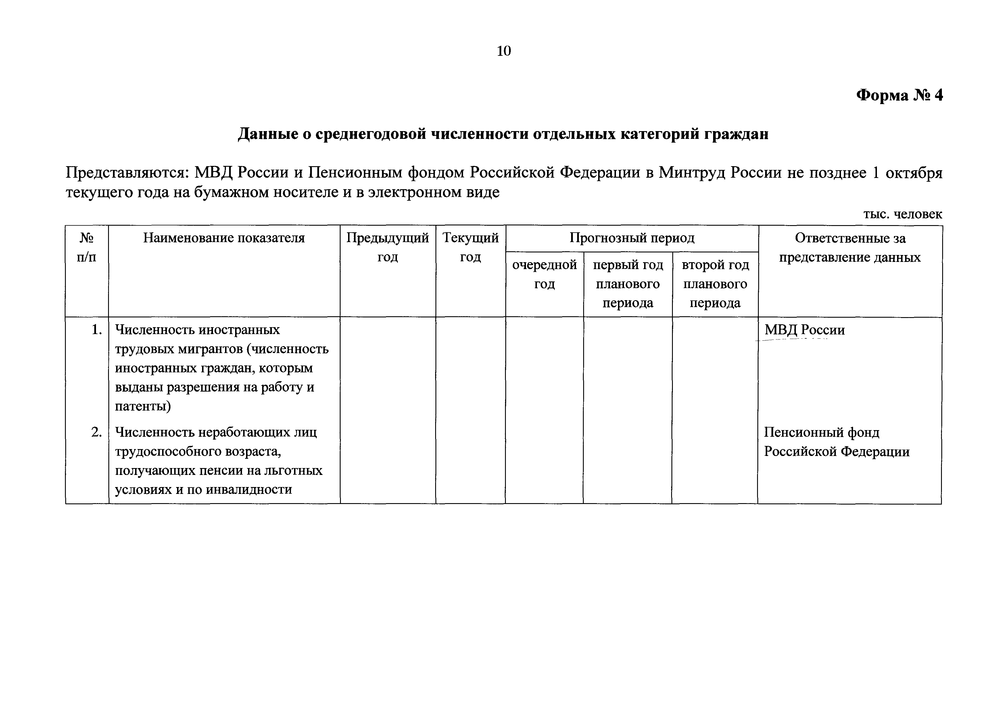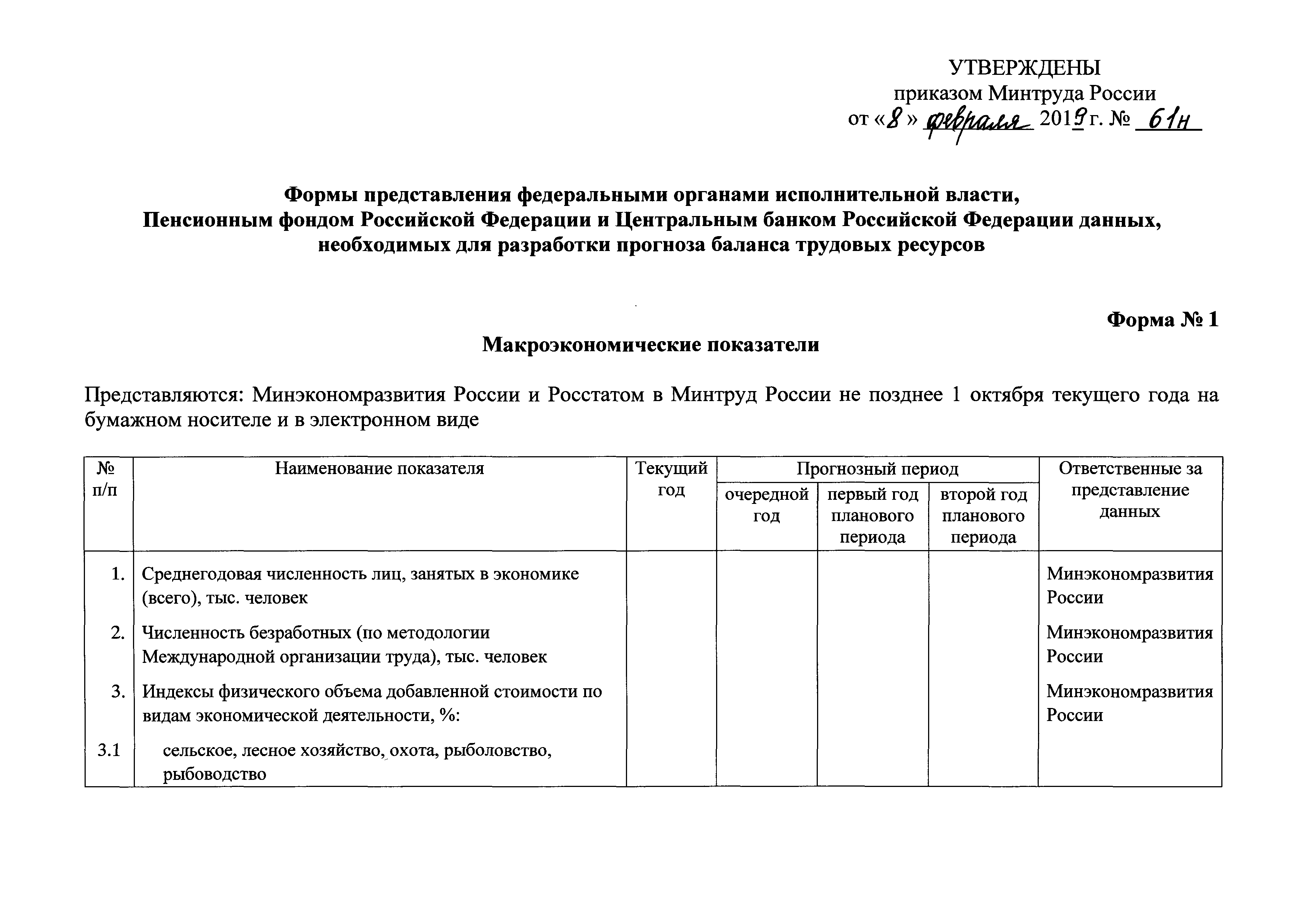 Формы представления федеральными органами исполнительной власти, Пенсионным фондом Российской Федерации и Центральным банком Российской Федерации данных, необходимых для разработки прогноза баланса трудовых ресурсов| Статус: | действует | | Название рус.: | Формы представления федеральными органами исполнительной власти, Пенсионным фондом Российской Федерации и Центральным банком Российской Федерации данных, необходимых для разработки прогноза баланса трудовых ресурсов | | Дата добавления в базу: | 01.01.2021 | | Дата актуализации: | 01.01.2021 | | Оглавление: | Форма № 1. Макроэкономические показатели Форма № 2. Данные о среднегодовой численности лиц, занятых в отдельных видах экономической деятельности Форма № 3. Данные о численности граждан (за исключением временно пребывающих и временно проживающих в Российской Федерации иностранных граждан и лиц без гражданства), за которых начислены страховые взносы на обязательное пенсионное страхование (включая граждан, заключивших договоры гражданско-правового характера), по возрастным группам и продолжительности периода работы Форма № 4. Данные о среднегодовой численности отдельных категорий граждан Форма № 5. Данные о среднегодовой численности лиц трудоспособного возраста, обучающихся по основным общеобразовательным программам, образовательным программам среднего профессионального и высшего образования, аспирантов трудоспособного возраста, в том числе совмещающих обучение с трудовой деятельностью | | Утверждён: | 08.02.2019 Минтруд России (61н)