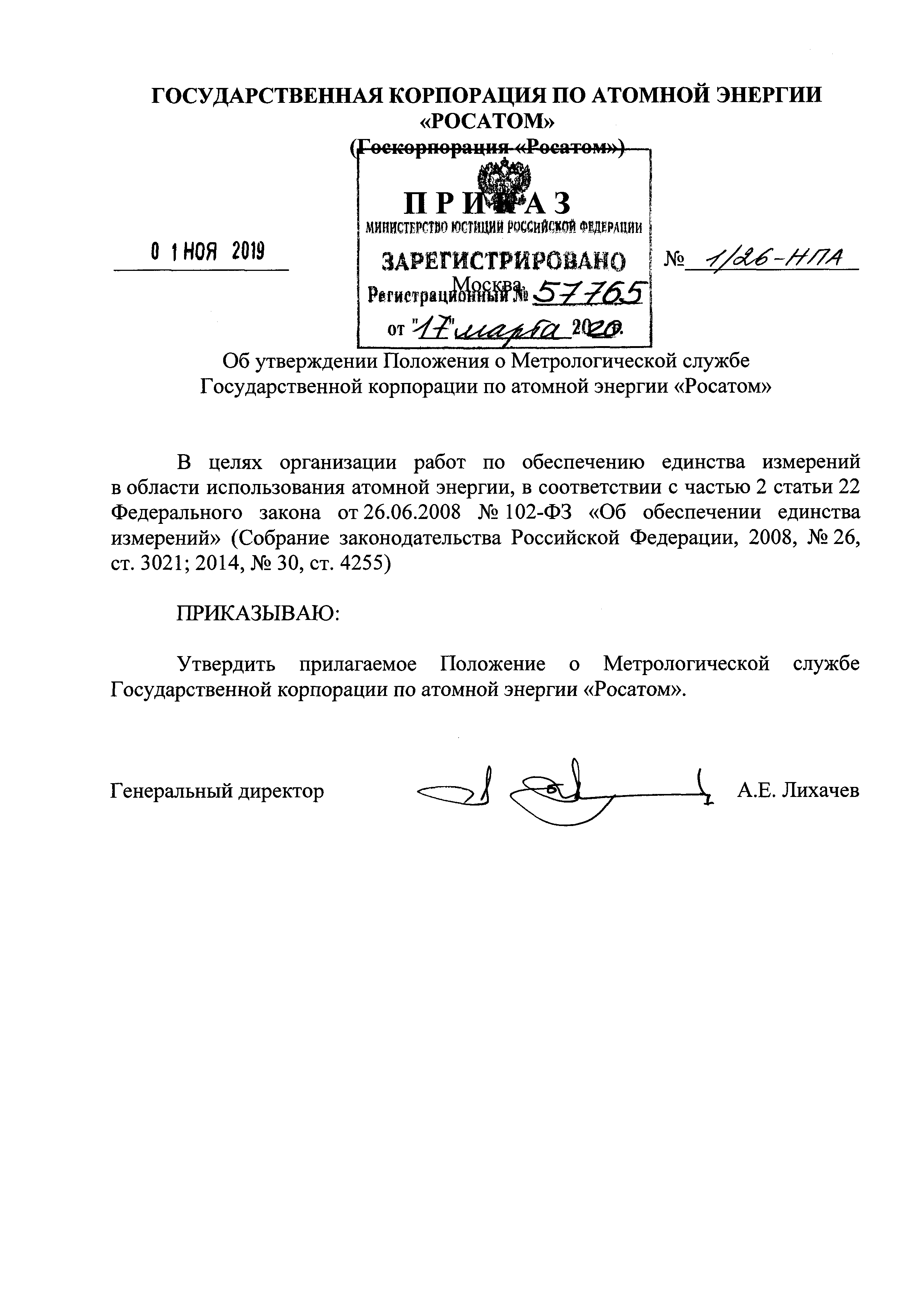 Положение о Метрологической службе Государственной корпорации по атомной энергии "Росатом"| Статус: | действует | | Название рус.: | Положение о Метрологической службе Государственной корпорации по атомной энергии "Росатом" | | Дата добавления в базу: | 01.01.2021 | | Дата актуализации: | 01.01.2021 | | Дата введения: | 29.03.2020 | | Область применения: | Положение о Метрологической службе Государственной корпорации по атомной энергии "Росатом" определяет права и обязанности, порядок организации и координации деятельности Метрологической службы Государственной корпорации по атомной энергии "Росатом" | | Оглавление: | I. Общие положения II. Права и обязанности Метрологической службы III. Порядок организации и координации деятельности Метрологической службы | | Утверждён: | 01.11.2019 Государственная корпорация по атомной энергии РОСАТОМ (1/26-НПА)