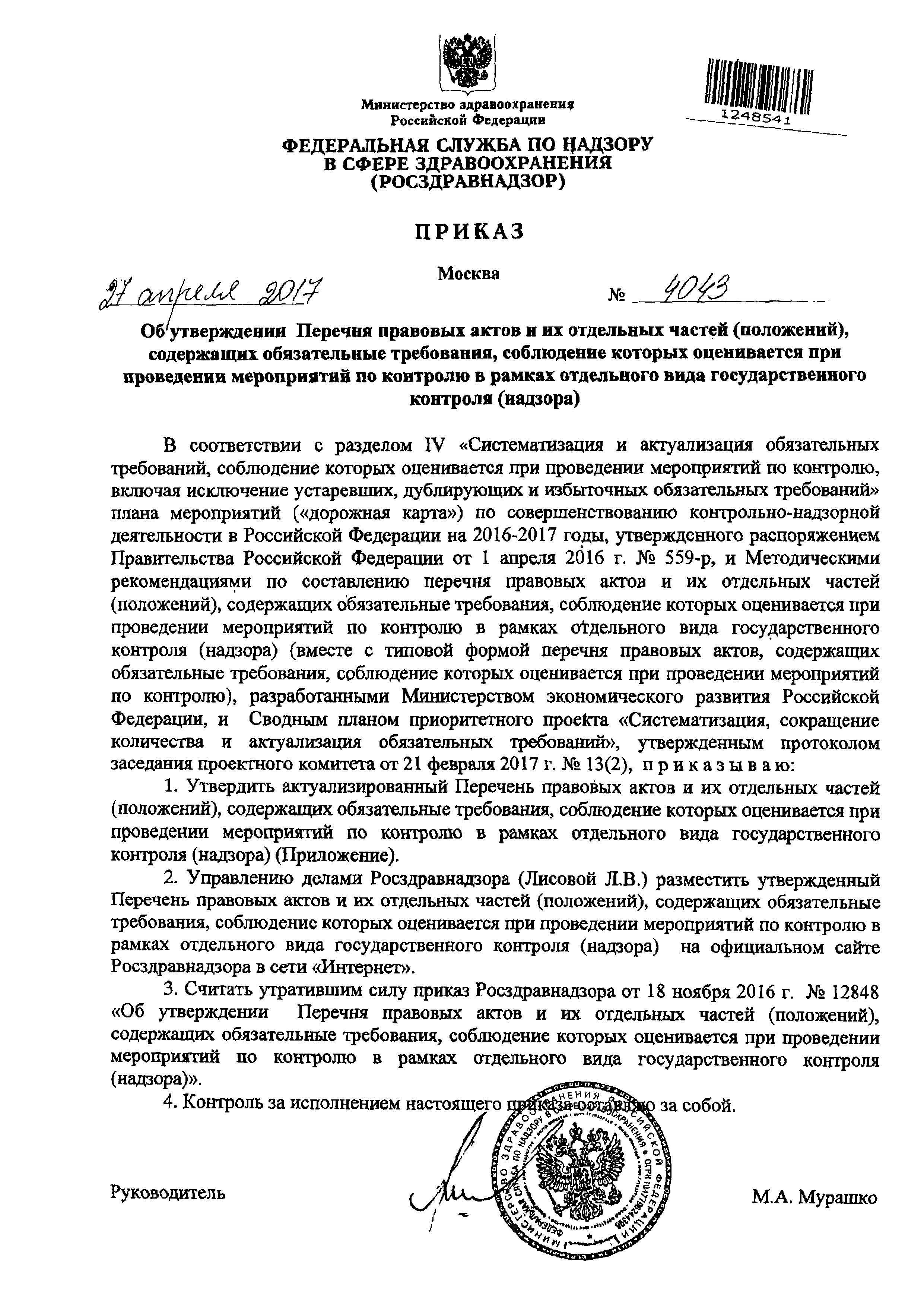 | | Список изменений: | | | Заменяет собой: | - Приказ 12848 «Перечень правовых актов и их отдельных частей (положений), содержащих обязательные требования, соблюдение которых оценивается при проведении мероприятий по контролю в рамках отдельного вида государственного контроля (надзора)» (приказ Росздравнадзора от 18 ноября 2016 г. № 12848)