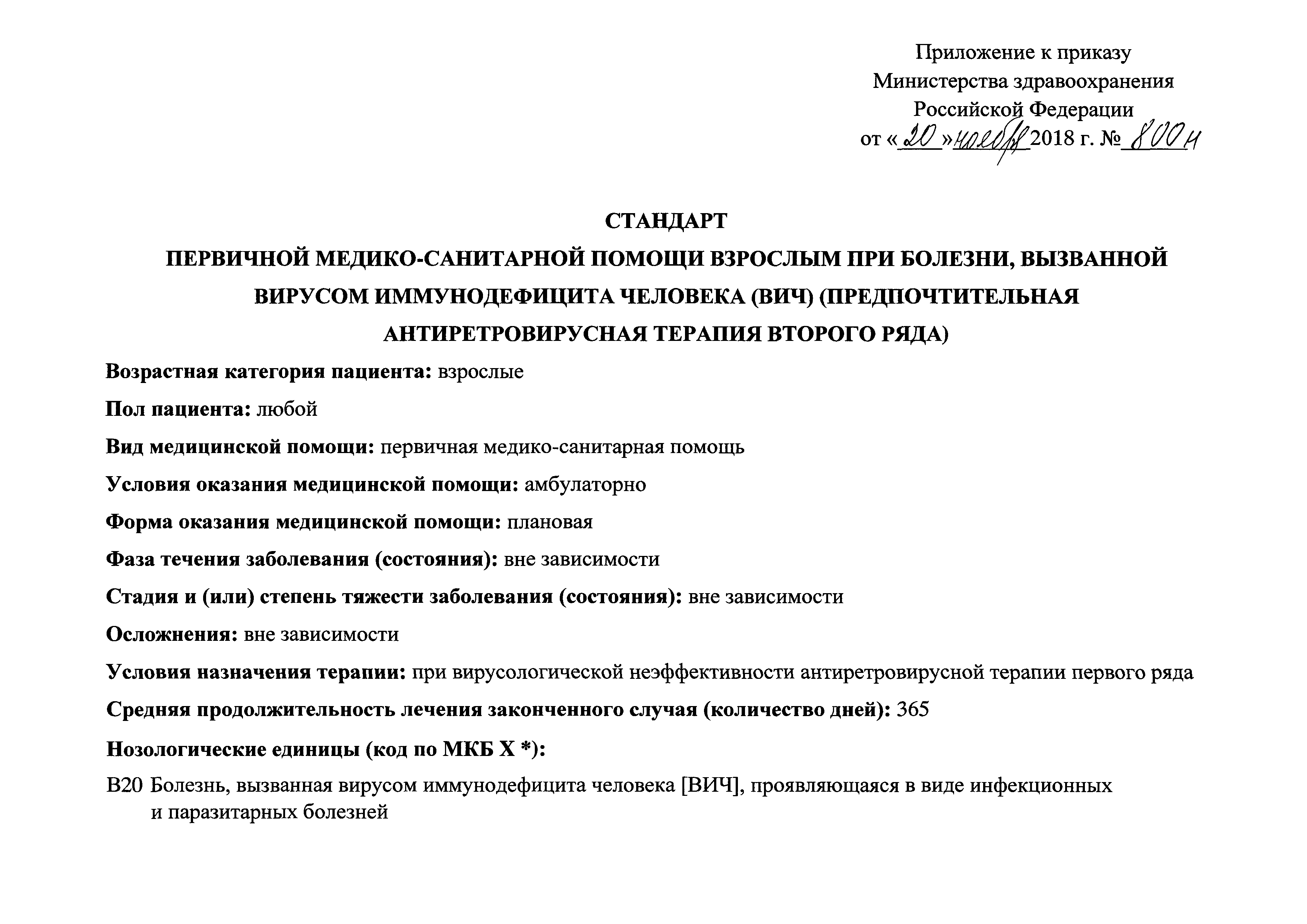 Стандарт первичной медико-санитарной помощи взрослым при болезни, вызванной вирусом иммунодефицита человека (ВИЧ) (Предпочтительная антиретровирусная терапия второго ряда)| Статус: | действует | | Название рус.: | Стандарт первичной медико-санитарной помощи взрослым при болезни, вызванной вирусом иммунодефицита человека (ВИЧ) (Предпочтительная антиретровирусная терапия второго ряда) | | Дата добавления в базу: | 01.01.2021 | | Дата актуализации: | 01.01.2021 | | Оглавление: | 1. Медицинские услуги для диагностики заболевания, состояния 2. Медицинские услуги для лечения заболевания, состояния и контроля за лечением 3. Перечень лекарственных препаратов для медицинского применения, зарегистрированных на территории Российской Федерации, с указанием средних суточных и курсовых доз | | Утверждён: | 20.11.2018 Минздрав России (Russian Federation Minzdrav 800н)