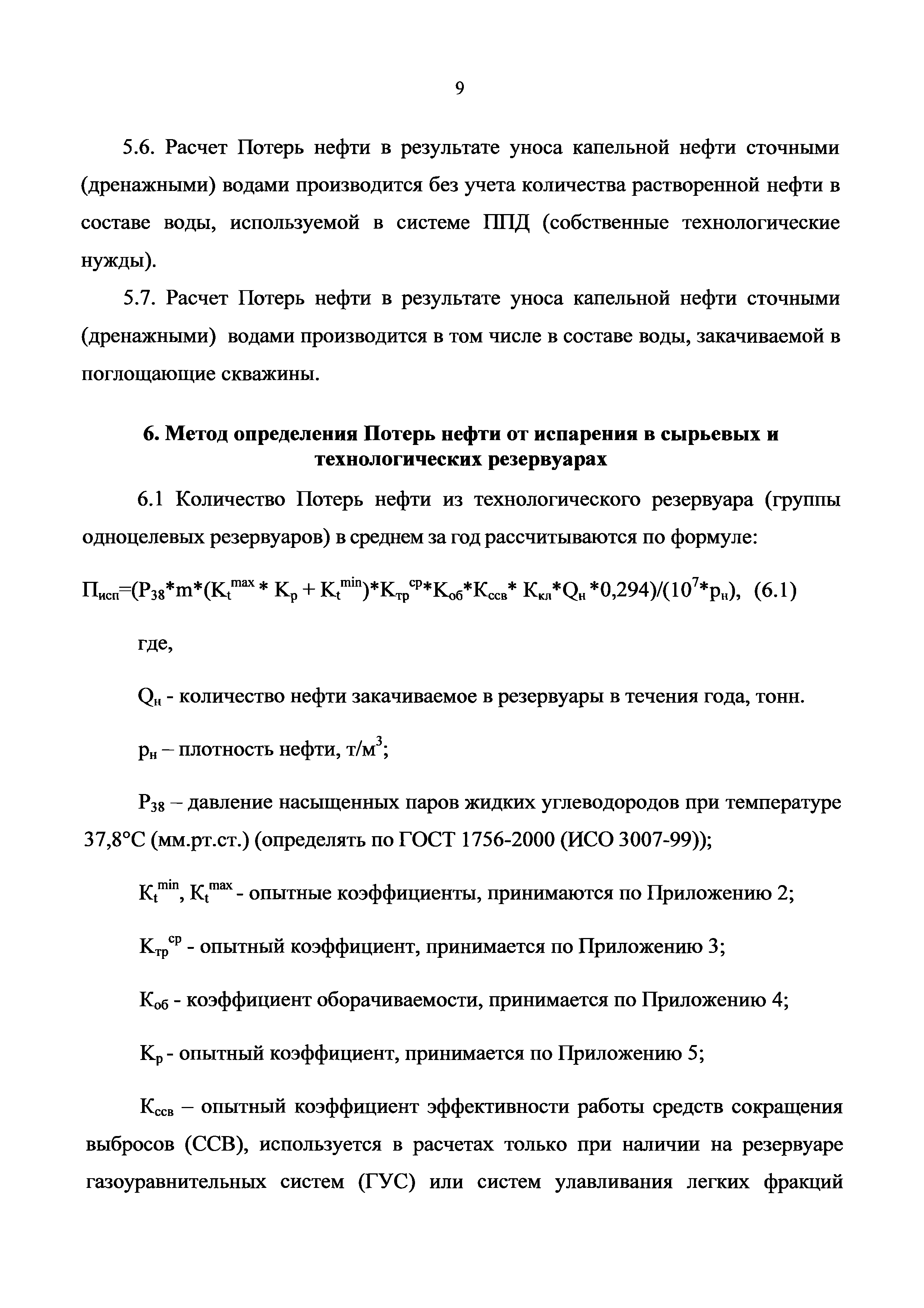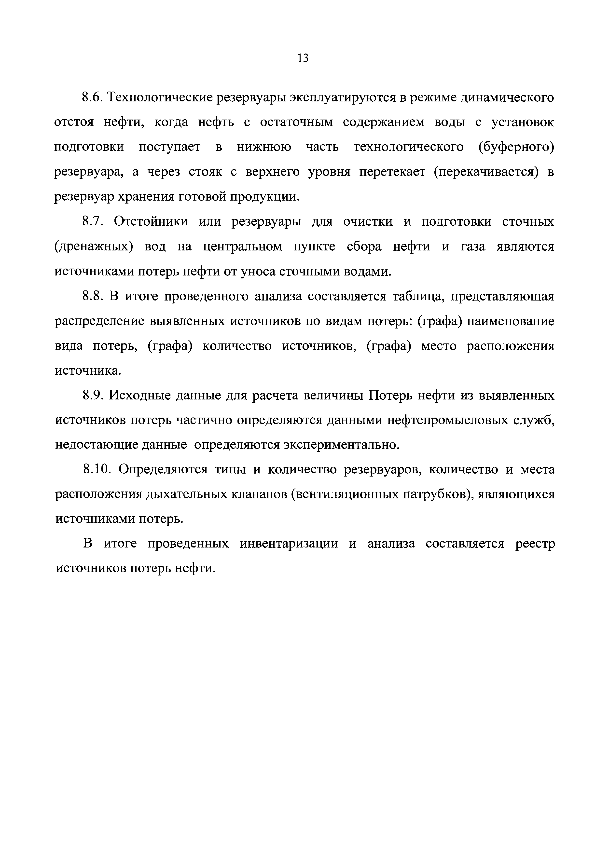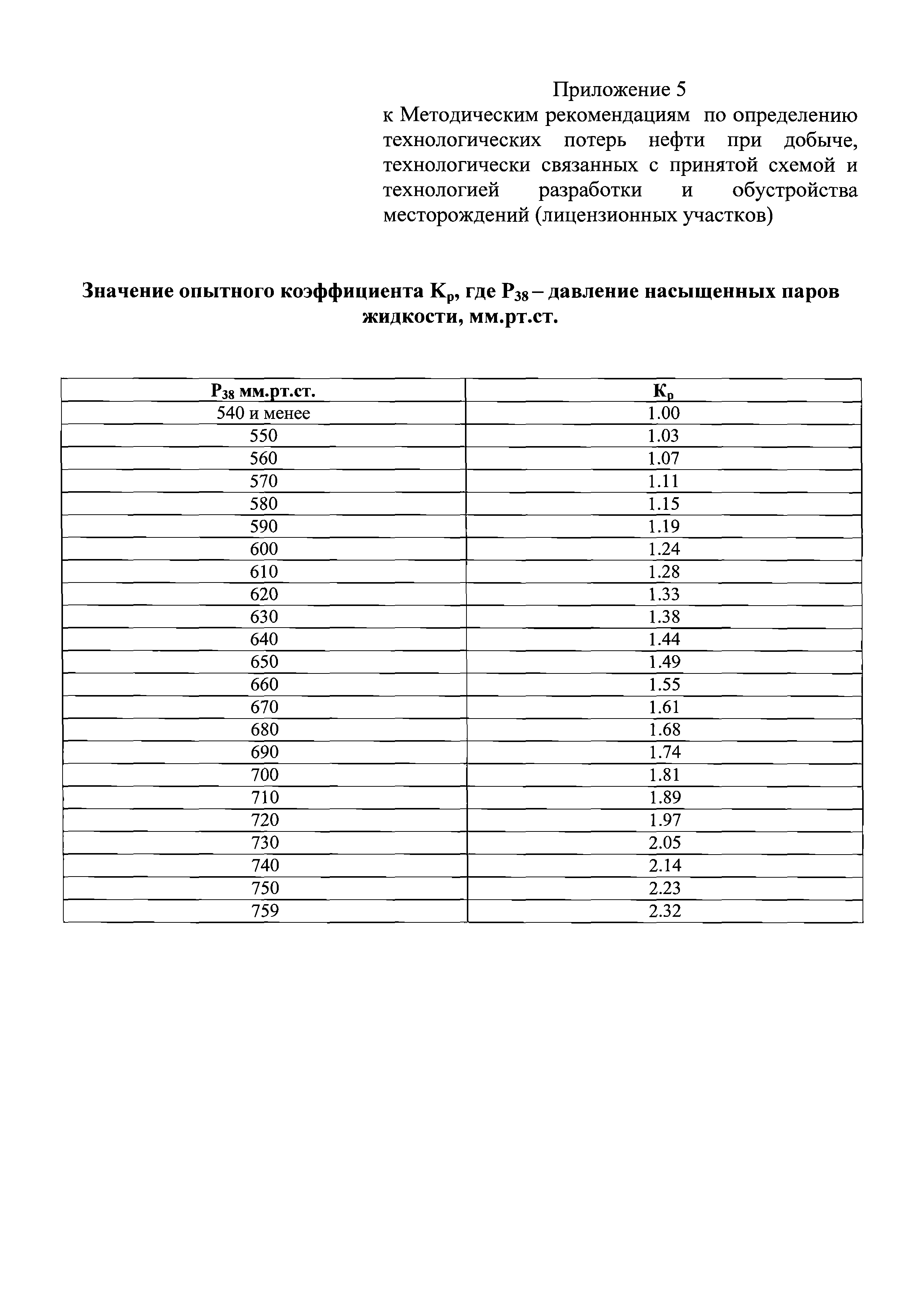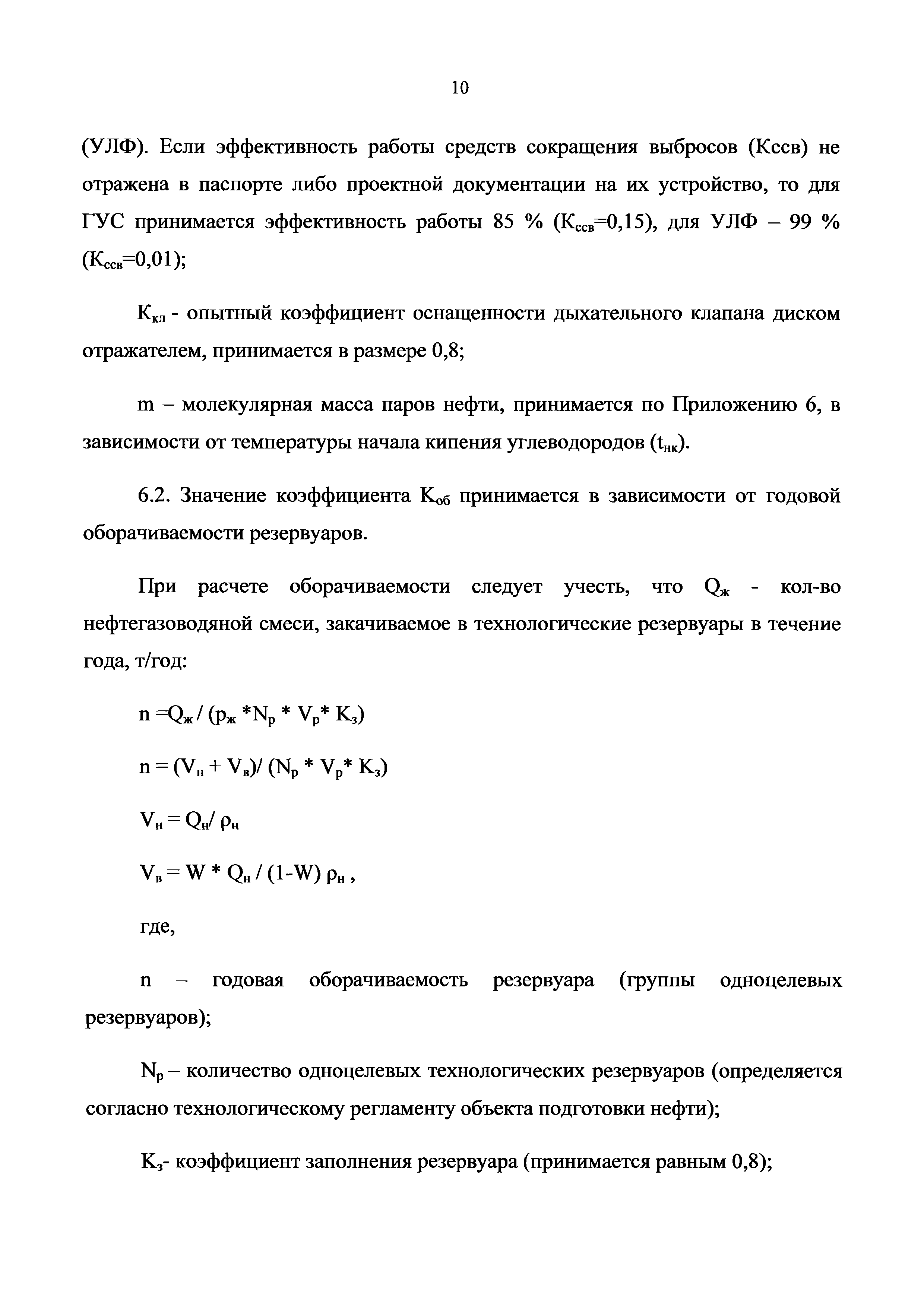 Методические рекомендации по определению технологических потерь нефти при добыче, технологически связанных с принятой схемой и технологией разработки и обустройства месторождений (лицензионных участков, участков недр)| Статус: | действует | | Название рус.: | Методические рекомендации по определению технологических потерь нефти при добыче, технологически связанных с принятой схемой и технологией разработки и обустройства месторождений (лицензионных участков, участков недр) | | Дата добавления в базу: | 01.01.2021 | | Дата актуализации: | 01.01.2021 | | Область применения: | Методические рекомендации по определению технологических потерь нефти при добыче, технологически связанных с принятой схемой и технологией разработки и обустройства месторождений (лицензионных участков, участков недр) предназначены для определения способов и методов оценки потерь нефти при добыче, технологически связанных с принятой схемой и технологией разработки и обустройства месторождений (лицензионного участка, участка недр) при подготовке обоснований и расчетов технологических потерь нефти в целях утверждения Министерством энергетики Российской Федерации нормативов технологических потерь нефти при добыче. | | Оглавление: | 1. Общие положения 2. Источники Потерь нефти 3. Обоснование величины Потерь нефти 4. Метод определения Потерь нефти от уноса нефти потоком нефтяного (попутного) газа 5. Методы определения Потерь нефти в результате уноса капельной нефти сточными (дренажными) водами 6. Метод определения Потерь нефти от испарения в сырьевых и технологических резервуарах 7. Отбор и подготовка к анализу проб нефти и проб газовой смеси 8. Рекомендации по организации исследований для определения Потерь нефти Приложение 1. Структура технологических потерь нефти обезвоженной, обессоленной и стабилизированной в предыдущем и плановом году по каждому объекту потерь месторождения Приложение 2. Значения опытных коэффициентов Приложение 3. Значение опытного коэффициента К тр ср Приложение 4. Значение опытного коэффициента Коб Приложение 5. Значение опытного коэффициента Кр Приложение 6. Значение молекулярной массы паров нефтей в зависимости от температуры начала кипения углеводородов Приложение 7. Расчет потерь нефти от испарения из технологических резервуаров | | Утверждён: | 10.04.2018 Минэнерго России (Russian Federation Minenergo )