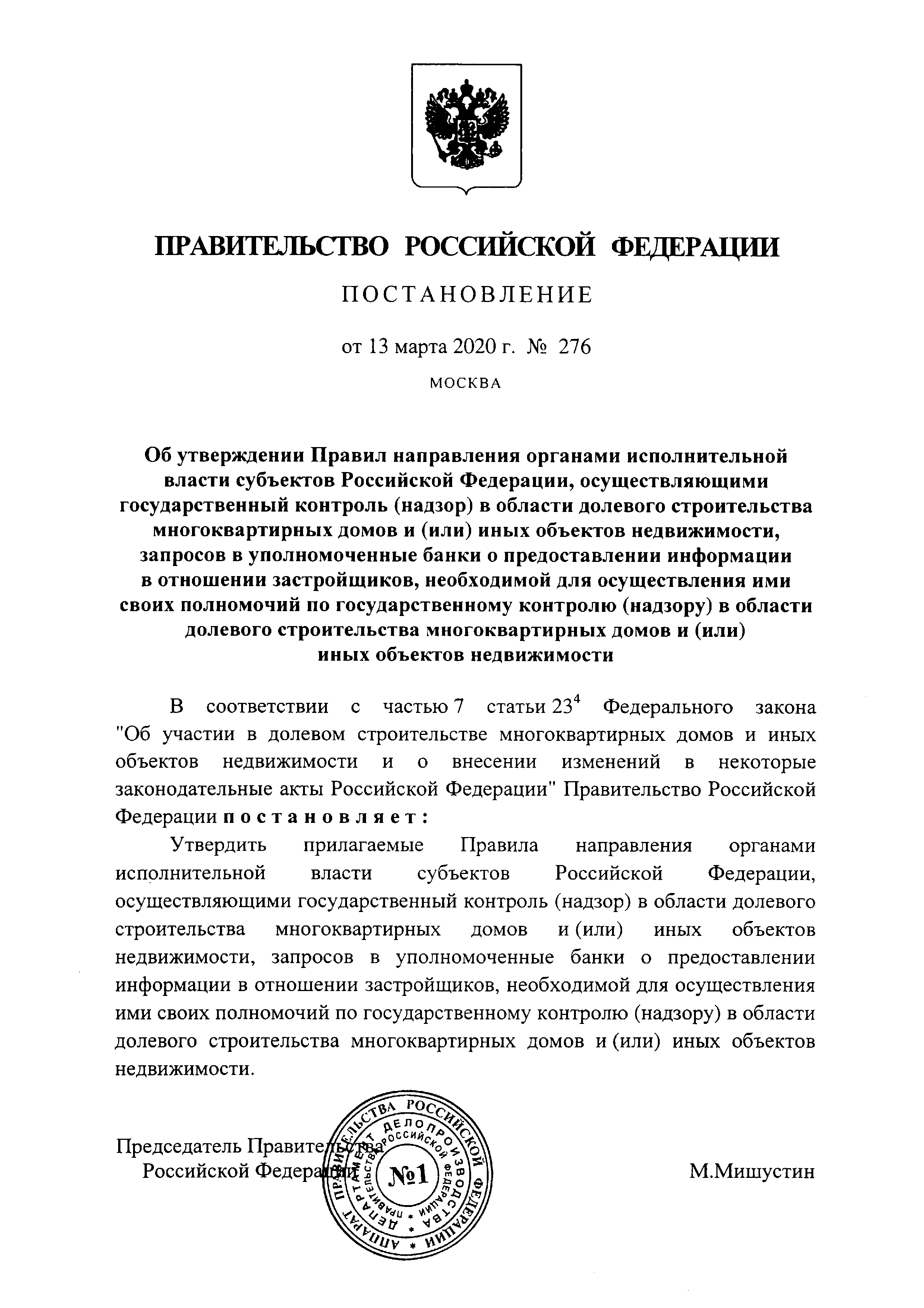 Правила направления органами исполнительной власти субъектов Российской Федерации, осуществляющими государственный контроль (надзор) в области долевого строительства многоквартирных домов и (или) иных объектов недвижимости, запросов в уполномоченные банки о предоставлении информации в отношении застройщиков, необходимой для осуществления ими своих полномочий по государственному контролю (надзору) в области долевого строительства многоквартирных домов и (или) иных объектов недвижимости| Статус: | действует | | Название рус.: | Правила направления органами исполнительной власти субъектов Российской Федерации, осуществляющими государственный контроль (надзор) в области долевого строительства многоквартирных домов и (или) иных объектов недвижимости, запросов в уполномоченные банки о предоставлении информации в отношении застройщиков, необходимой для осуществления ими своих полномочий по государственному контролю (надзору) в области долевого строительства многоквартирных домов и (или) иных объектов недвижимости | | Дата добавления в базу: | 01.01.2021 | | Дата актуализации: | 01.01.2021 | | Дата введения: | 25.03.2020 | | Область применения: | Правила определяют порядок направления органами исполнительной власти субъектов Российской Федерации, осуществляющими государственный контроль (надзор) в области долевого строительства многоквартирных домов и (или) иных объектов недвижимости, запросов в уполномоченные банки, определяемые в соответствии с пунктом 3 статьи 2 Федерального закона "Об участии в долевом строительстве многоквартирных домов и иных объектов недвижимости и о внесении изменений в некоторые законодательные акты Российской Федерации", о предоставлении информации в отношении застройщиков, в том числе в отношении застройщиков, являющихся приобретателями имущества, и обязательств застройщиков в соответствии со статьей 20115-1 Федерального закона "О несостоятельности (банкротстве)", необходимой для осуществления ими своих полномочий по государственному контролю (надзору) в области долевого строительства многоквартирных домов и (или) иных объектов недвижимости | | Утверждён: | 13.03.2020 Правительство Российской Федерации (276)