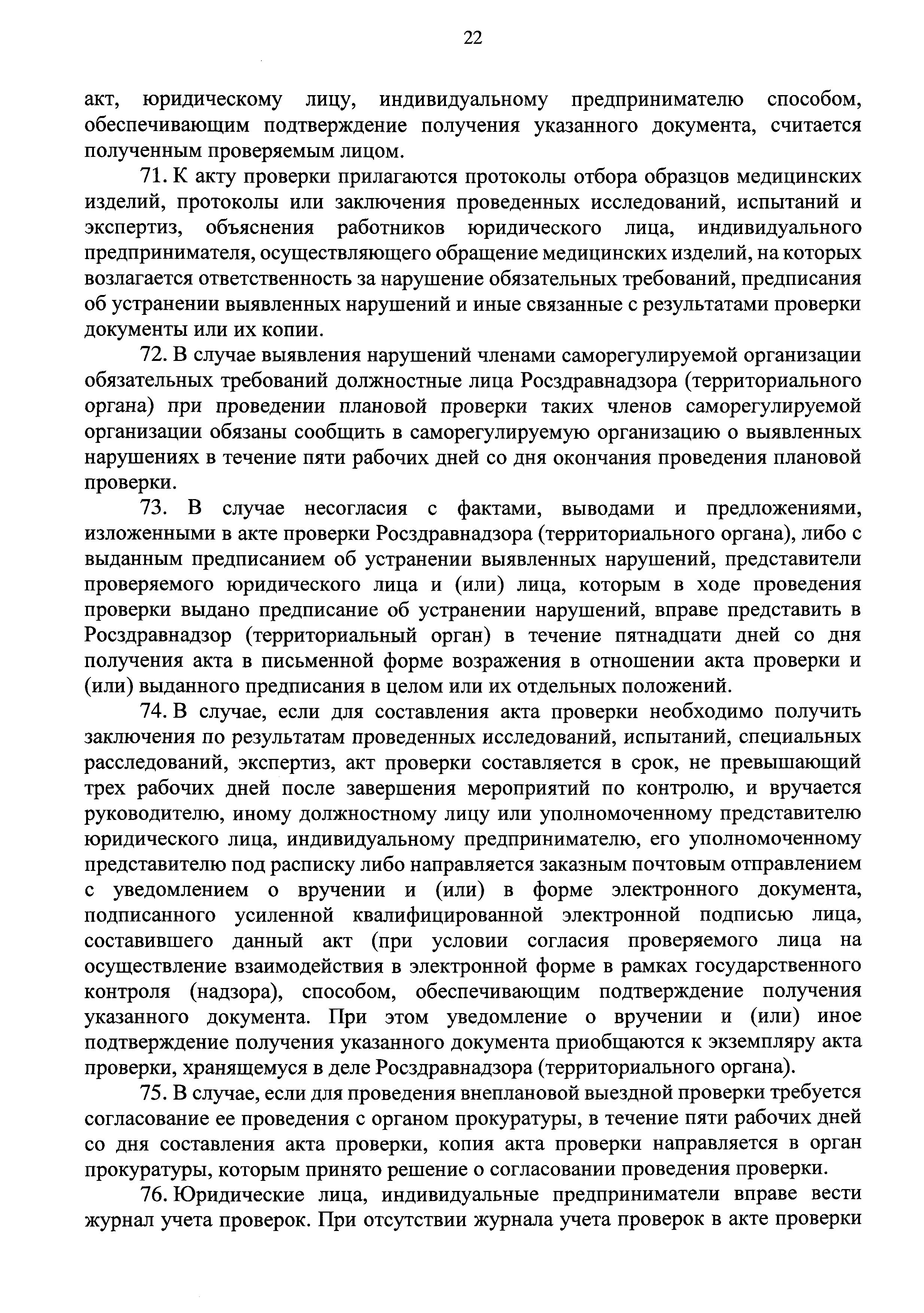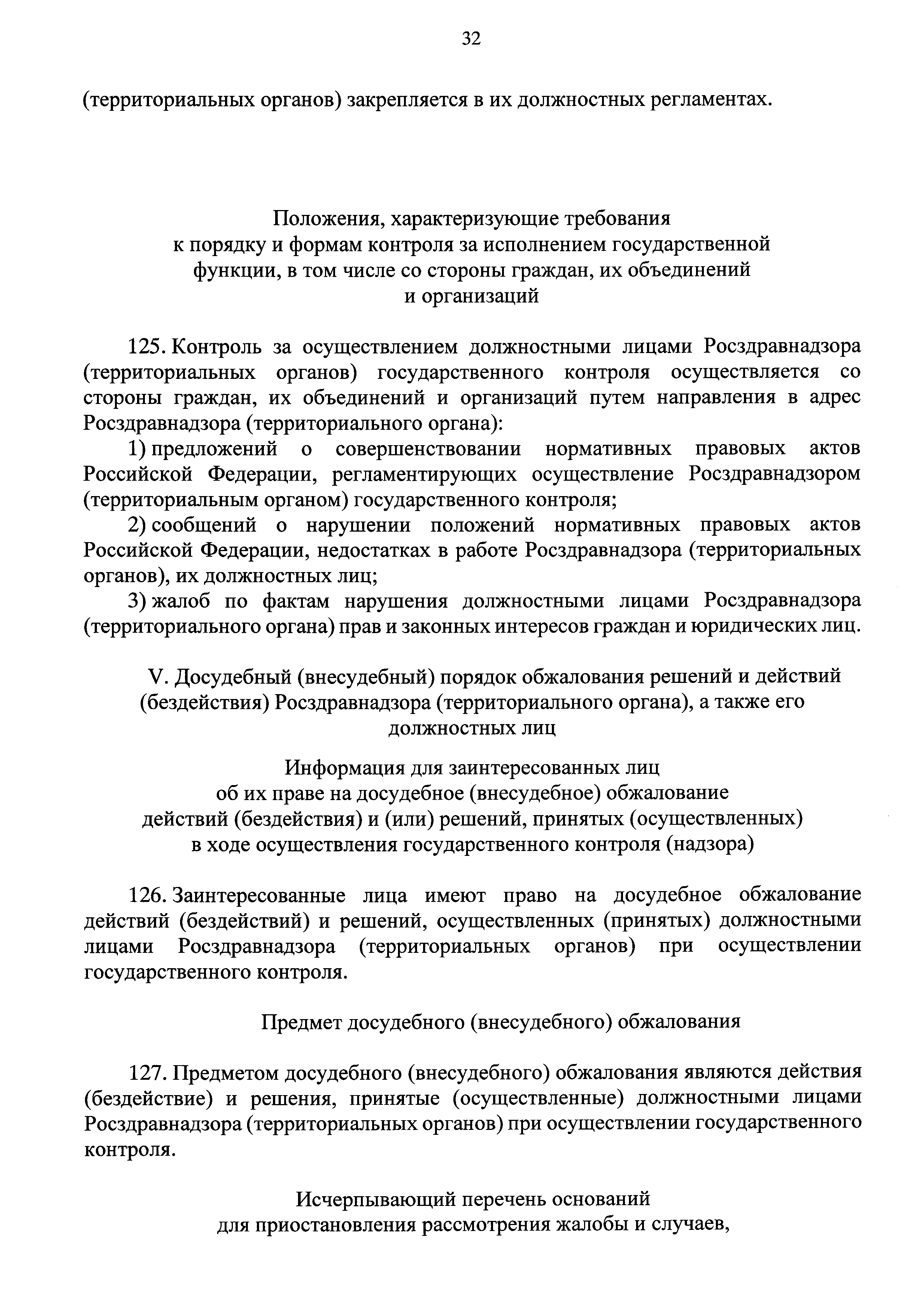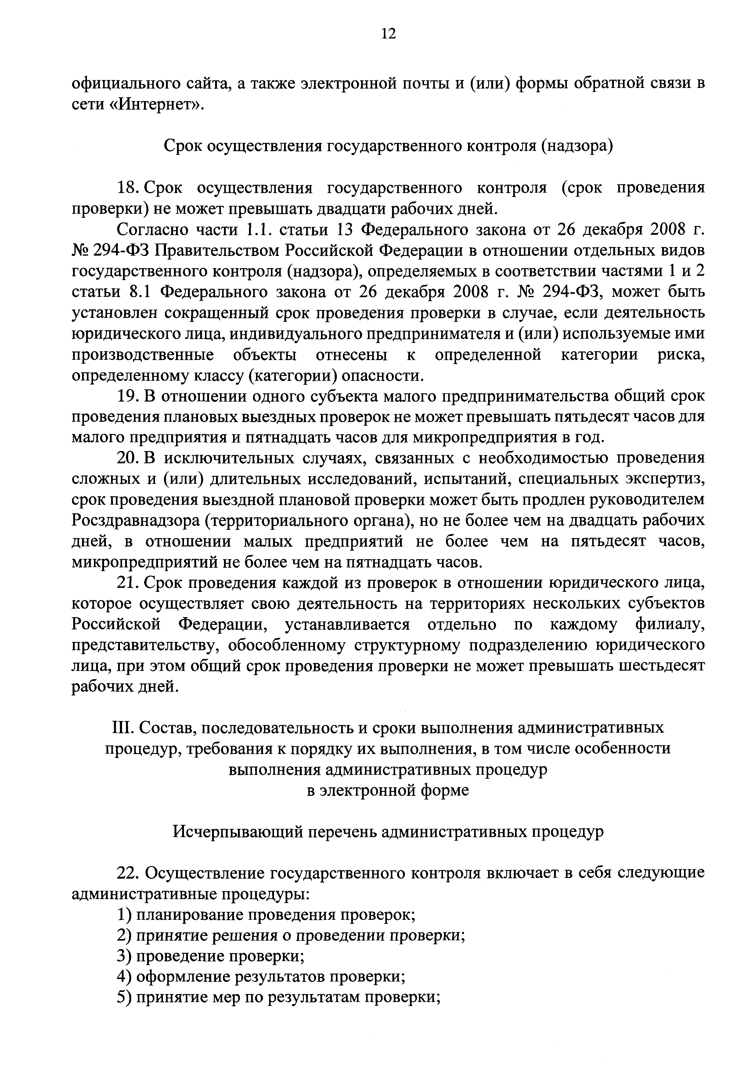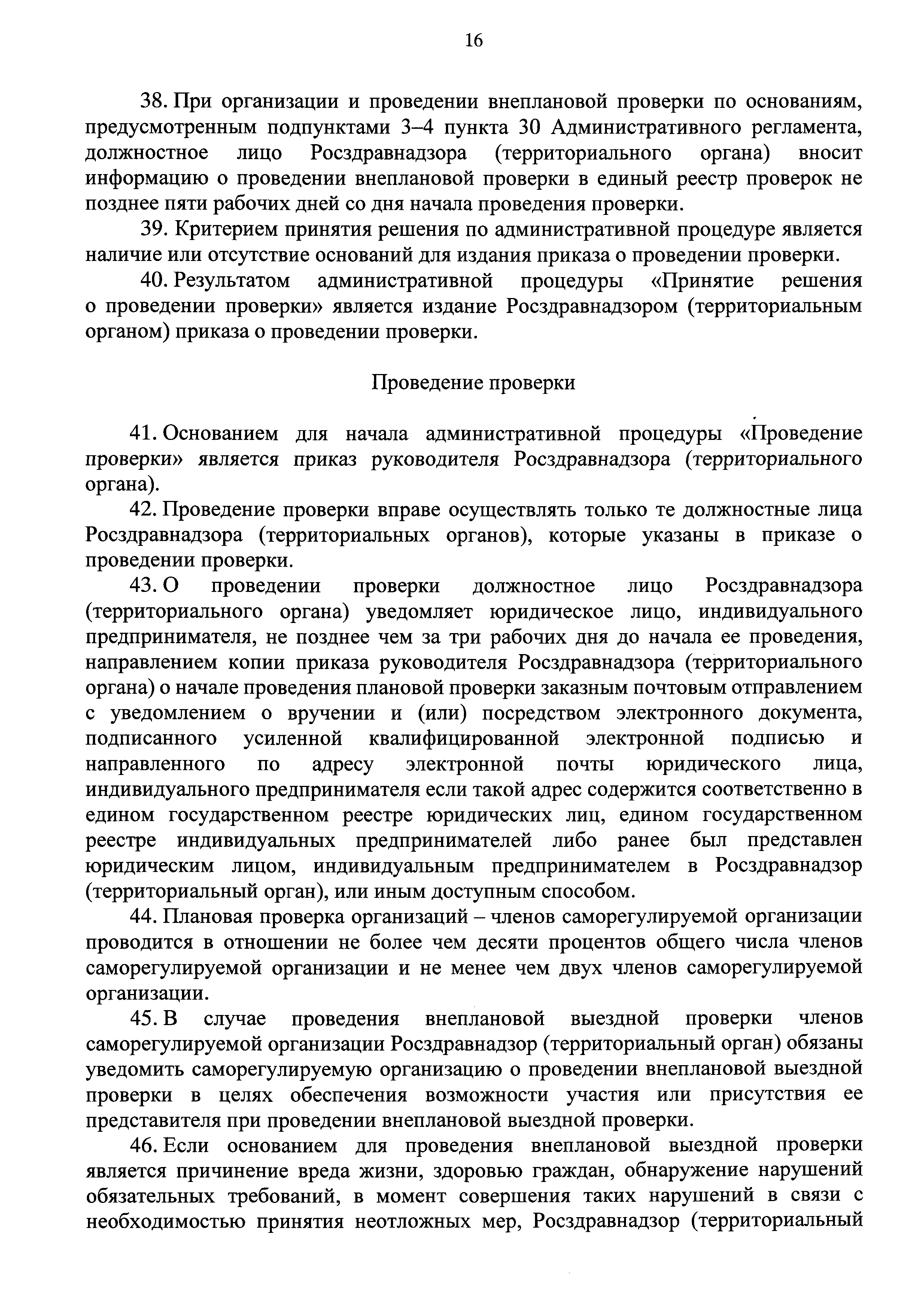 | Оглавление: | I. Общие положения II. Требования к порядку осуществления государственного контроля (надзора) III. Состав, последовательность и сроки выполнения административных процедур, требования к порядку их выполнения, в том числе особенности выполнения административных процедур в электронной форме IV. Порядок и формы контроля за осуществлением государственного контроля (надзора) V. Досудебный (внесудебный) порядок обжалования решений и действий (бездействия) Росздравнадзора (территориального органа), а также его должностных лиц |