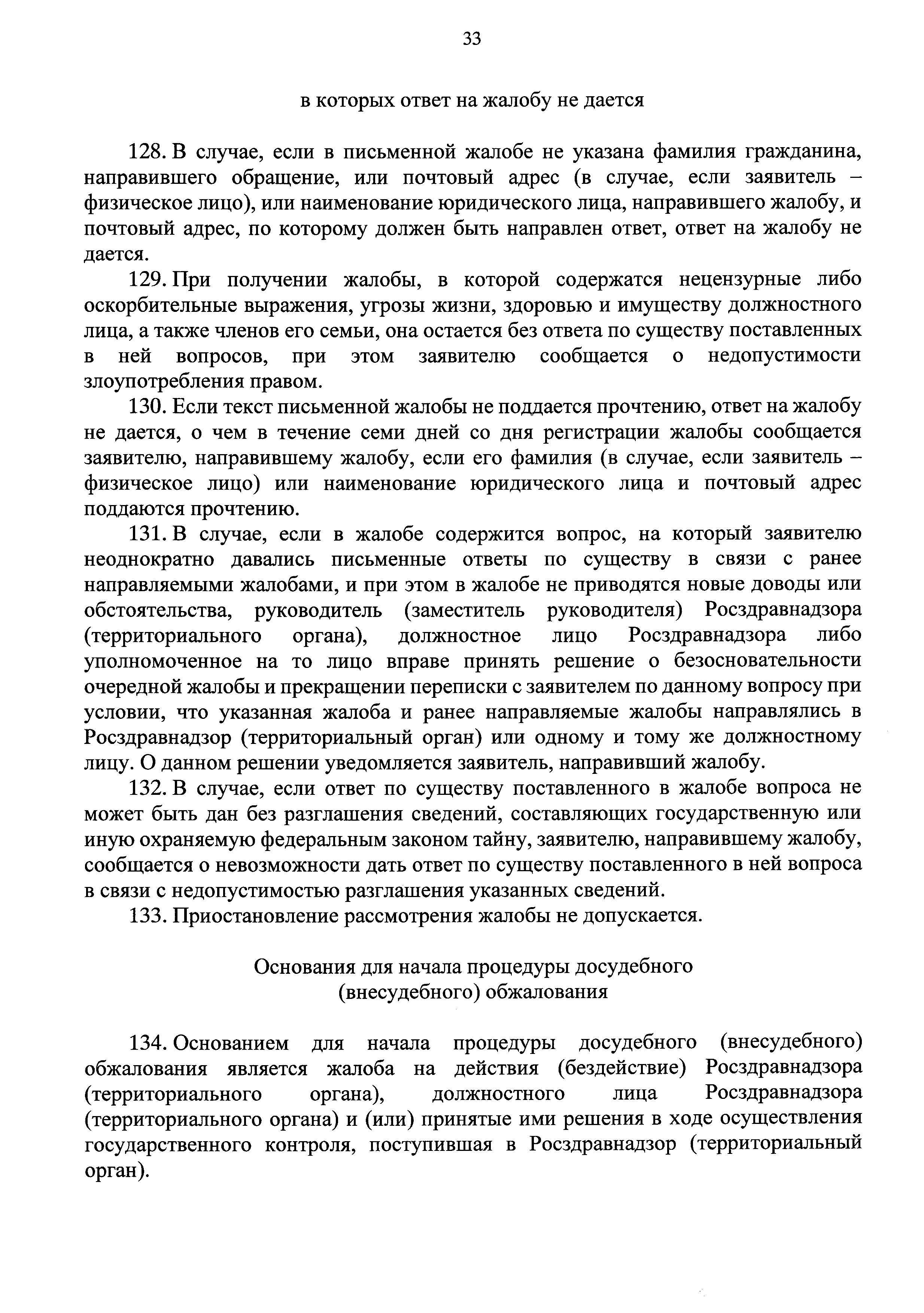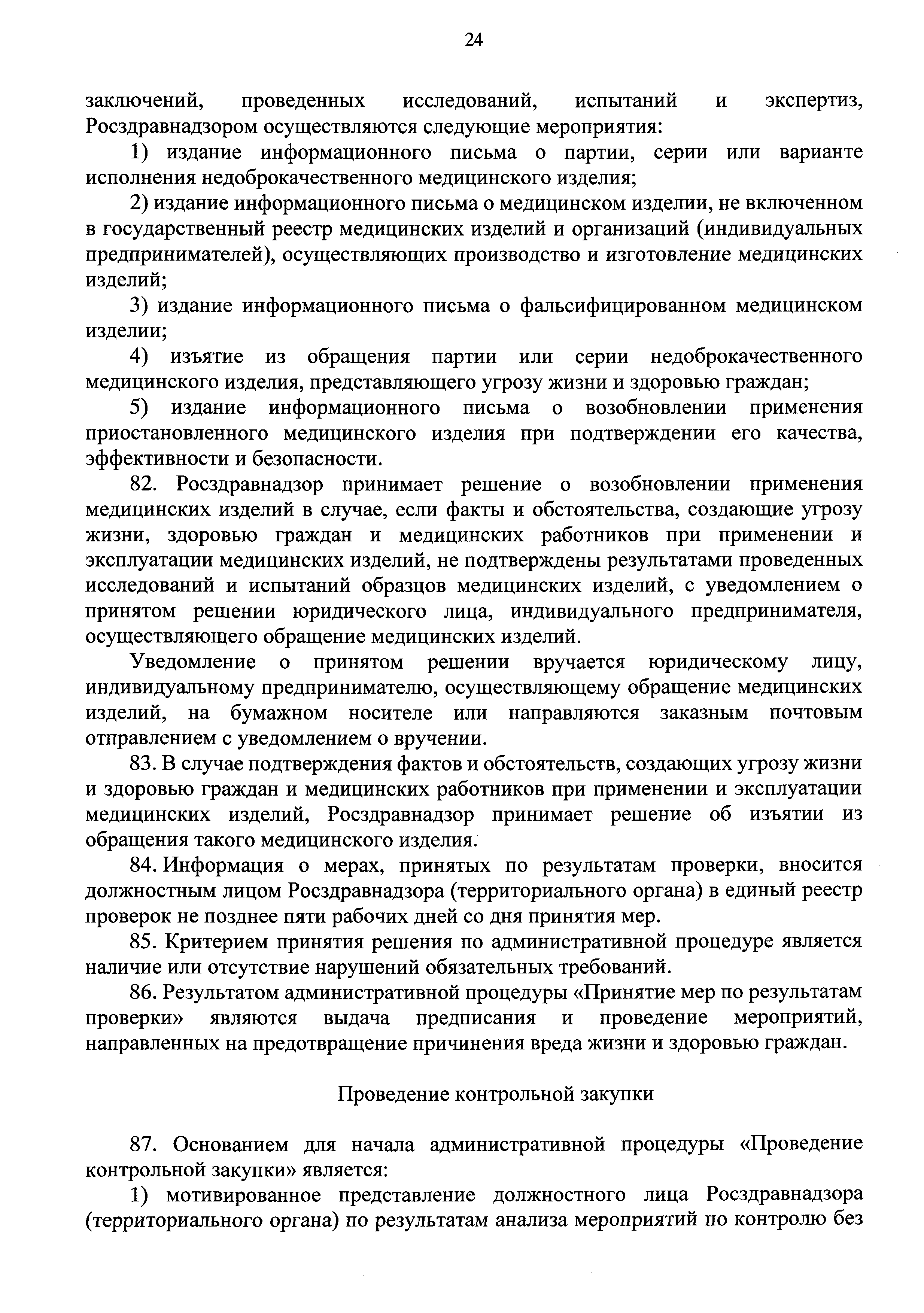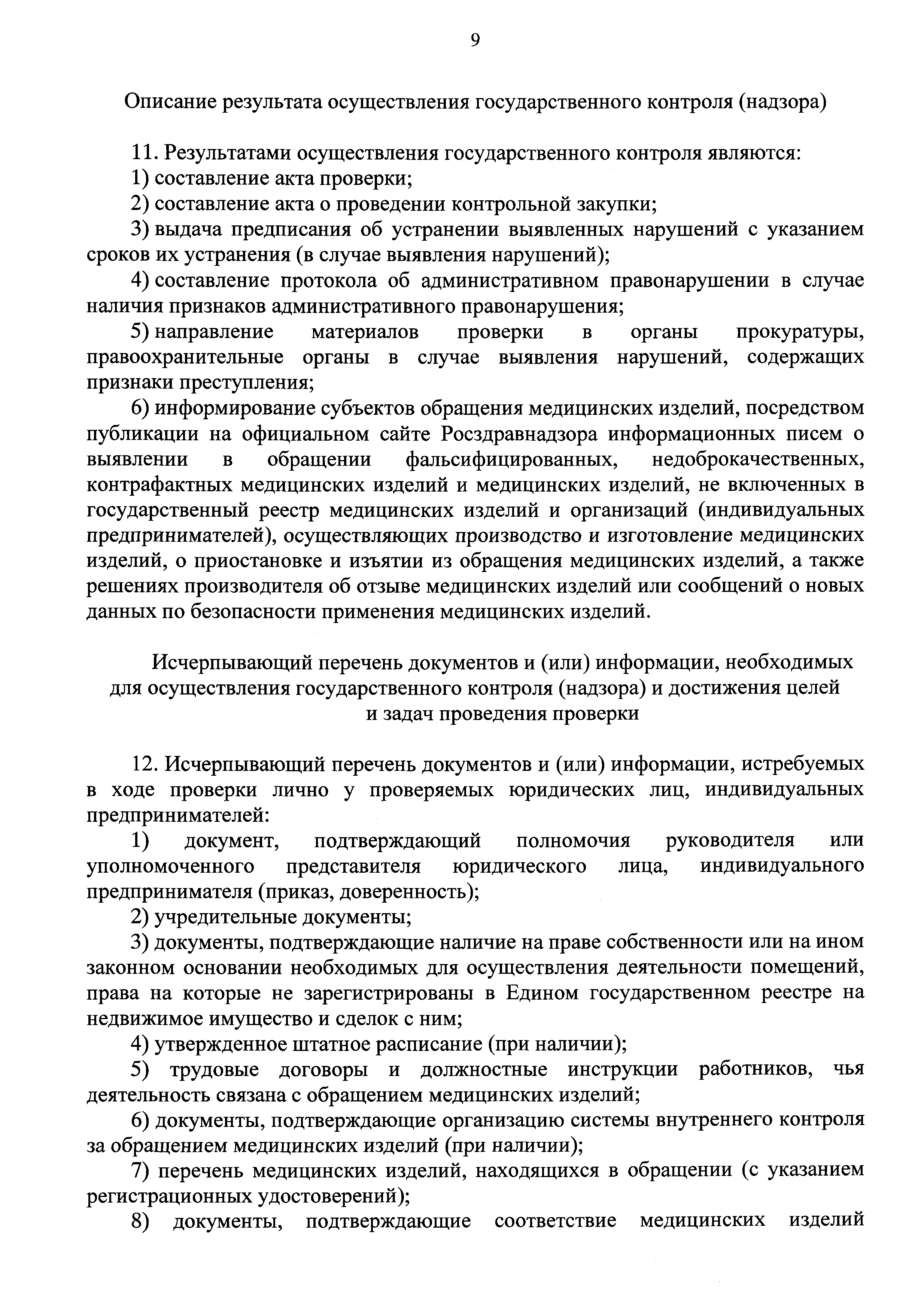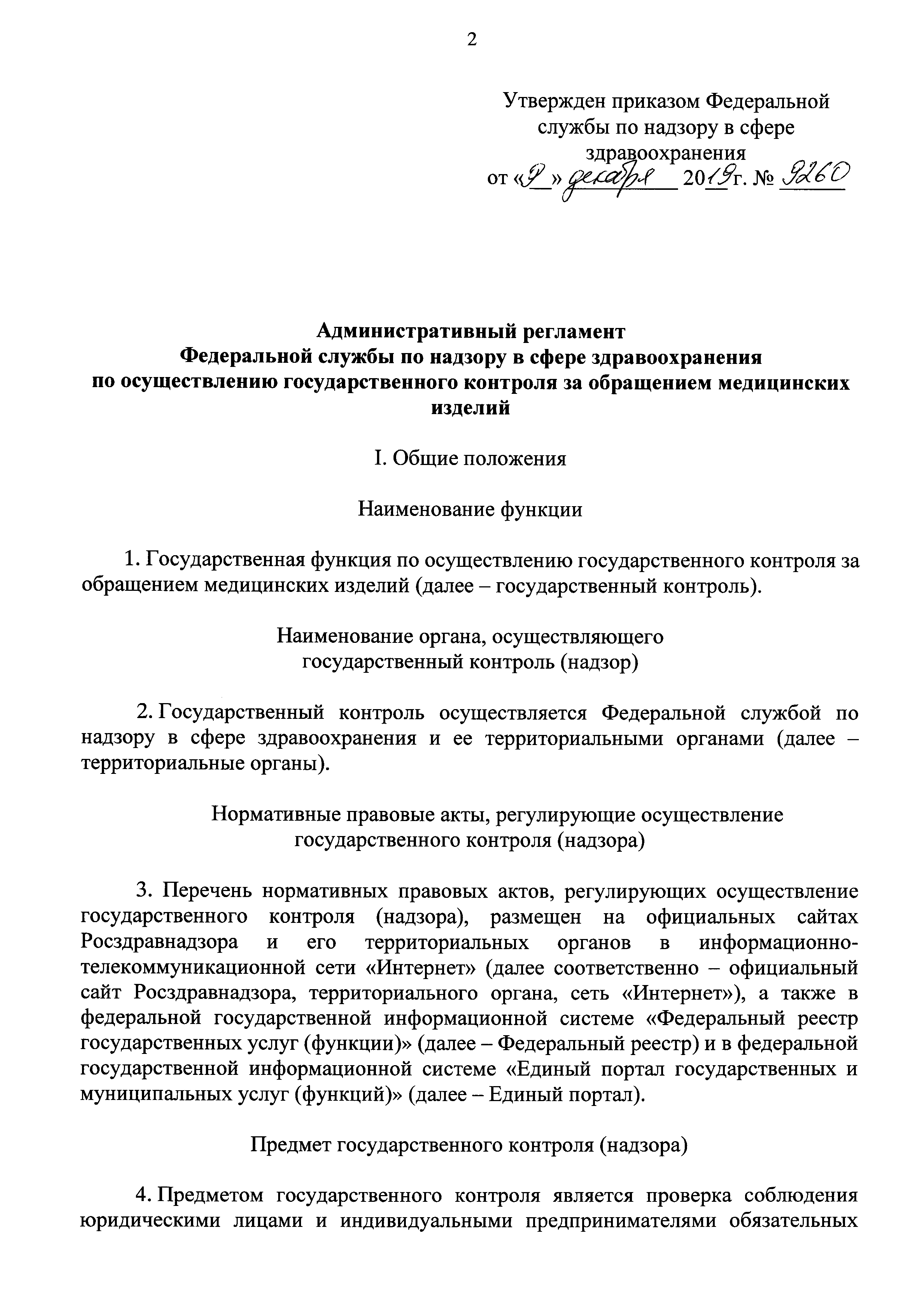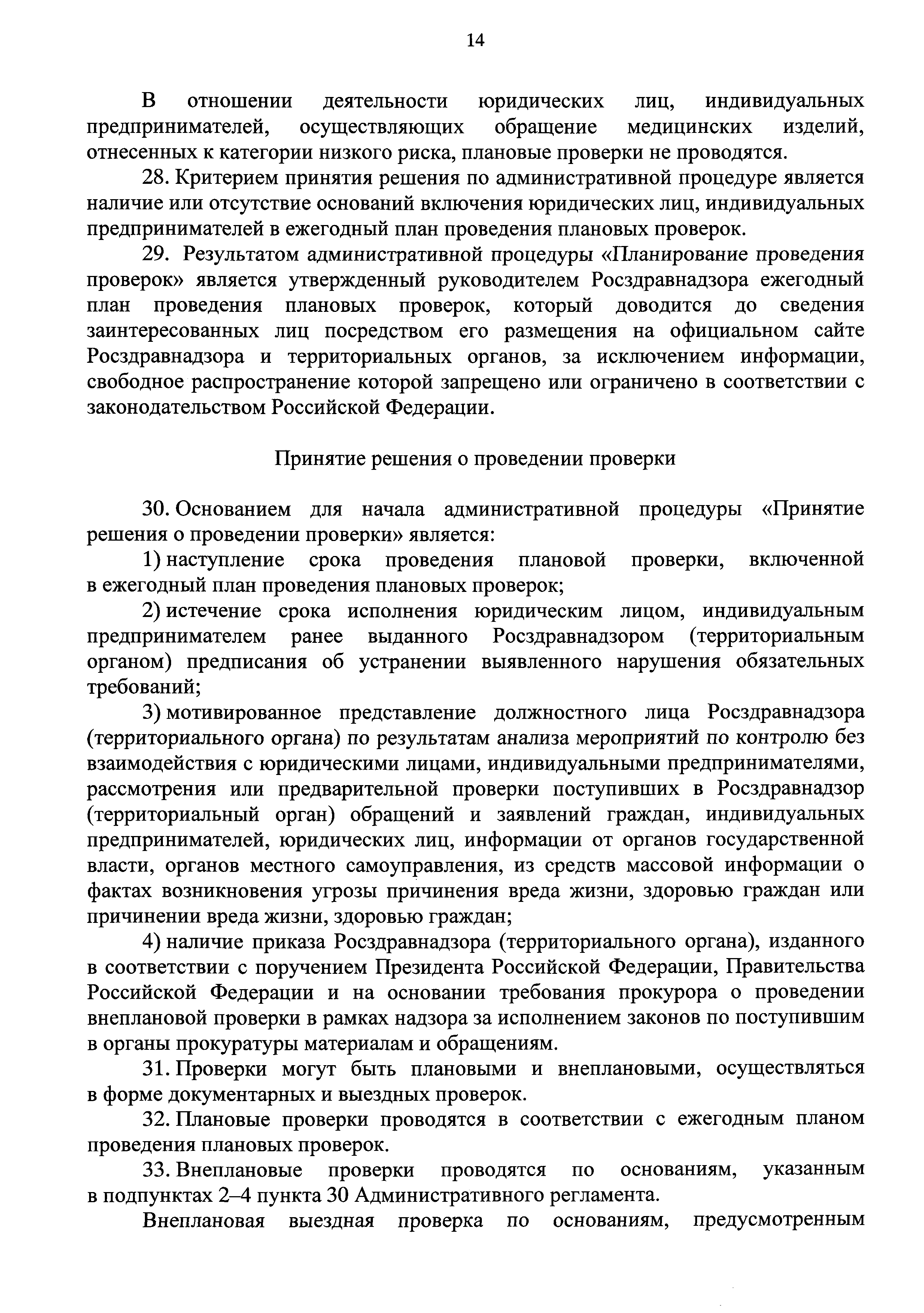 | Оглавление: | I. Общие положения II. Требования к порядку осуществления государственного контроля (надзора) III. Состав, последовательность и сроки выполнения административных процедур, требования к порядку их выполнения, в том числе особенности выполнения административных процедур в электронной форме IV. Порядок и формы контроля за осуществлением государственного контроля (надзора) V. Досудебный (внесудебный) порядок обжалования решений и действий (бездействия) Росздравнадзора (территориального органа), а также его должностных лиц |