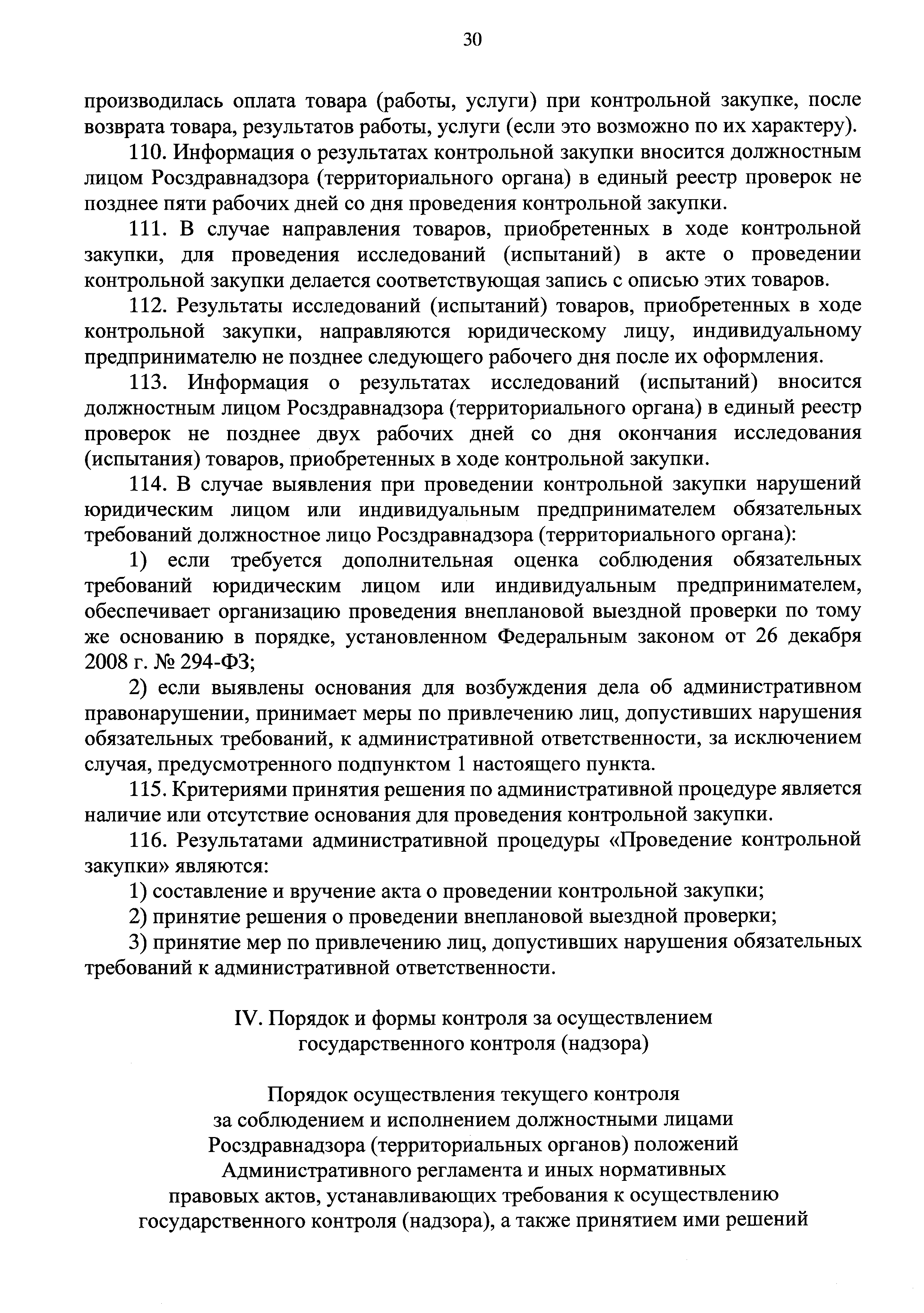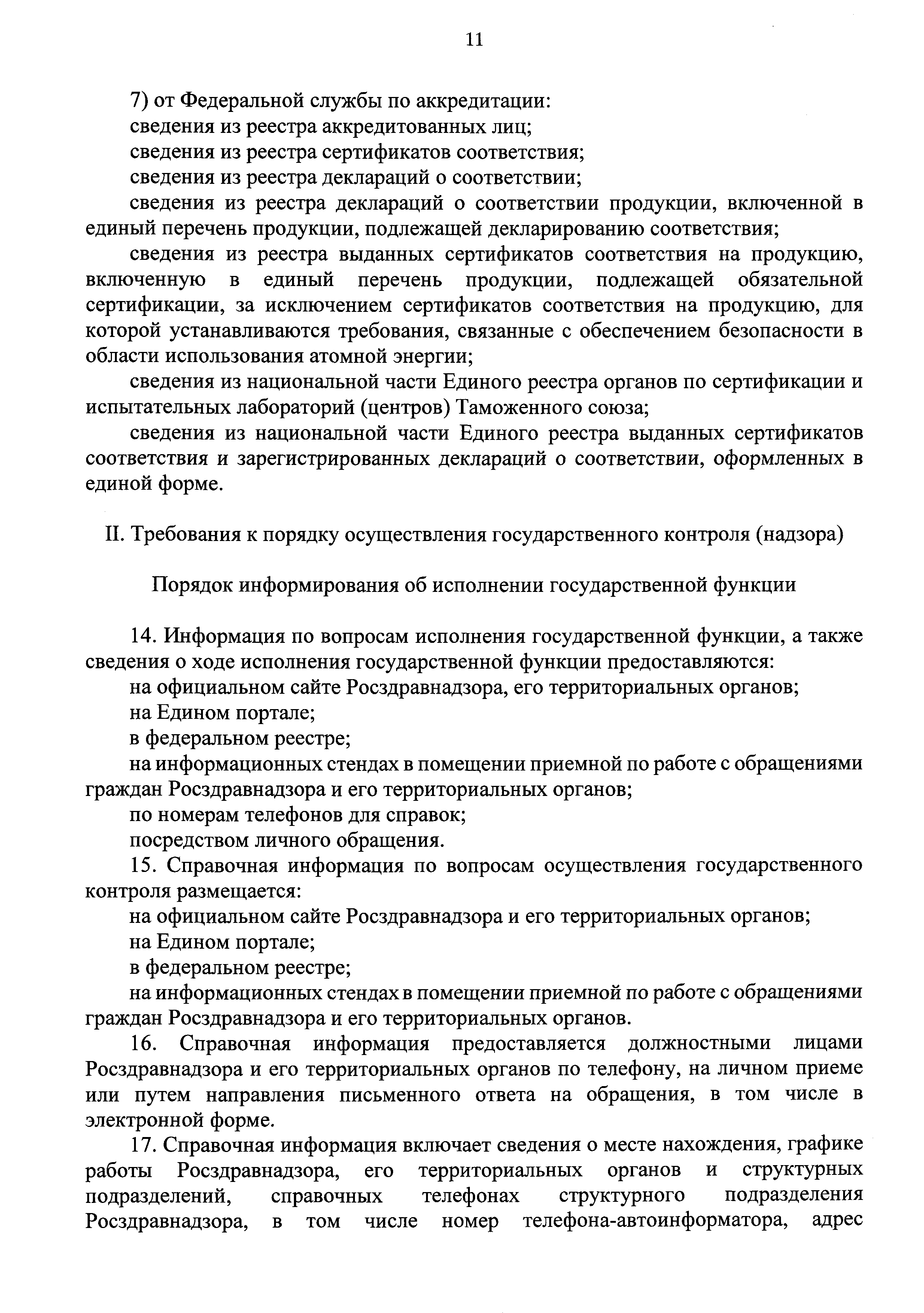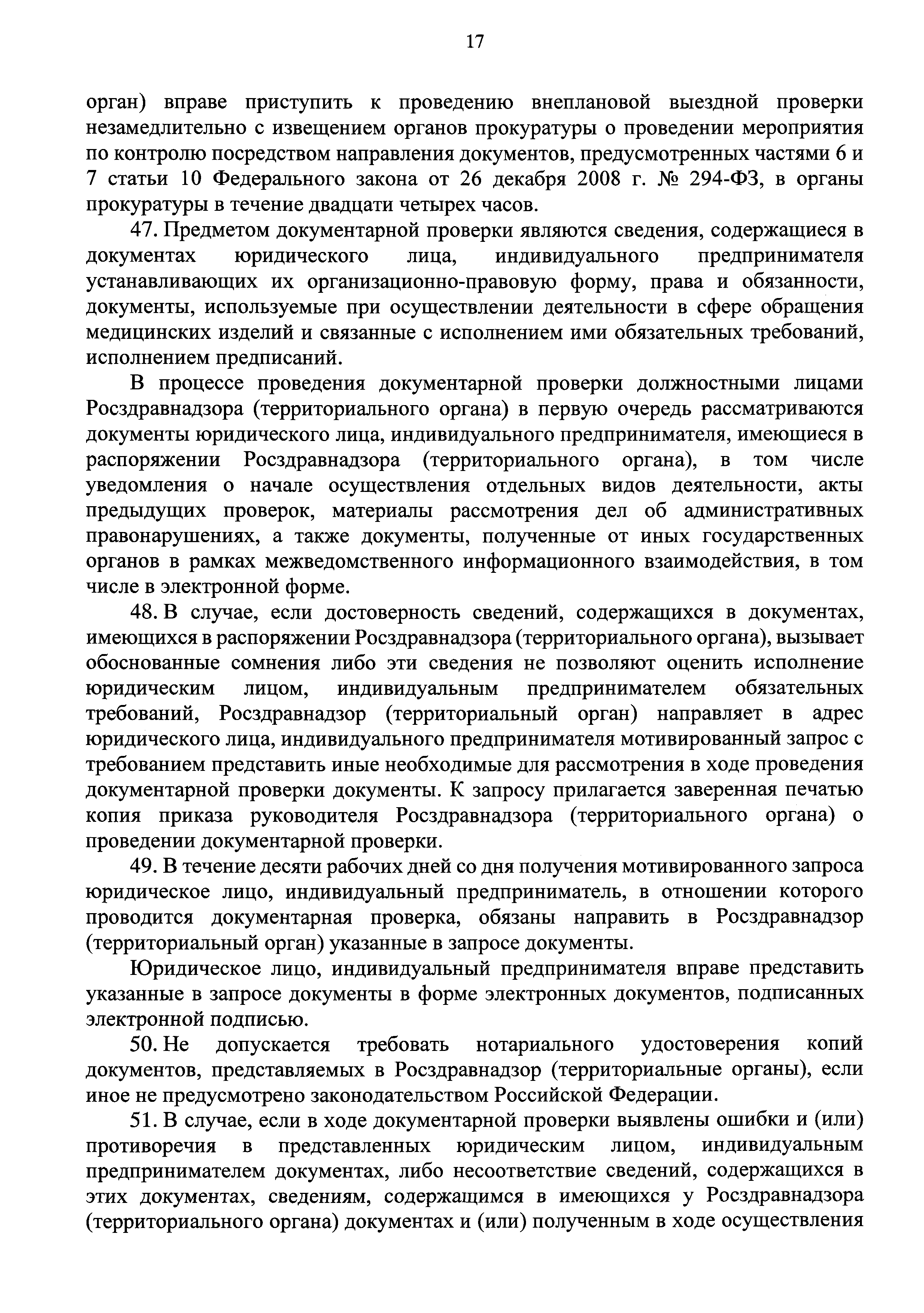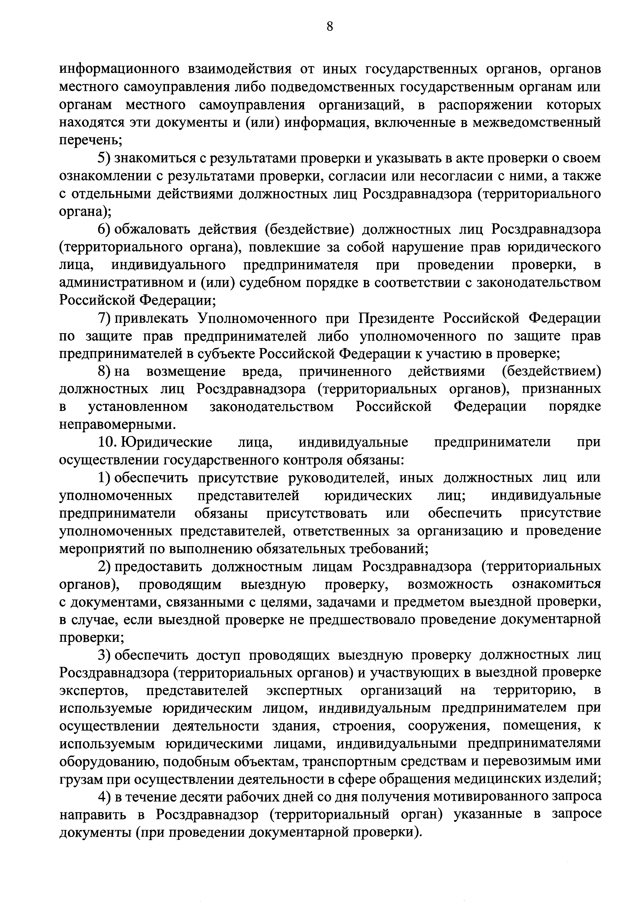 | Оглавление: | I. Общие положения II. Требования к порядку осуществления государственного контроля (надзора) III. Состав, последовательность и сроки выполнения административных процедур, требования к порядку их выполнения, в том числе особенности выполнения административных процедур в электронной форме IV. Порядок и формы контроля за осуществлением государственного контроля (надзора) V. Досудебный (внесудебный) порядок обжалования решений и действий (бездействия) Росздравнадзора (территориального органа), а также его должностных лиц |