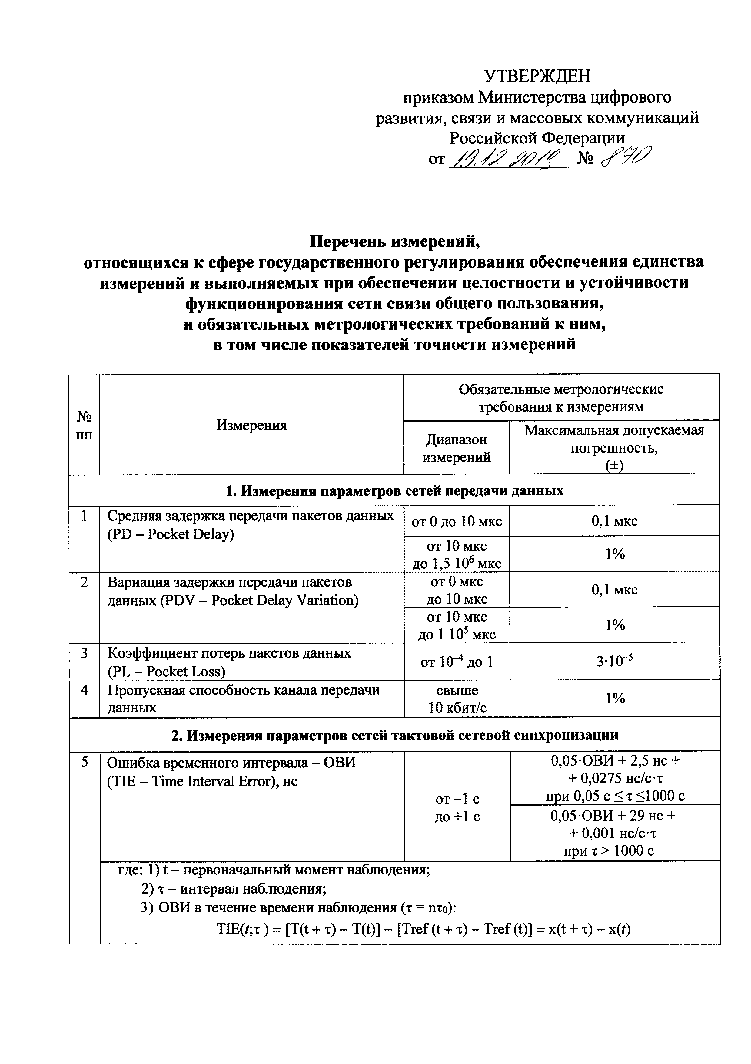 Перечень измерений, относящихся к сфере государственного регулирования обеспечения единства измерений и выполняемых при обеспечении целостности и устойчивости функционирования сети связи общего пользования, и обязательных метрологических требований к ним, в том числе показателей точности измерений| Статус: | принят | | Название рус.: | Перечень измерений, относящихся к сфере государственного регулирования обеспечения единства измерений и выполняемых при обеспечении целостности и устойчивости функционирования сети связи общего пользования, и обязательных метрологических требований к ним, в том числе показателей точности измерений | | Дата добавления в базу: | 01.01.2021 | | Дата актуализации: | 01.01.2021 | | Дата введения: | 07.03.2021 | | Утверждён: | 19.12.2019 Министерство цифрового развития, связи и массовых коммуникаций РФ (870)