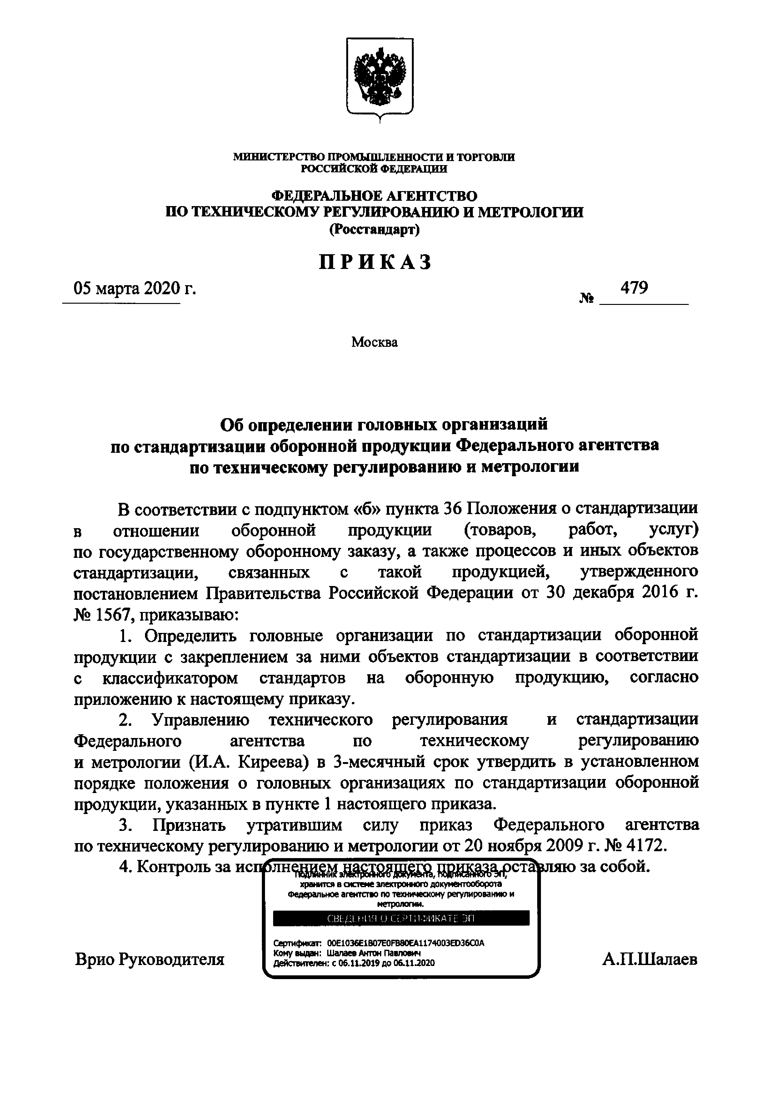 Перечень головных организаций по стандартизации оборонной продукции с закреплением за ними объектов стандартизации в соответствии с классификатором стандартов на оборонную продукцию| Статус: | действует | | Название рус.: | Перечень головных организаций по стандартизации оборонной продукции с закреплением за ними объектов стандартизации в соответствии с классификатором стандартов на оборонную продукцию | | Дата добавления в базу: | 01.01.2021 | | Дата актуализации: | 01.01.2021 | | Дата введения: | 05.03.2020 | | Утверждён: | 05.03.2020 Федеральное агентство по техническому регулированию и метрологии (479)