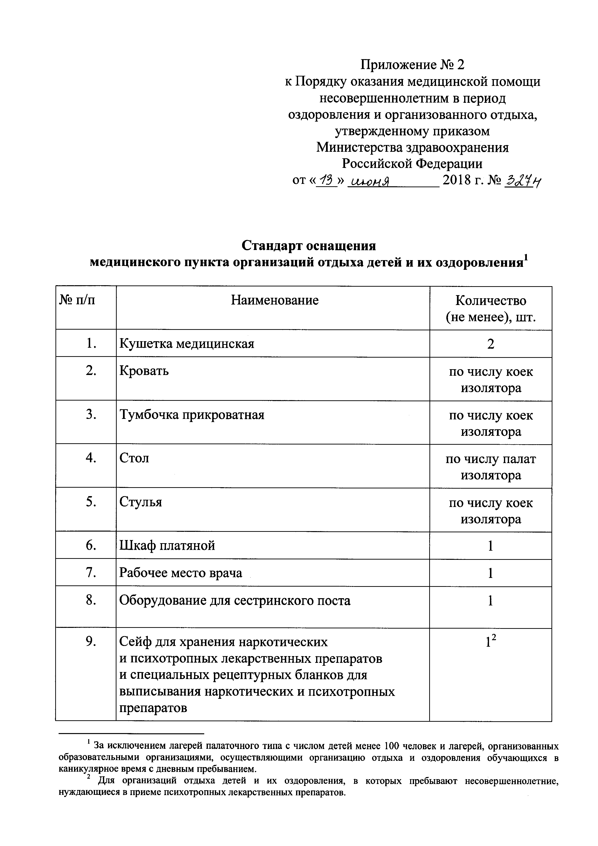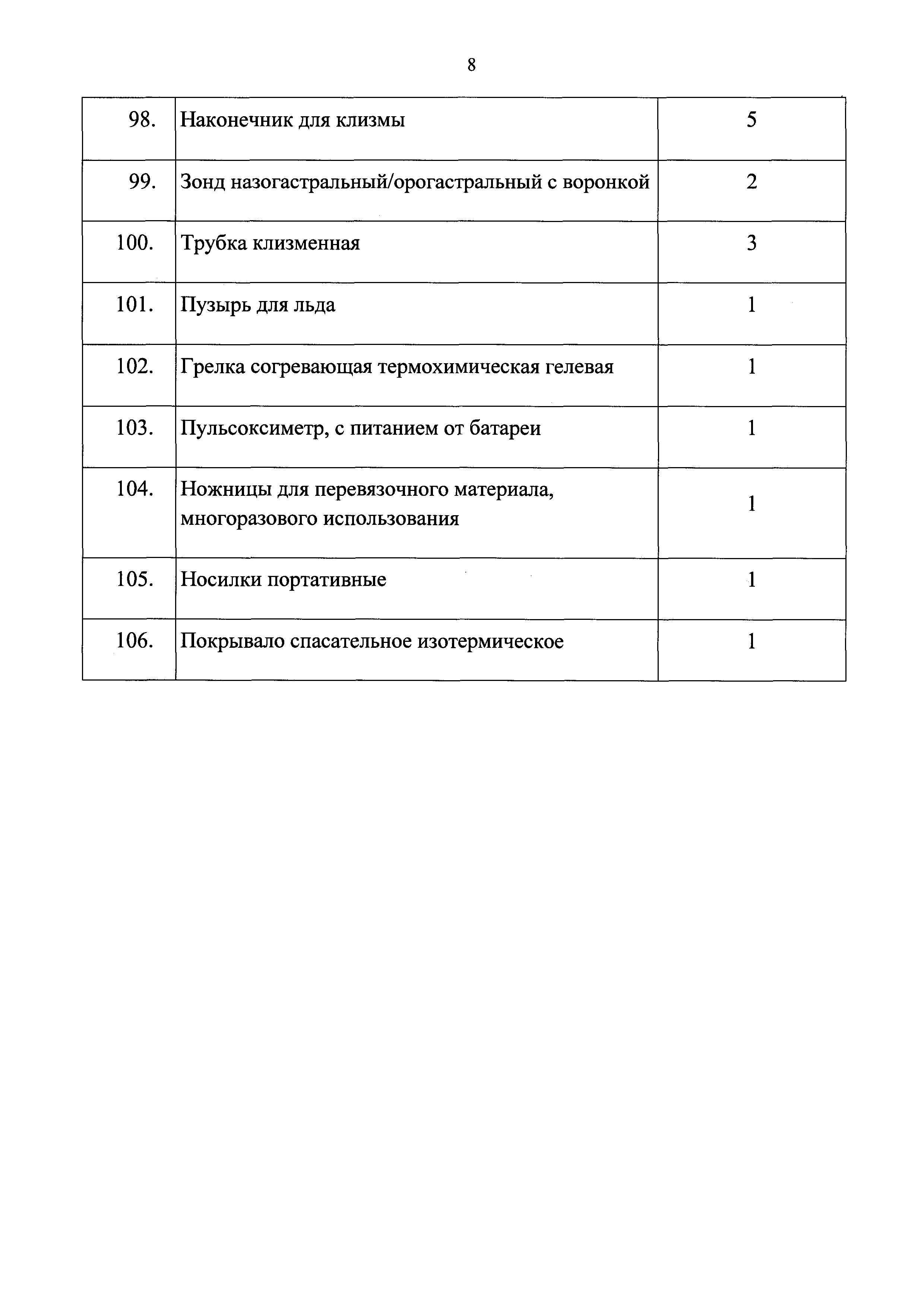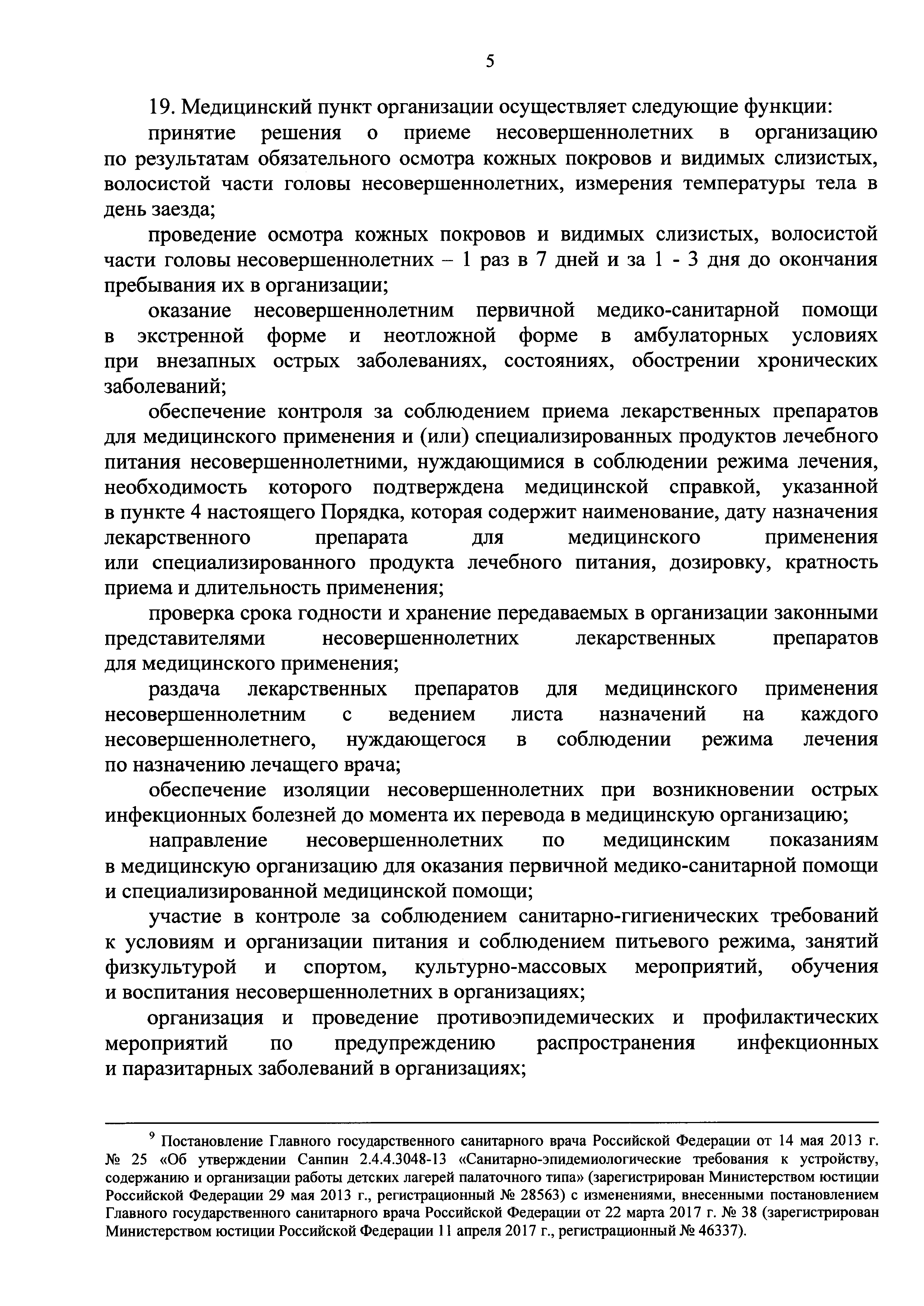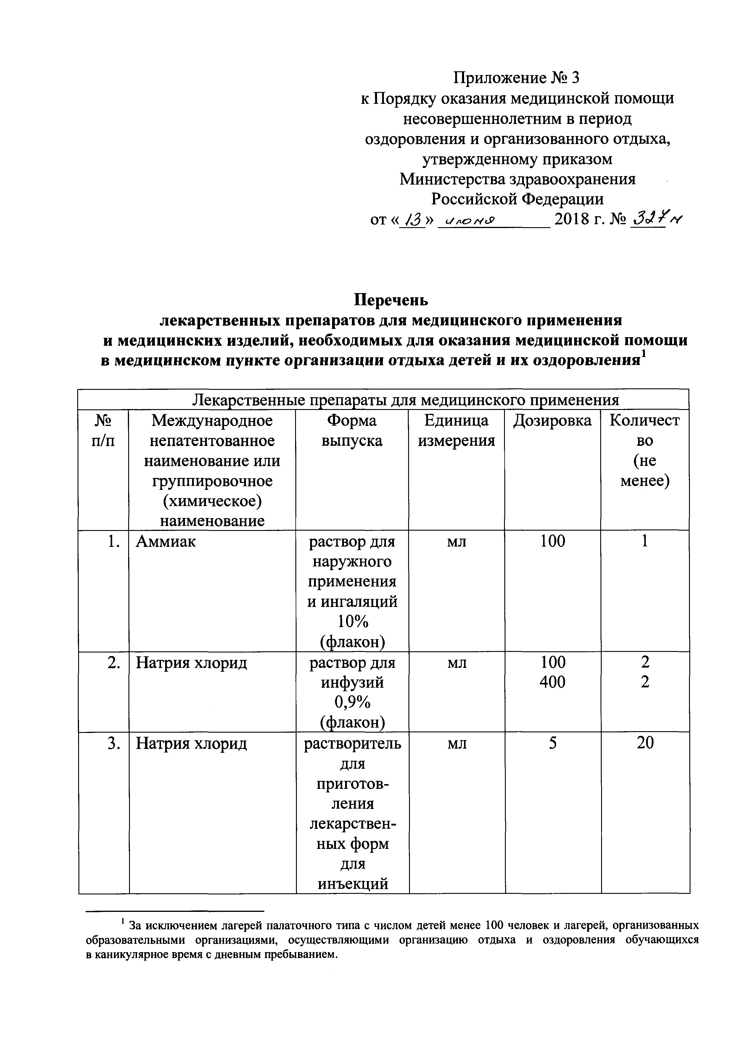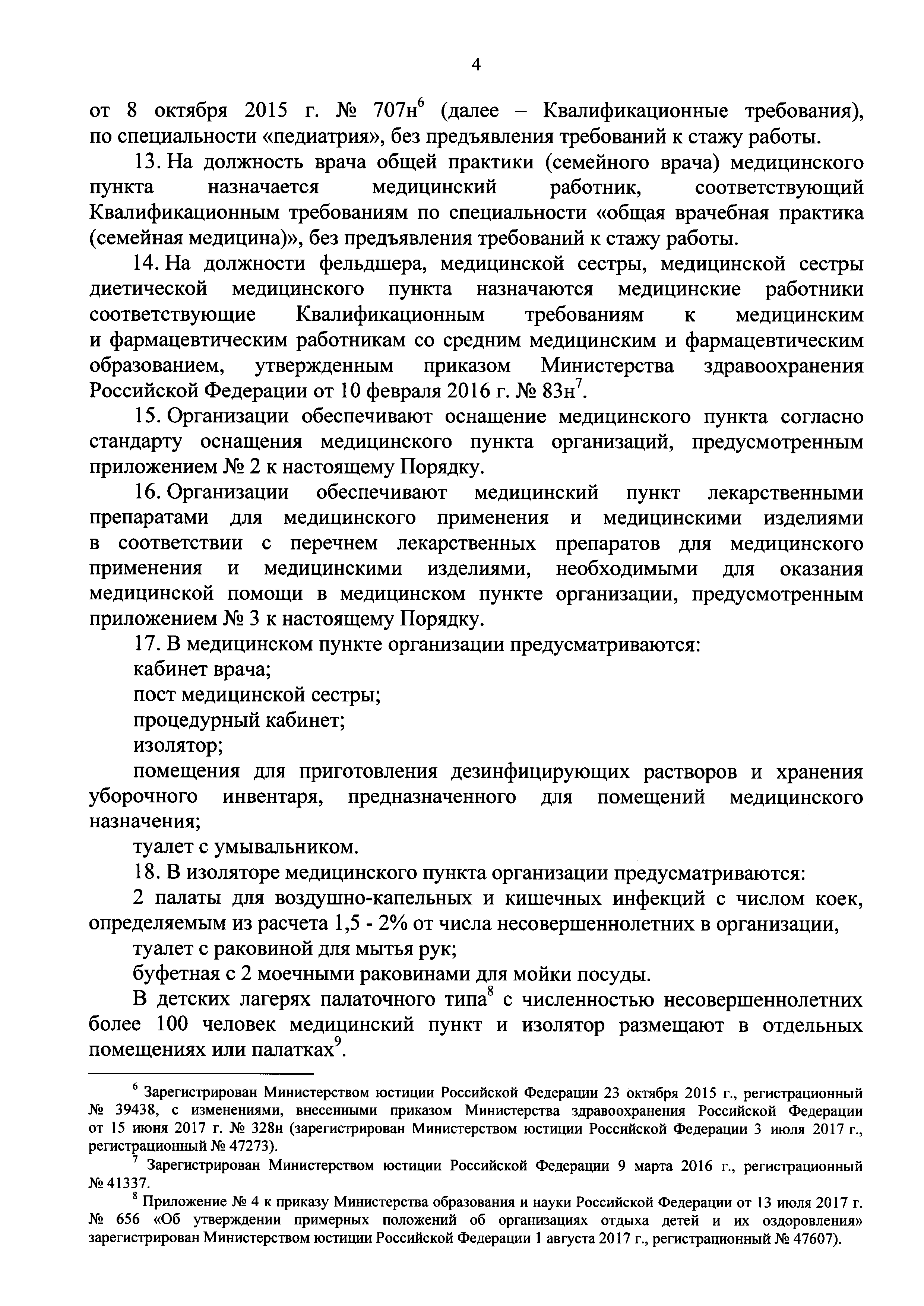 | Оглавление: | Приложение № 1. Рекомендуемые штатные нормативы медицинского пункта организаций отдыха детей и их оздоровления Приложение № 2. Стандарт оснащения медицинского пункта организаций отдыха детей и их оздоровления Приложение № 3. Перечень лекарственных препаратов для медицинского применения и медицинских изделий, необходимых для оказания медицинской помощи в медицинском пункте организации отдыха детей и их оздоровления Приложение № 4. Требования к комплектации медицинскими изделиями укладки для оказания первой помощи в детских лагерях палаточного типа с численностью несовершеннолетних менее 100 человек |