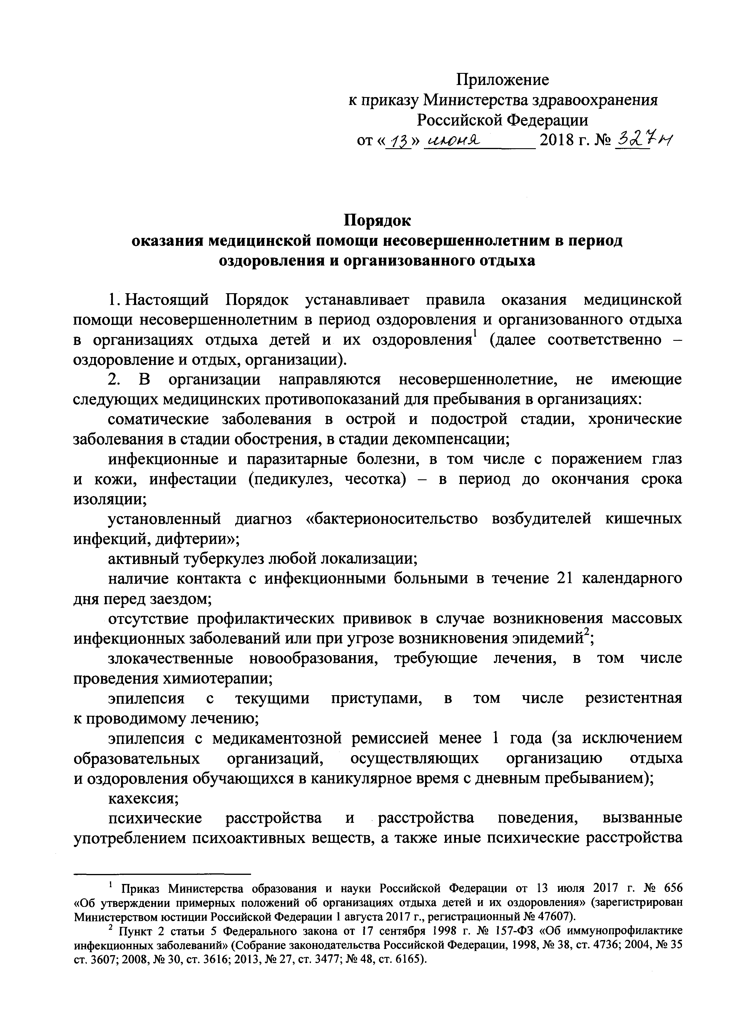 | Область применения: | Порядок устанавливает правила оказания медицинской помощи несовершеннолетним в период оздоровления и организованного отдыха в организациях отдыха детей и их оздоровления |