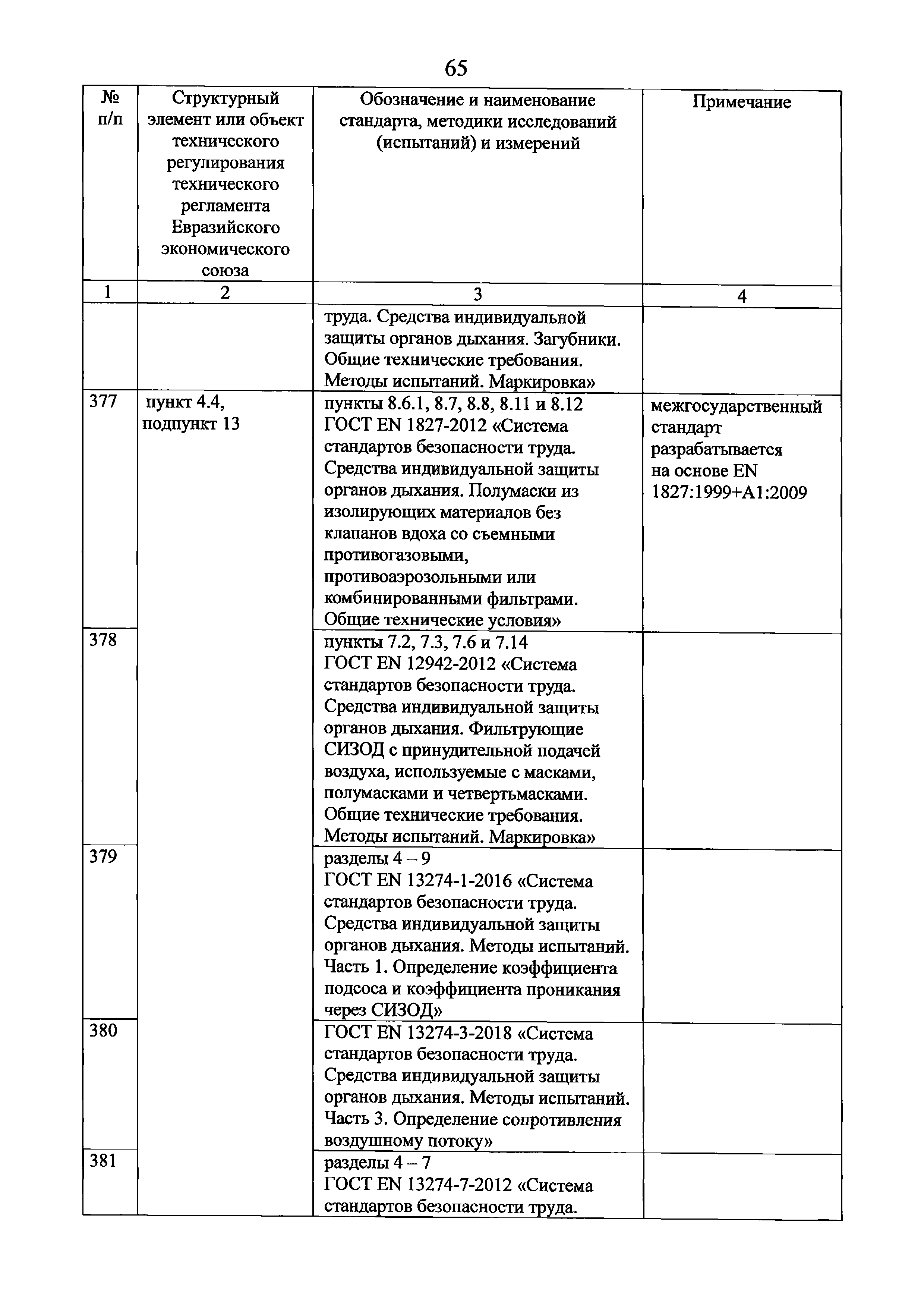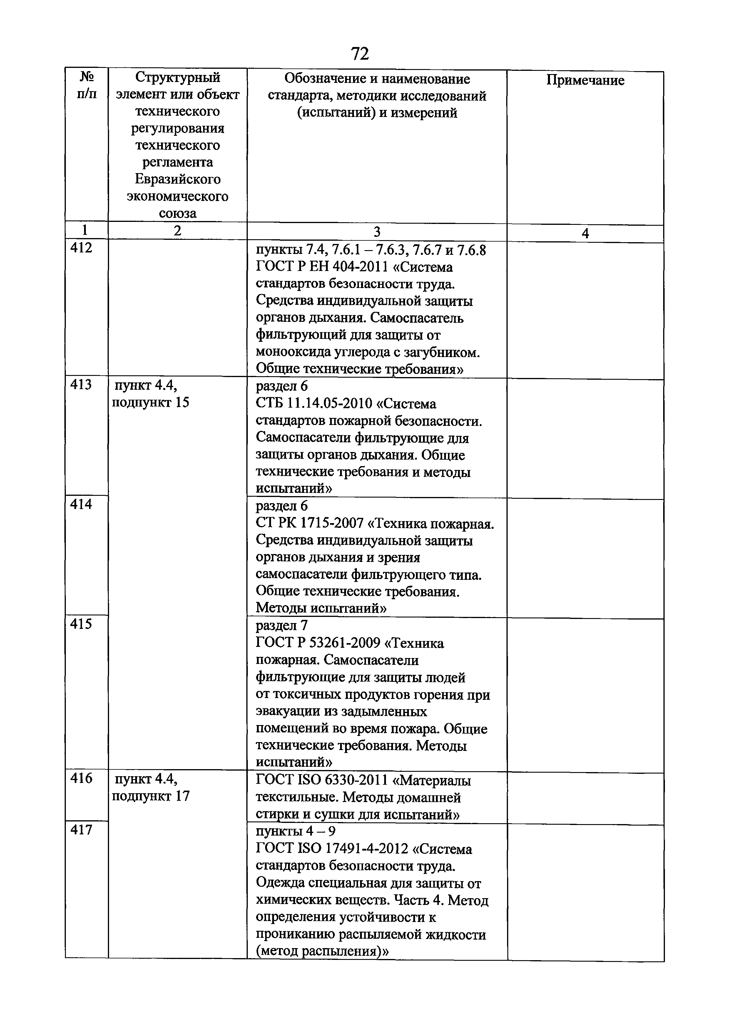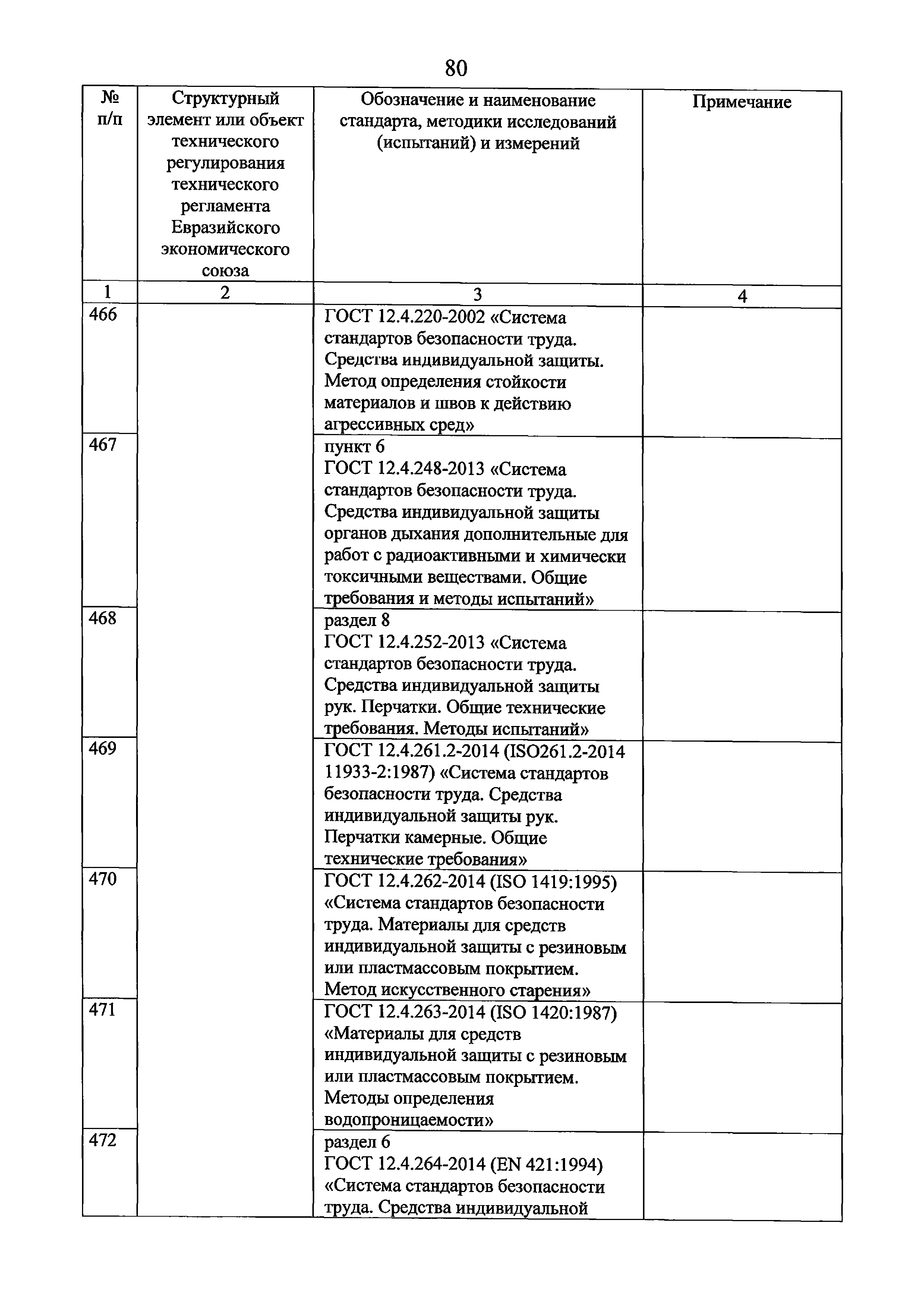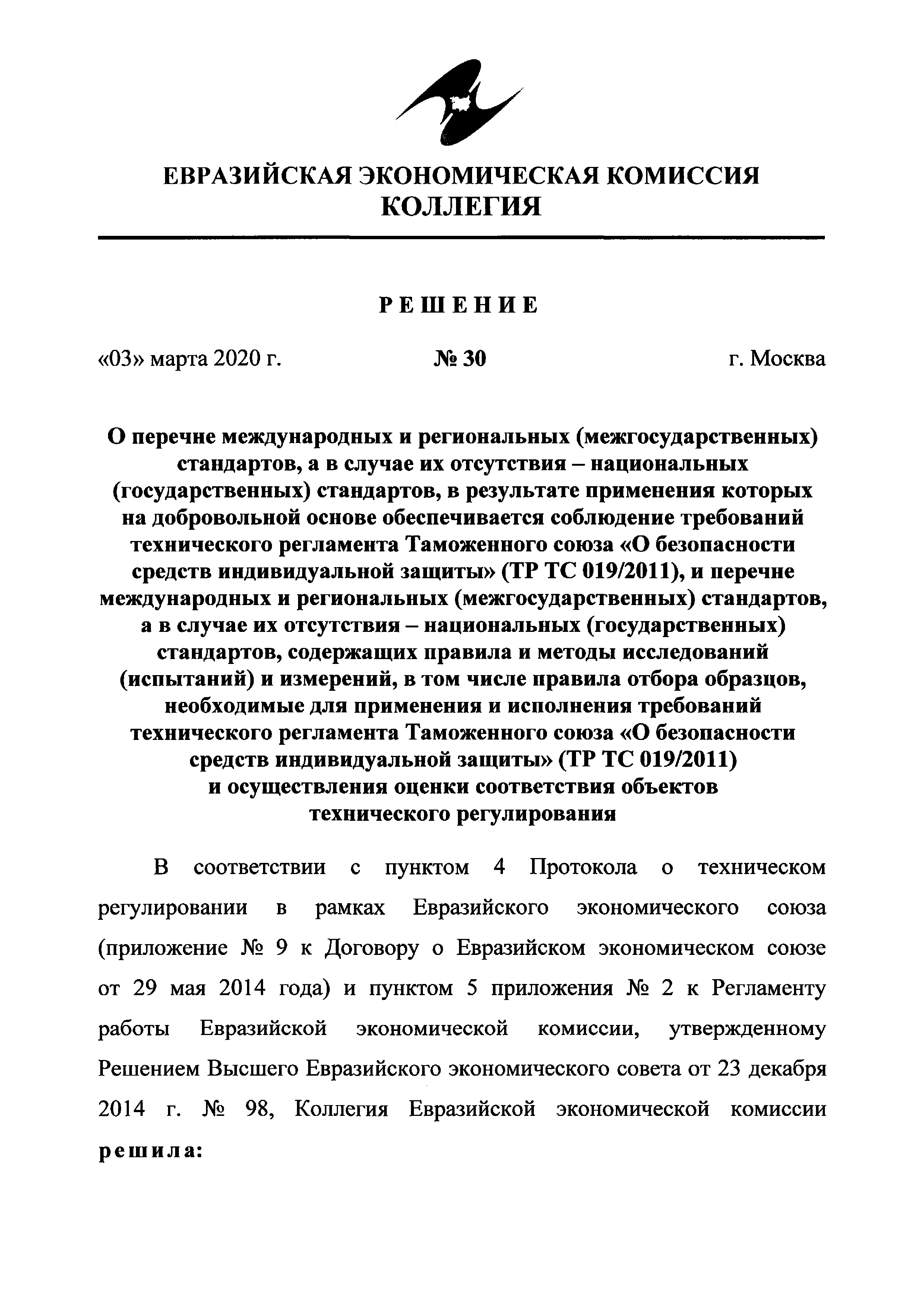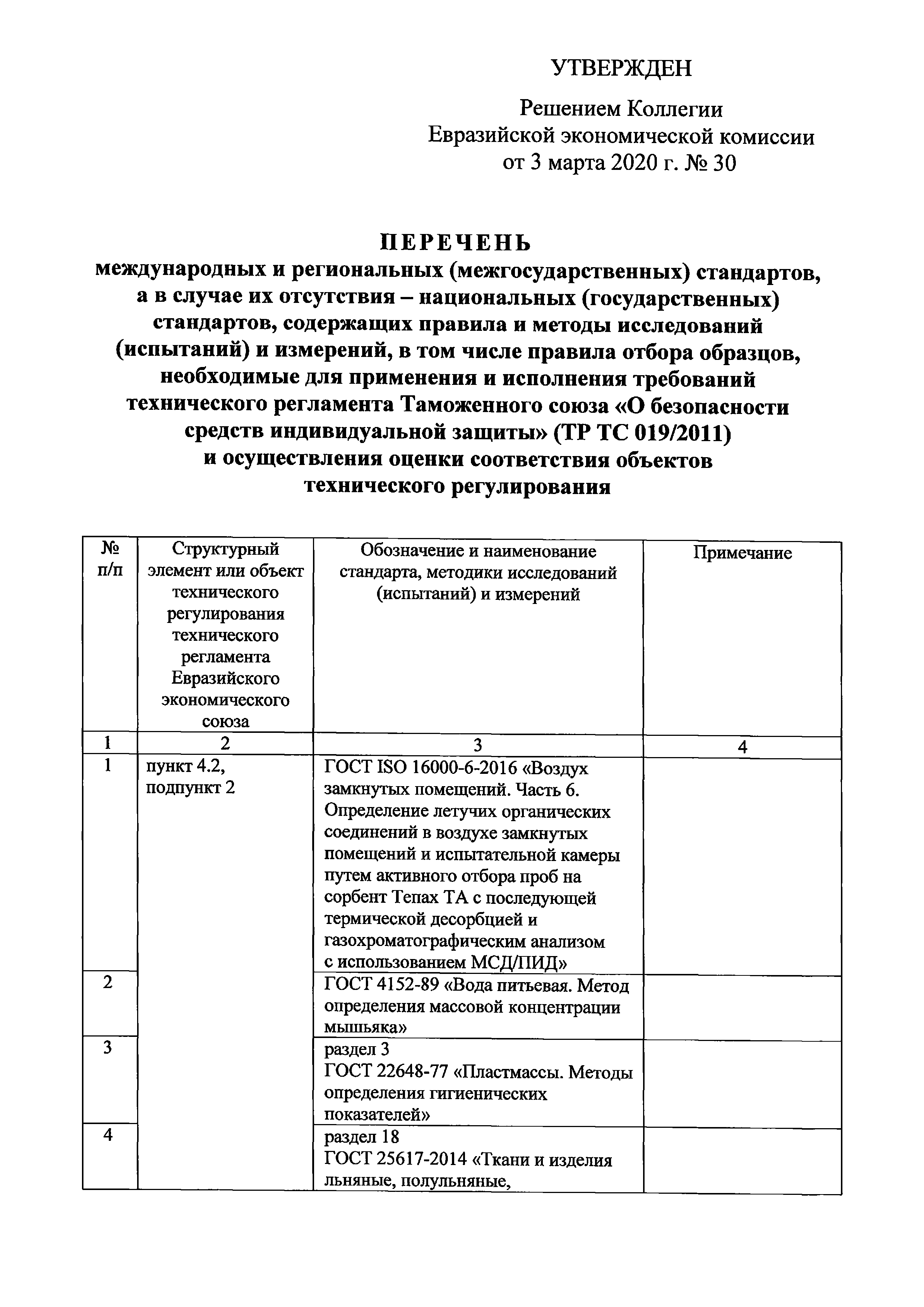 Перечень международных и региональных (межгосударственных) стандартов, а в случае их отсутствия - национальных (государственных) стандартов, содержащих правила и методы исследований (испытаний) и измерений, в том числе правила отбора образцов, необходимые для применения и исполнения требований технического регламента Таможенного союза "О безопасности средств индивидуальной защиты" (ТР ТС 019/2011) и осуществления оценки соответствия объектов технического регулирования. Редакция 3| Статус: | действует | | Название рус.: | Перечень международных и региональных (межгосударственных) стандартов, а в случае их отсутствия - национальных (государственных) стандартов, содержащих правила и методы исследований (испытаний) и измерений, в том числе правила отбора образцов, необходимые для применения и исполнения требований технического регламента Таможенного союза "О безопасности средств индивидуальной защиты" (ТР ТС 019/2011) и осуществления оценки соответствия объектов технического регулирования. Редакция 3 | | Дата добавления в базу: | 01.01.2021 | | Дата актуализации: | 01.01.2021 | | Дата введения: | 04.04.2020 | | Утверждён: | 03.03.2020 Коллегия Евразийской экономической комиссии (30)