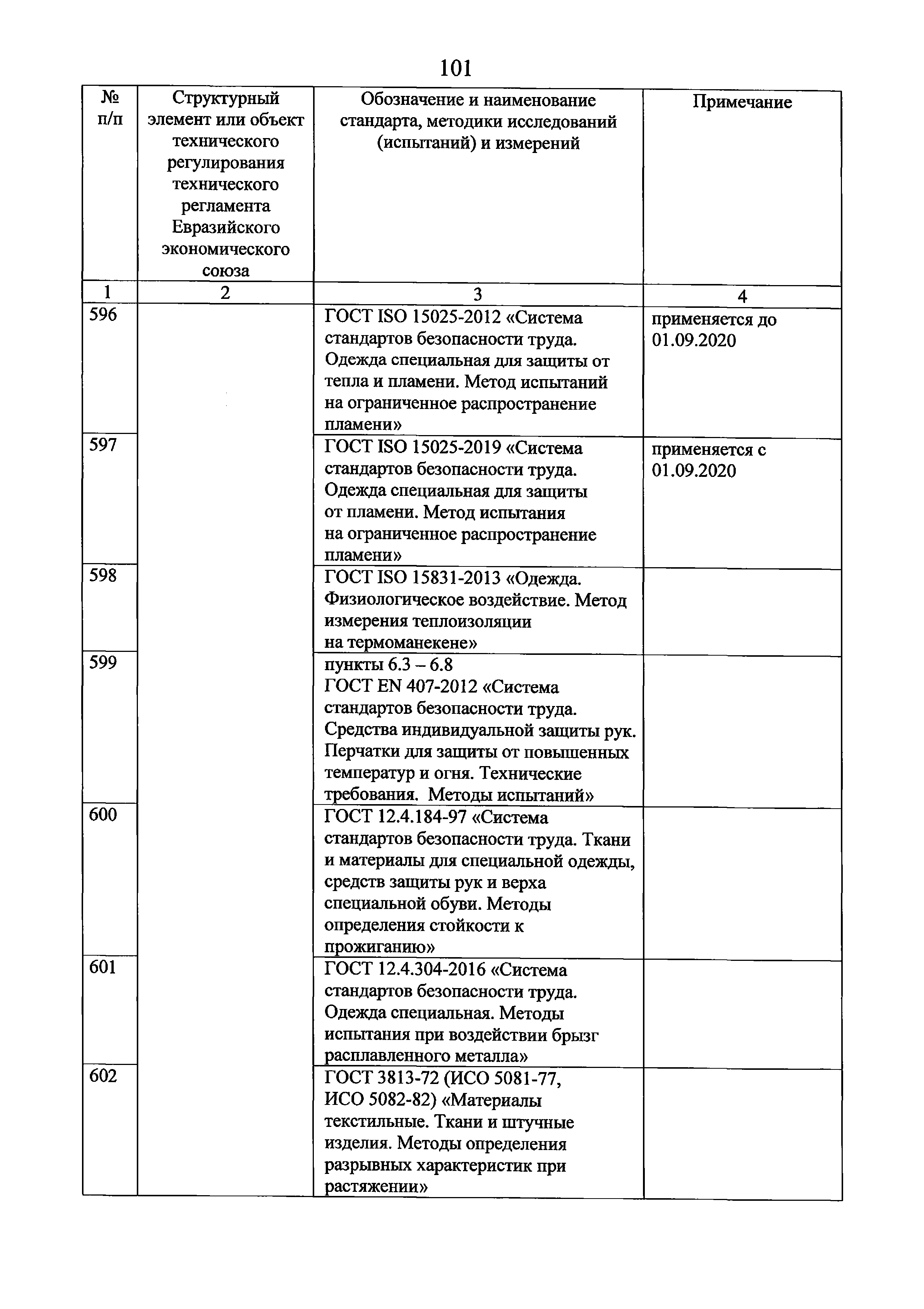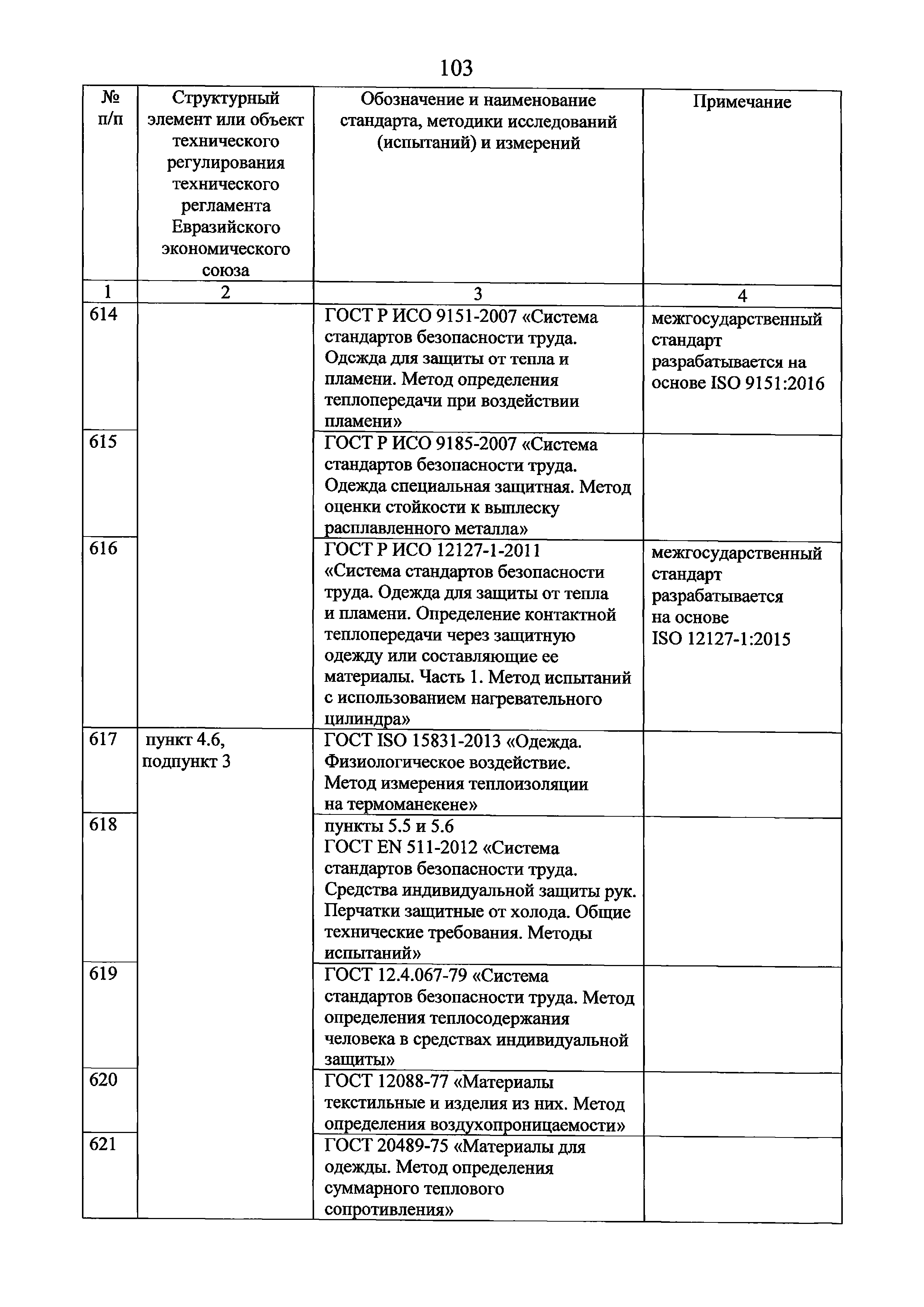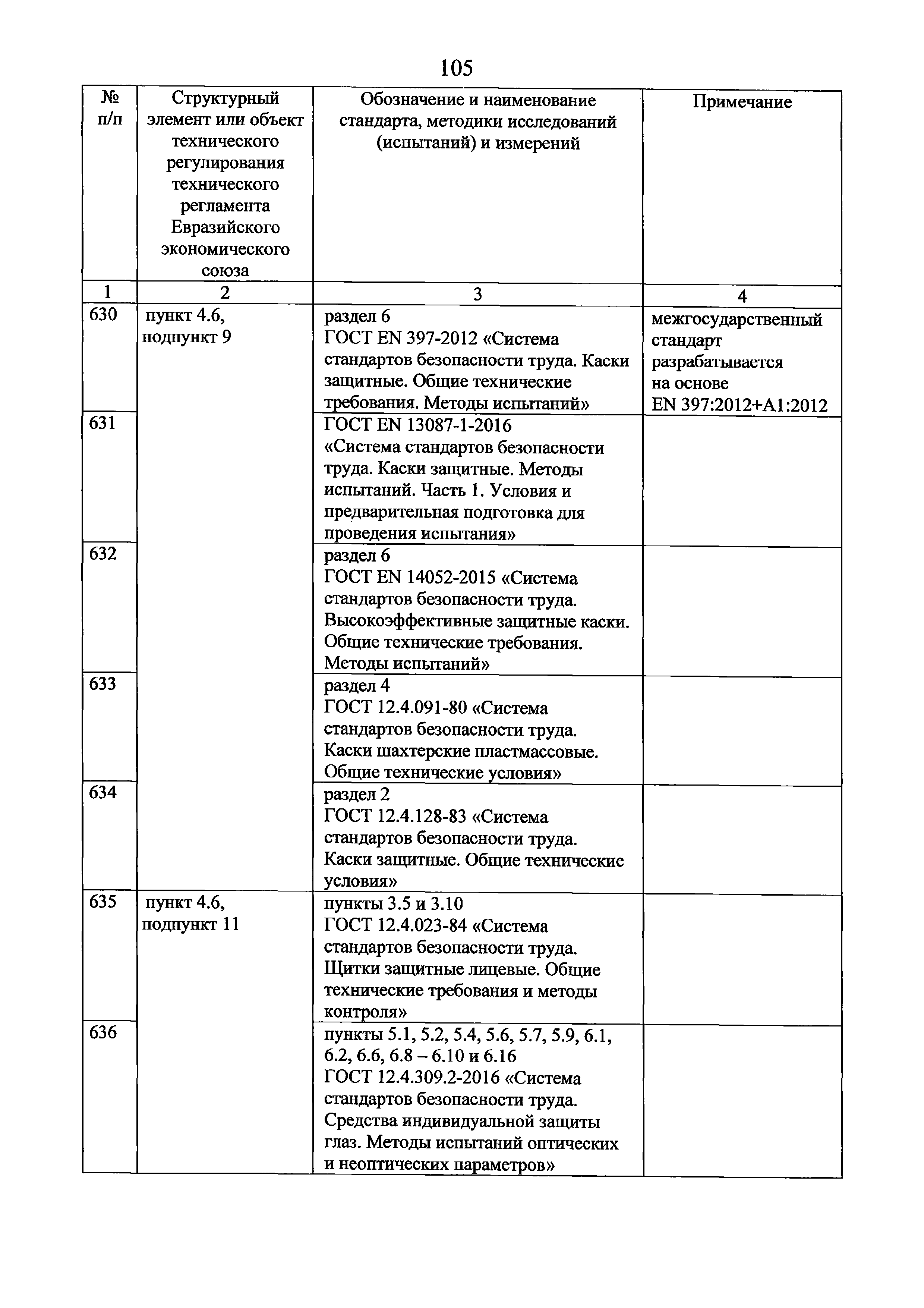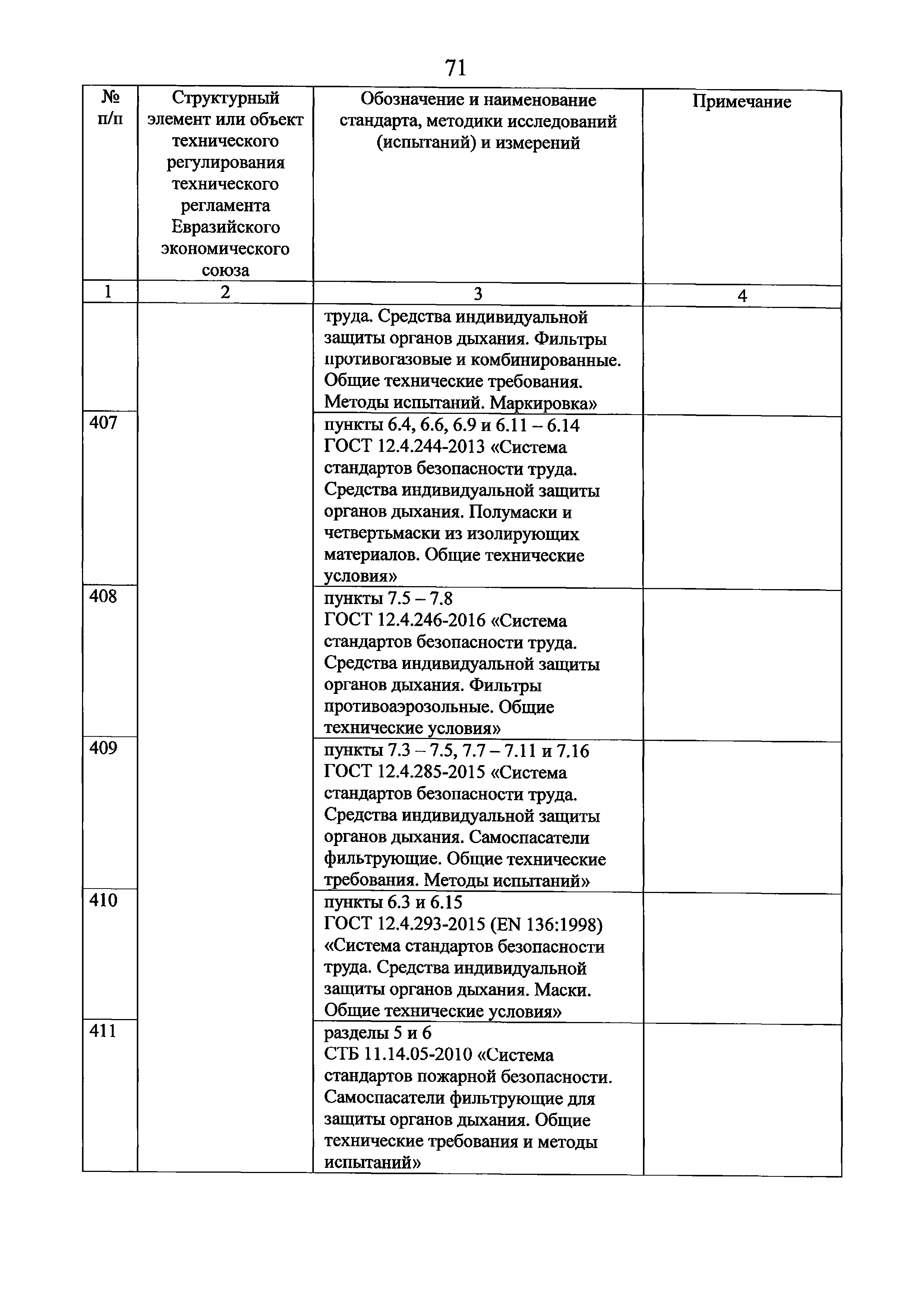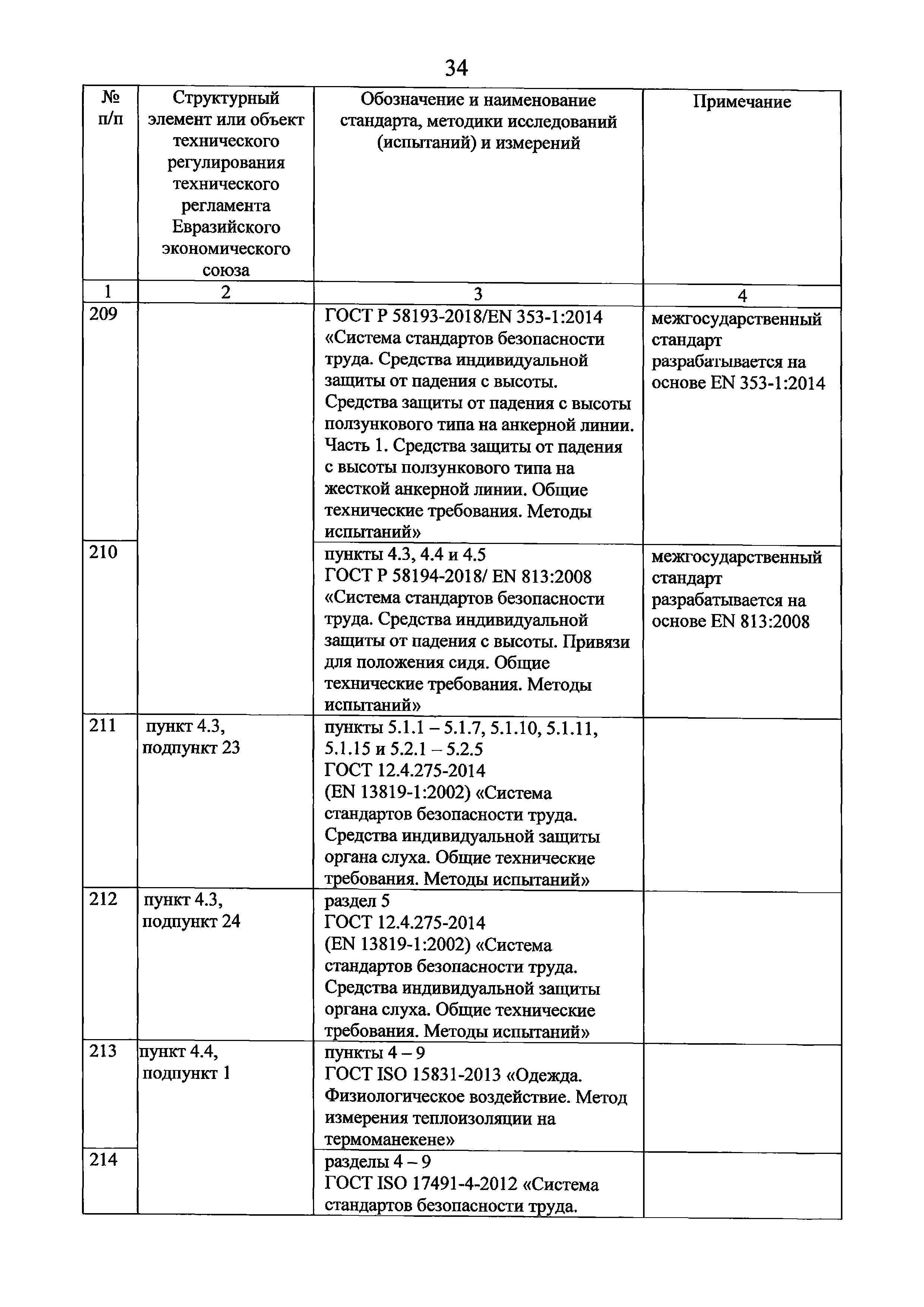 Перечень международных и региональных (межгосударственных) стандартов, а в случае их отсутствия - национальных (государственных) стандартов, содержащих правила и методы исследований (испытаний) и измерений, в том числе правила отбора образцов, необходимые для применения и исполнения требований технического регламента Таможенного союза "О безопасности средств индивидуальной защиты" (ТР ТС 019/2011) и осуществления оценки соответствия объектов технического регулирования. Редакция 3| Статус: | действует | | Название рус.: | Перечень международных и региональных (межгосударственных) стандартов, а в случае их отсутствия - национальных (государственных) стандартов, содержащих правила и методы исследований (испытаний) и измерений, в том числе правила отбора образцов, необходимые для применения и исполнения требований технического регламента Таможенного союза "О безопасности средств индивидуальной защиты" (ТР ТС 019/2011) и осуществления оценки соответствия объектов технического регулирования. Редакция 3 | | Дата добавления в базу: | 01.01.2021 | | Дата актуализации: | 01.01.2021 | | Дата введения: | 04.04.2020 | | Утверждён: | 03.03.2020 Коллегия Евразийской экономической комиссии (30)