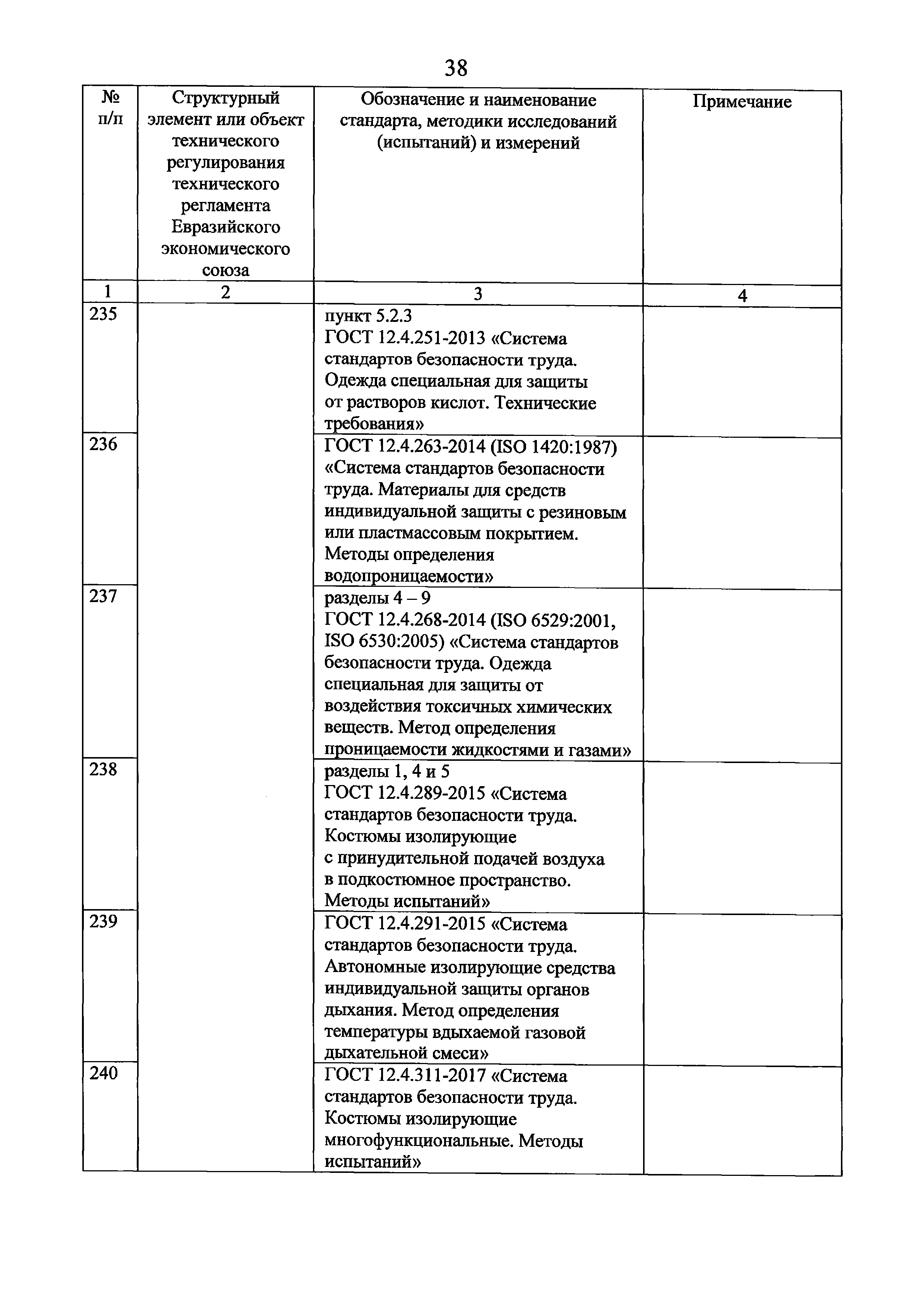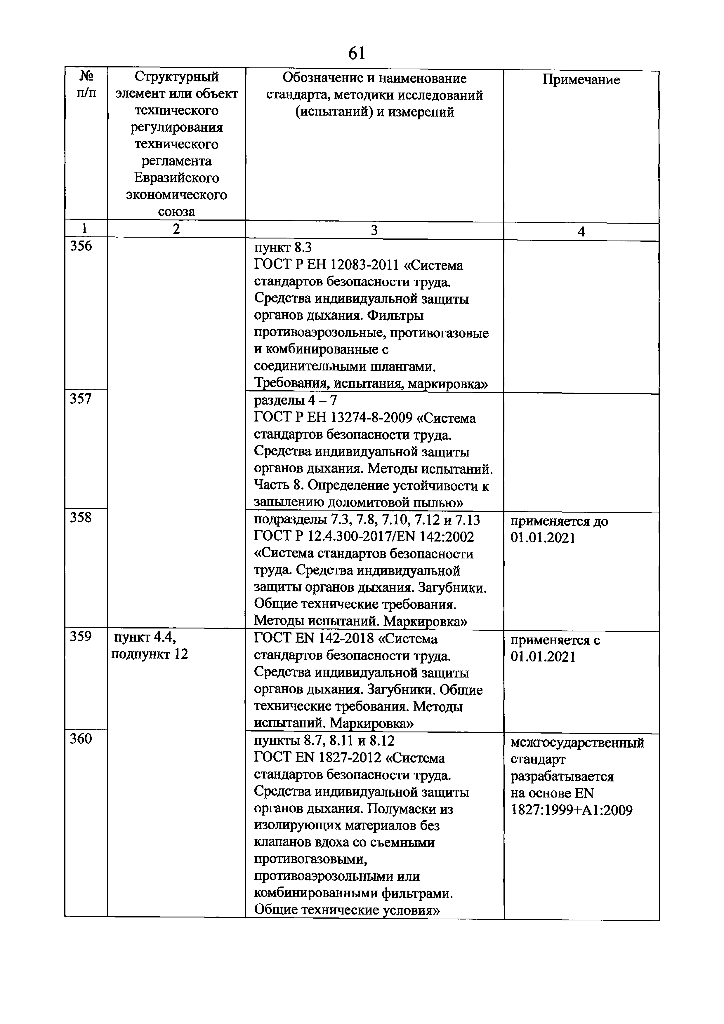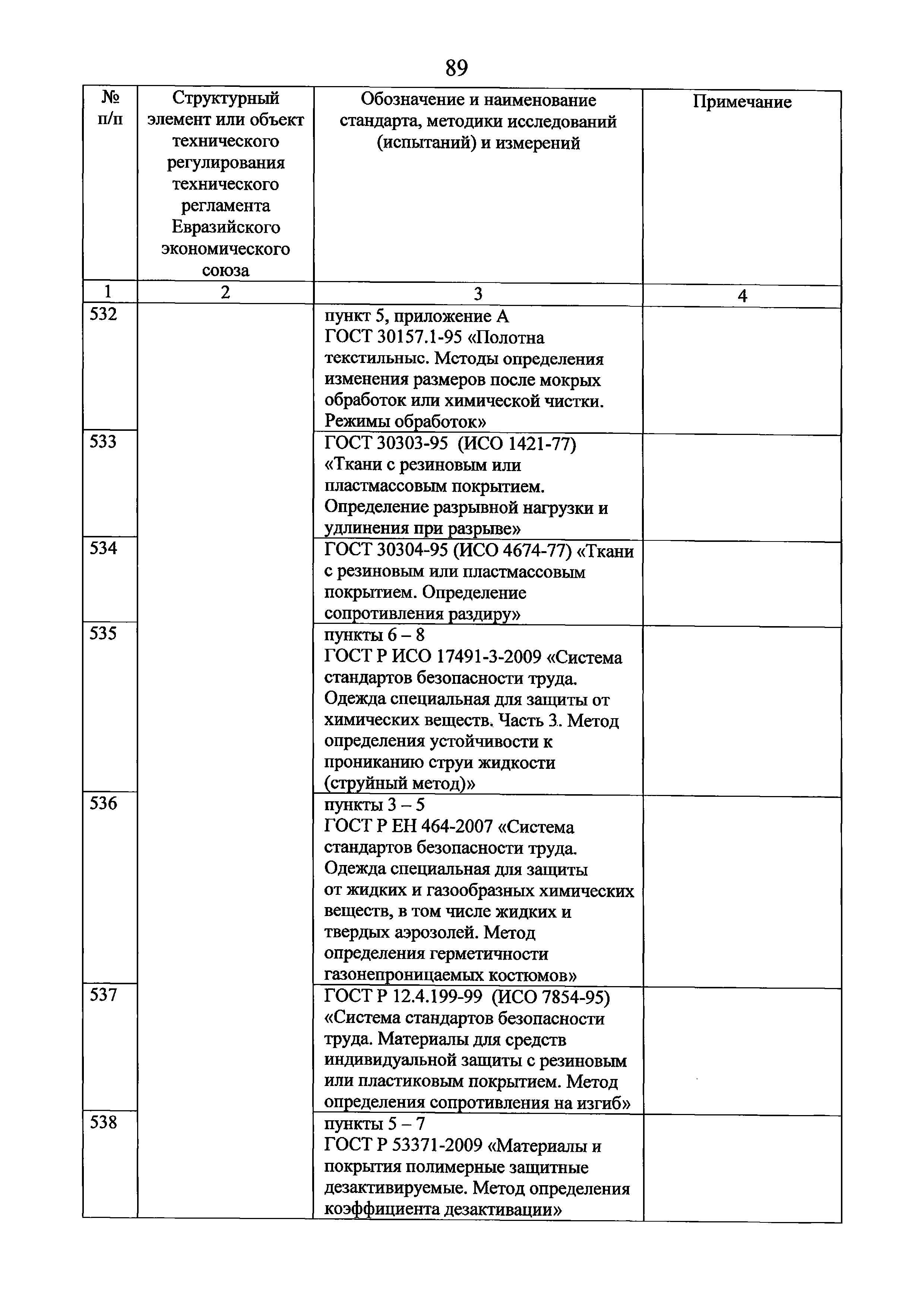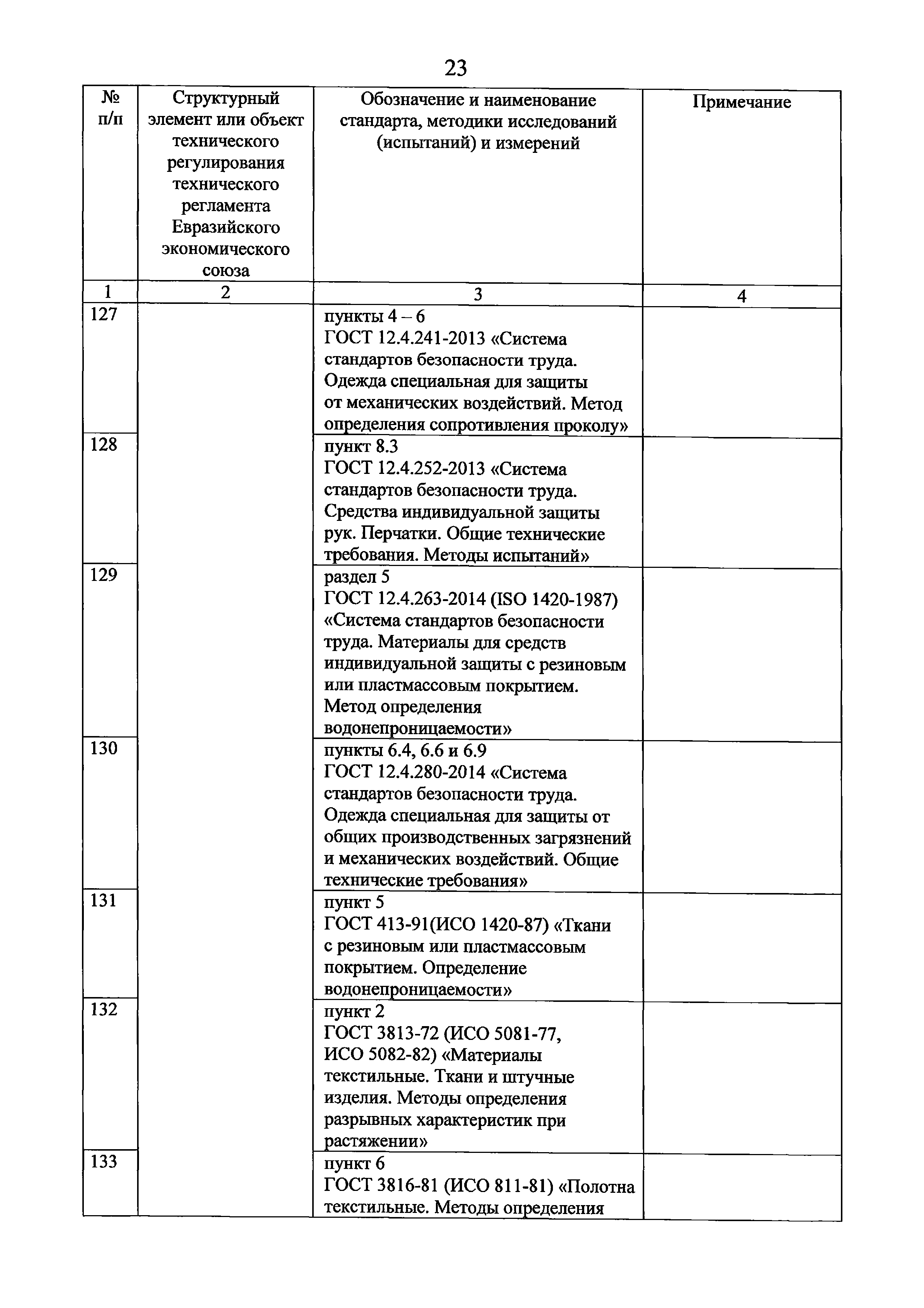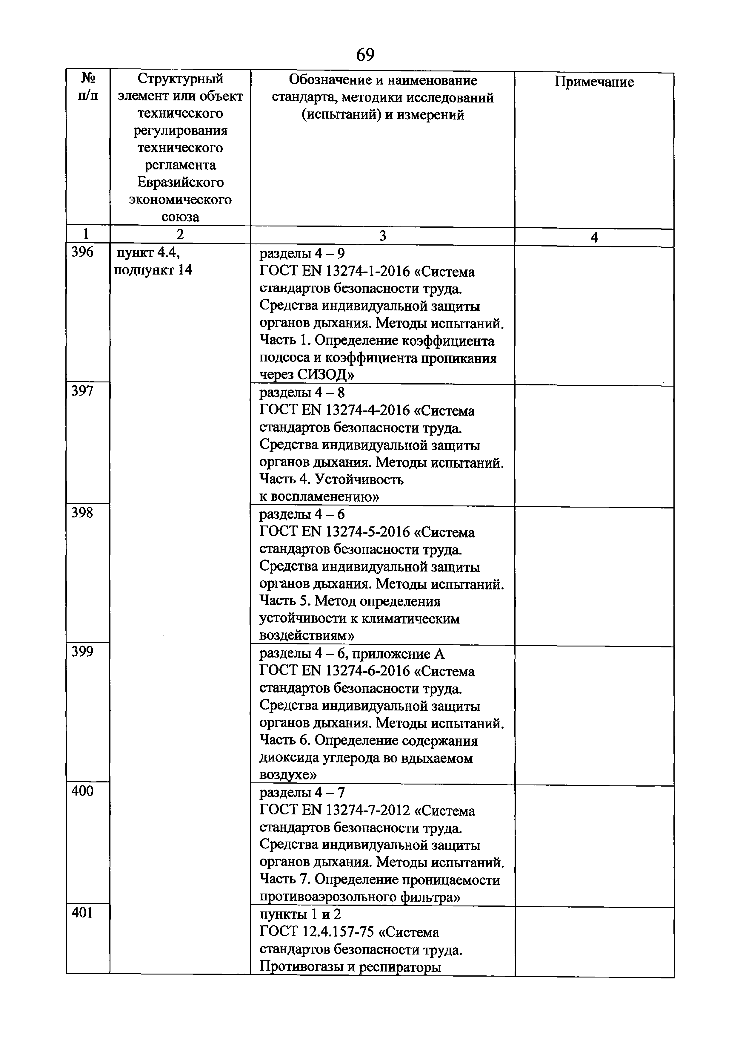 Перечень международных и региональных (межгосударственных) стандартов, а в случае их отсутствия - национальных (государственных) стандартов, содержащих правила и методы исследований (испытаний) и измерений, в том числе правила отбора образцов, необходимые для применения и исполнения требований технического регламента Таможенного союза "О безопасности средств индивидуальной защиты" (ТР ТС 019/2011) и осуществления оценки соответствия объектов технического регулирования. Редакция 3| Статус: | действует | | Название рус.: | Перечень международных и региональных (межгосударственных) стандартов, а в случае их отсутствия - национальных (государственных) стандартов, содержащих правила и методы исследований (испытаний) и измерений, в том числе правила отбора образцов, необходимые для применения и исполнения требований технического регламента Таможенного союза "О безопасности средств индивидуальной защиты" (ТР ТС 019/2011) и осуществления оценки соответствия объектов технического регулирования. Редакция 3 | | Дата добавления в базу: | 01.01.2021 | | Дата актуализации: | 01.01.2021 | | Дата введения: | 04.04.2020 | | Утверждён: | 03.03.2020 Коллегия Евразийской экономической комиссии (30)