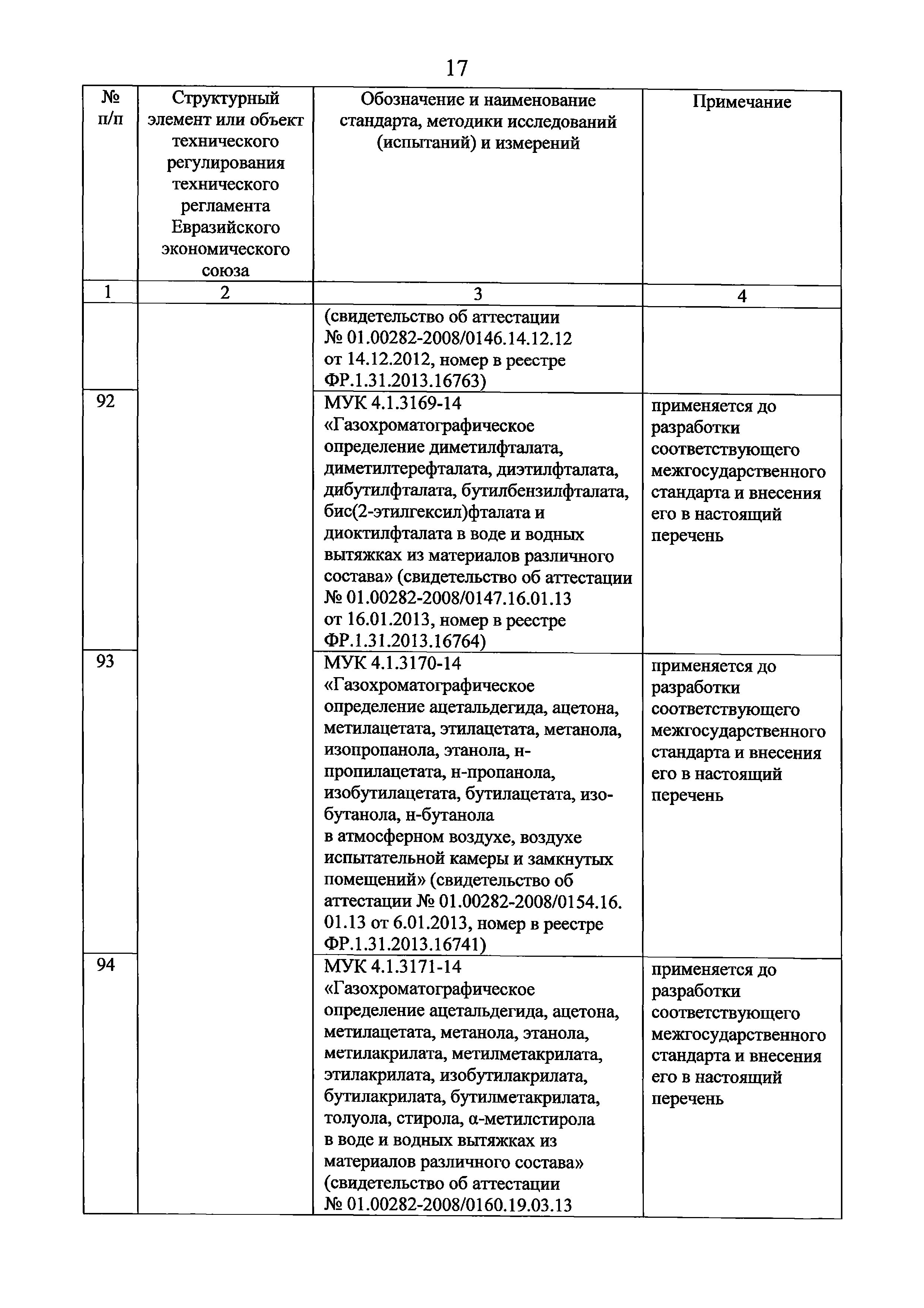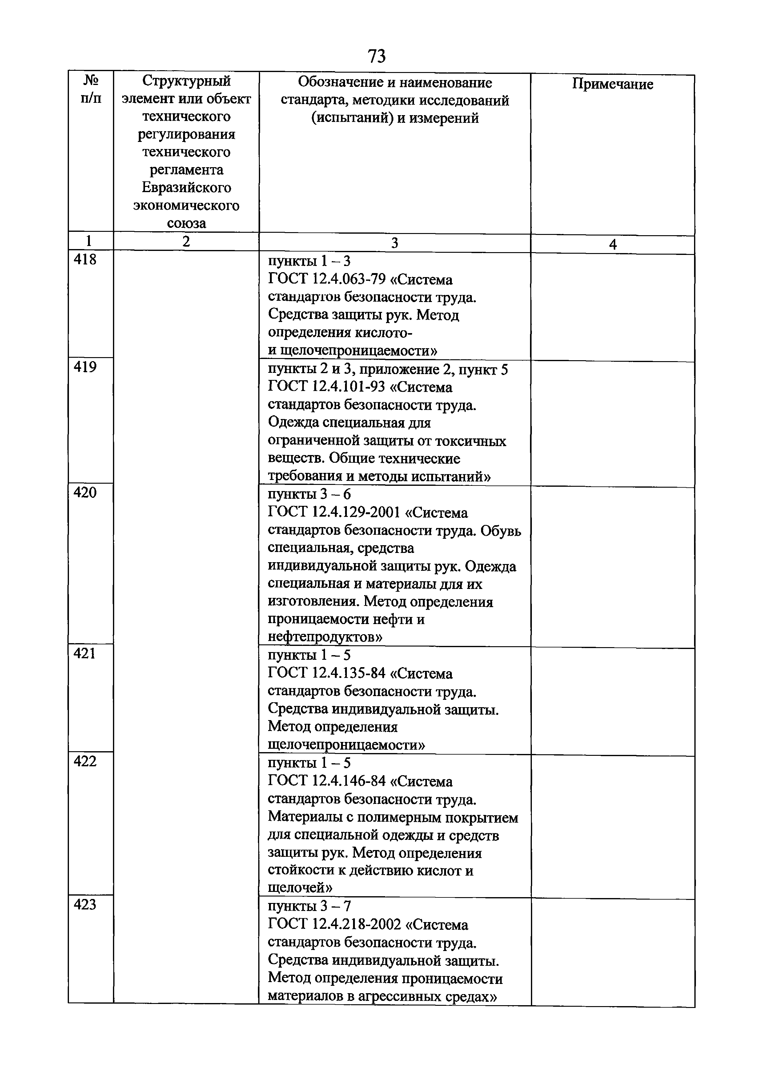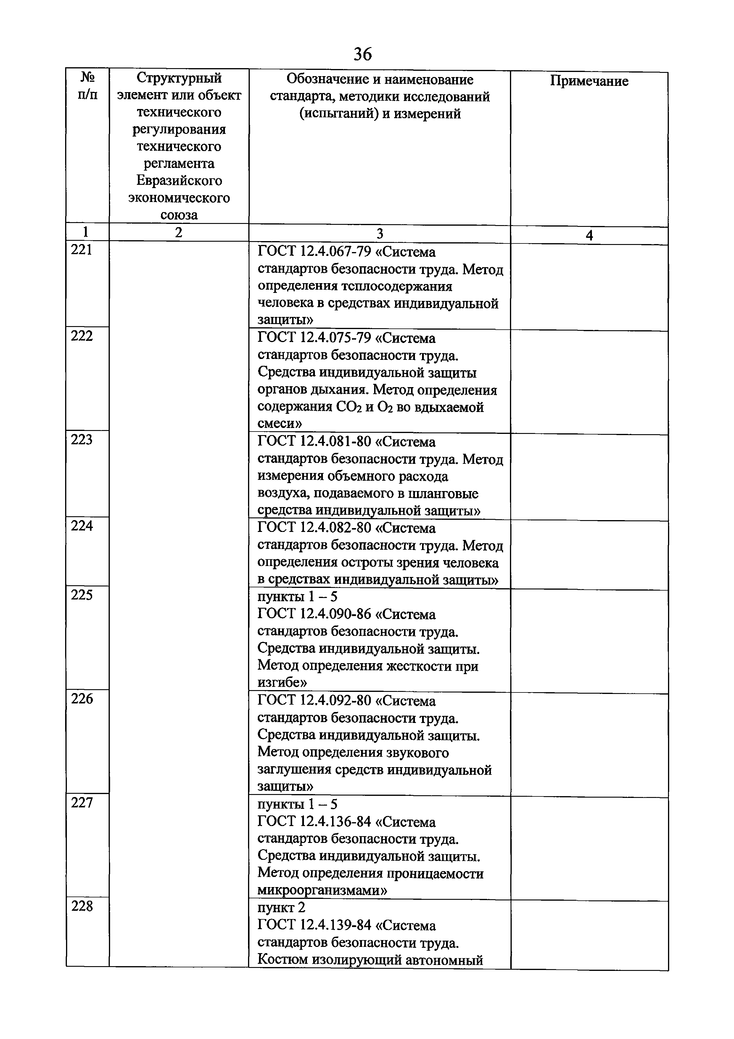 | | Заменяет собой: | | | Нормативные ссылки: |   ГОСТ 26150-84 «Материалы и изделия строительные полимерные отделочные на основе поливинилхлорида. Метод санитарно-химической оценки»  ГОСТ 12.1.038-82 «Система стандартов безопасности труда. Электробезопасность. Предельно допустимые значения напряжений прикосновения и токов»  ГОСТ 12.1.044-89 «Система стандартов безопасности труда. Пожаровзрывоопасность веществ и материалов. Номенклатура показателей и методы их определения»  ГОСТ 12.4.002-97 «Система стандартов безопасности труда. Средства защиты рук от вибрации. Технические требования и методы испытаний»  ГОСТ 12.4.128-83 «Система стандартов безопасности труда. Каски защитные. Общие технические условия»  ГОСТ 4152-89 «Вода питьевая. Метод определения массовой концентрации мышьяка» ГОСТ 22648-77 «Пластмассы. Методы определения гигиенических показателей» ГОСТ 30304-95 «Ткани с резиновым или пластмассовым покрытием. Определение сопротивления раздиру»  МУК 2.3.3.052-96 «Санитарно-химическое исследование изделий из полистирола и сополимеров стирола»  ГОСТ 12.4.023-84 «Система стандартов безопасности труда. Щитки защитные лицевые. Общие технические требования и методы контроля» ГОСТ 10188-74 «Коробки фильтрующие к противогазам и респираторам. Метод определения сопротивления постоянному потоку воздуха» ГОСТ 12.4.005-85 «Система стандартов безопасности труда. Средства индивидуальной защиты органов дыхания. Метод определения величины сопротивления дыханию» ГОСТ 12.4.008-84 «Система стандартов безопасности труда. Средства индивидуальной защиты. Метод определения поля зрения» ГОСТ 12.4.024-76 «Система стандартов безопасности труда. Обувь специальная виброзащитная. Общие технические требования» ГОСТ 12.4.049-78 «Система стандартов безопасности труда. Ткани хлопчатобумажные и смешанные для спецодежды. Метод определения устойчивости к мокрой обработке»  ГОСТ 12.4.061-88 «Система стандартов безопасности труда. Метод определения работоспособности человека в средствах индивидуальной защиты»  ГОСТ 12.4.063-79 «Система стандартов безопасности труда. Средства защиты рук. Метод определения кислото- и щелочепроницаемости»  ГОСТ 12.4.064-84 «Система стандартов безопасности труда. Костюмы изолирующие. Общие технические требования и методы испытаний»  ГОСТ 12.4.067-79 «Система стандартов безопасности труда. Метод определения теплосодержания человека в средствах индивидуальной защиты» ГОСТ 12.4.072-79 «Система стандартов безопасности труда. Сапоги специальные резиновые формовые, защищающие от воды, нефтяных масел и механических воздействий. Технические условия» ГОСТ 12.4.075-79 «Система стандартов безопасности труда. Средства индивидуальной защиты органов дыхания. Метод определения содержания СO2 и O2 во вдыхаемой смеси» ГОСТ 12.4.081-80 «Система стандартов безопасности труда. Метод измерения объемного расхода воздуха, подаваемого в шланговые средства индивидуальной защиты» ГОСТ 12.4.082-80 «Система стандартов безопасности труда. Метод определения остроты зрения человека в средствах индивидуальной защиты» ГОСТ 12.4.083-80 «Система стандартов безопасности труда. Материалы для низа специальной обуви. Метод определения коэффициента трения скольжения» ГОСТ 12.4.090-86 «Система стандартов безопасности труда. Средства индивидуальной защиты. Метод определения жесткости при изгибе» ГОСТ 12.4.091-80 «Система стандартов безопасн