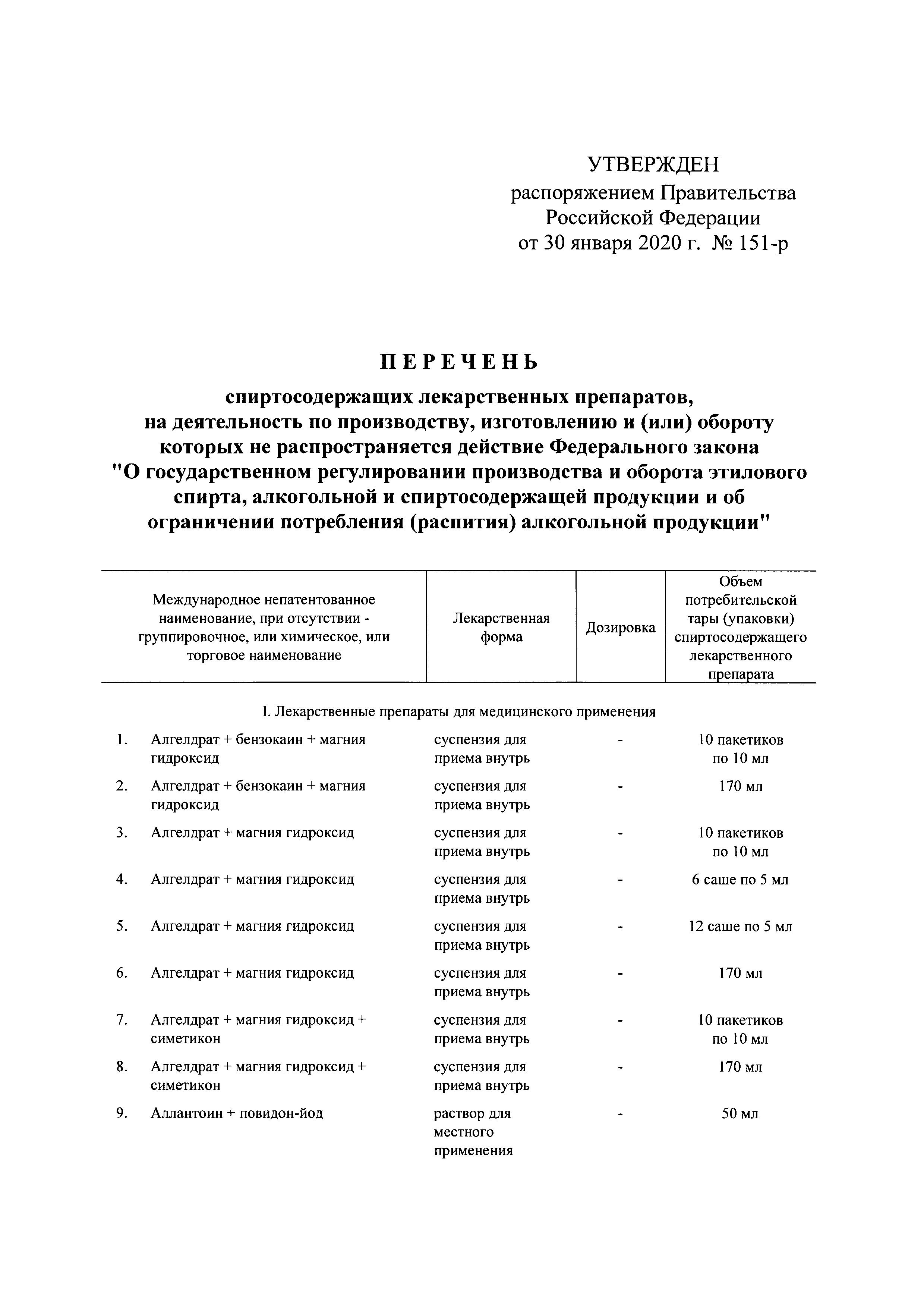 Перечень спиртосодержащих лекарственных препаратов, на деятельность по производству, изготовлению и (или) обороту которых не распространяется действие Федерального закона "О государственном регулировании производства и оборота этилового спирта, алкогольной и спиртосодержащей продукции и об ограничении потребления (распития) алкогольной продукции"| Статус: | действует | | Название рус.: | Перечень спиртосодержащих лекарственных препаратов, на деятельность по производству, изготовлению и (или) обороту которых не распространяется действие Федерального закона "О государственном регулировании производства и оборота этилового спирта, алкогольной и спиртосодержащей продукции и об ограничении потребления (распития) алкогольной продукции" | | Дата добавления в базу: | 01.01.2021 | | Дата актуализации: | 01.01.2021 | | Дата введения: | 30.01.2020 | | Утверждён: | 30.01.2020 Правительство Российской Федерации (151-р)