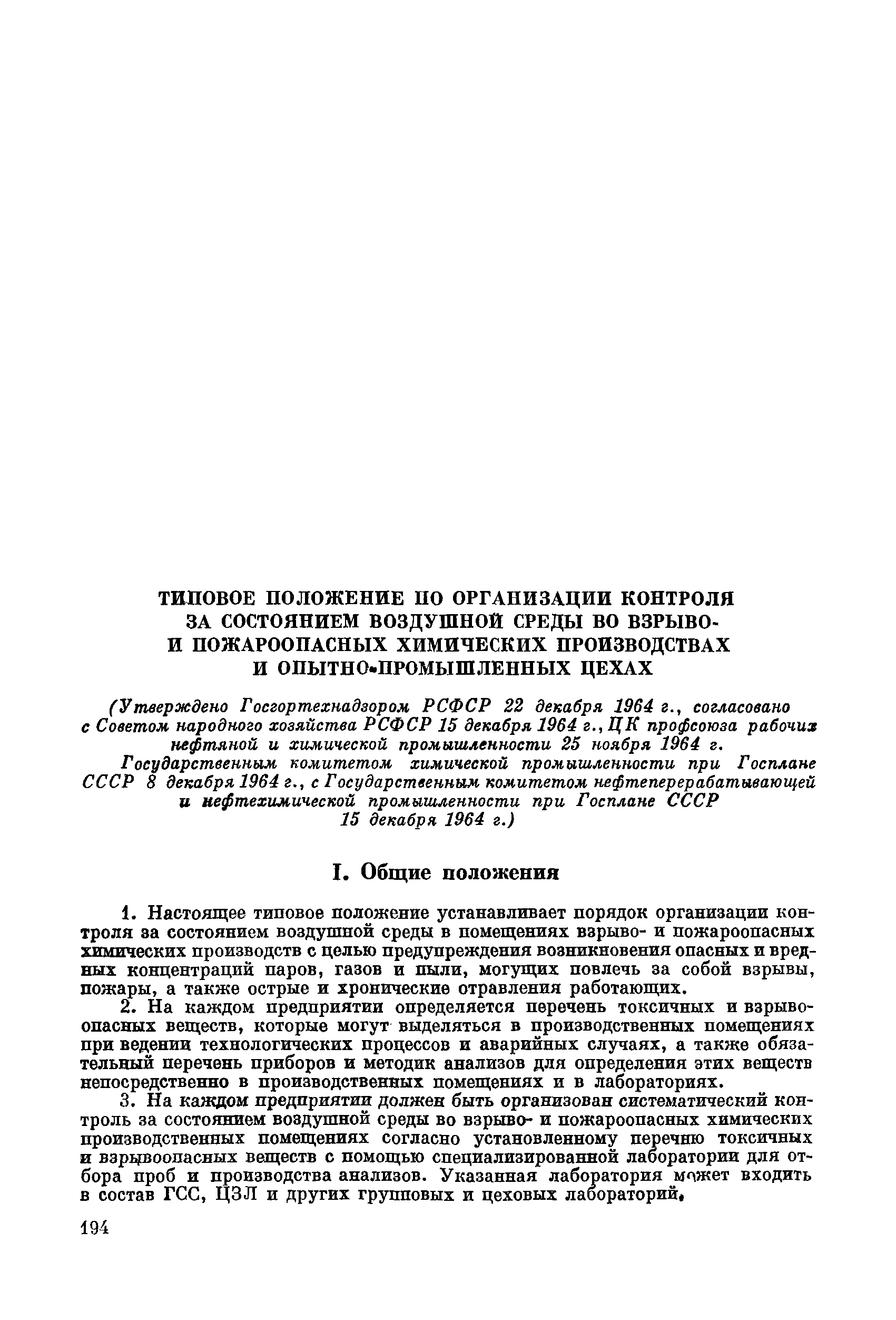 | Название рус.: | Типовое положение по организации контроля за состоянием воздушной среды во взрыво- и пожароопасных химических производствах и опытно-промышленных цехах |
