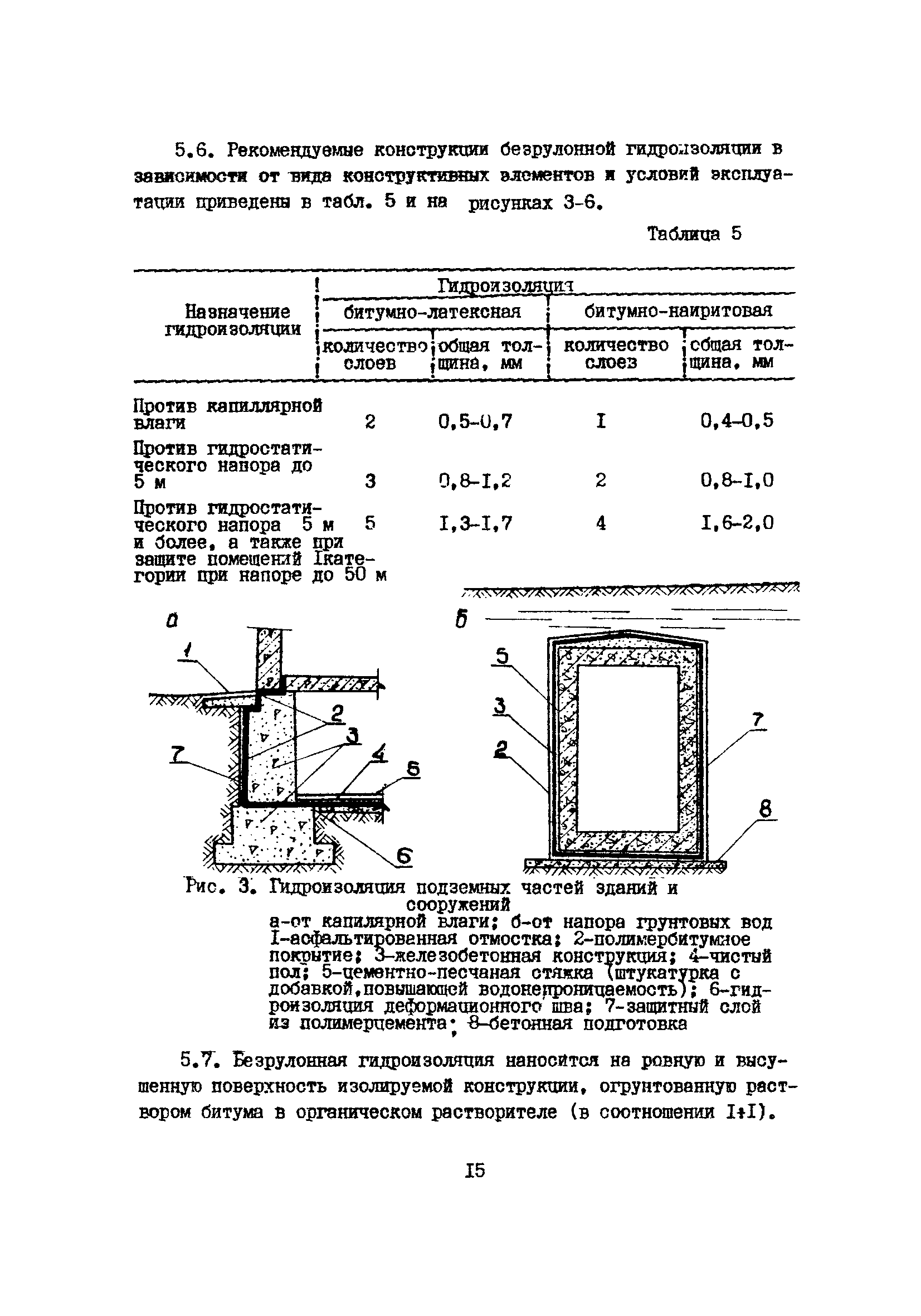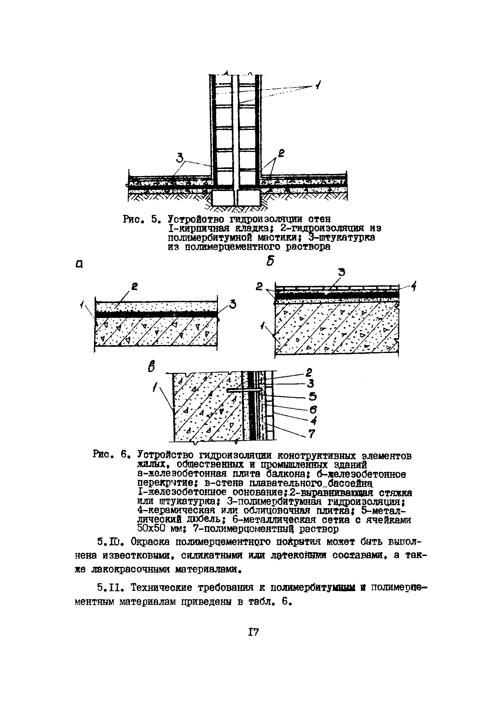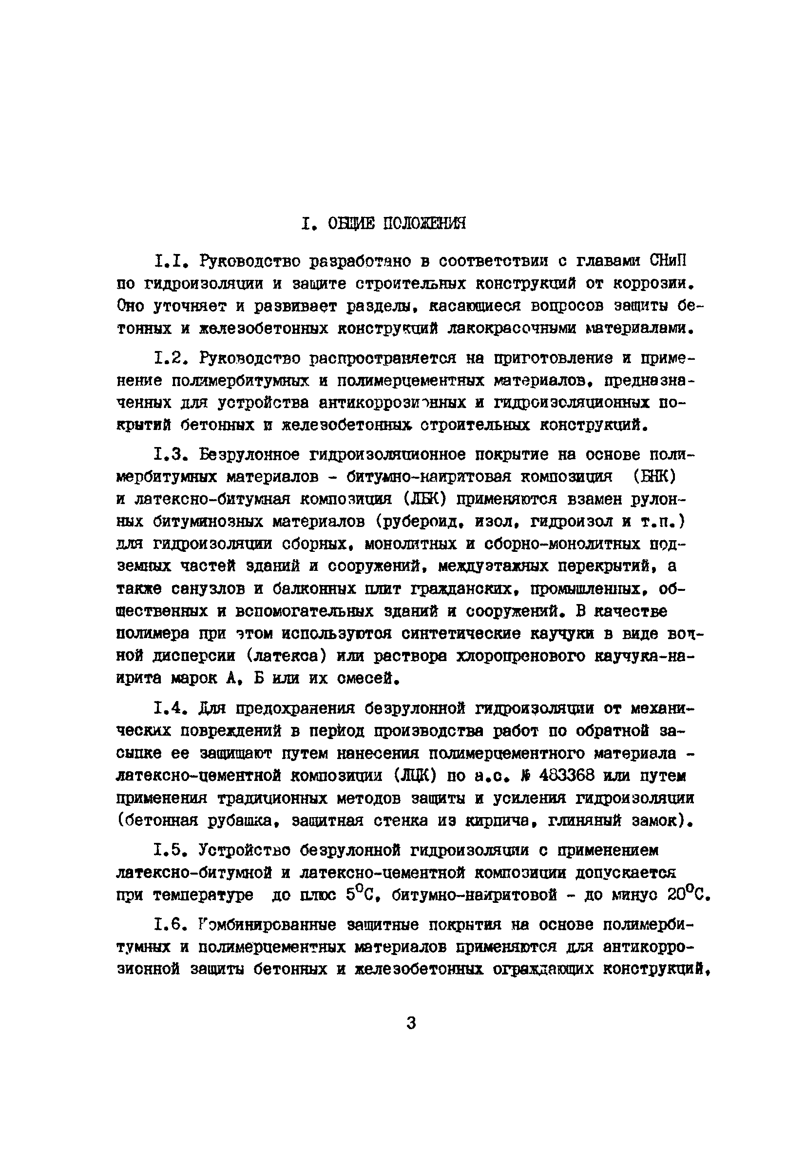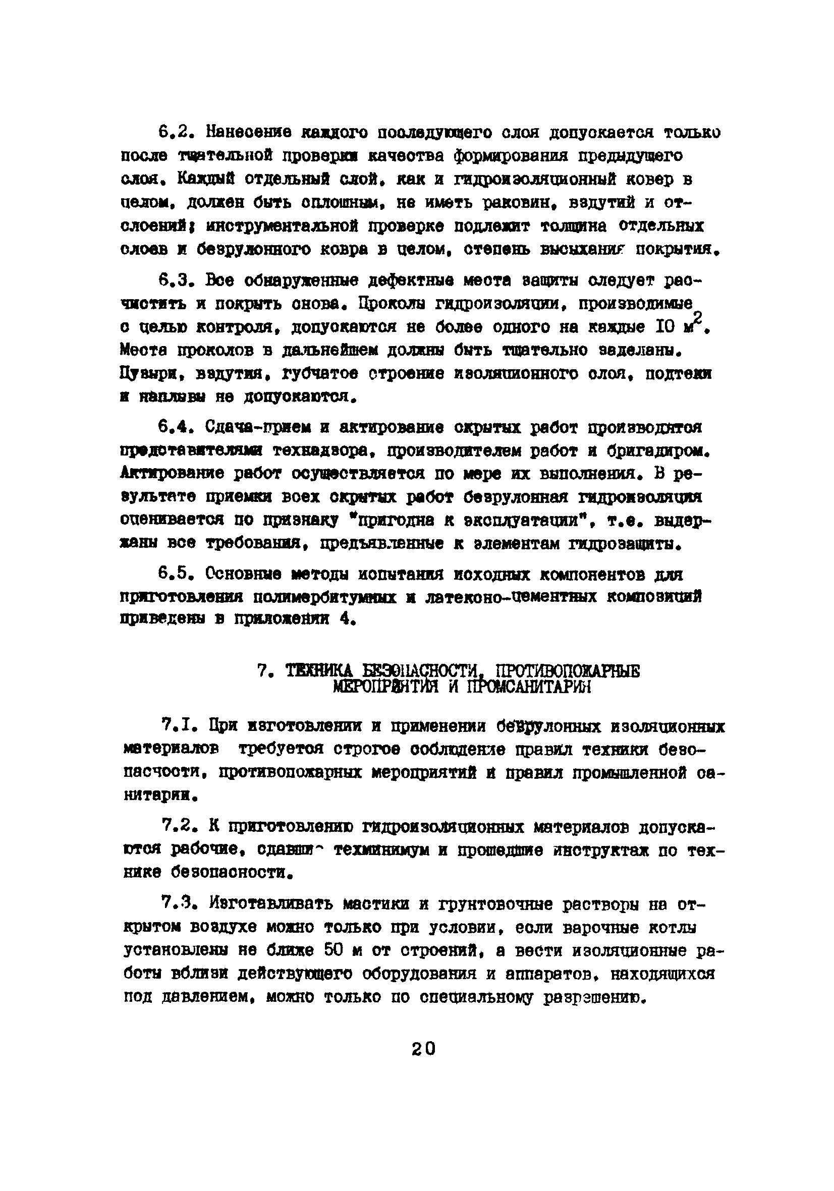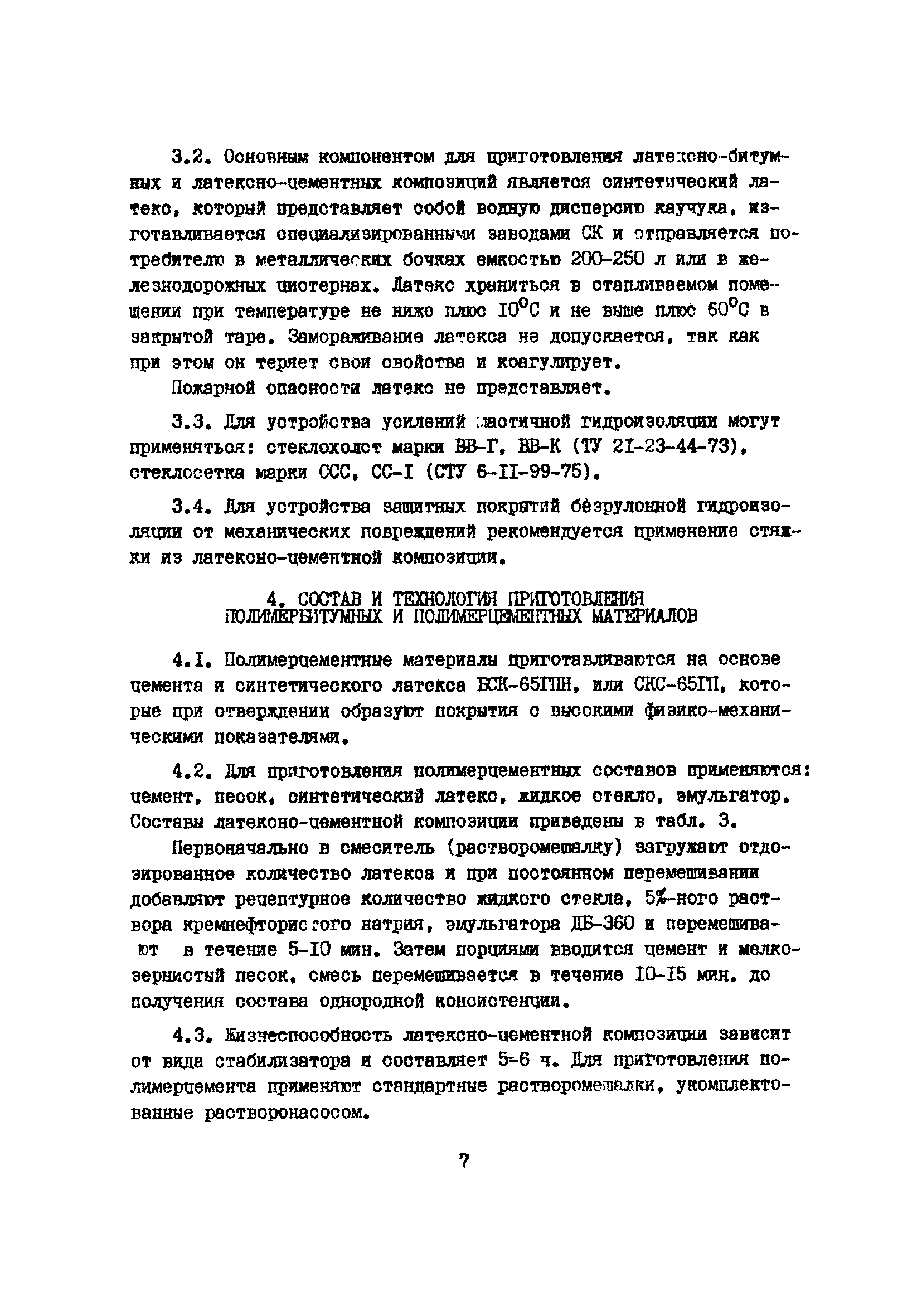| Оглавление: | 1. Общие положения 2. Требования к защищаемой поверхности строительных конструкций 3. Требования к исходным материалам 4. Составы и технология приготовления полимербитумных и полимерцементных материалов 5. Конструктивные решения и технология устройства защитных покрытий 6. Контроль качества безрулонной гидроизоляции 7. Техника безопасности, противопожарные мероприятия и промсанитария Приложение 1. Перечень оборудования для приготовления полимербитумных и полимерцементных композиций Приложение 2. Перечень оборудования для нанесения полимербитумных и полимерцементных композиций Приложение 3. Расход компонентов для приготовления 1 т полимербитумных и полимерцементных композиций Приложение 4. Основные методы испытания мастик и исходных материалов Приложение 5. Пример расчета экономической эффективности применения полимербитумных материалов |