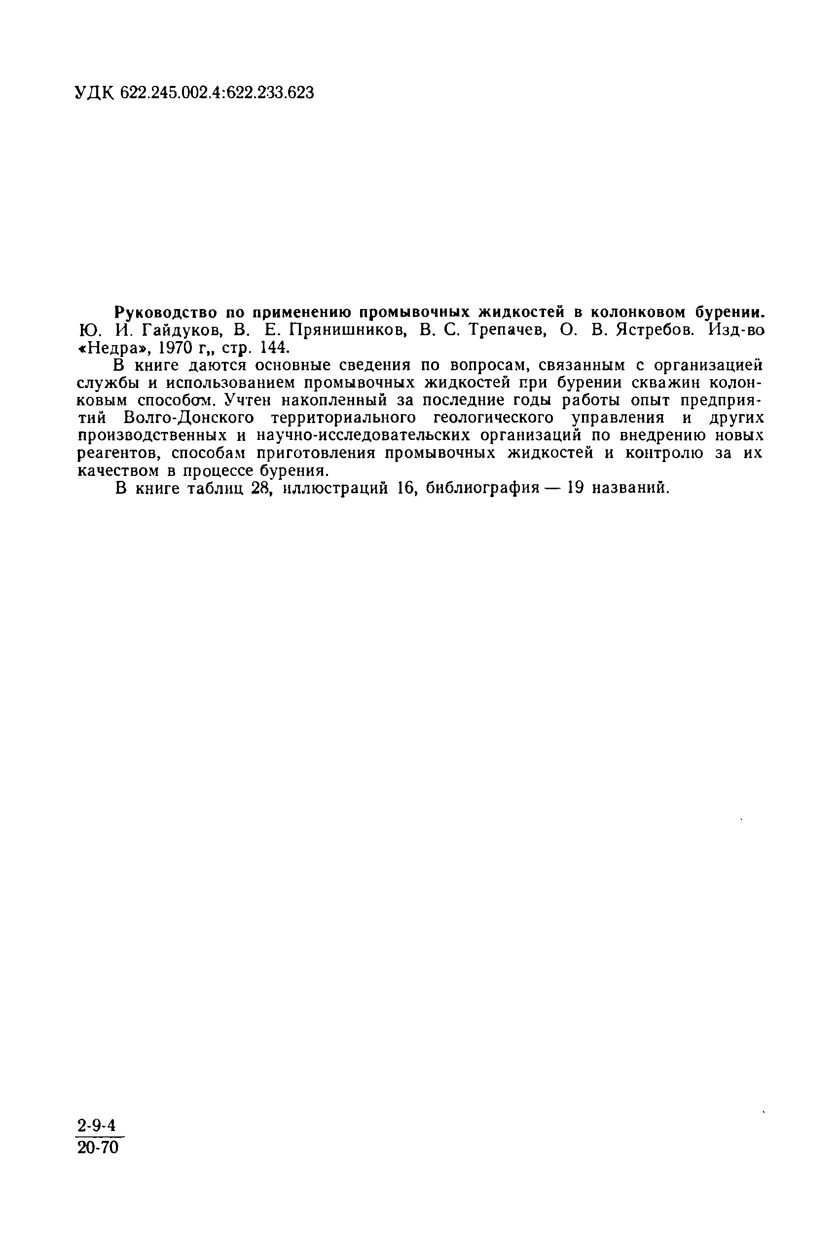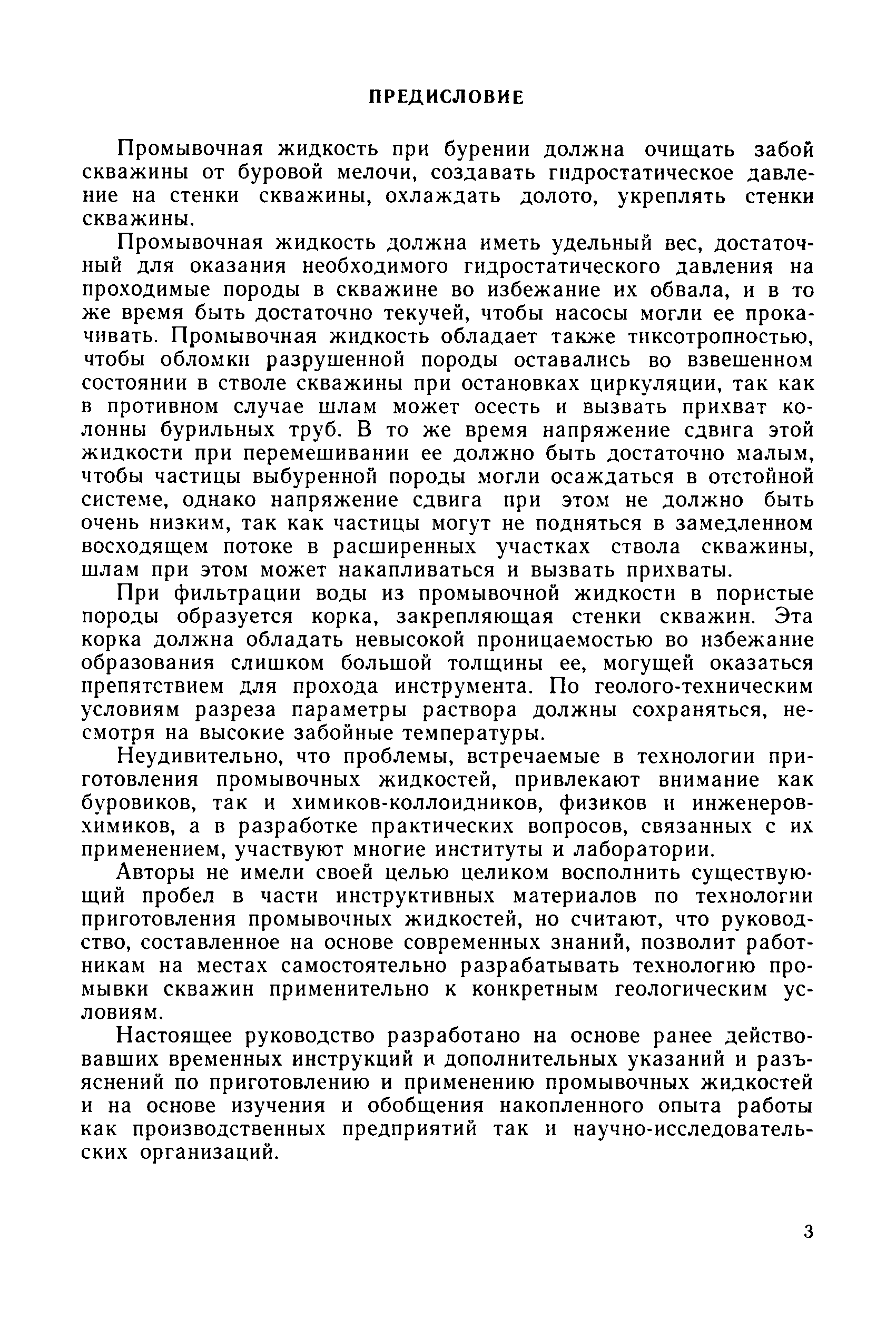 Руководство по применению промывочных жидкостей в колонковом бурении| Статус: | справочные материалы, мп, тпр | | Название рус.: | Руководство по применению промывочных жидкостей в колонковом бурении | | Дата добавления в базу: | 01.01.2021 | | Дата актуализации: | 01.01.2021 | | Область применения: | В книге даются основные сведения по вопросам, связанным с организацией службы и использованием промывочных жидкостей при бурении скважин колонковым способом. Учтен накопленный за последние годы работы опыт предприятий Волго-Донского территориального геологического управления и других производственных и научно-исследовательских организаций по внедрению новых реагентов, способам приготовления промывочных жидкостей и контролю за их качеством в процессе бурения | | Оглавление: | Предисловие Условные обозначения и сокращения, принятые и использованные в тексте Глава 1. Общие сведения о промывочных жидкостях Глава 2. параметры промывочных жидкостей, их значение и способы определения Глава 3. Область применения различных видов промывочных жидкостей Глава 4. Способы и рецептура приготовления промывочных жидкостей Глава 5. Приготовление химических реагентов Глава 6. Способы обработки и изменения параметров промывочных жидкостей в процессе производства работ на скважинах Глава 7. Циркуляционные системы на буровых вышках Глава 8. Устройство глинистых станций Глава 9. Сведения о материалах, идущих на приготовление промывочных жидкостей Глава 10. Полевые методы исследования и оценки пригодности некоторых основных материалов, идущих на приготовление глинистых растворов Глава 11. Основные условия безопасного производства работ при приготовлении глинистых растворов и реагентов и проведении лабораторных испытаний Приложение 1. Журнал учета результатов анализа проб глинистых растворов на глинистой станции Приложение 2. Журнал ежесменного учета приготовления и расхода глинистого раствора, химических реагентов Литература | | Издан: | Издательство Недра (1970 г. )