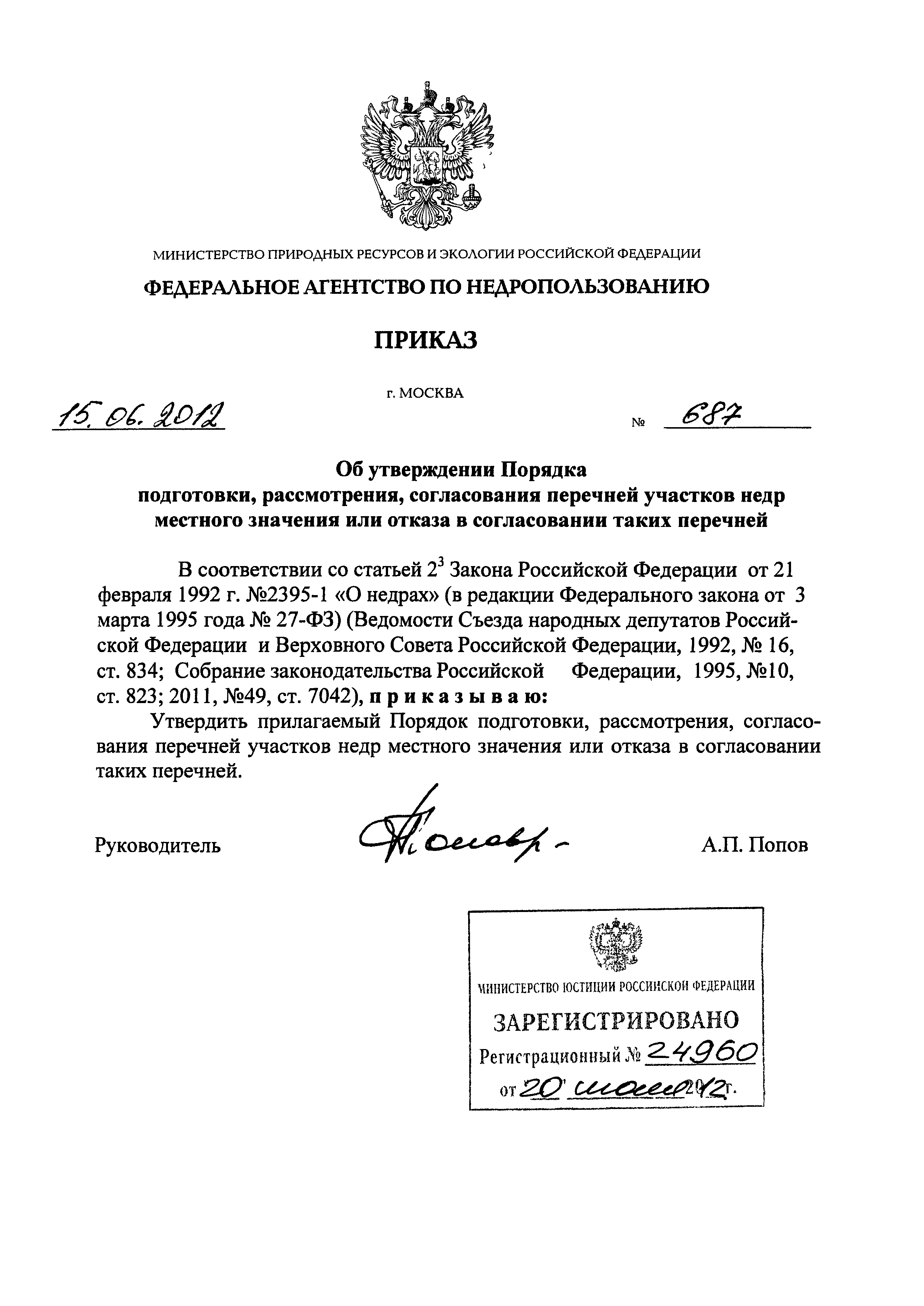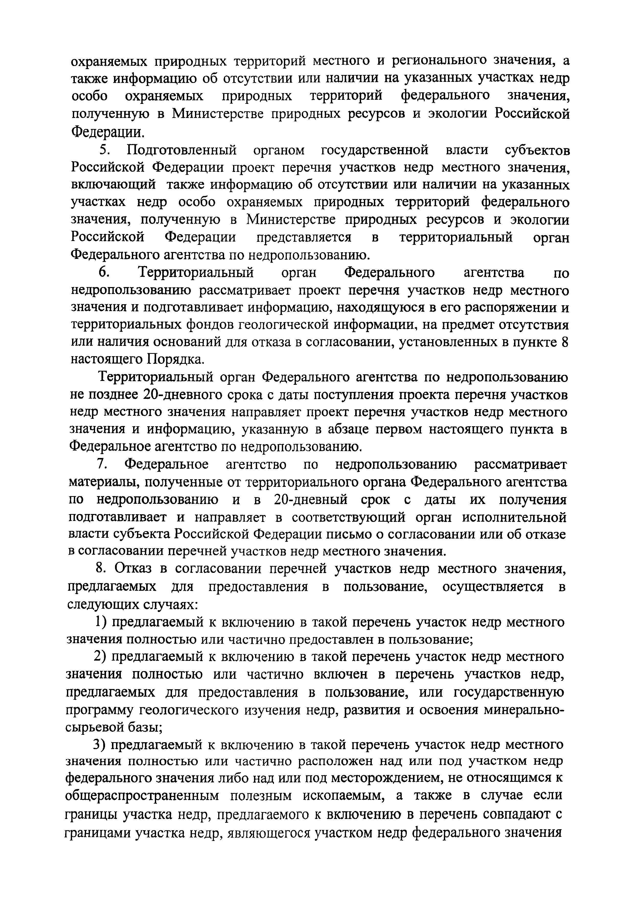 Порядок подготовки, рассмотрения, согласования перечней участков недр местного значения или отказа в согласовании таких перечней| Статус: | действует | | Название рус.: | Порядок подготовки, рассмотрения, согласования перечней участков недр местного значения или отказа в согласовании таких перечней | | Дата добавления в базу: | 01.01.2021 | | Дата актуализации: | 01.01.2021 | | Дата введения: | 14.08.2012 | | Область применения: | Порядок регламентирует процедуру подготовки, рассмотрения, согласования перечней участков недр местного значения в отношении участков недр, содержащих общераспространенные полезные ископаемые или отказа в согласовании таких перечней. Действие Порядка не распространяется на процедуру подготовки, рассмотрения и согласования перечней участков недр местного значения, содержащих участки недр, используемые для строительства и эксплуатации подземных сооружений местного и регионального значения, не связанных с добычей полезных ископаемых | | Оглавление: | Приложение. Форма перечня участков недр местного значения | | Утверждён: | 15.06.2012 Федеральное агентство по недропользованию (687)