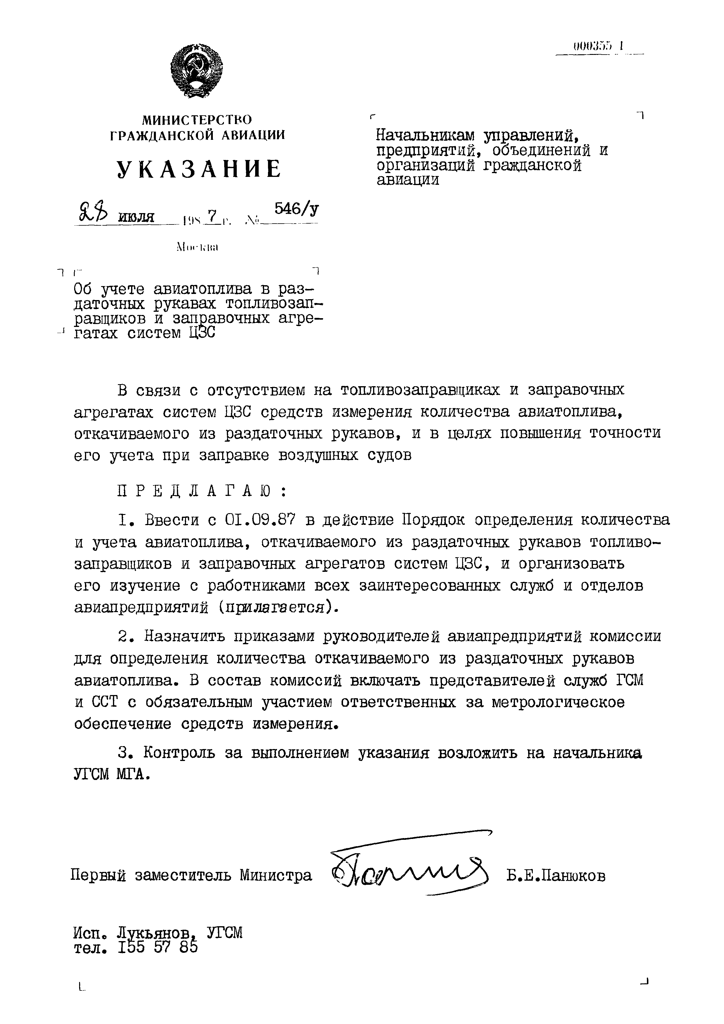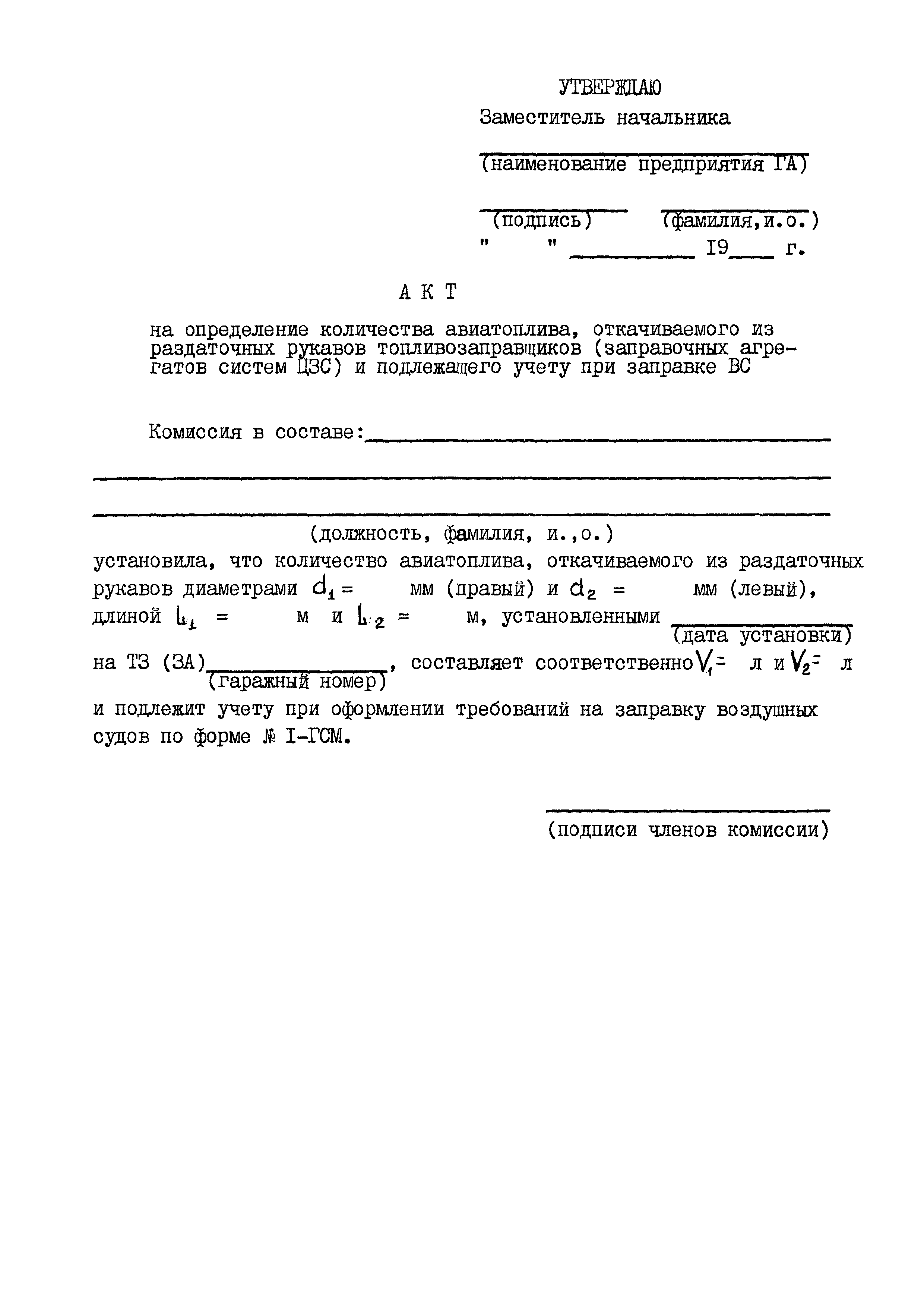 Порядок определения количества и учета авиатоплива, откачиваемого из раздаточных рукавов топливозаправщиков и заправочных агрегатов систем ЦЗС| Статус: | действует | | Название рус.: | Порядок определения количества и учета авиатоплива, откачиваемого из раздаточных рукавов топливозаправщиков и заправочных агрегатов систем ЦЗС | | Дата добавления в базу: | 01.01.2021 | | Дата актуализации: | 01.01.2021 | | Дата введения: | 01.09.1987 | | Утверждён: | 28.07.1987 Министерство гражданской авиации СССР (USSR Ministry of Civil Aviation 546/у)