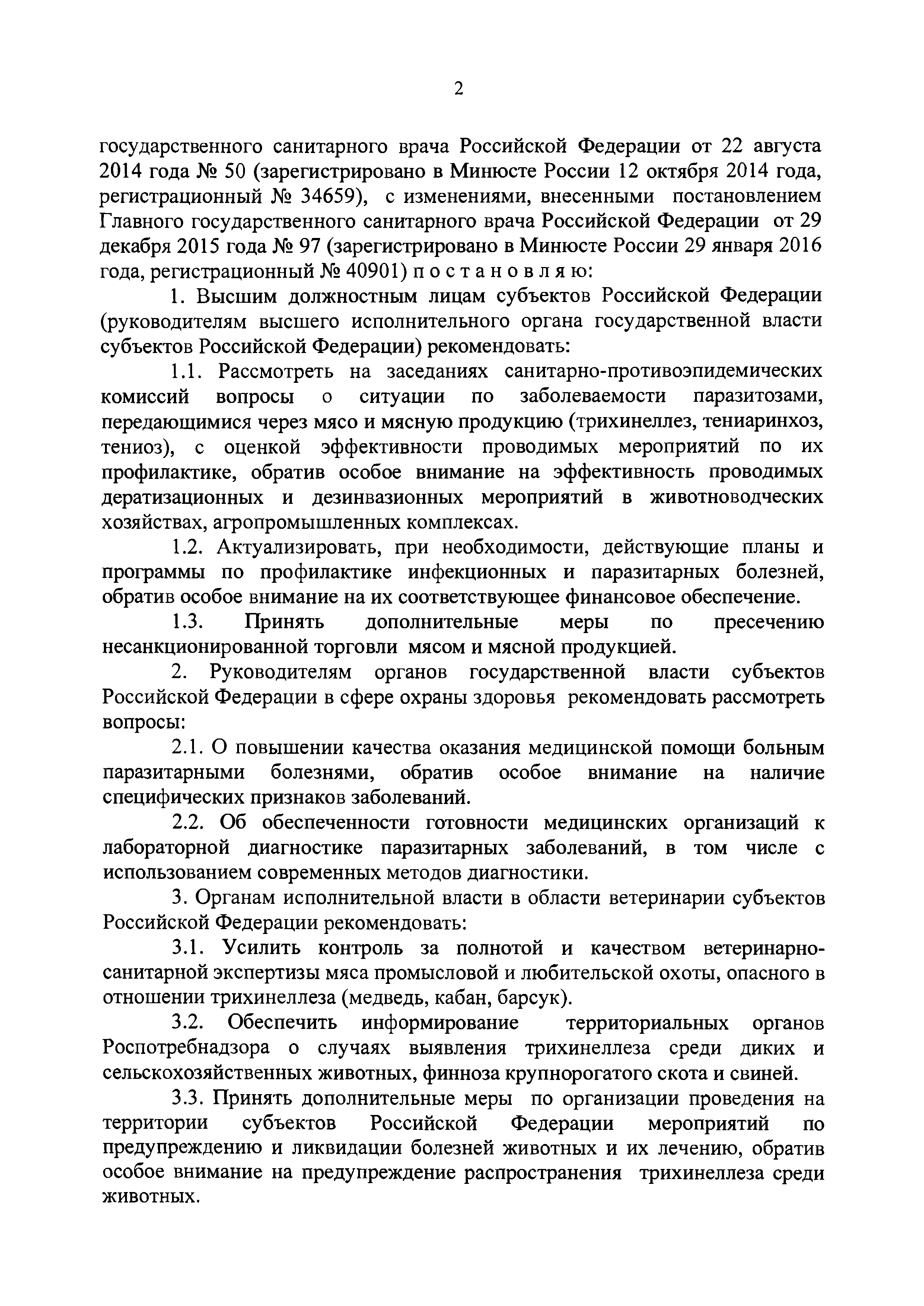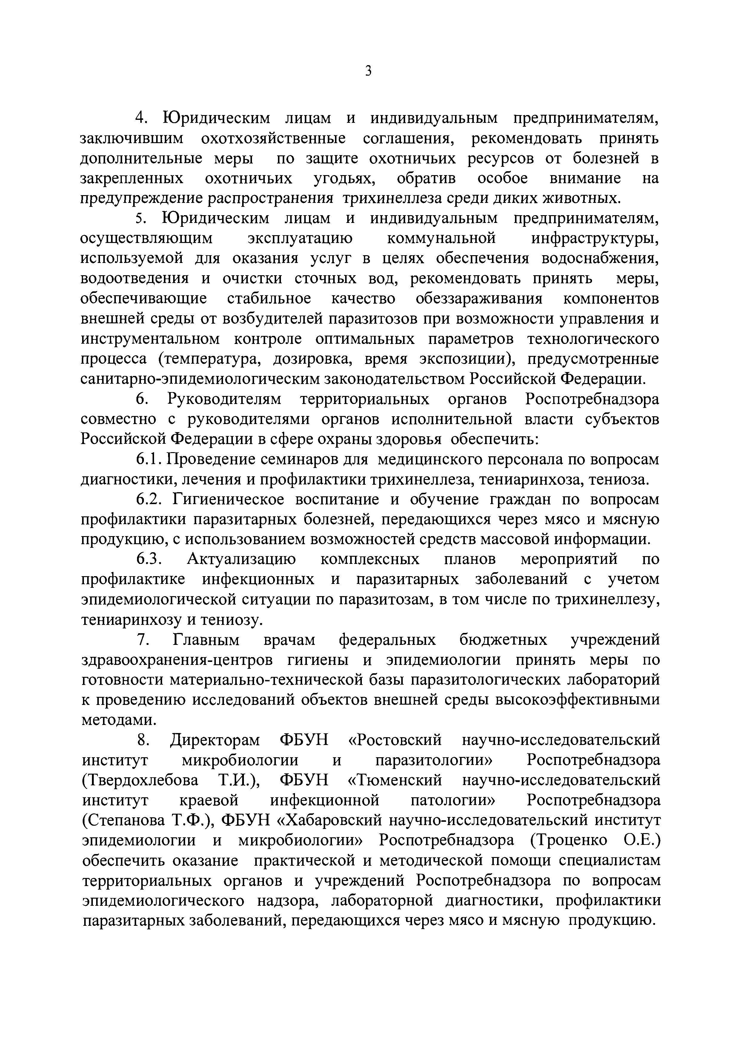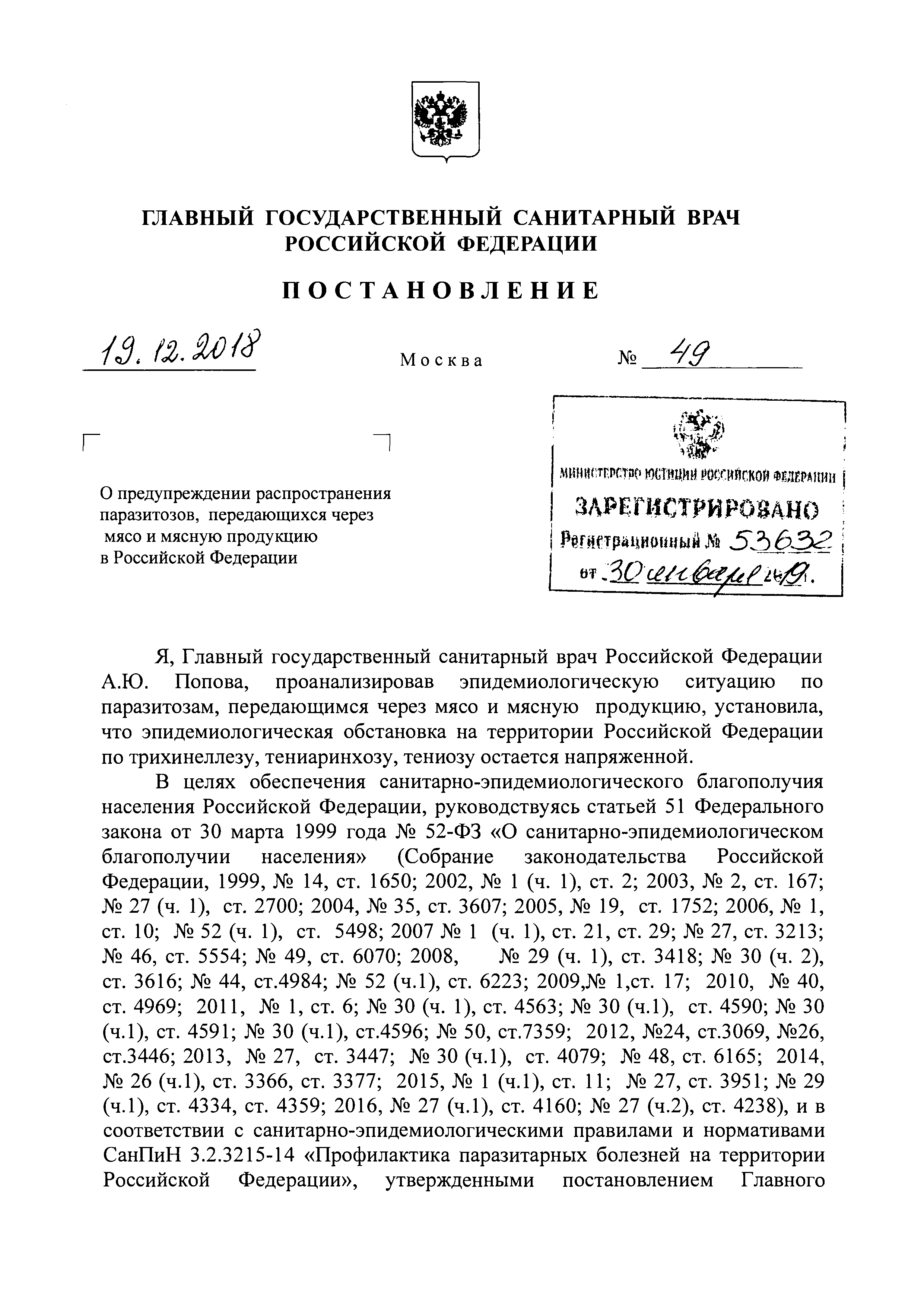 О предупреждении распространения паразитозов, передающихся через мясо и мясную продукцию в Российской Федерации| Статус: | действует | | Название рус.: | О предупреждении распространения паразитозов, передающихся через мясо и мясную продукцию в Российской Федерации | | Дата добавления в базу: | 01.01.2021 | | Дата актуализации: | 01.01.2021 | | Утверждён: | 19.12.2018 Главный государственный санитарный врач Российской Федерации (49)