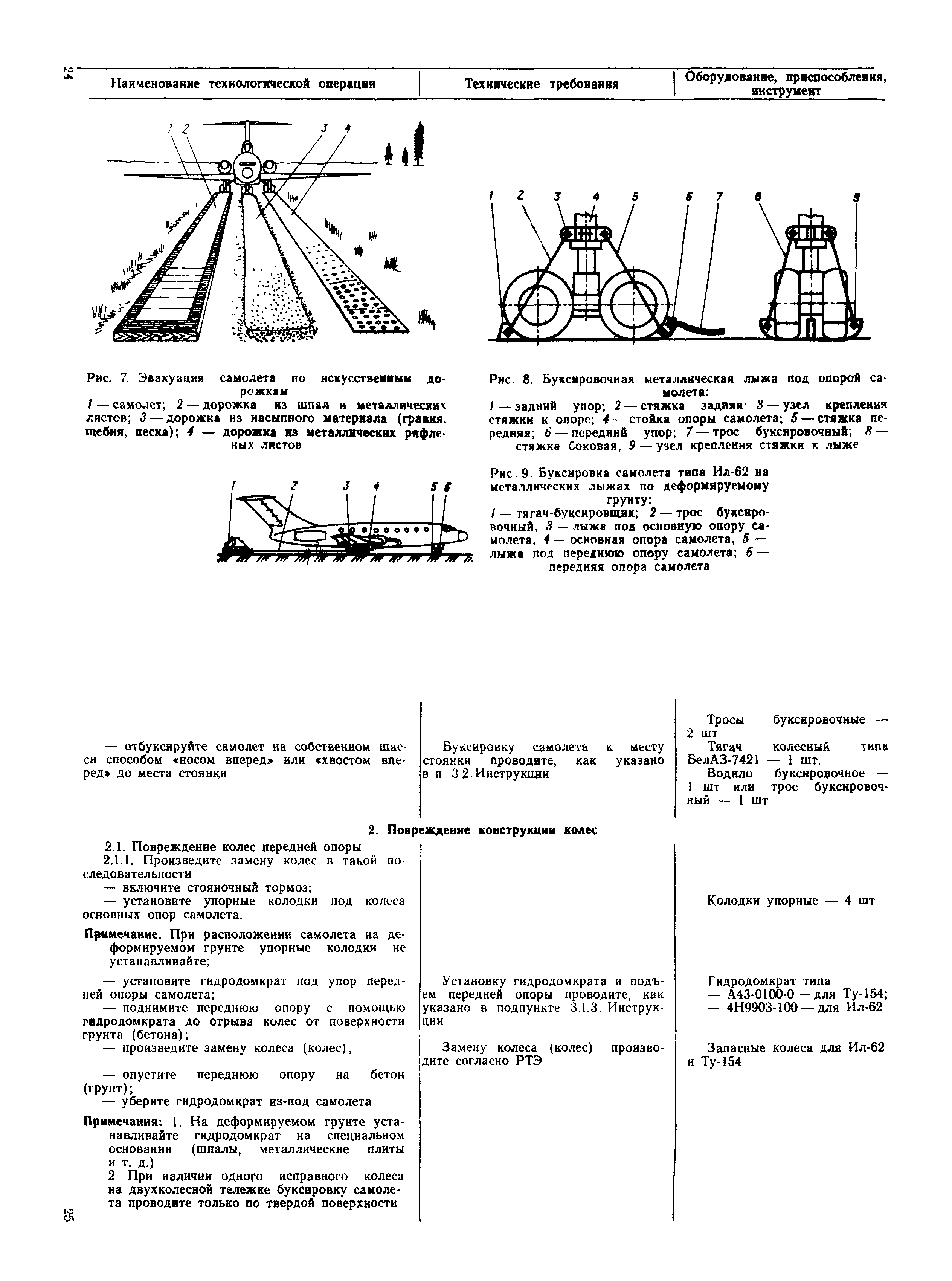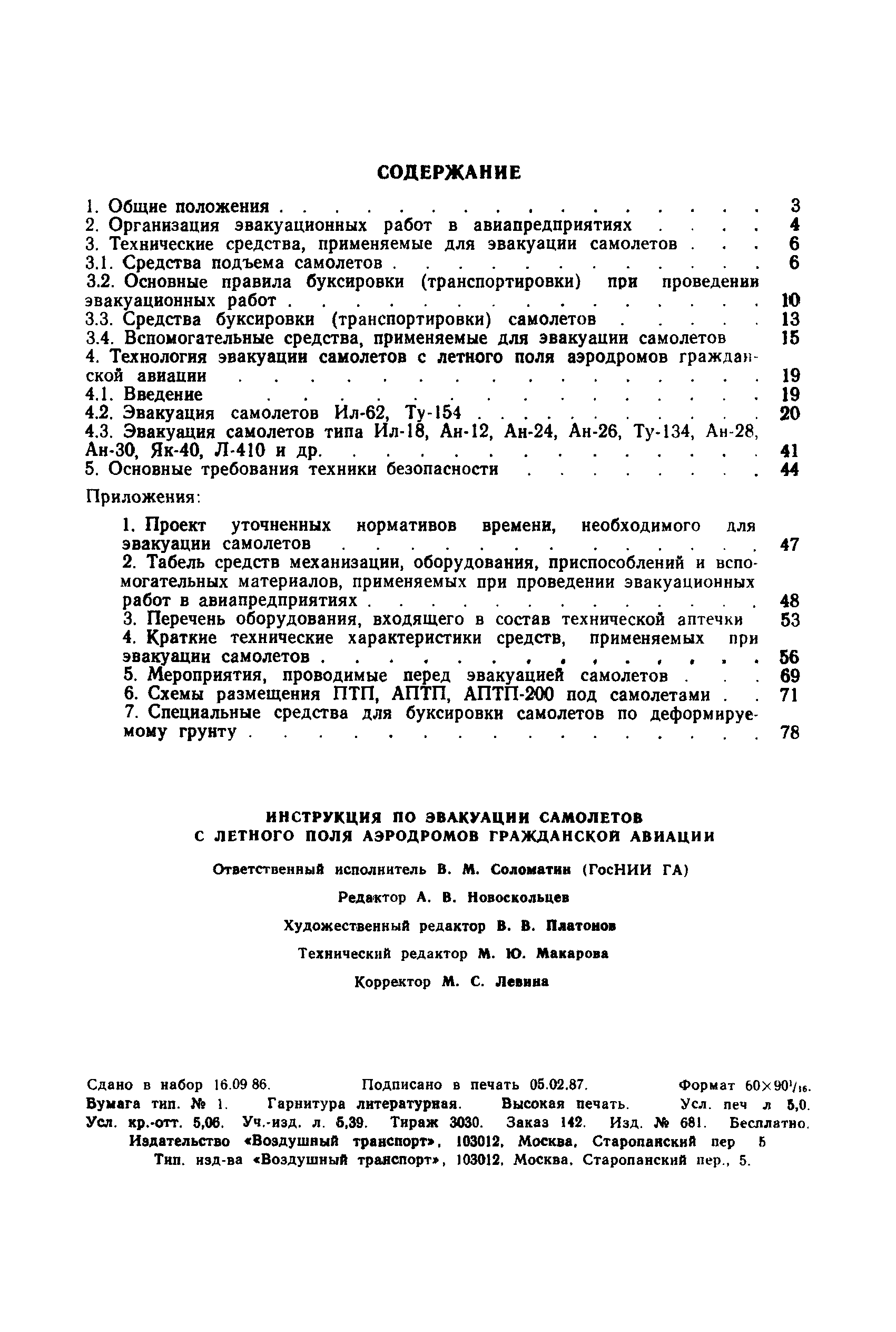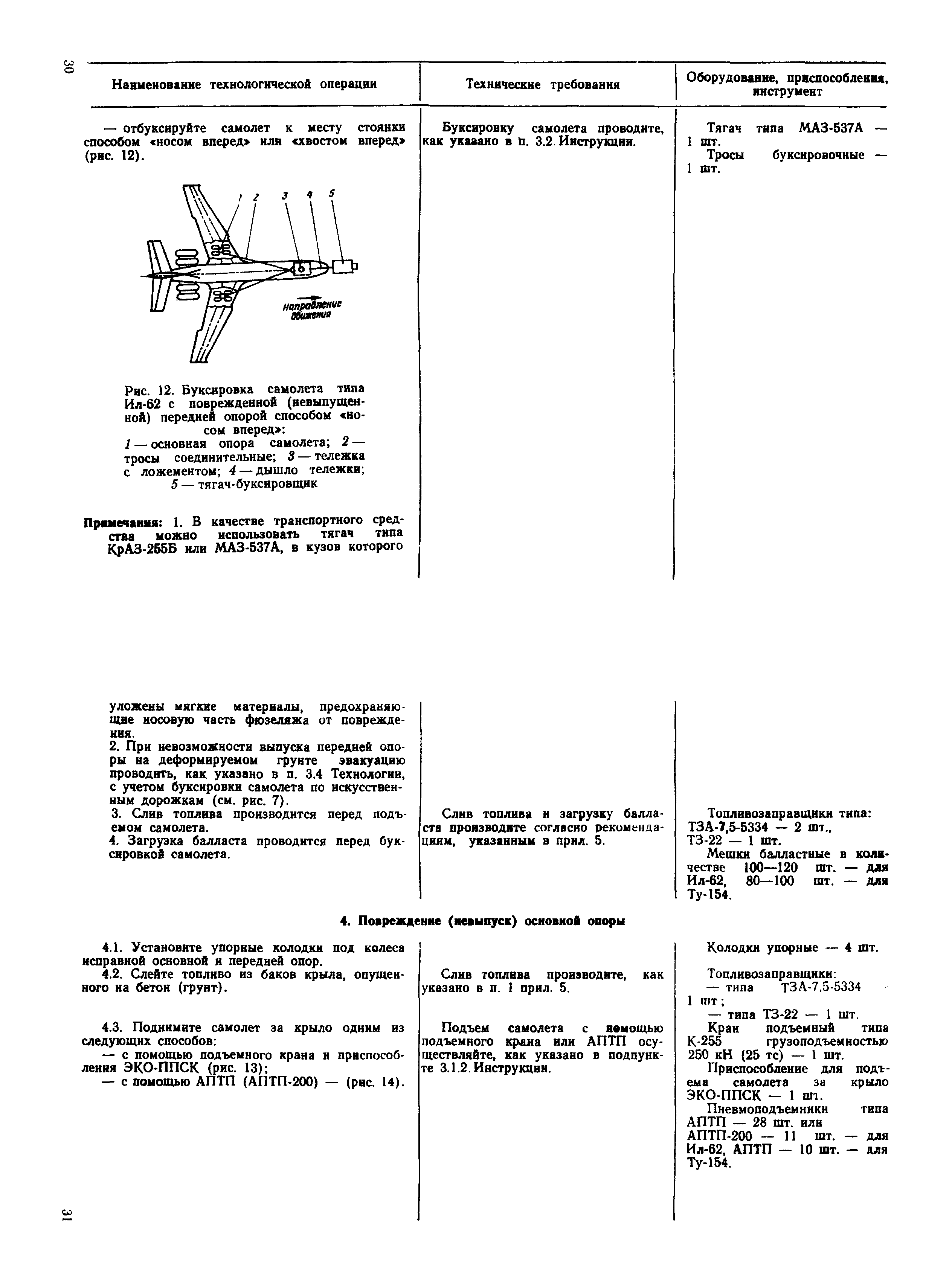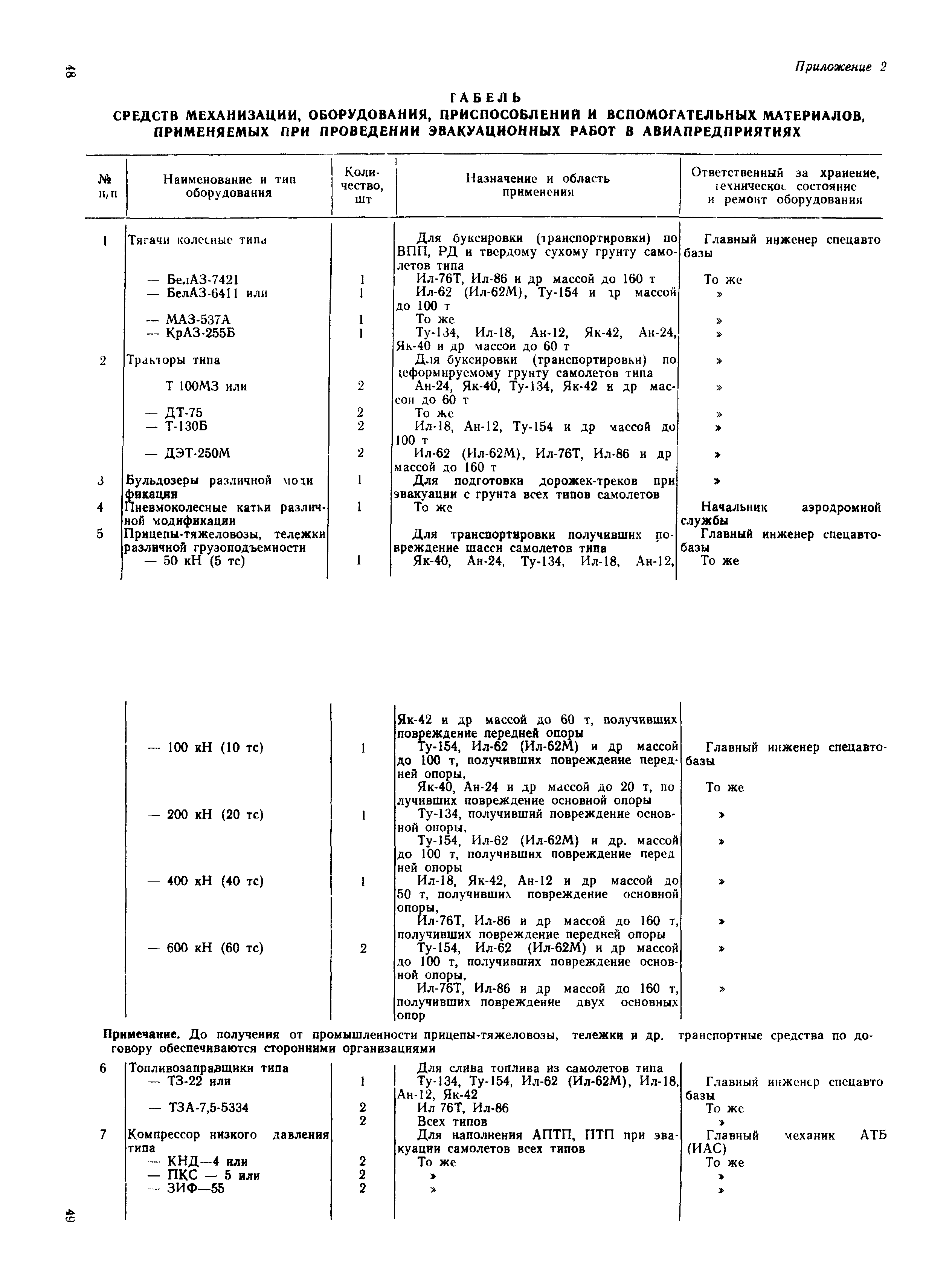| Оглавление: | 1 Общие положения 2 Организация эвакуационных работ в авиапредприятиях 3 Технические средства, применяемые для эвакуации самолетов 3.1. Средства подъема самолетов 3.2. Основные правила буксировки (транспортировки) при проведении эвакуационных работ 3.3. Средства буксировки (транспортировки) самолетов 3.4. Вспомогательные средства, применяемые для эвакуации самолетов 4 Технология эвакуации самолетов с летного поля аэродромов гражданской авиации 4.1. Введение 4.2. Эвакуация самолетов Ил-62, Ту-154 4.3. Эвакуация самолетов типа Ил-18, Ан-12, Ан-24, Ан-26, Ту-134, Ан-28, Ан-30, Як-40, Л-410 и другие 5 Основные требования техники безопасности Приложение 1. Проект уточненных нормативов времени, необходимого для эвакуации самолетов Приложение 2. Табель средств механизации, оборудования, приспособлений и вспомогательных материалов, применяемых при проведении эвакуационных работ в авиапредприятиях Приложение 3. Перечень оборудования, входящего в состав технической аптечки Приложение 4. Краткие технические характеристики средств, применяемых при эвакуации самолетов Приложение 5. Мероприятия, проводимые перед эвакуацией самолетов Приложение 6. Схемы размещения ПТП, АПТП, АПТП-200 под самолетами Приложение 7. Специальные средства для буксировки самолетов по деформируемому грунту |