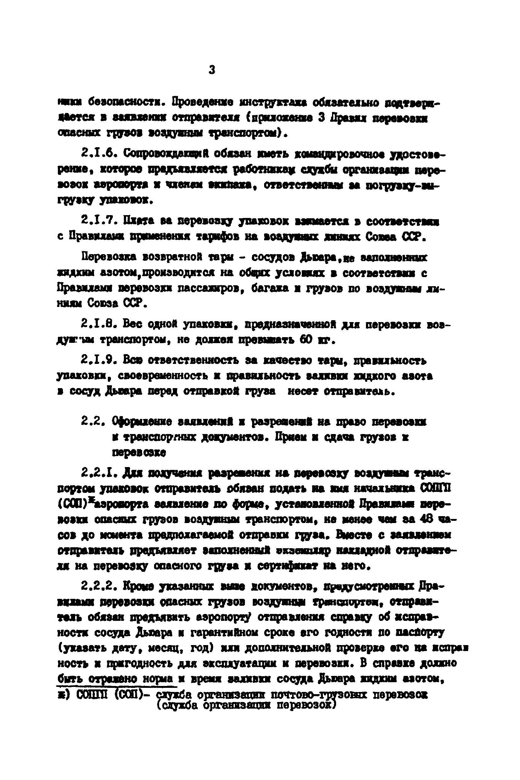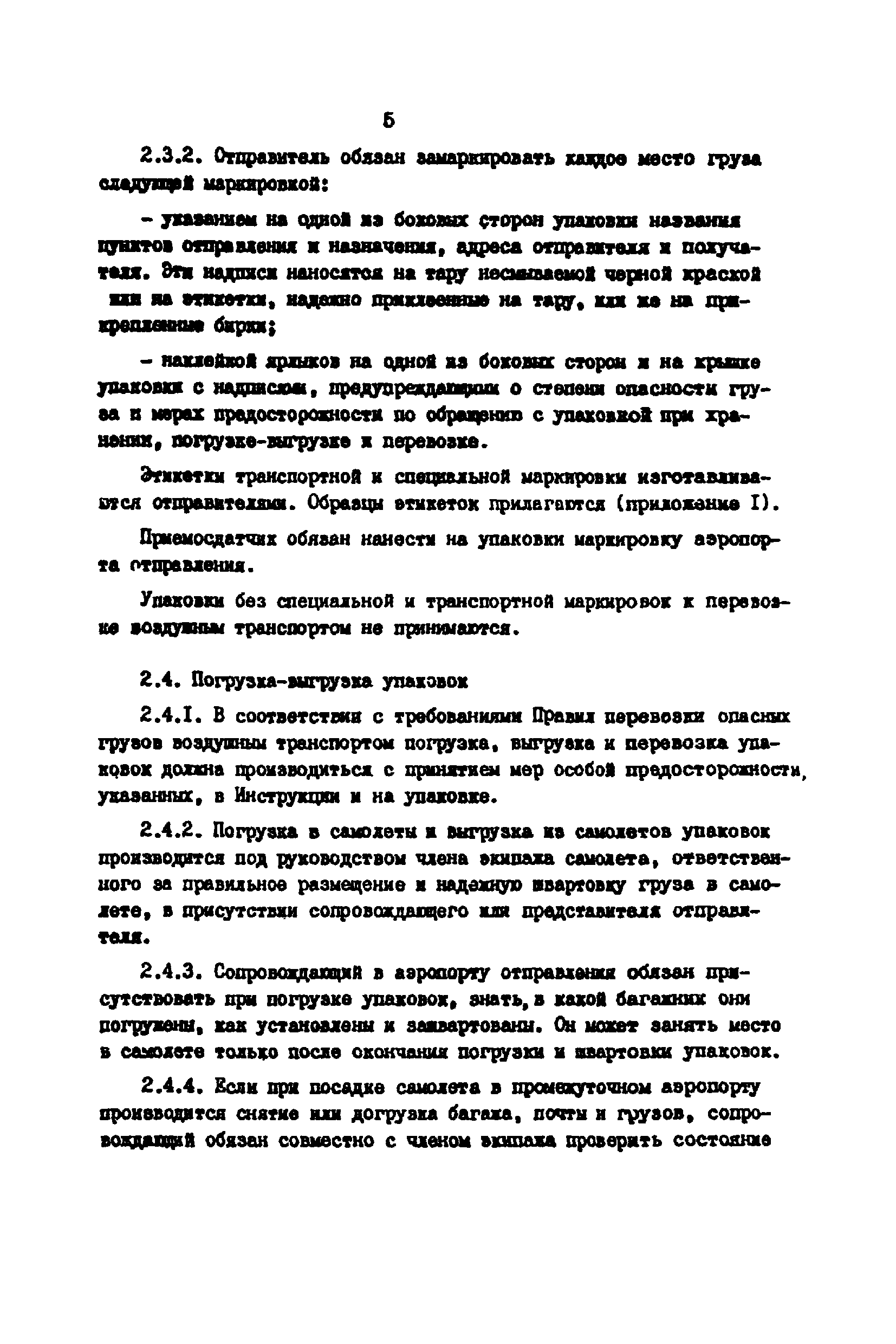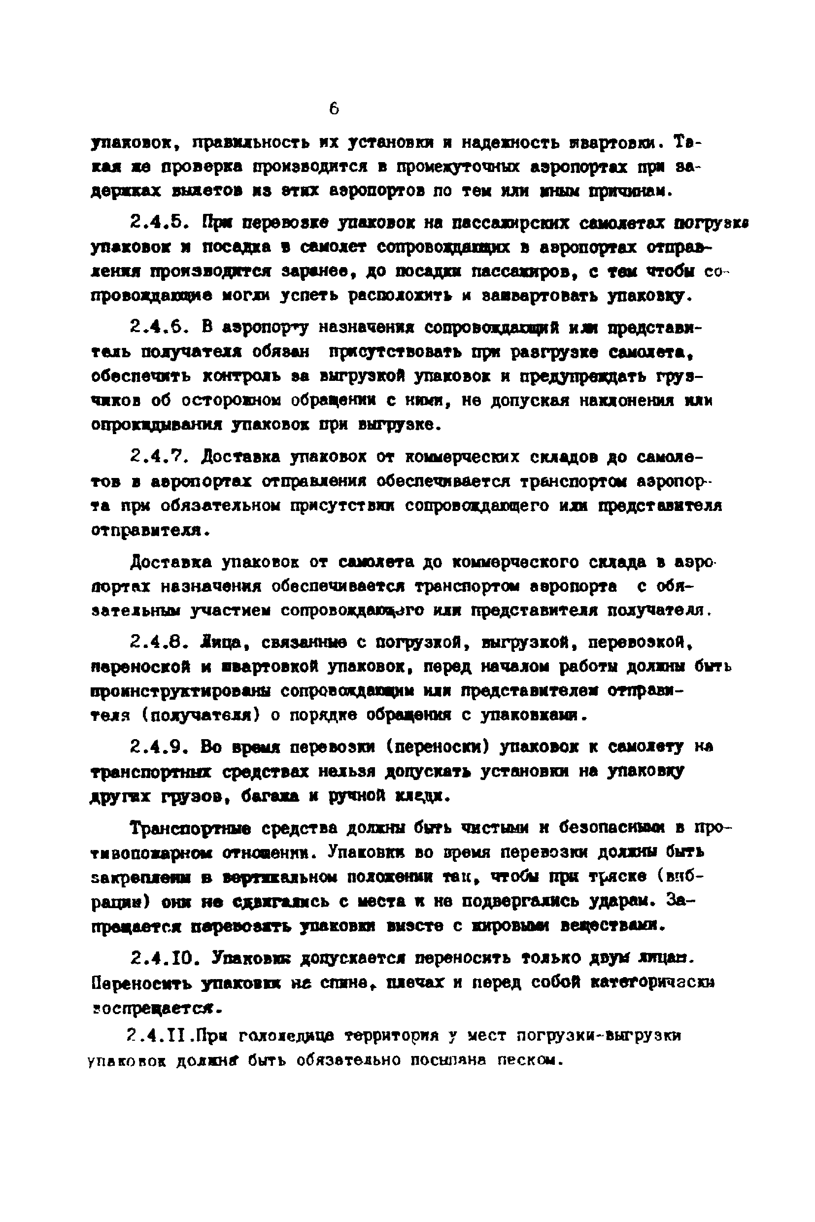 | Оглавление: | 1. Общие положения 2. Условия перевозок упаковок 2.1. Общие условия 2.2. Оформление заявлений и разрешений на право перевозки и транспортных документов. Прием и сдача грузов к перевозке 2.3. Маркировка упаковок 2.4. Погрузка-выгрузка упаковок 2.5. Правила размещения и швартовки упаковок в самолетах 2.6. Мероприятия при задержках в доставке упаковок 2.7. Временное хранение упаковок 3. Особенности перевозки воздушным транспортом отдельных упаковок грузов в сосудах Дьюара, заполненных жидким азотом 3.1. Перевозка полупроводниковых детекторов (ППД) и блоков детектирования (БД) ионизирующих излучений 3.2. Перевозка семени сельскохозяйственных животных и вакцины против болезни Марека птиц 4. Правила техники безопасности при перевозке и временном хранении упаковок 5. Ответственность сторон при перевозке упаковок Приложение 1. Образцы этикеток транспортной и специальной маркировки упаковок Приложение 2. Технические характеристики сосудов Дьюара, заполненных жидким азотом, для перевозки грузов воздушным транспортом Приложение 3. Схема сосуда Дьюара для перевозки ППД и БД |
