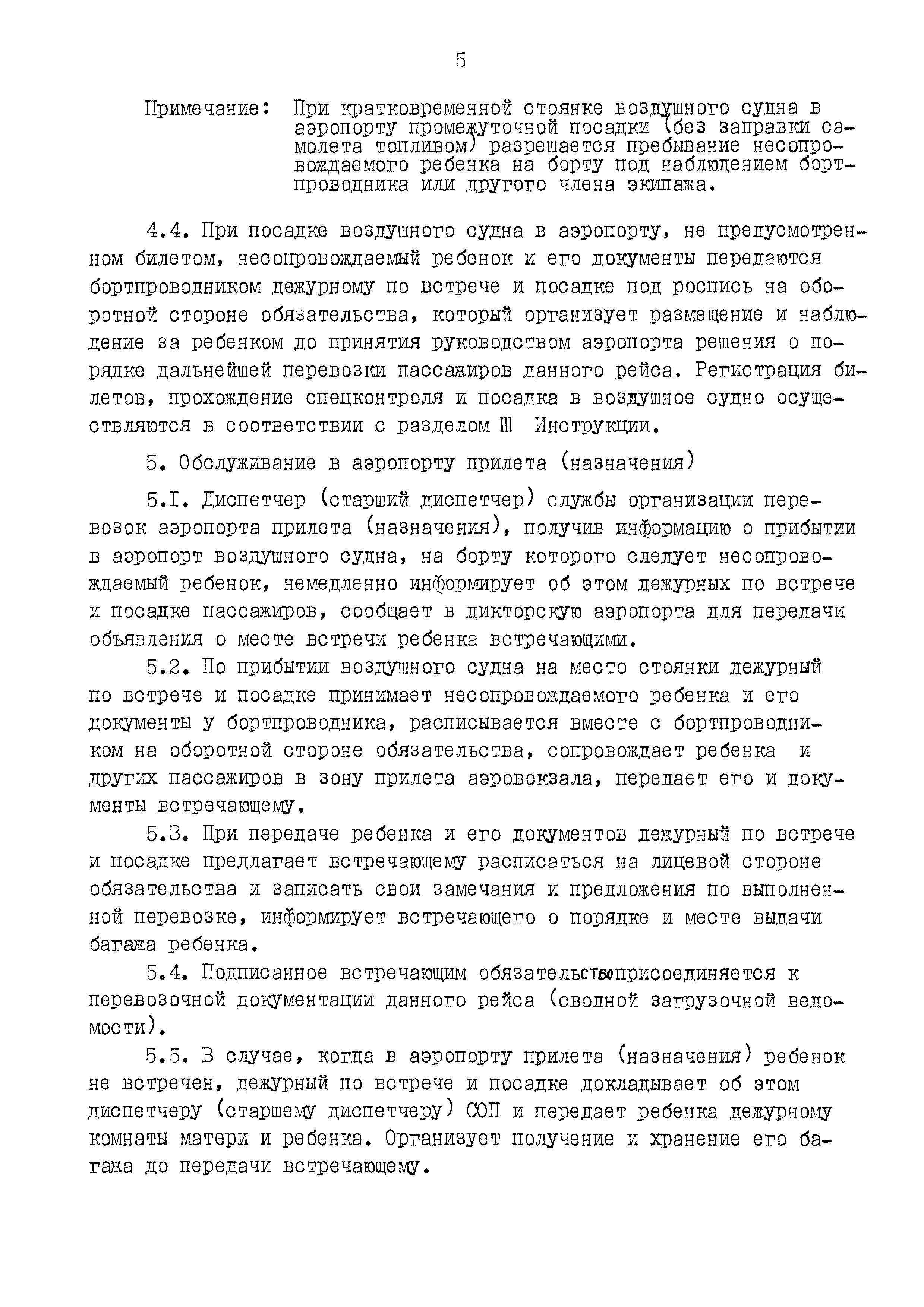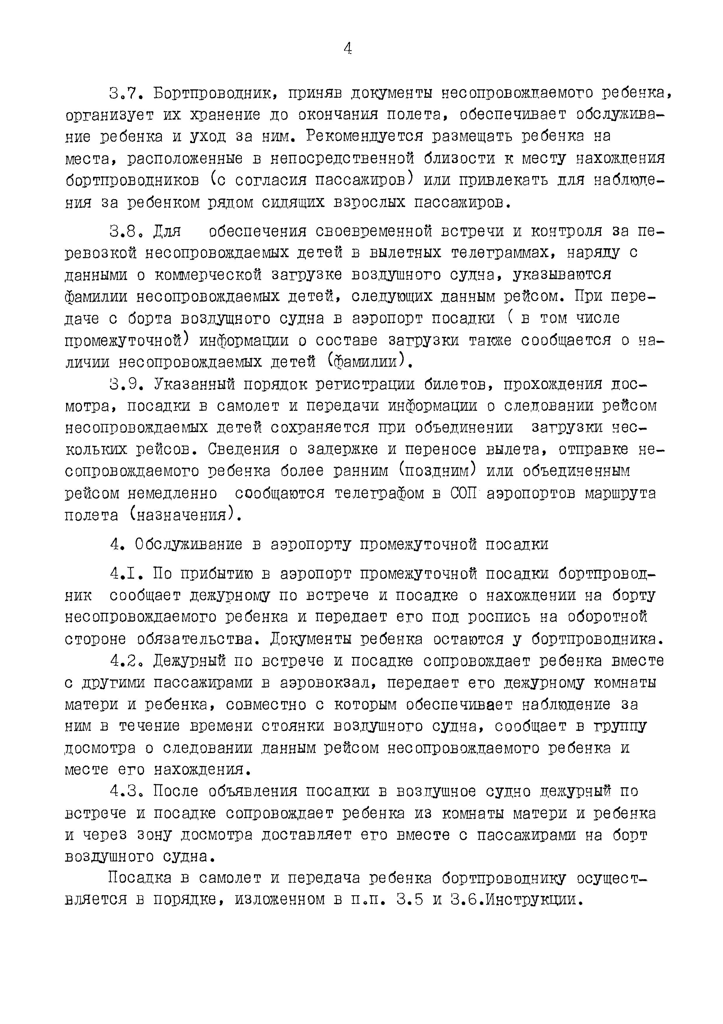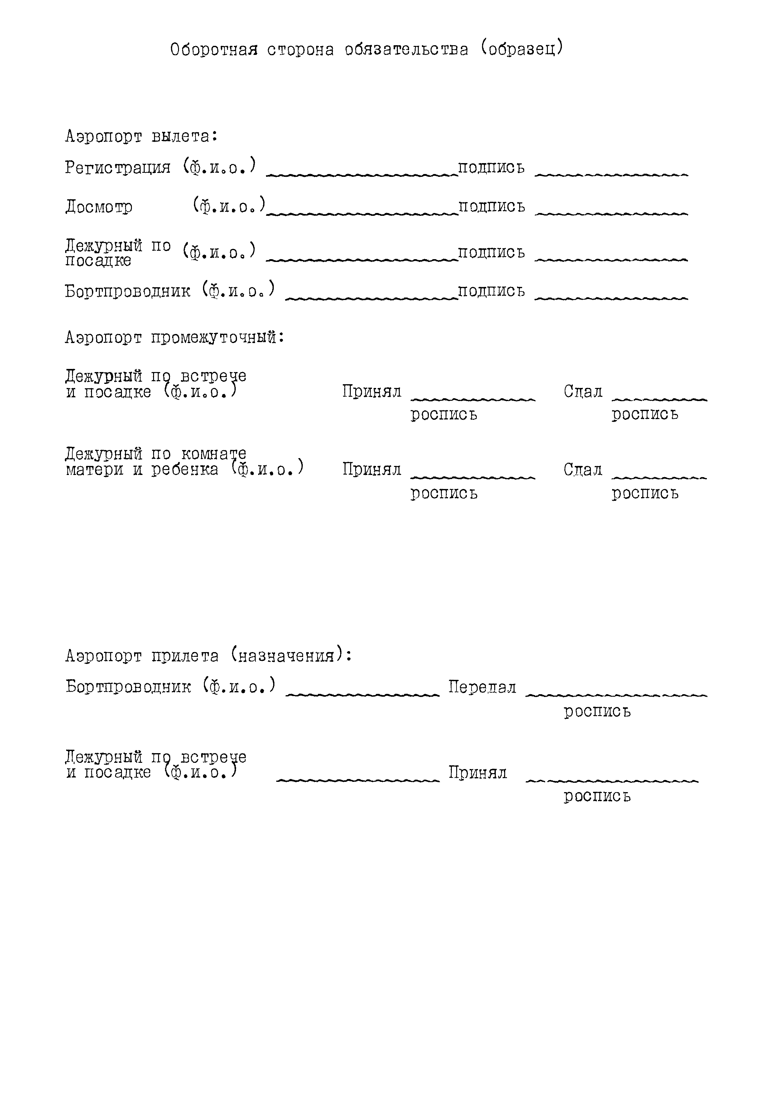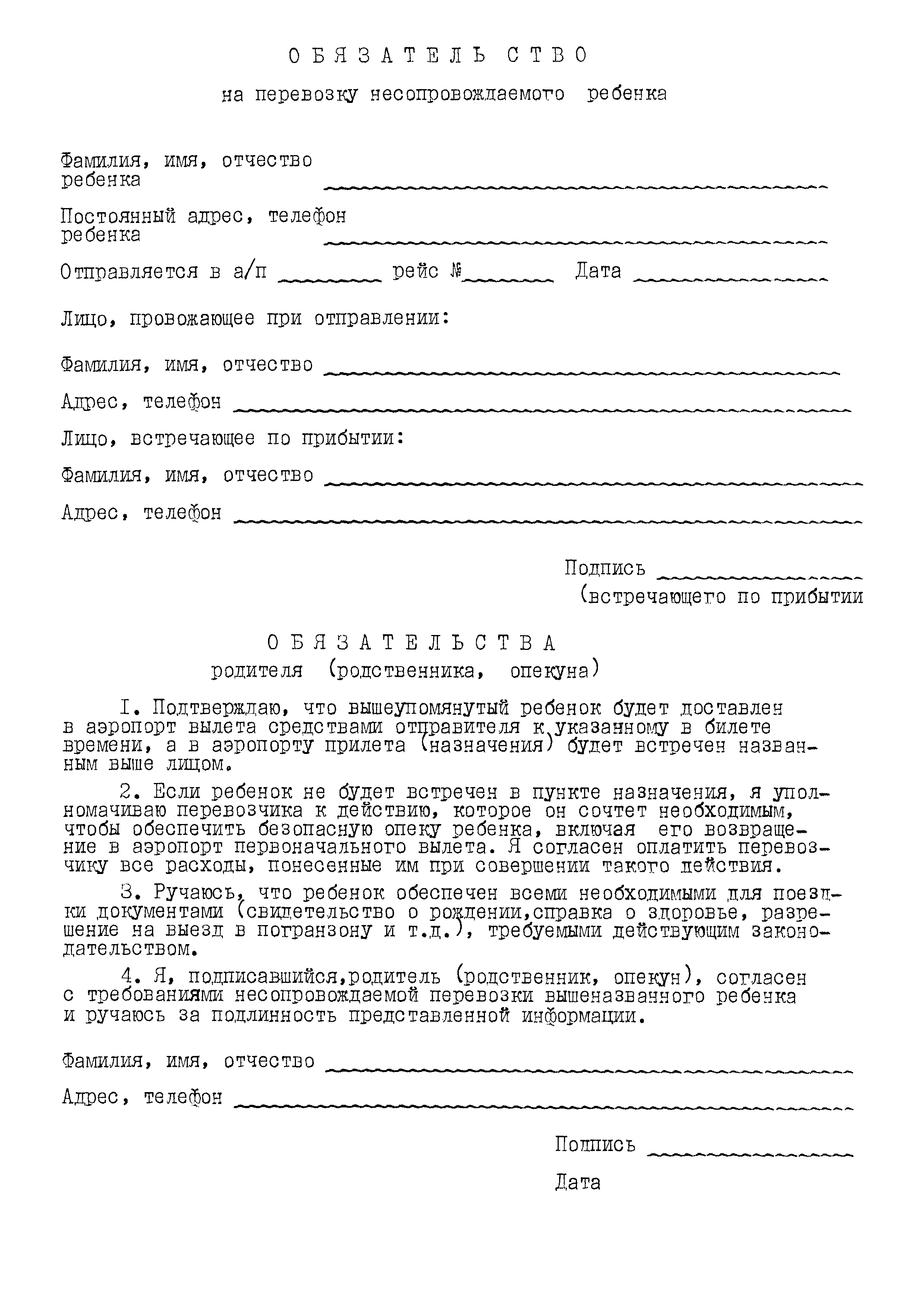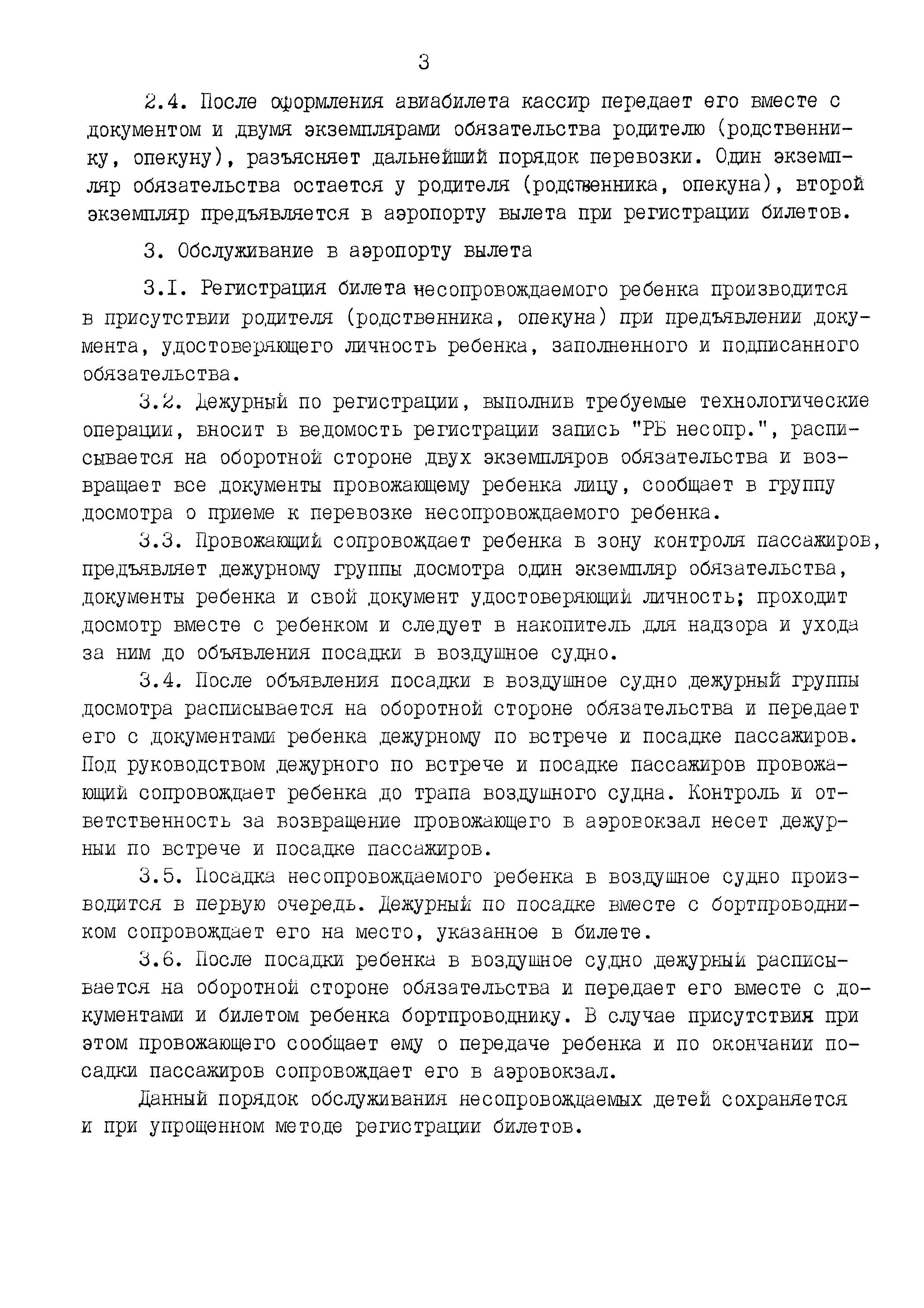 | Оглавление: | 1. Общие положения 2. Обслуживание в агентстве воздушных сообщений 3. Обслуживание в аэропорту вылета 4. Обслуживание в аэропорту промежуточной посадки 5. Обслуживание в аэропорту прилета (назначения) Обязательство на перевозку несопровождаемого ребенка Обязательства родителя (родственника, опекуна) Оборотная сторона обязательства (образец) |