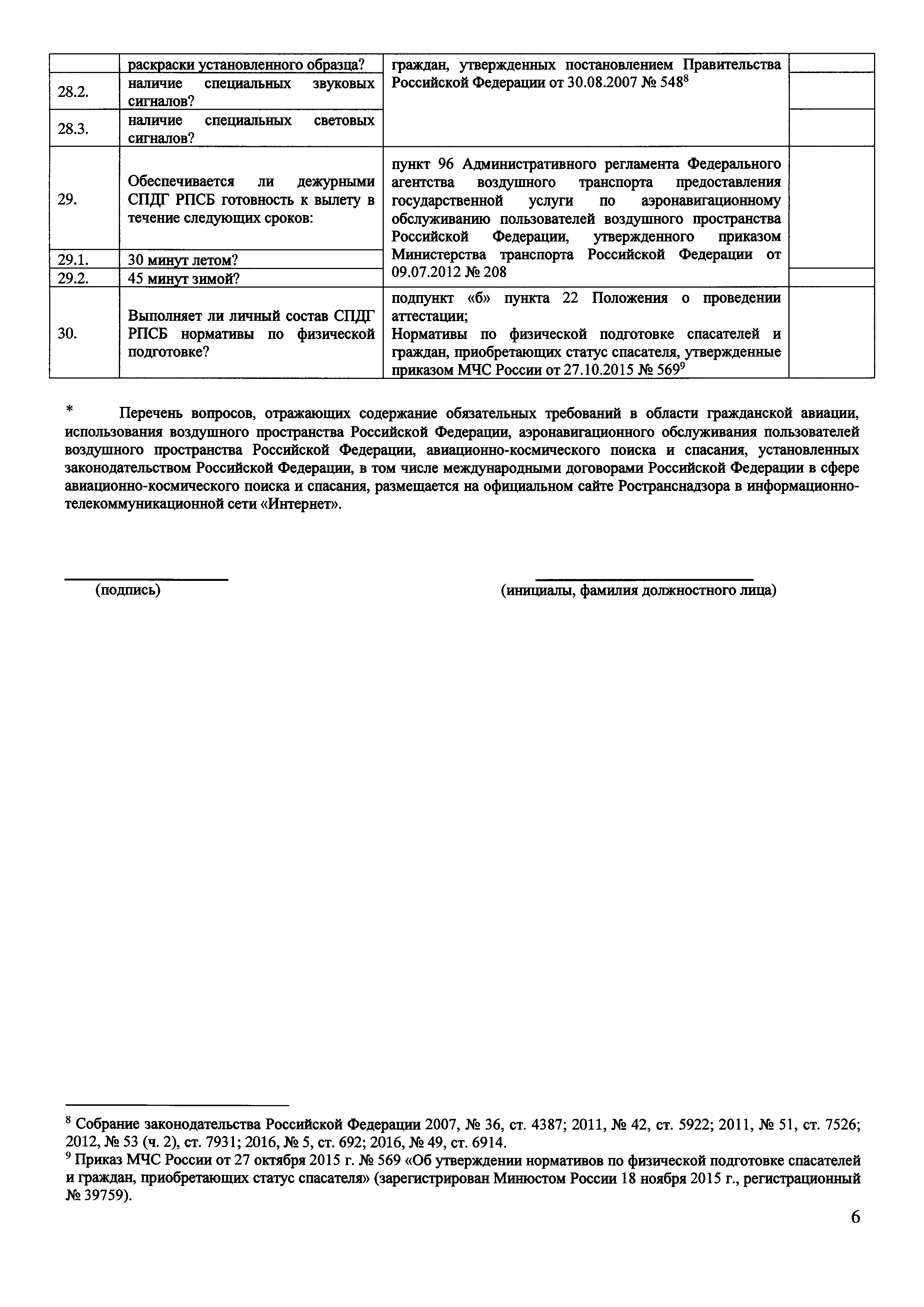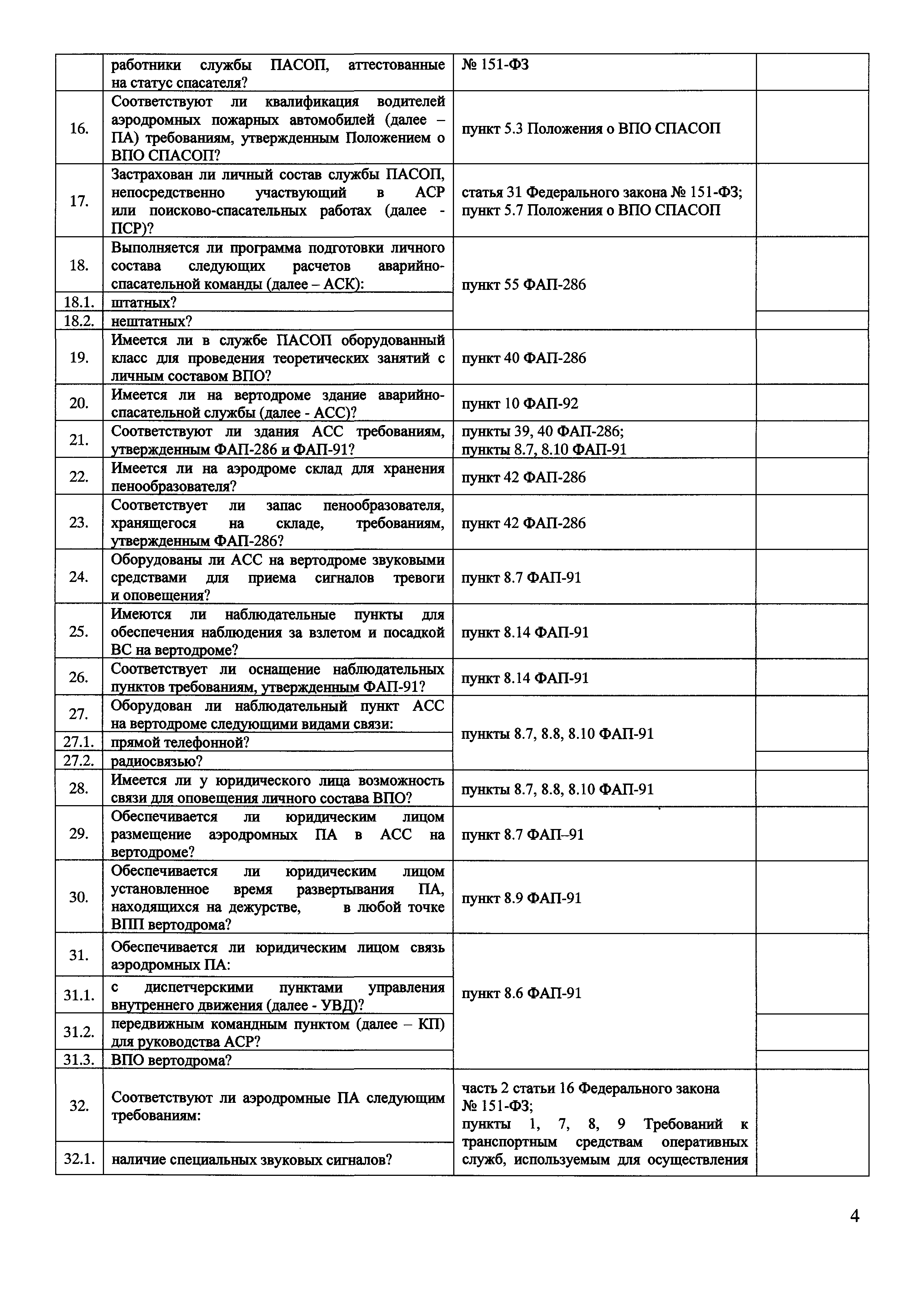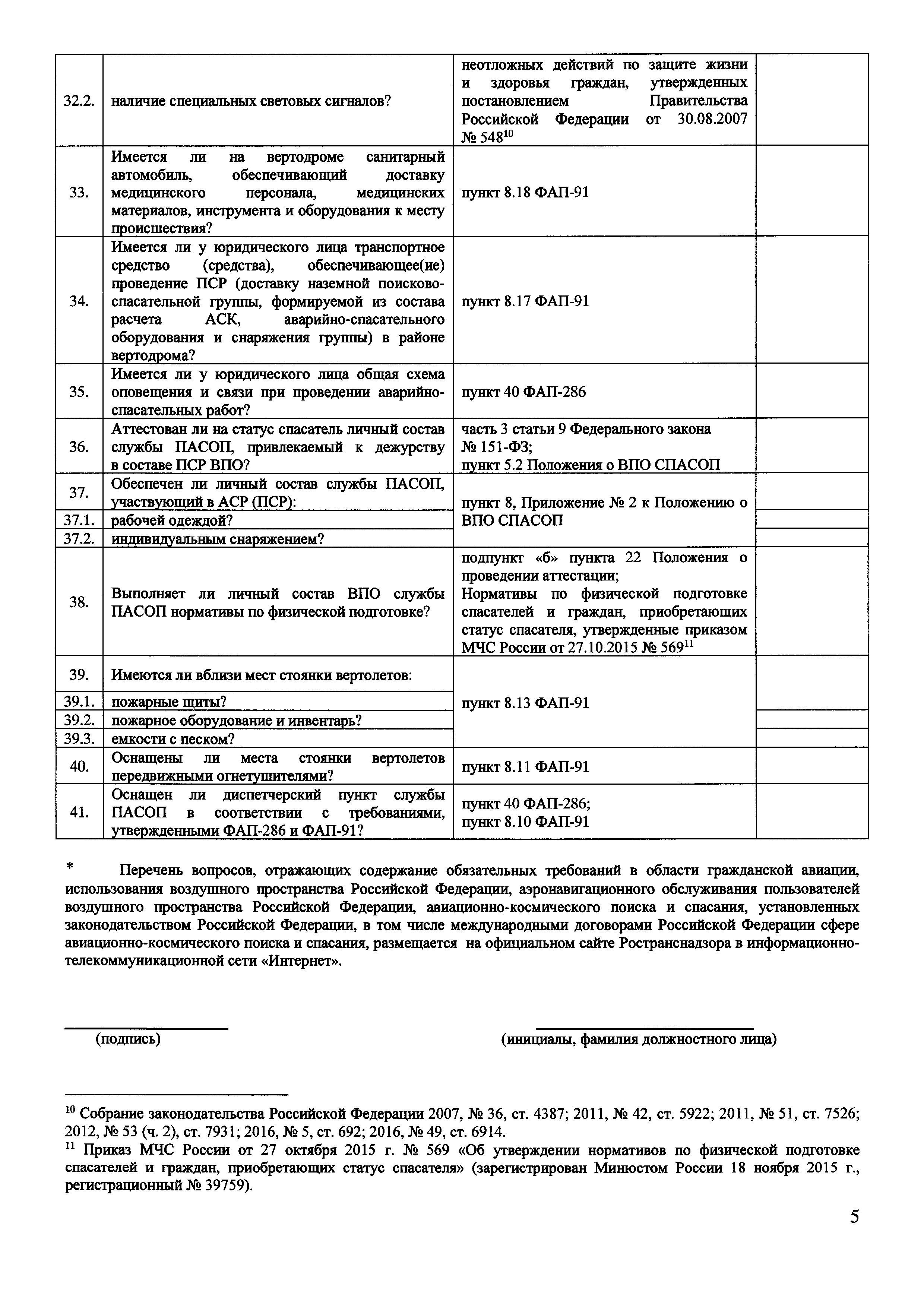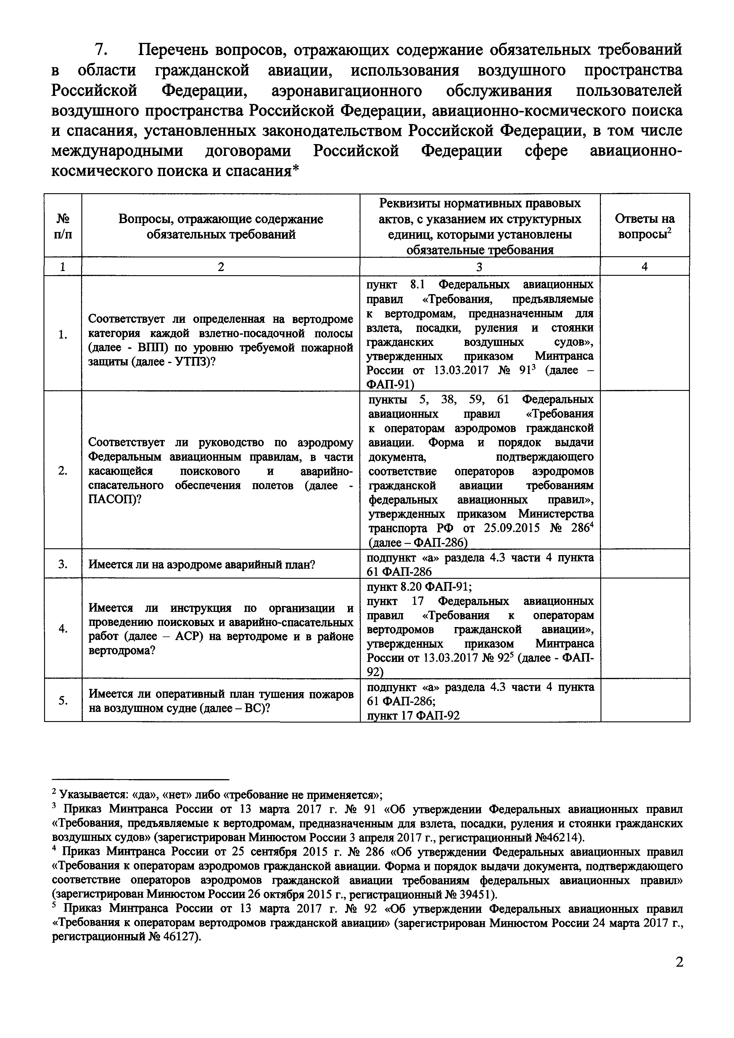 | Оглавление: | Приложение № 1. Форма проверочного листа (списка контрольных вопросов), применяемую при осуществлении федерального государственного транспортного надзора в области гражданской авиации в отношении юридических лиц, организующих поисково-спасательное обеспечение полетов гражданской авиации на территории Российской Федерации (Авиационный поисково-спасательный центр) Приложение № 2 Форма проверочного листа (списка контрольных вопросов), применяемую при осуществлении федерального государственного транспортного надзора в области гражданской авиации в отношении юридических лиц, осуществляющих поисково-спасательное обеспечение полетов гражданской авиации на территории Российской Федерации (Региональная поисково-спасательная база) Приложение № 3. Форма проверочного листа (списка контрольных вопросов), применяемую при осуществлении федерального государственного транспортного надзора в области гражданской авиации в отношении юридических лиц, осуществляющих аэропортовую деятельность и организующих поисковое и аварийно-спасательное обеспечение полетов гражданской авиации на аэродромах (вертодромах) (Служба поискового и аварийно-спасательное обеспечение полетов гражданской авиации) |