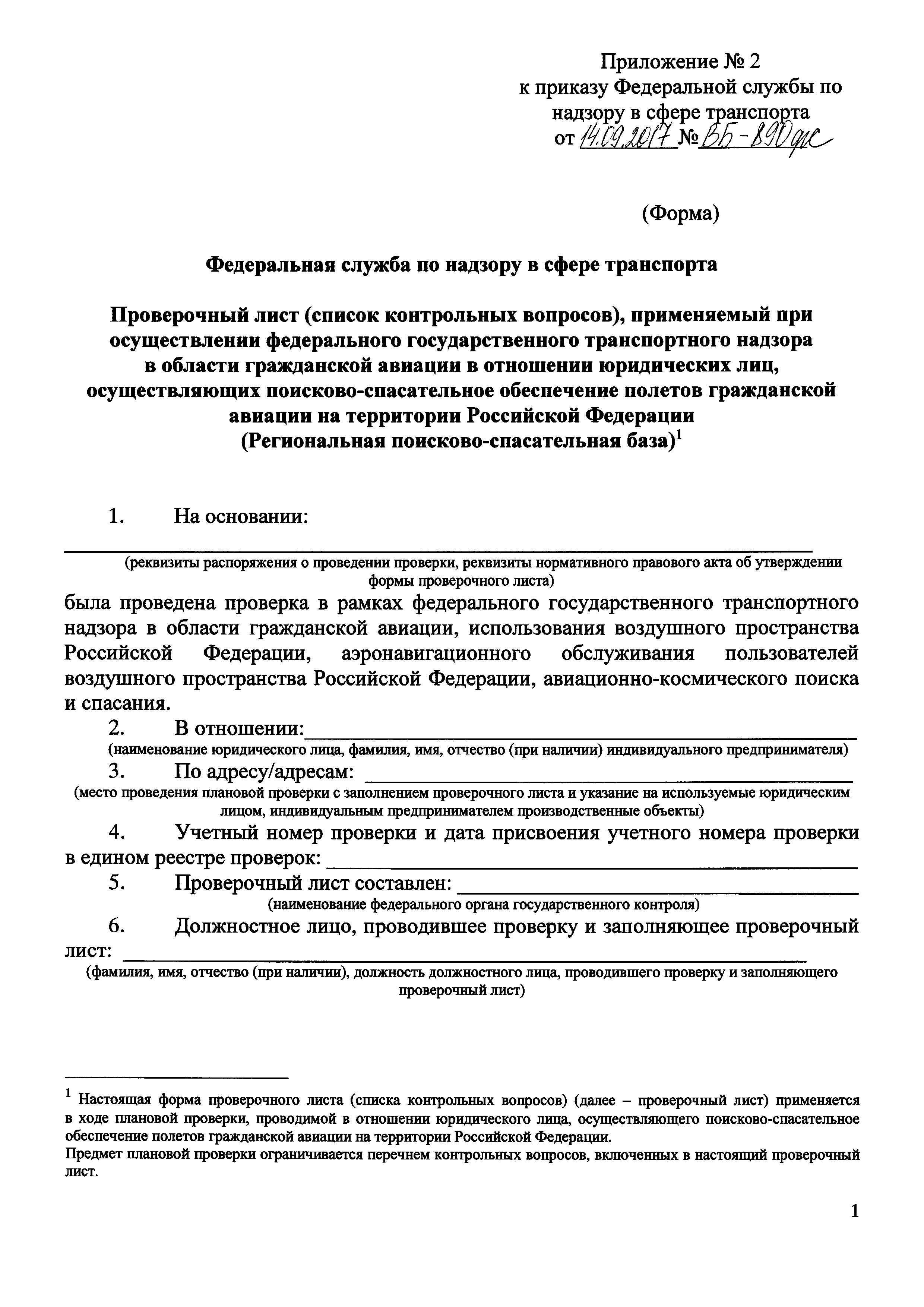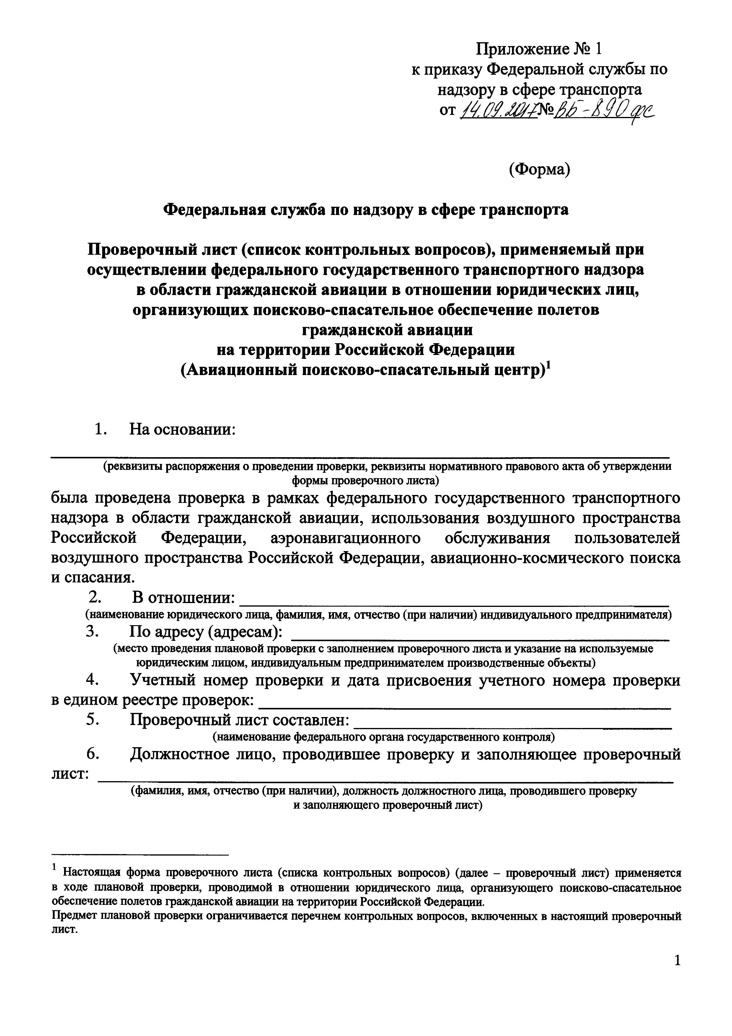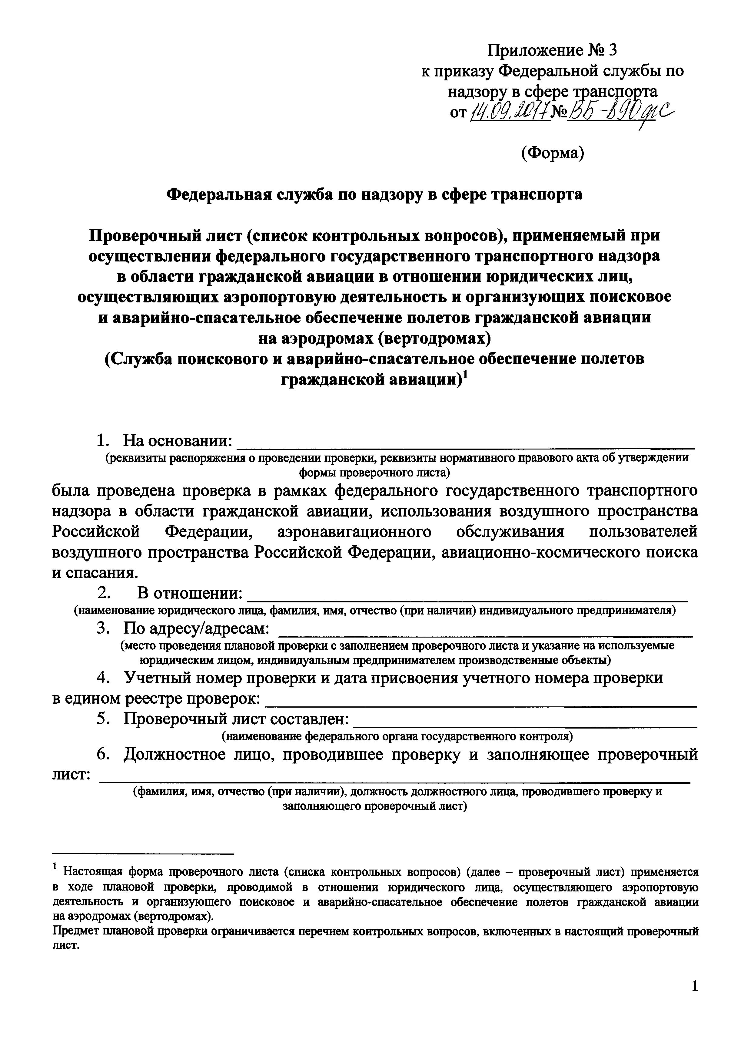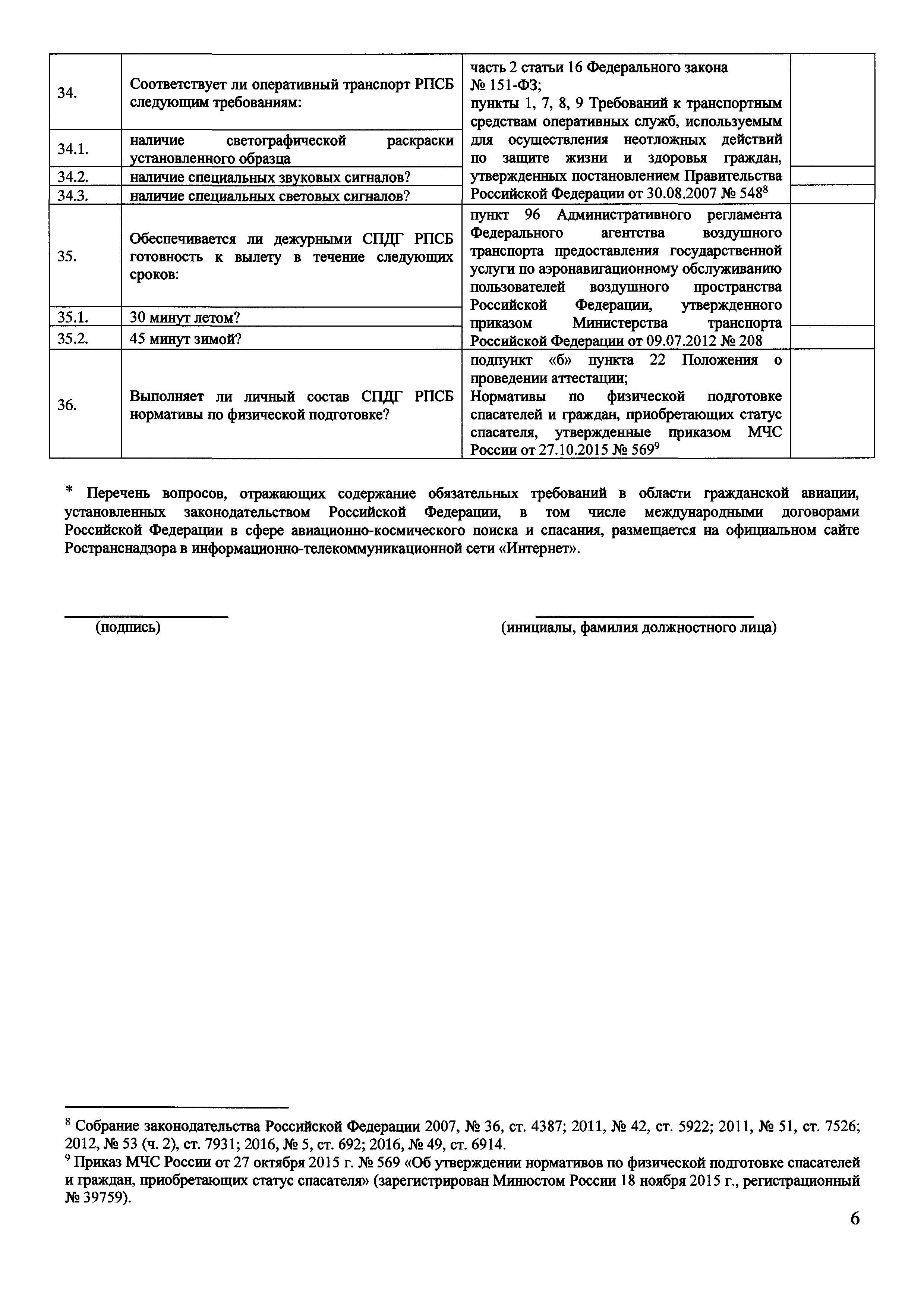 | Оглавление: | Приложение № 1. Форма проверочного листа (списка контрольных вопросов), применяемую при осуществлении федерального государственного транспортного надзора в области гражданской авиации в отношении юридических лиц, организующих поисково-спасательное обеспечение полетов гражданской авиации на территории Российской Федерации (Авиационный поисково-спасательный центр) Приложение № 2 Форма проверочного листа (списка контрольных вопросов), применяемую при осуществлении федерального государственного транспортного надзора в области гражданской авиации в отношении юридических лиц, осуществляющих поисково-спасательное обеспечение полетов гражданской авиации на территории Российской Федерации (Региональная поисково-спасательная база) Приложение № 3. Форма проверочного листа (списка контрольных вопросов), применяемую при осуществлении федерального государственного транспортного надзора в области гражданской авиации в отношении юридических лиц, осуществляющих аэропортовую деятельность и организующих поисковое и аварийно-спасательное обеспечение полетов гражданской авиации на аэродромах (вертодромах) (Служба поискового и аварийно-спасательное обеспечение полетов гражданской авиации) |