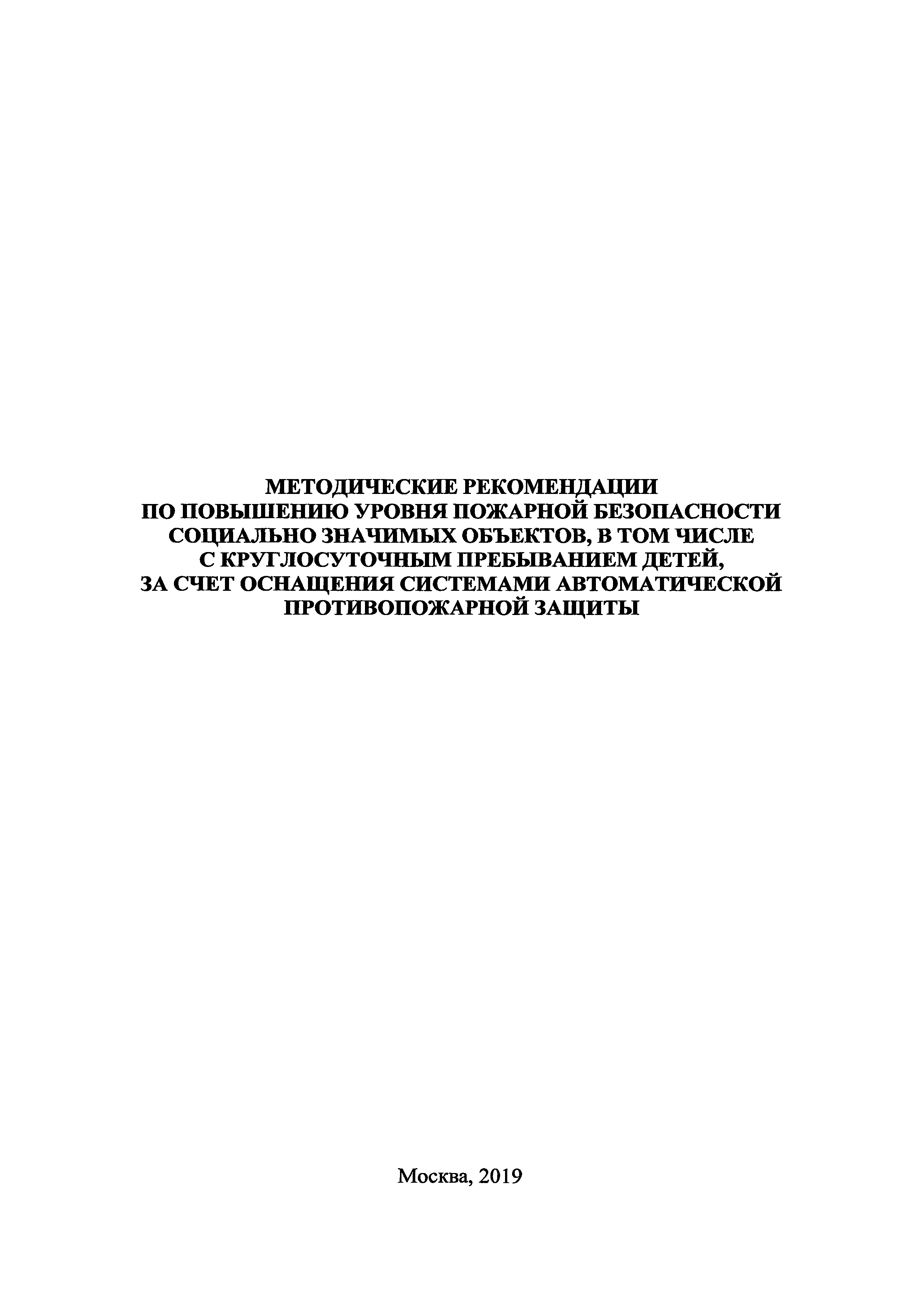 | Название рус.: | Методические рекомендации по повышению уровня пожарной безопасности социально значимых объектов, в том числе с круглосуточным пребыванием детей, за счет оснащения системами автоматической противопожарной защиты |