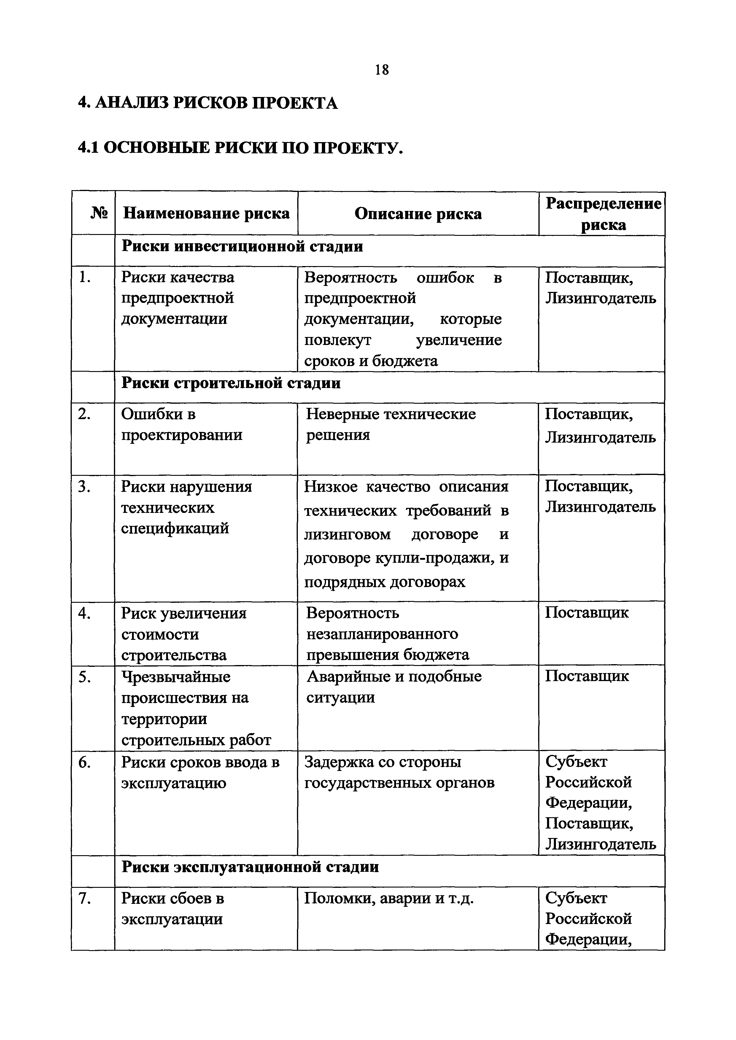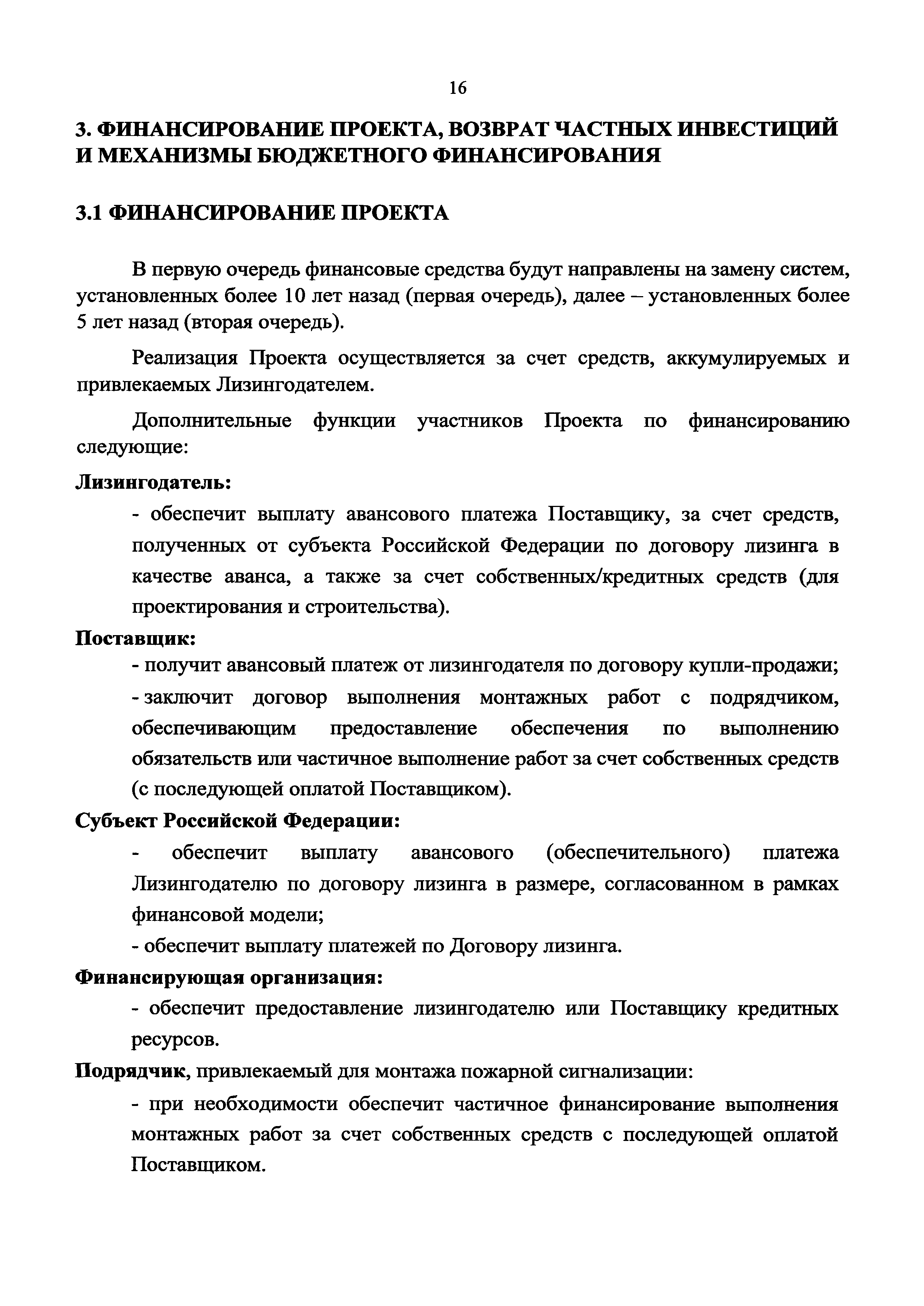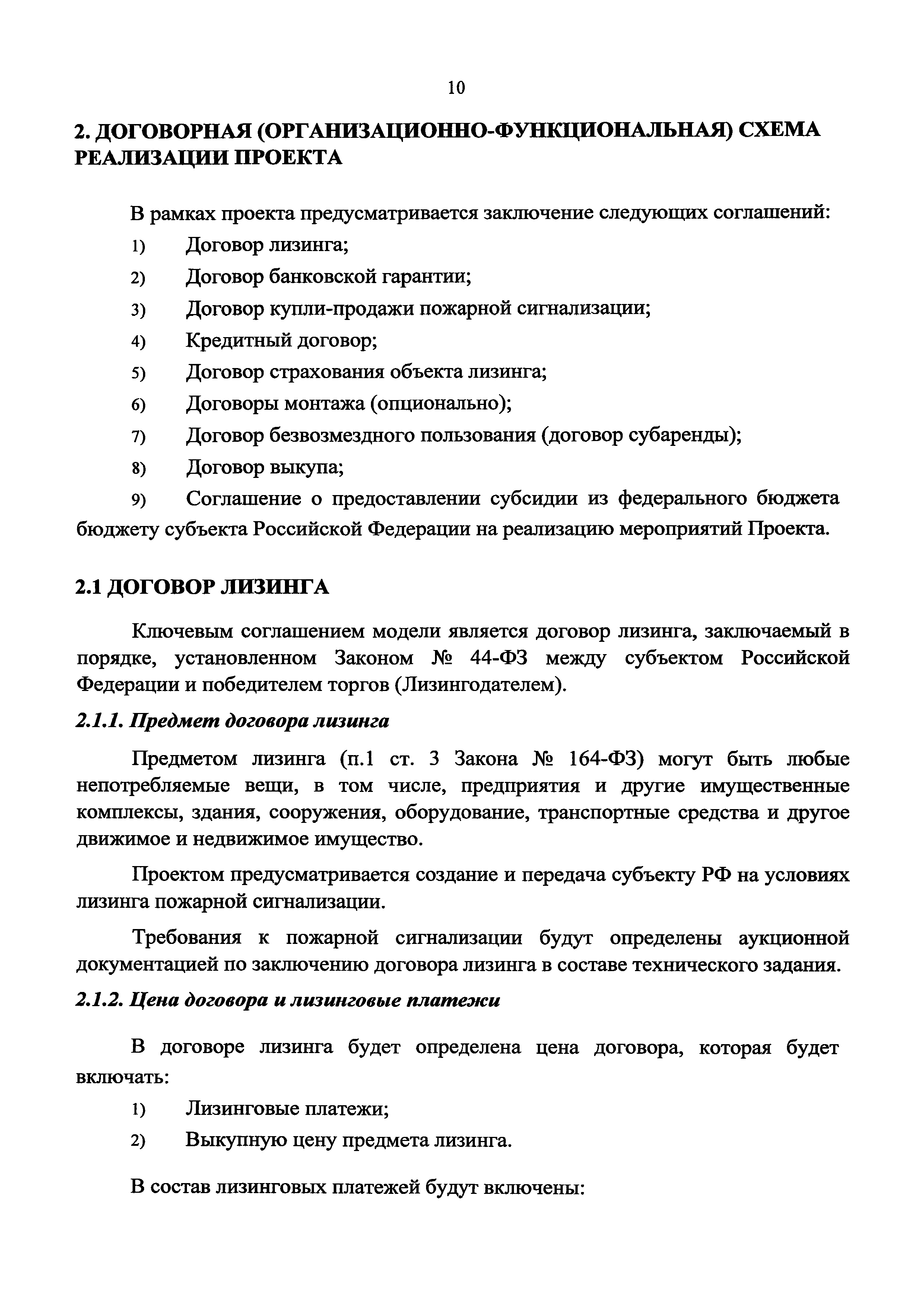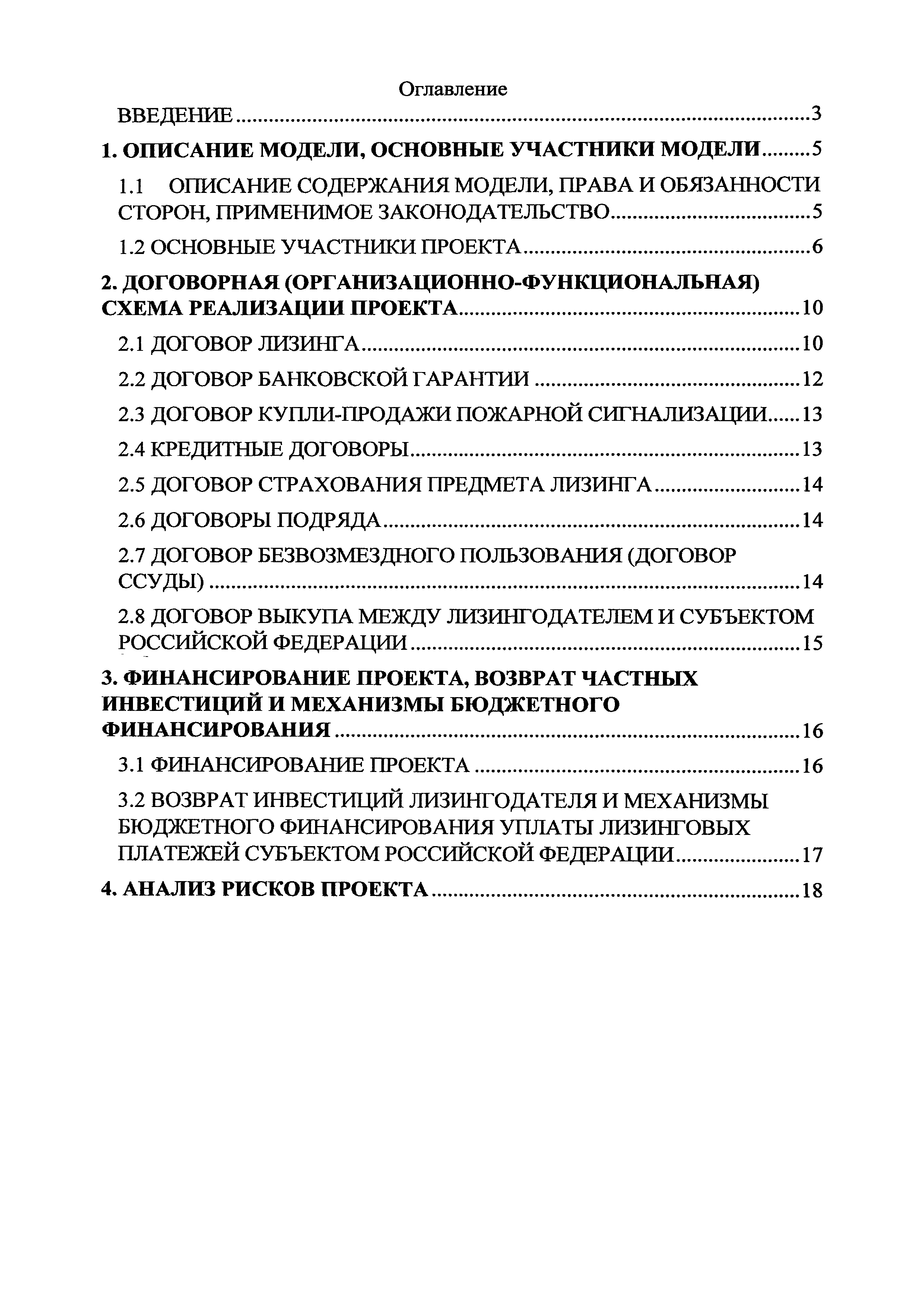 | Оглавление: | Введение 1 Описание модели, основные участники модели 1.1 Описание содержания модели, права и обязанности сторон, применимое законодательство 1.2 Основные участники проекта 2 Договорная (организационно-функциональная) схема реализации проекта 2.1 Договор лизинга 2.2 Договор банковской гарантии 2.3 Договор купли-продажи пожарной сигнализации 2.4 Кредитные договоры 2.5 Договор страхования предмета лизинга 2.6 Договоры подряда 2.7 Договор безвозмездного пользования (договор ссуды) 2.8 Договор выкупа между лизингодателем и субъектом Российской Федерации 3 Финансирование проекта, возврат частных инвестиций и механизмы бюджетного финансирования 3.1 Финансирование проекта 3.2 Возврат инвестиций лизингодателя и механизмы бюджетного финансирования уплаты лизинговых платежей субъектом Российской Федерации 4 Анализ рисков проекта |