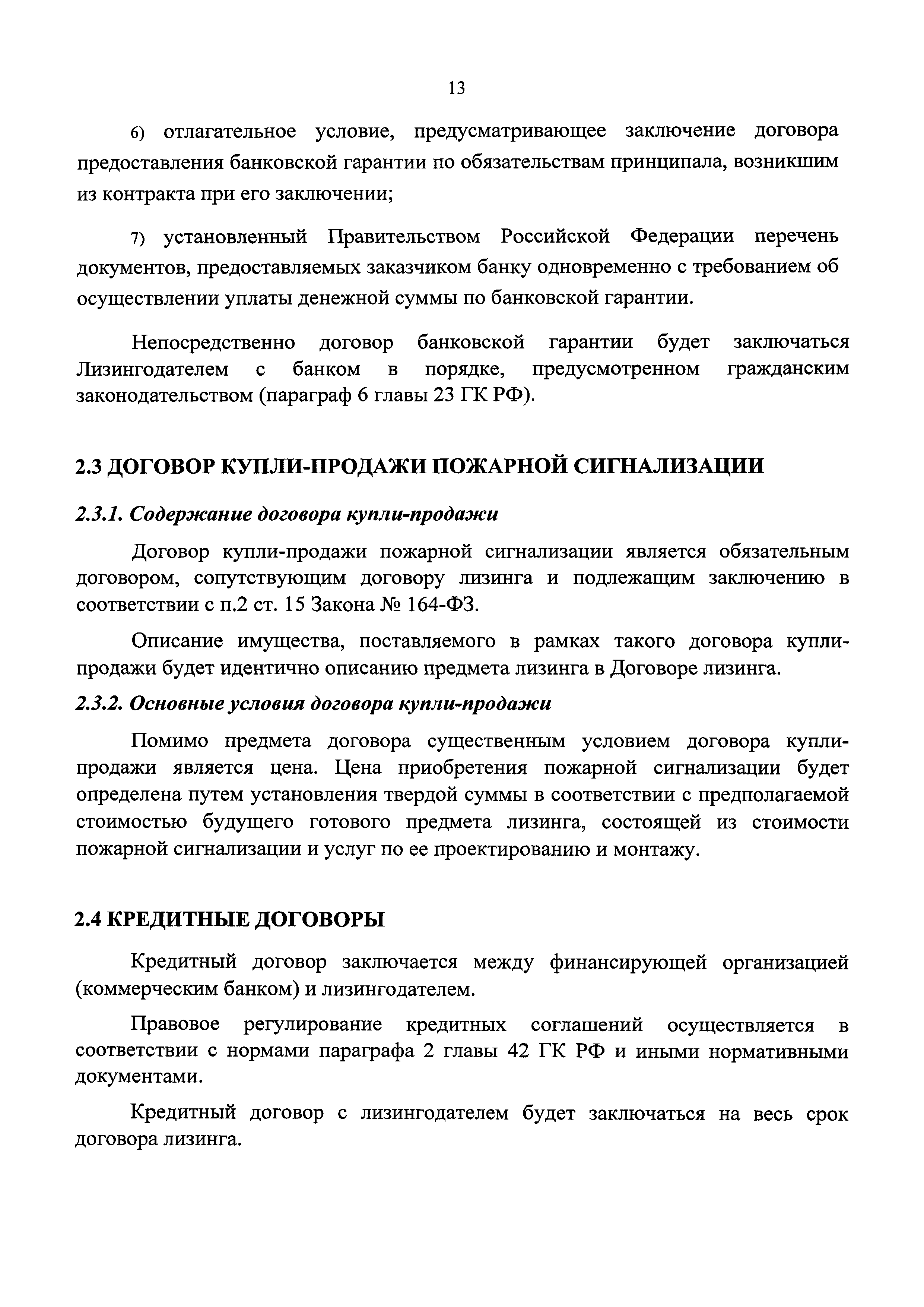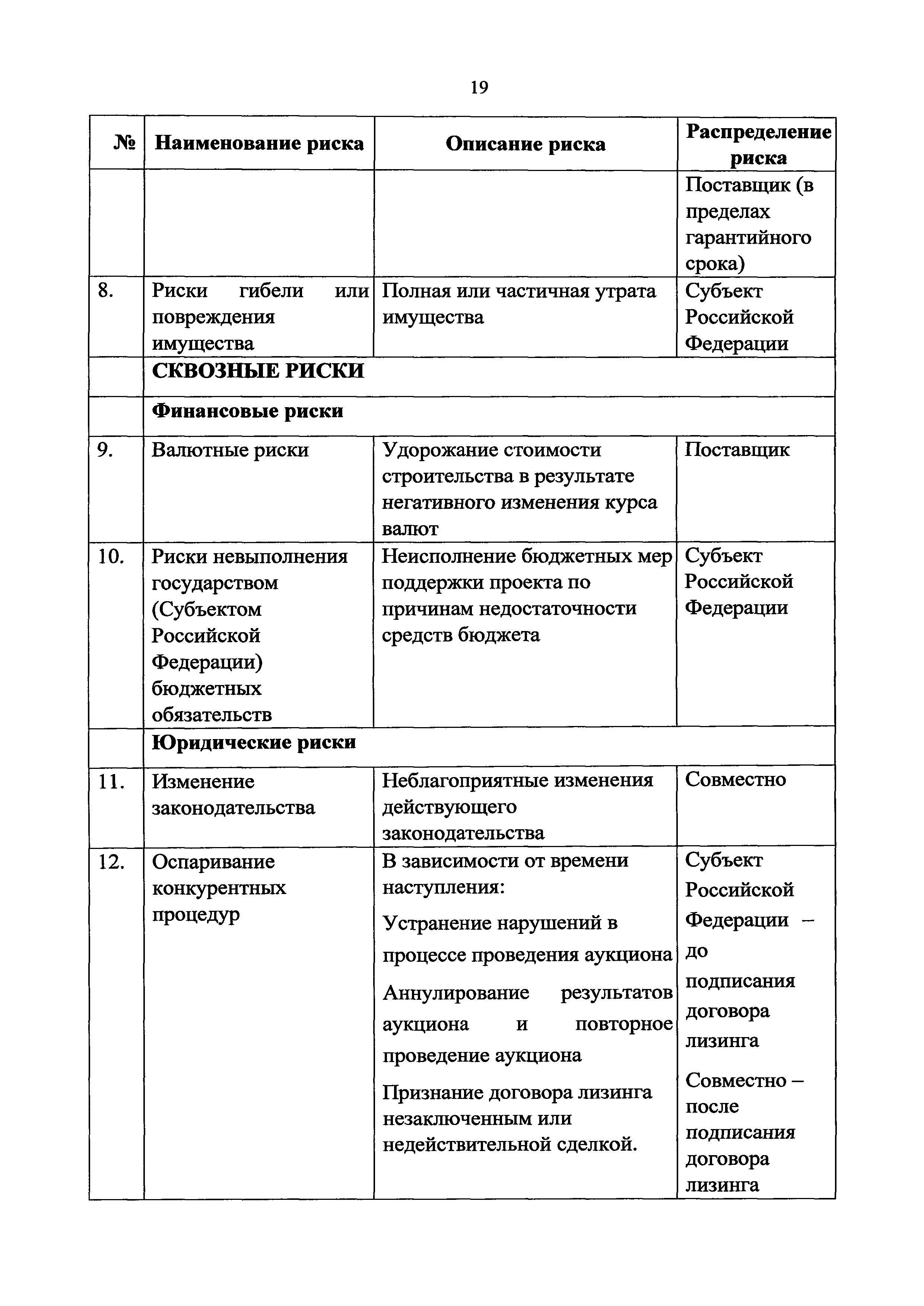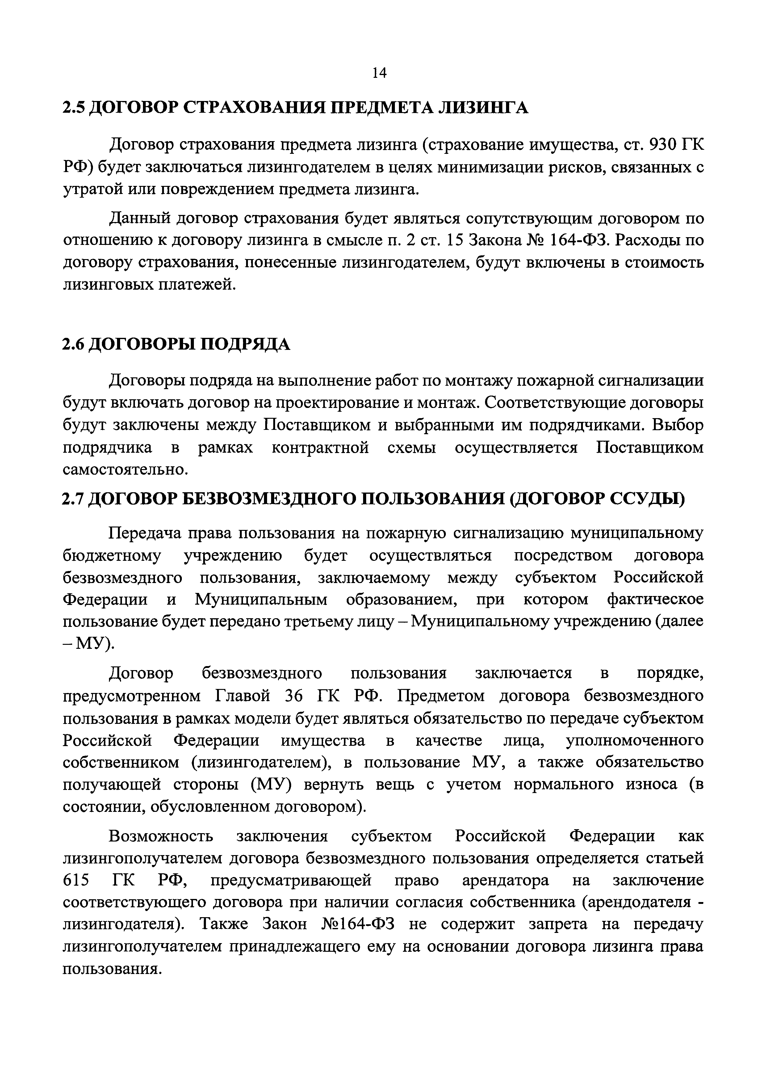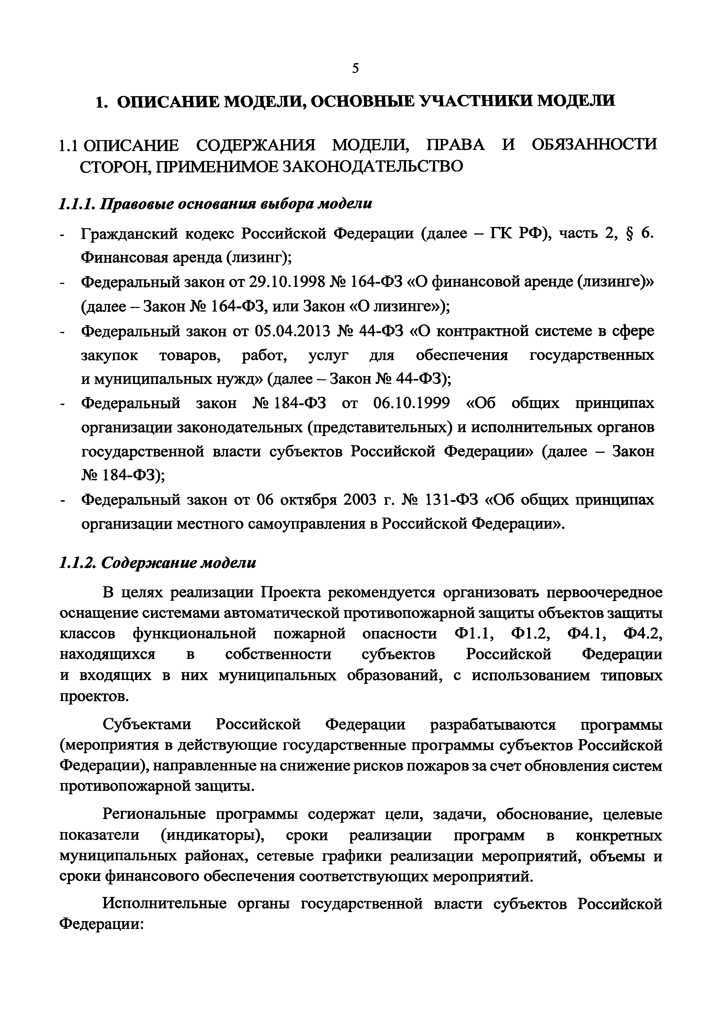 | Оглавление: | Введение 1 Описание модели, основные участники модели 1.1 Описание содержания модели, права и обязанности сторон, применимое законодательство 1.2 Основные участники проекта 2 Договорная (организационно-функциональная) схема реализации проекта 2.1 Договор лизинга 2.2 Договор банковской гарантии 2.3 Договор купли-продажи пожарной сигнализации 2.4 Кредитные договоры 2.5 Договор страхования предмета лизинга 2.6 Договоры подряда 2.7 Договор безвозмездного пользования (договор ссуды) 2.8 Договор выкупа между лизингодателем и субъектом Российской Федерации 3 Финансирование проекта, возврат частных инвестиций и механизмы бюджетного финансирования 3.1 Финансирование проекта 3.2 Возврат инвестиций лизингодателя и механизмы бюджетного финансирования уплаты лизинговых платежей субъектом Российской Федерации 4 Анализ рисков проекта |