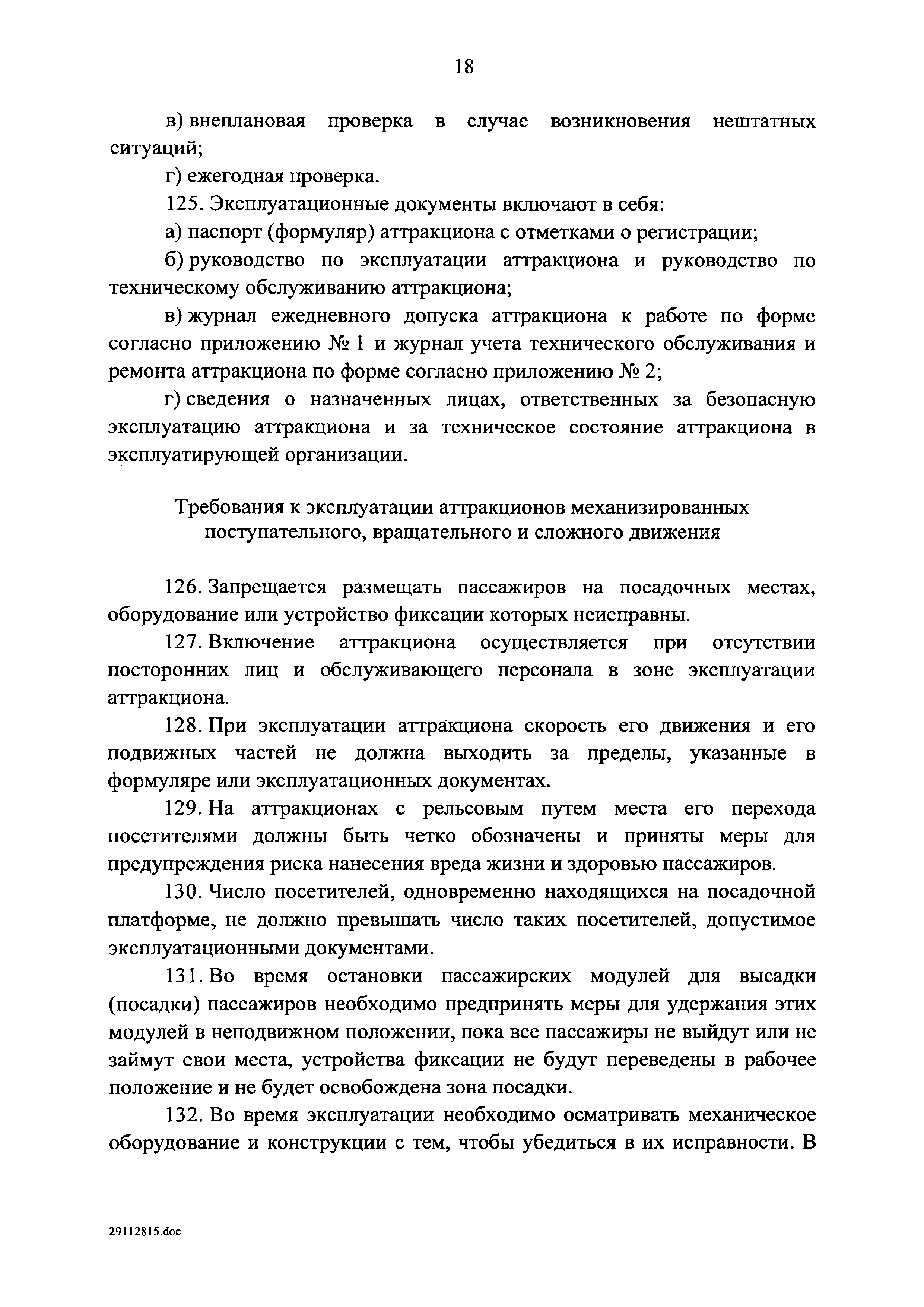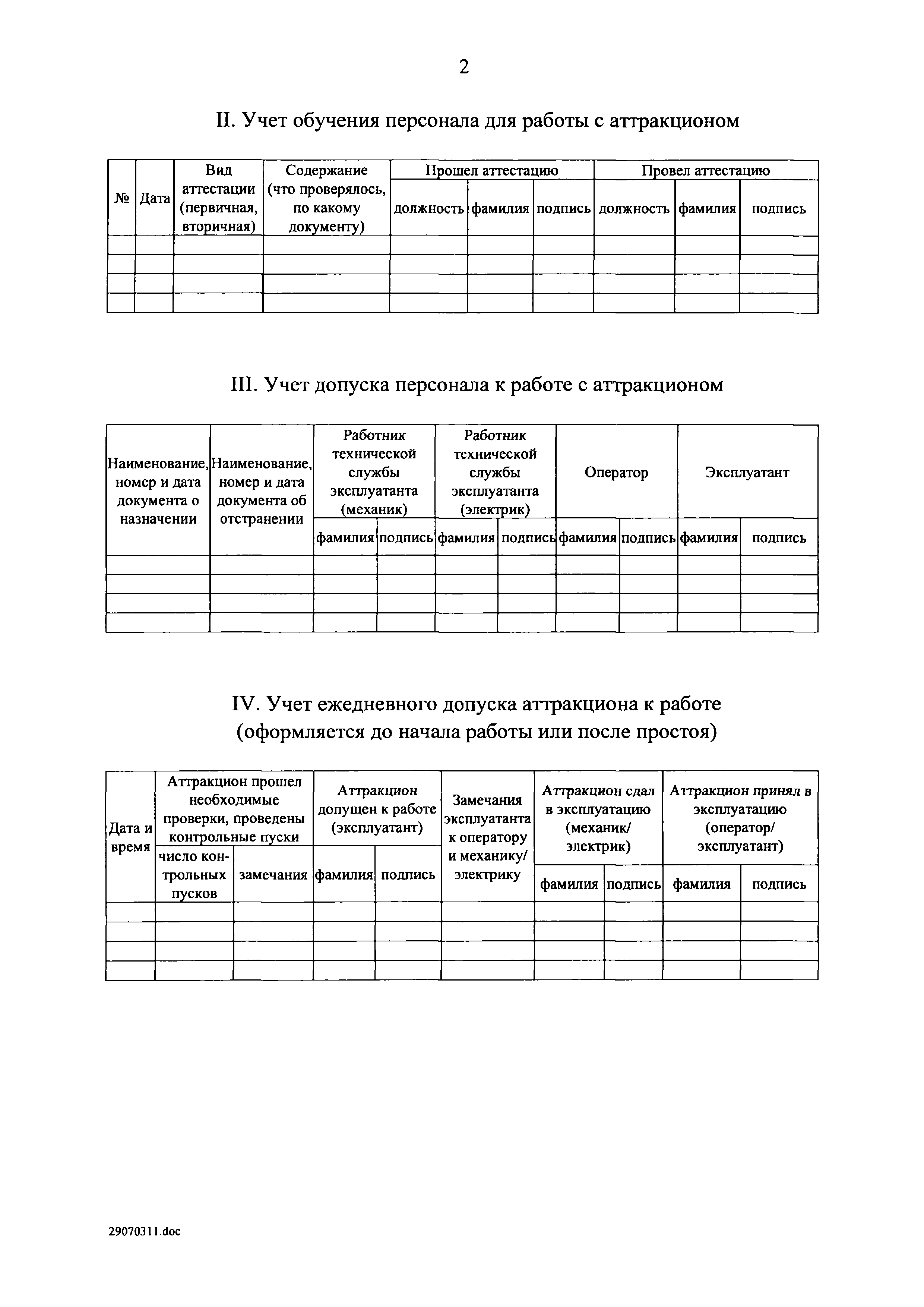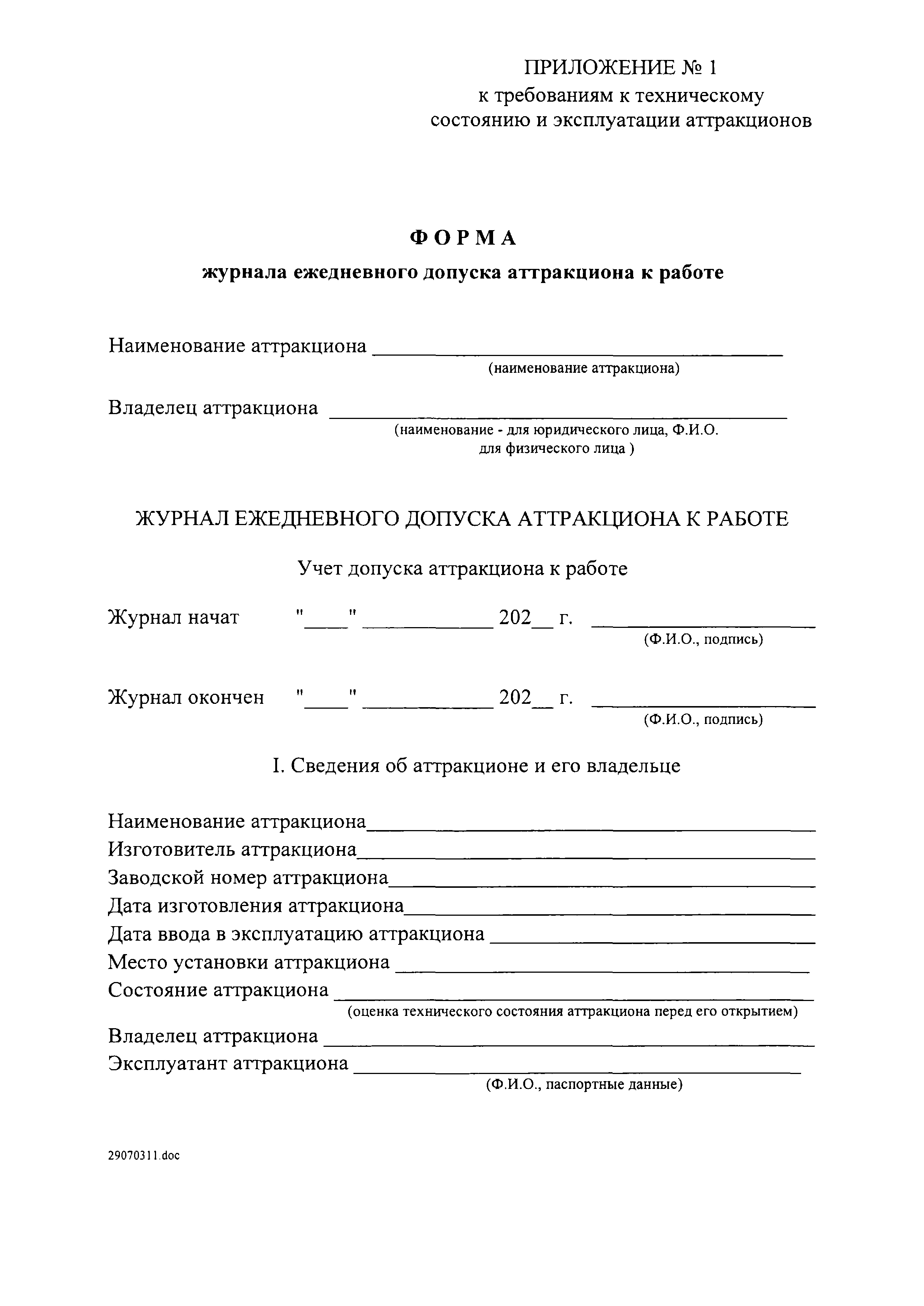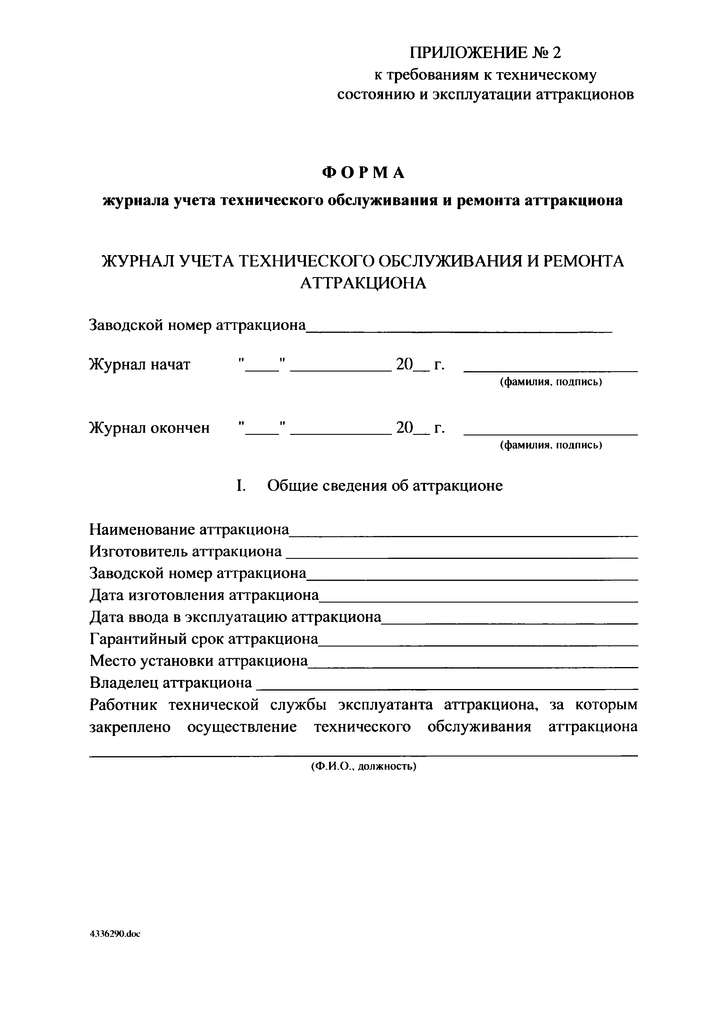 | Оглавление: | I. Область применения II. Основные понятия III. Общие технические требования к аттракционам IV. Требования к техническому состоянию отдельных видов аттракционов V. Общие требования к эксплуатации аттракционов Приложение 1. Форма журнала ежедневного допуска аттракциона к работе Приложение 2. Форма журнала учета технического обслуживания и ремонта аттракциона |