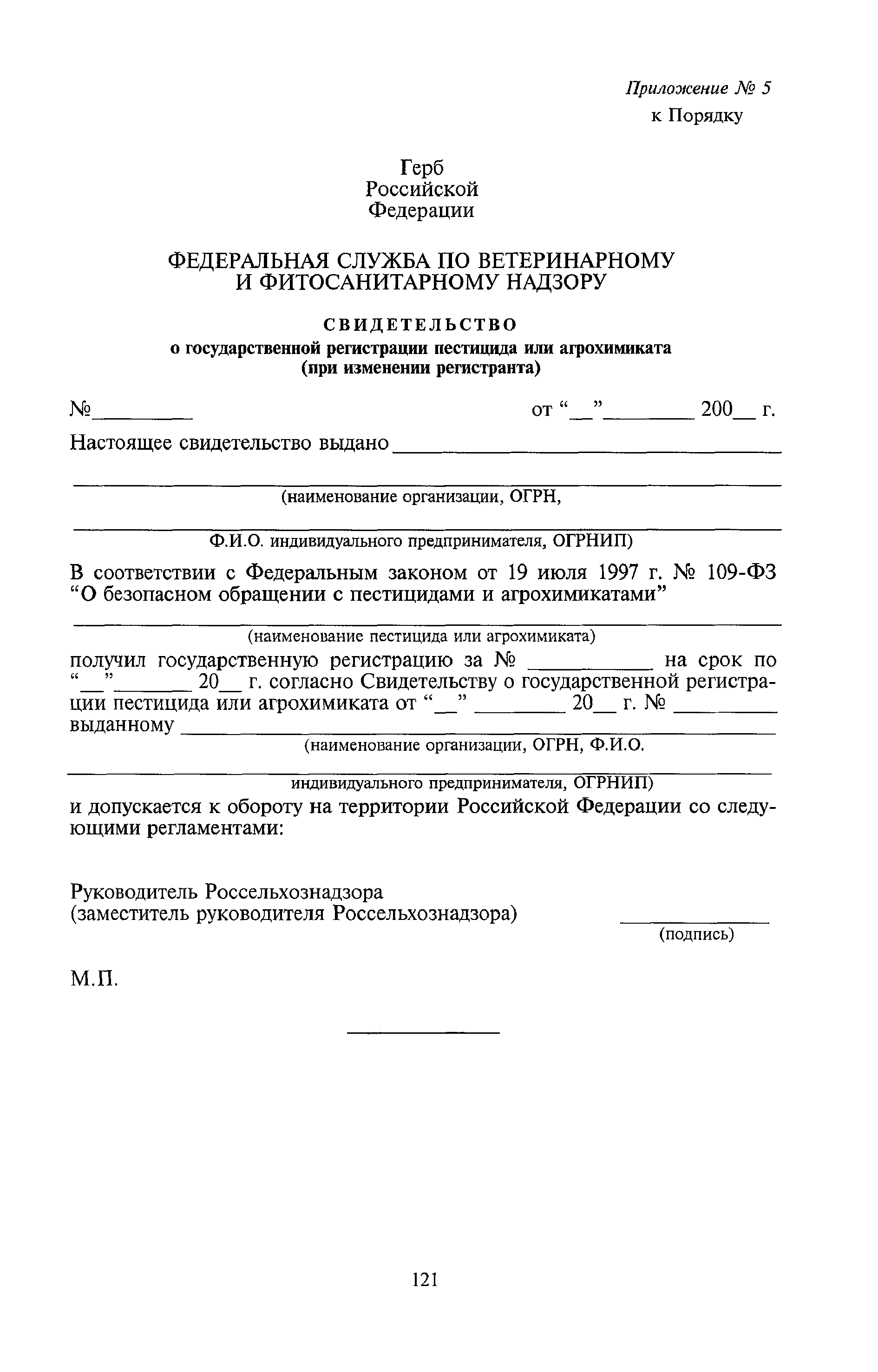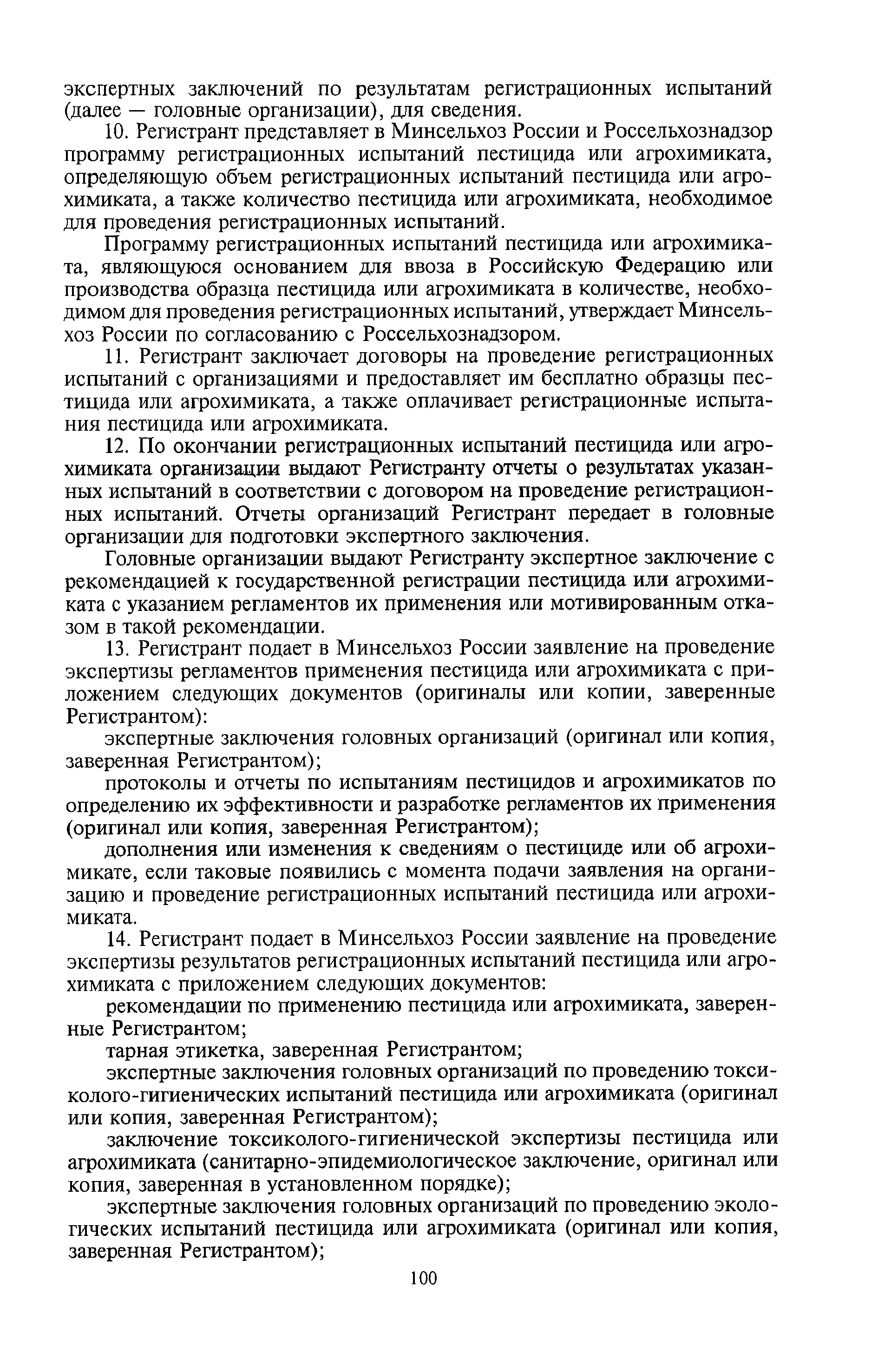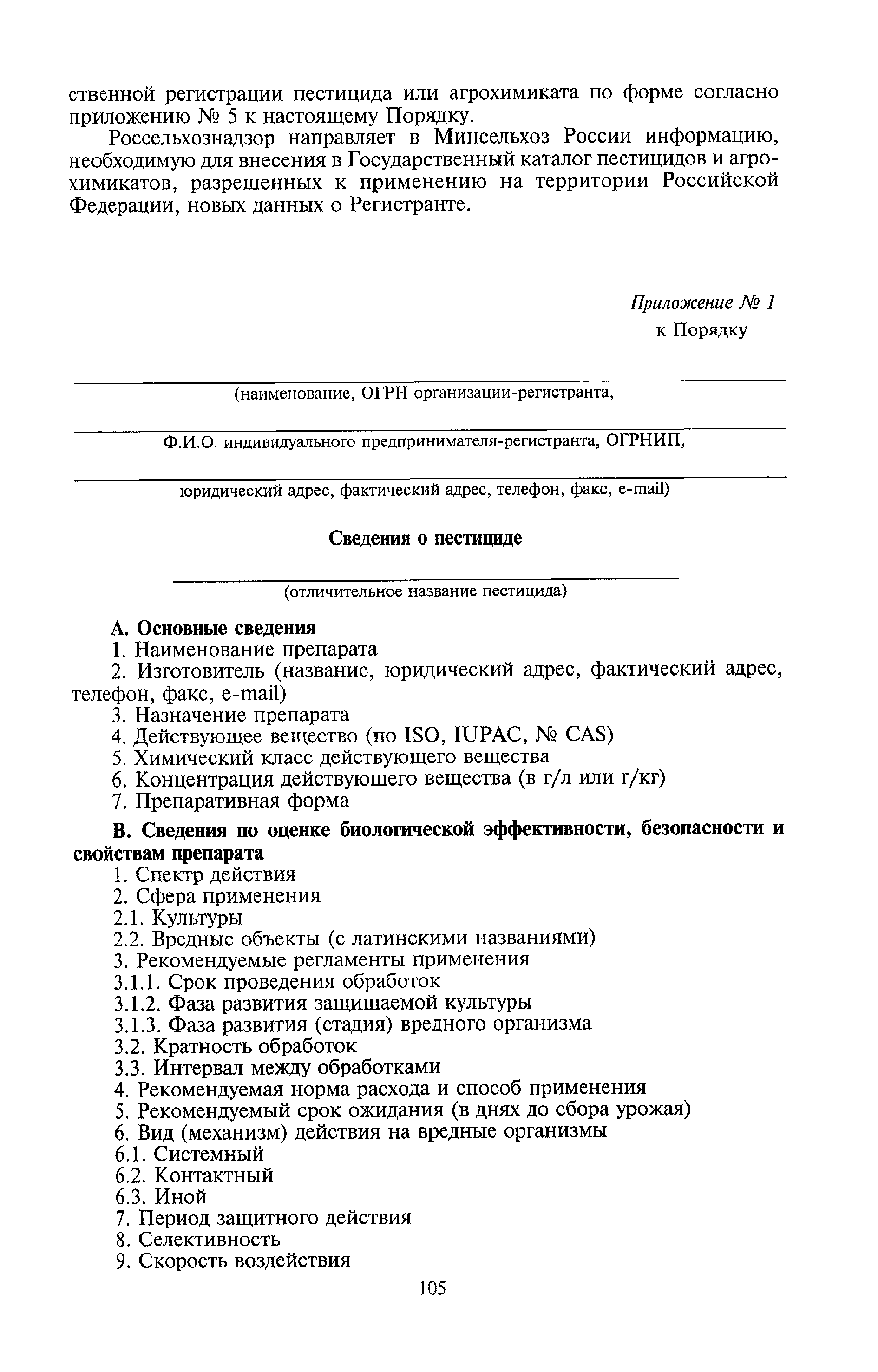| Оглавление: | I. Общие положения II. Организация и проведение регистрационных испытаний пестицида или агрохимиката III. Государственная регистрация пестицидов и агрохимикатов IV. Оформление дополнений к свидетельству о государственной регистрации и свидетельства о государственной регистрации пестицида или агрохимиката при изменении регистранта Приложение № 1. Сведения о пестициде Приложение № 2. Сведения об агрохимикате Приложение № 3. Свидетельство о государственной регистрации пестицида или агрохимиката Приложение № 4. Дополнение об изменении сферы применения и (или) регламентов применения пестицида или агрохимиката к свидетельству о государственной регистрации пестицида или агрохимиката Приложение № 5. Свидетельство о государственной регистрации пестицида или агрохимиката (при изменении регистранта) |
