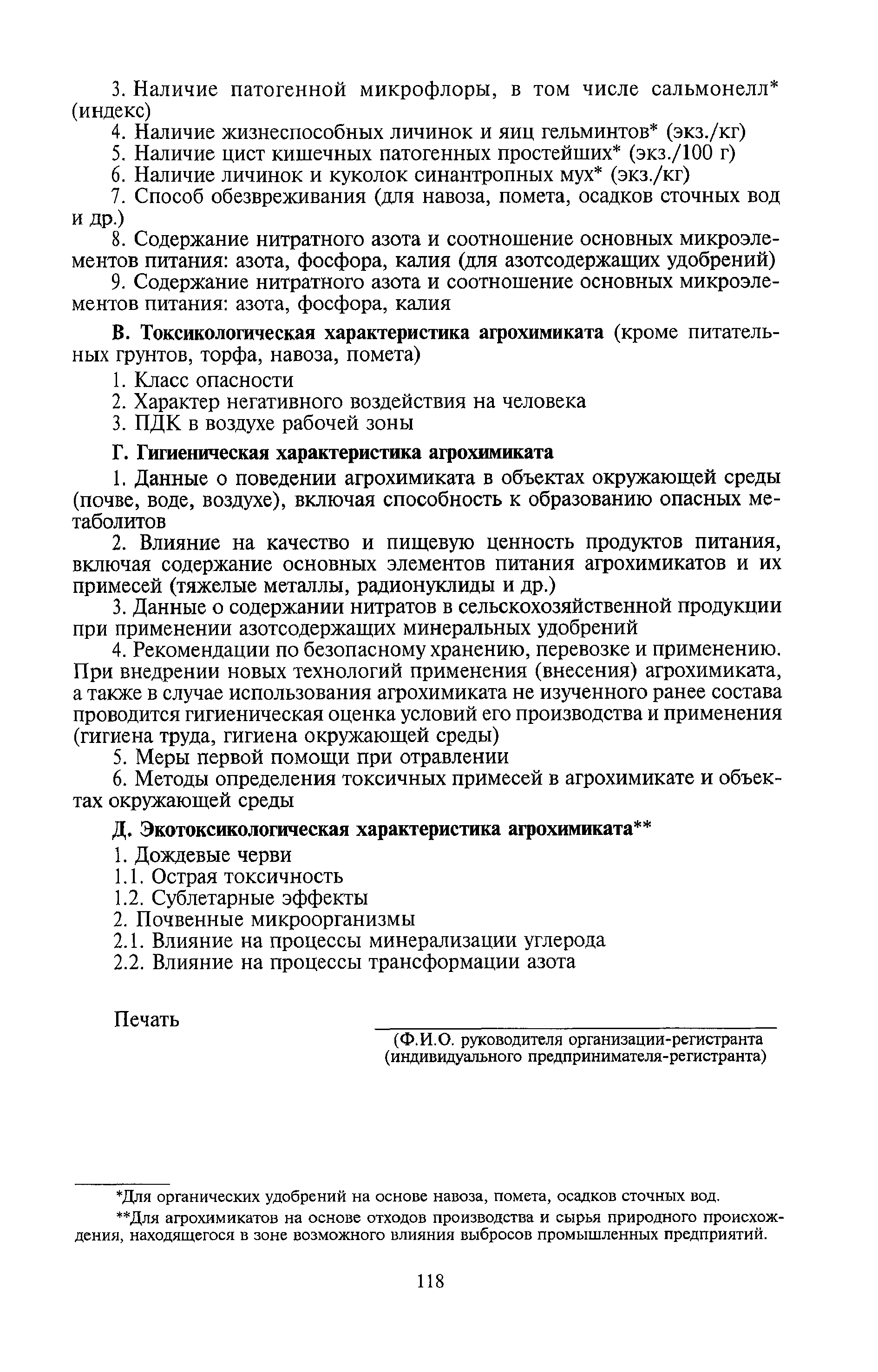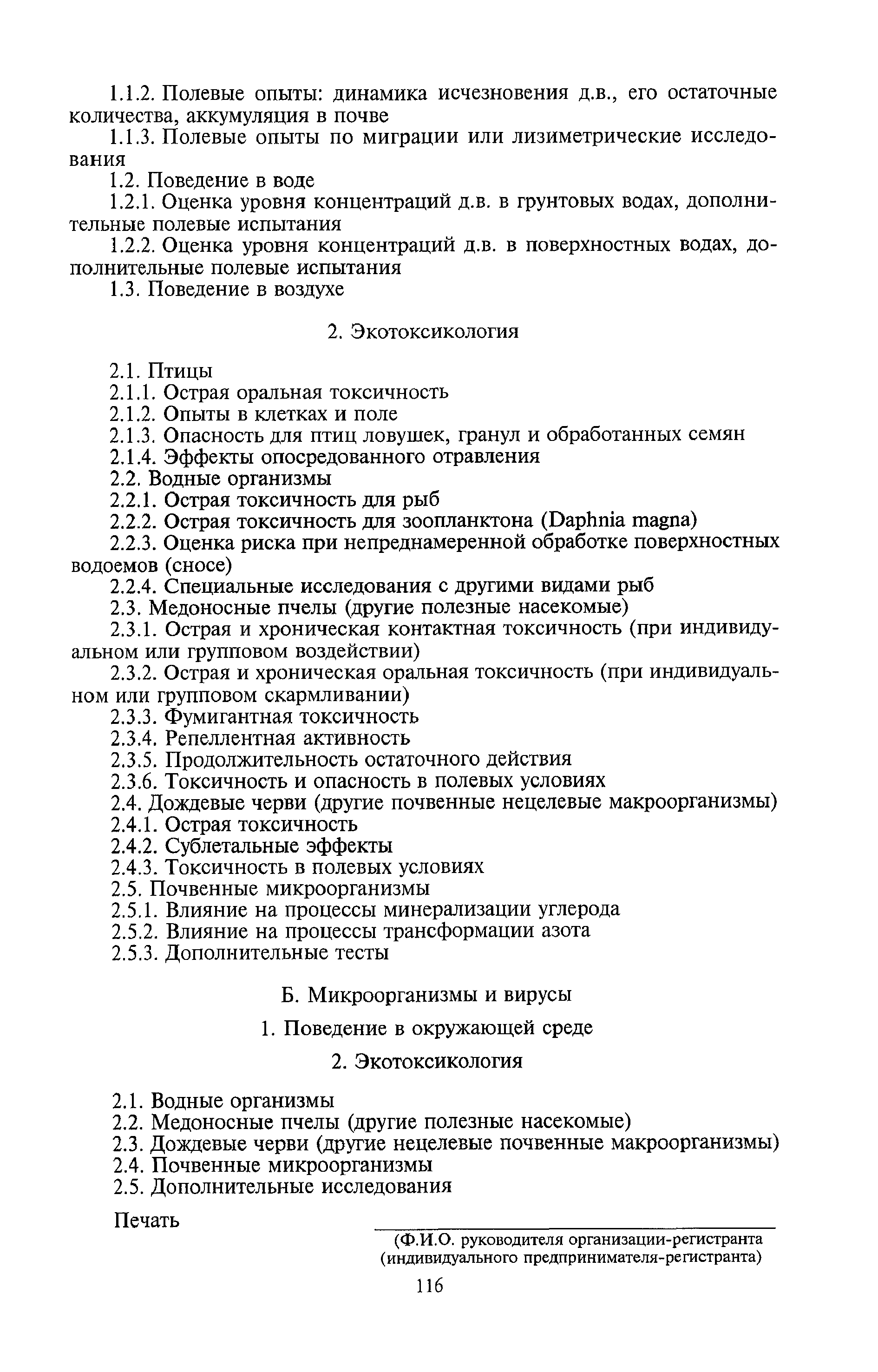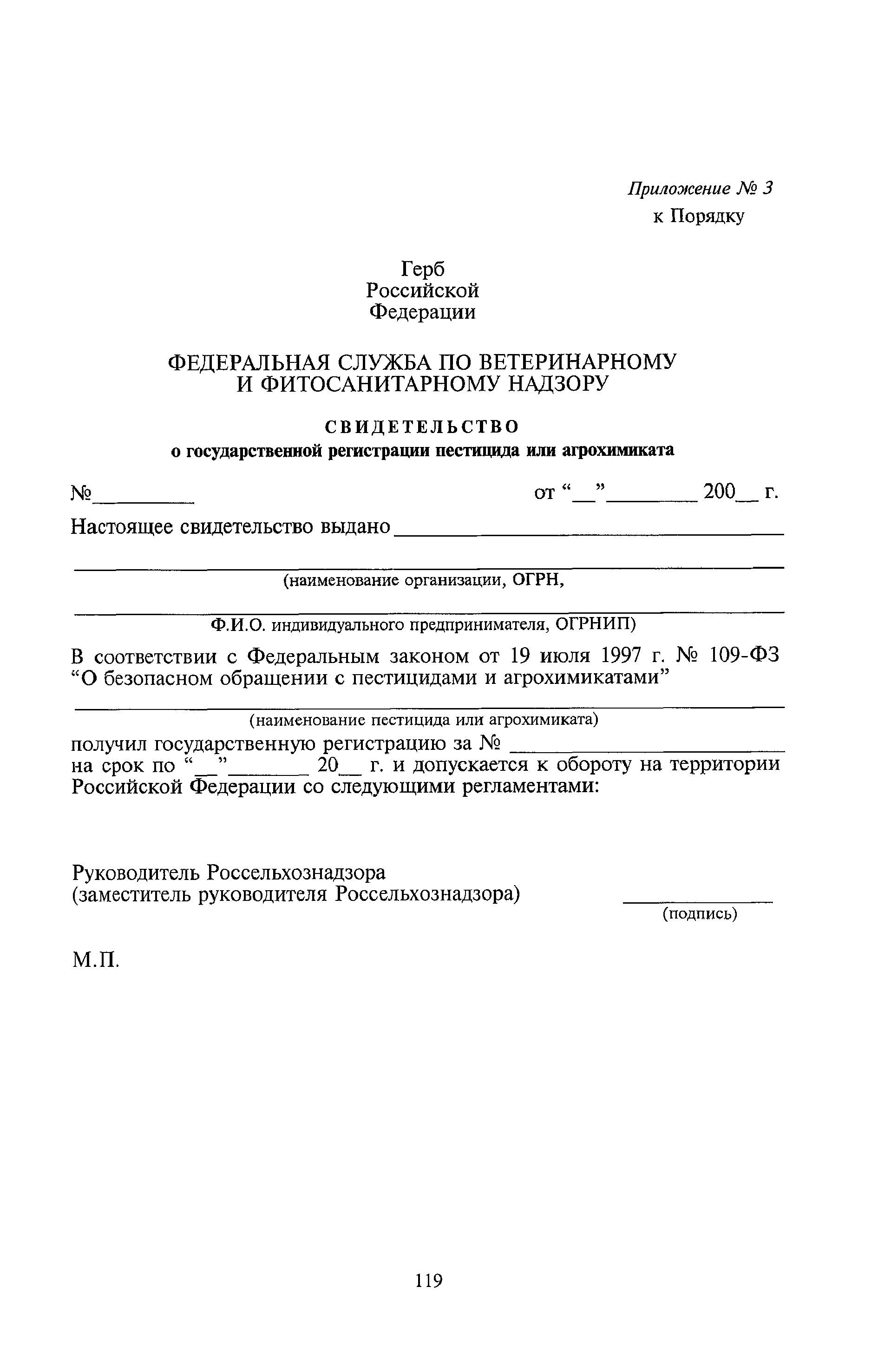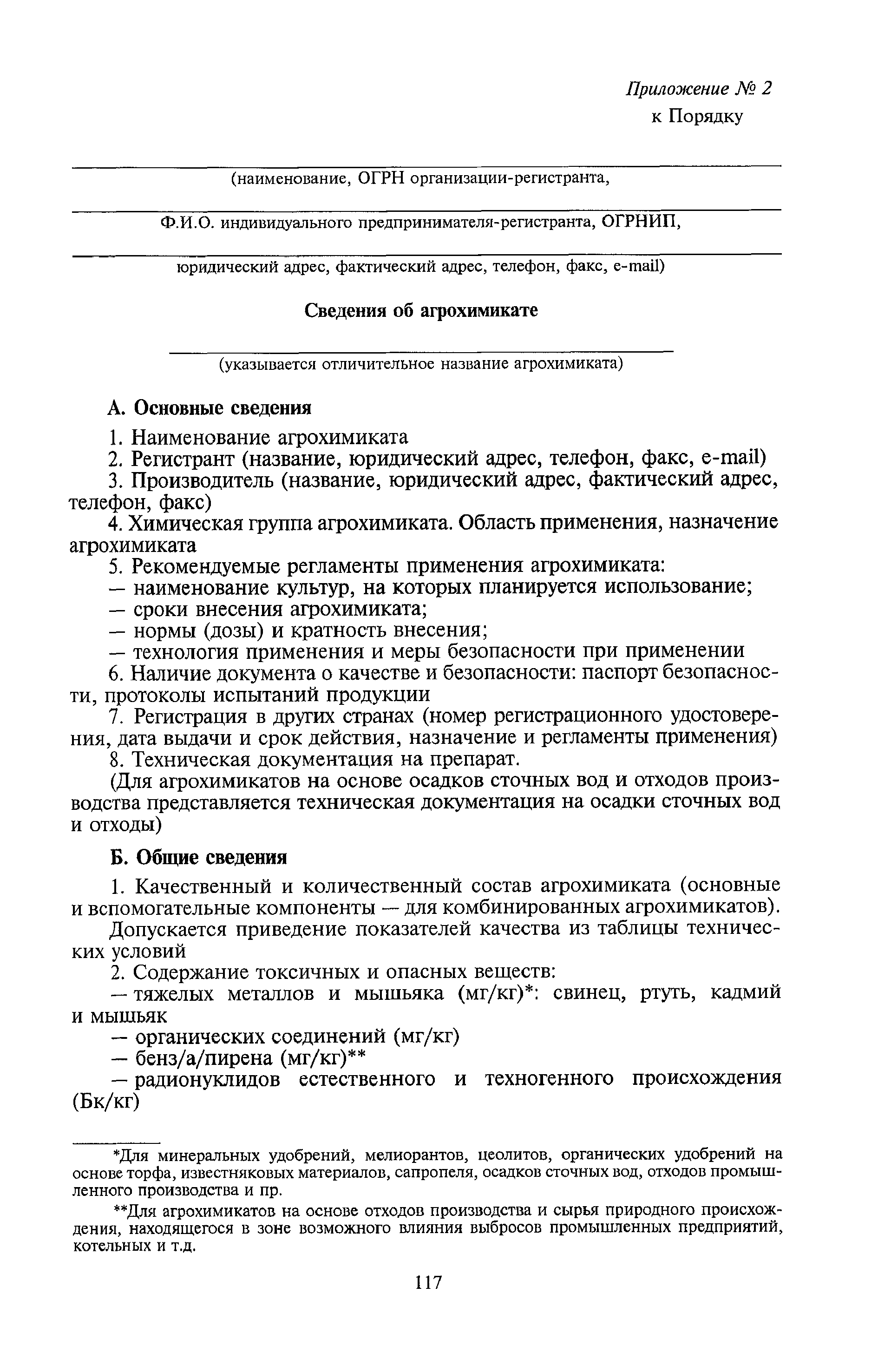 | Оглавление: | I. Общие положения II. Организация и проведение регистрационных испытаний пестицида или агрохимиката III. Государственная регистрация пестицидов и агрохимикатов IV. Оформление дополнений к свидетельству о государственной регистрации и свидетельства о государственной регистрации пестицида или агрохимиката при изменении регистранта Приложение № 1. Сведения о пестициде Приложение № 2. Сведения об агрохимикате Приложение № 3. Свидетельство о государственной регистрации пестицида или агрохимиката Приложение № 4. Дополнение об изменении сферы применения и (или) регламентов применения пестицида или агрохимиката к свидетельству о государственной регистрации пестицида или агрохимиката Приложение № 5. Свидетельство о государственной регистрации пестицида или агрохимиката (при изменении регистранта) |