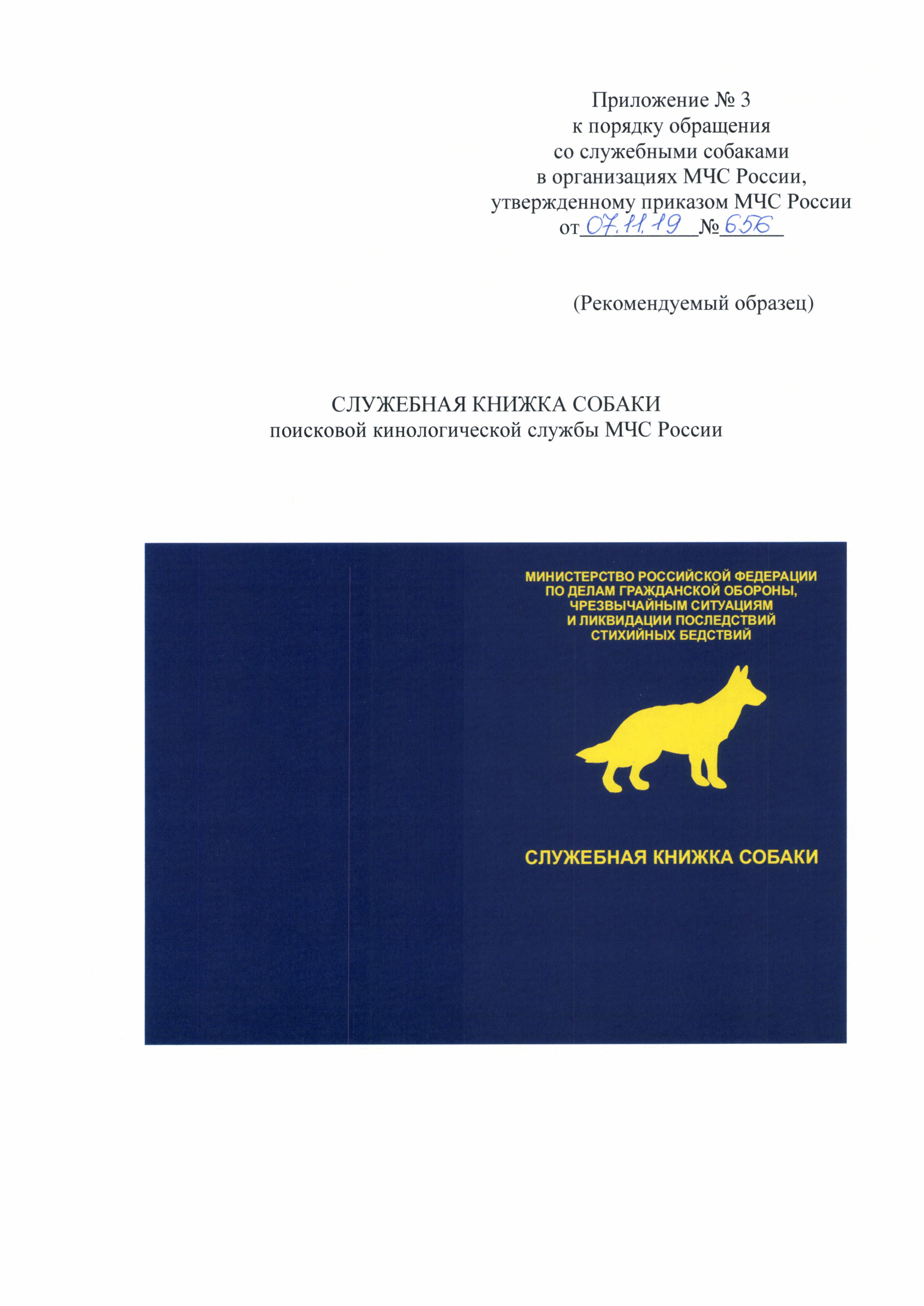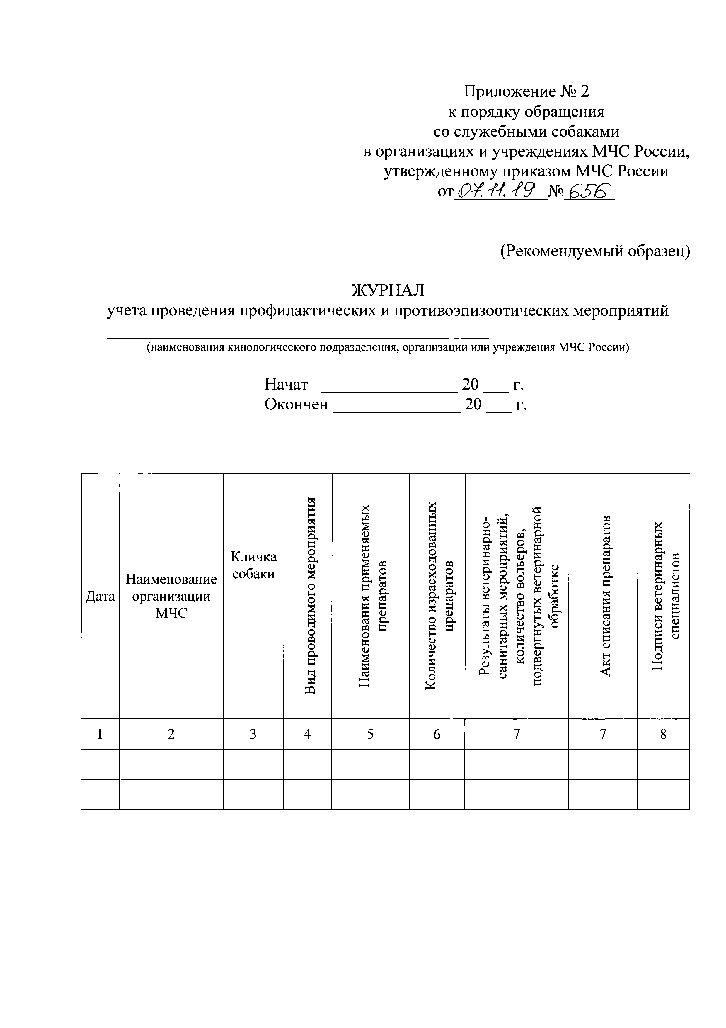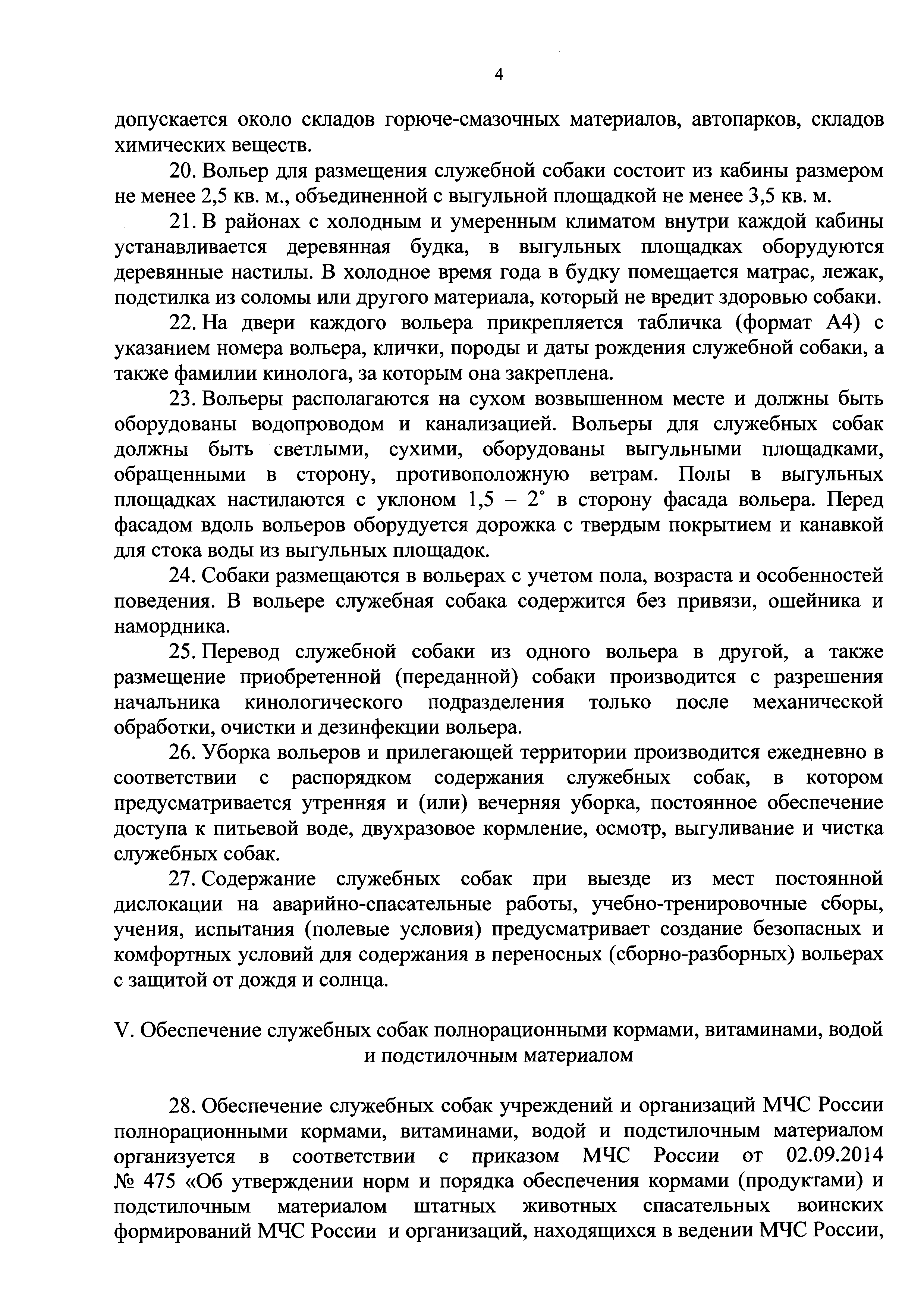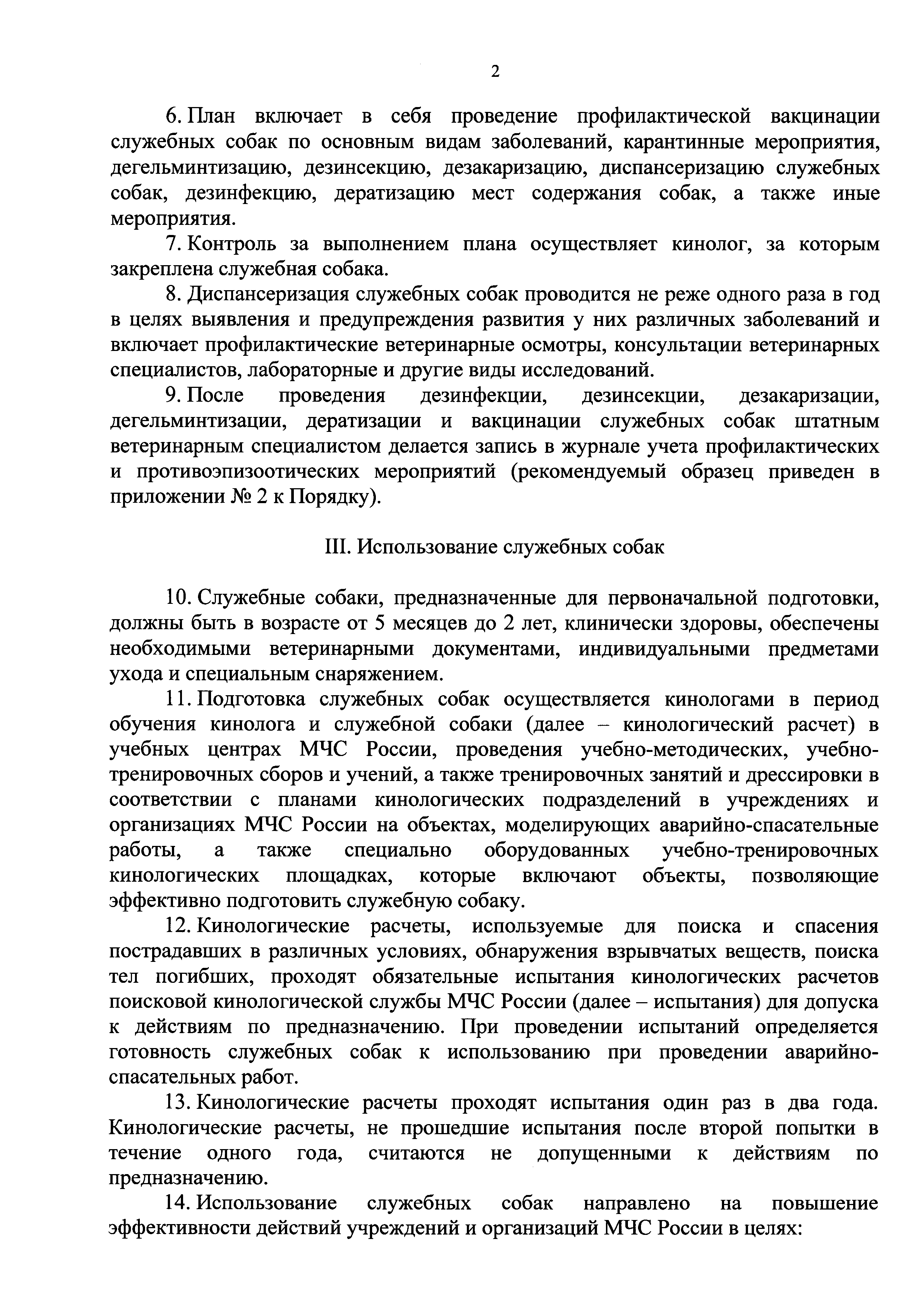 Порядок обращения со служебными животными в учреждениях и организациях Министерства Российской Федерации по делам гражданской обороны, чрезвычайным ситуациям и ликвидации последствий стихийных бедствий| Статус: | действует | | Название рус.: | Порядок обращения со служебными животными в учреждениях и организациях Министерства Российской Федерации по делам гражданской обороны, чрезвычайным ситуациям и ликвидации последствий стихийных бедствий | | Дата добавления в базу: | 01.01.2021 | | Дата актуализации: | 01.01.2021 | | Дата введения: | 10.02.2020 | | Область применения: | Порядок обращения со служебными животными в учреждениях и организациях Министерства Российской Федерации по делам гражданской обороны, чрезвычайным ситуациям и ликвидации последствий стихийных бедствий разработан в целях совершенствования деятельности учреждений и организаций МЧС России, использующих служебных собак, регулирует вопросы, связанные с осуществлением военнослужащими, работниками, сотрудниками учреждений и организаций МЧС России служебных собак, а также устанавливает требования к содержанию, ветеринарному обслуживанию, использованию, размещению и кормлению служебных собак, предназначенных для поиска и спасения пострадавших в различных условиях, обнаружения взрывчатых веществ, поиска тел погибших, охраны объектов спасательных воинских формирований МЧС России | | Оглавление: | I. Общие положения II. Ветеринарное обслуживание служебных собак III. Использование служебных собак IV. Требования к размещению служебных собак и оборудованию вольеров V. Обеспечение служебных собак полнорационными кормами, витаминами, водой и подстилочным материалом Приложение № 1. Рекомендуемый образец плана проведения основных профилактических и противоэпизоотических мероприятий Приложение № 2. Рекомендуемый образец журнала учета проведения профилактических и противоэпизоотических мероприятий Приложение № 3. Рекомендуемый образец служебной книжки собаки поисковой кинологической службы МЧС России | | Утверждён: | 07.11.2019 Министерство Российской Федерации по делам гражданской обороны, чрезвычайным ситуациям и ликвидации последствий стихийных бедствий (656)