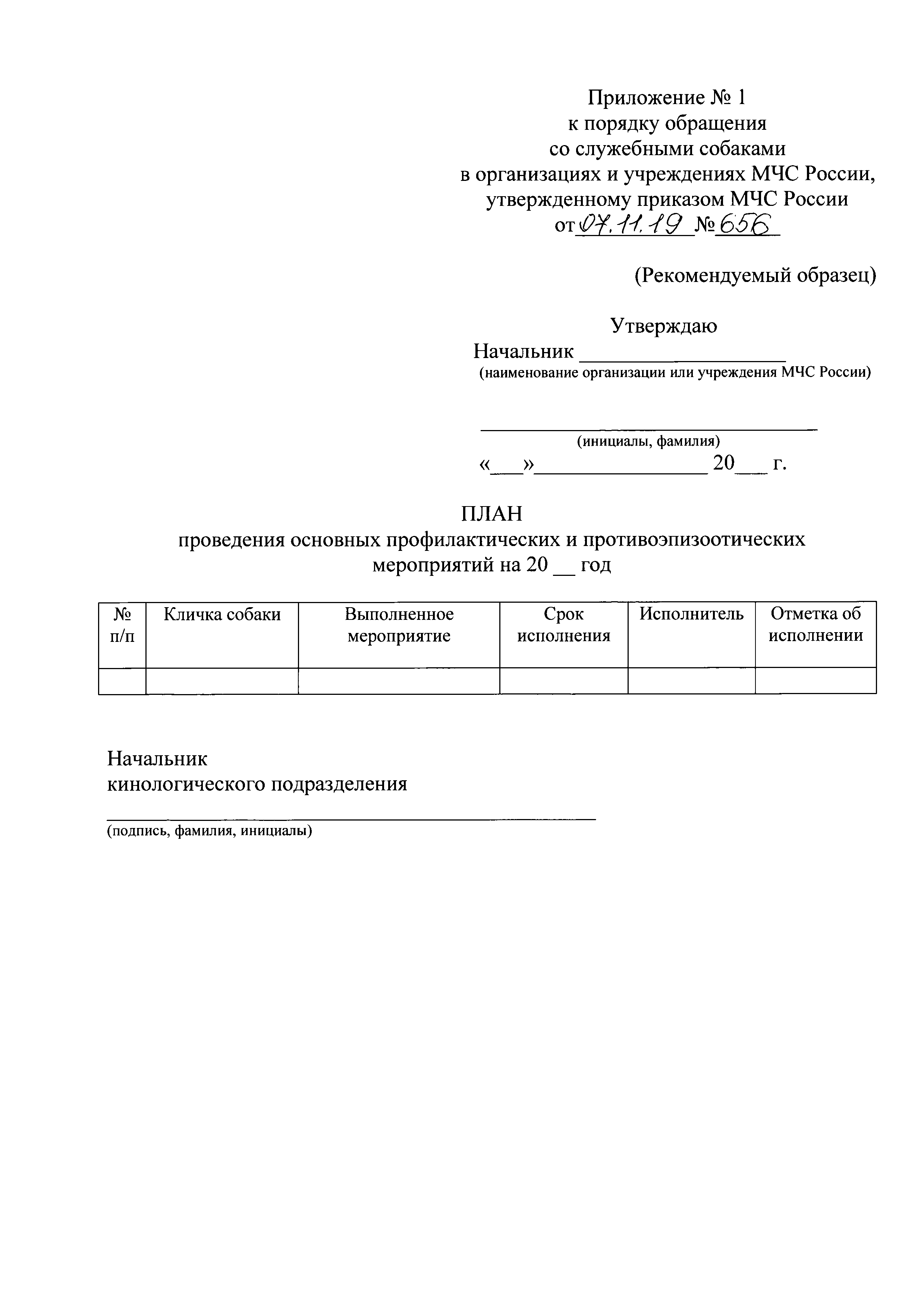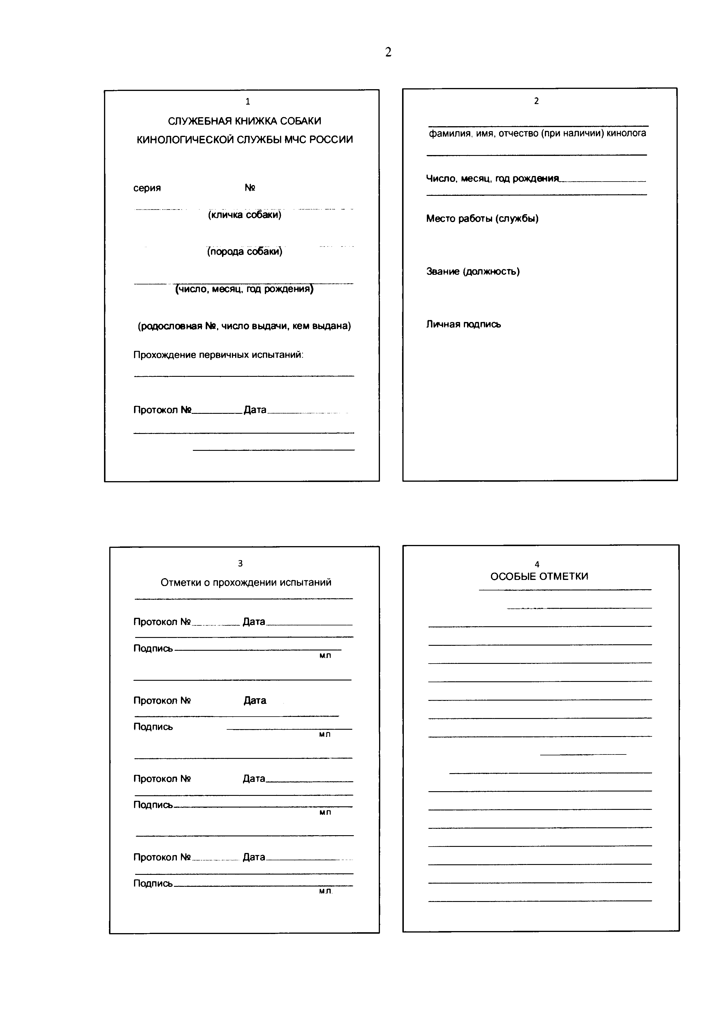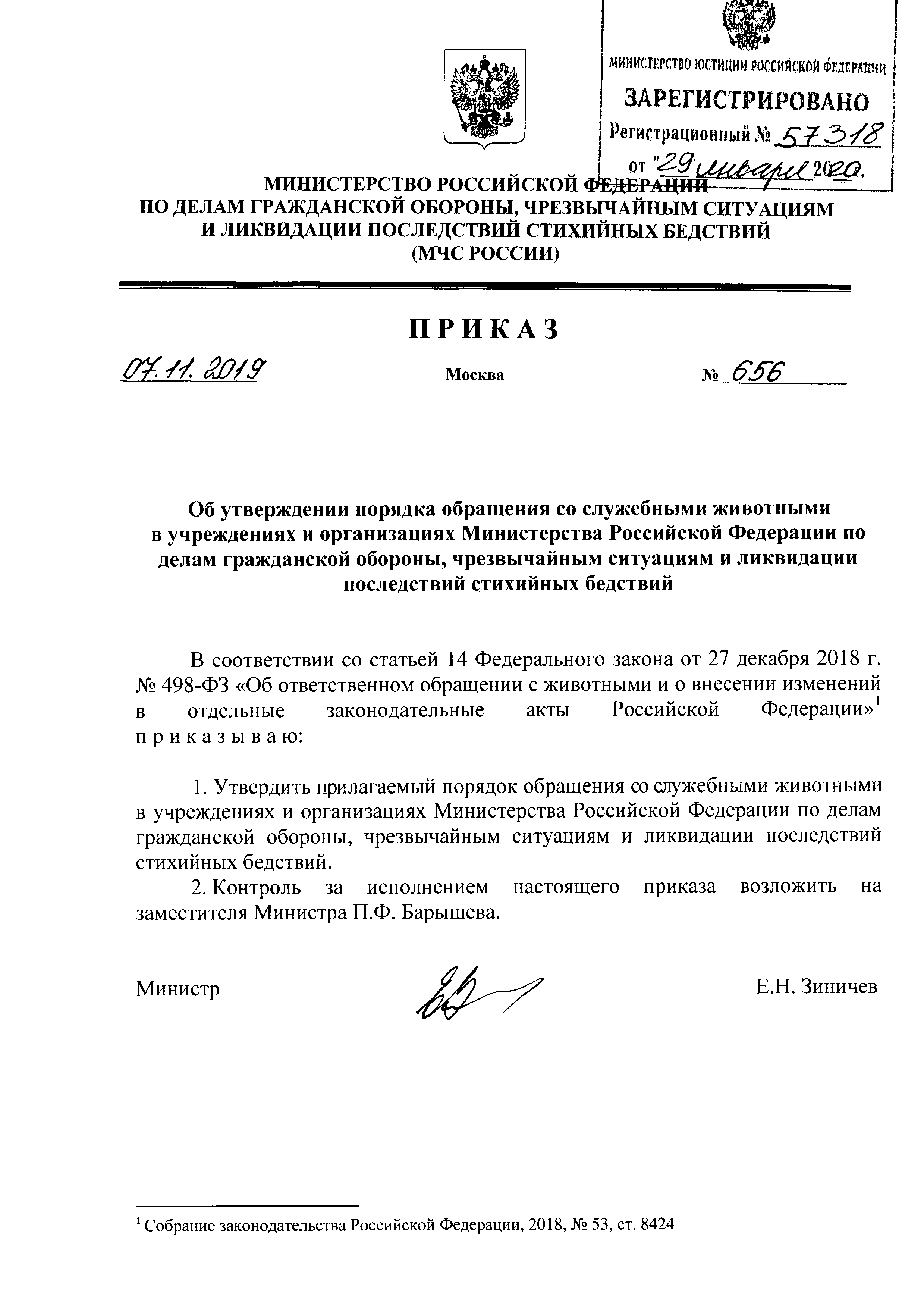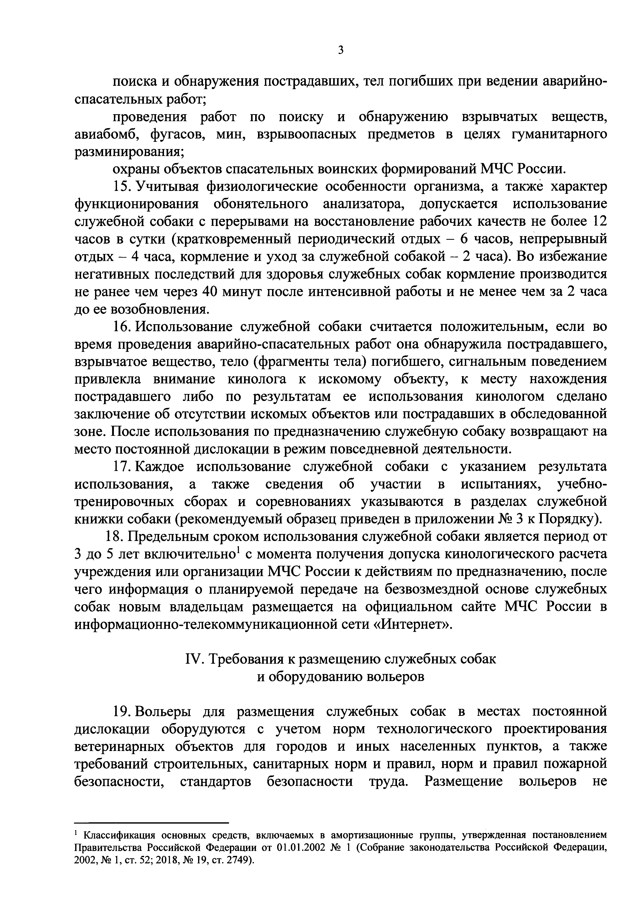 Порядок обращения со служебными животными в учреждениях и организациях Министерства Российской Федерации по делам гражданской обороны, чрезвычайным ситуациям и ликвидации последствий стихийных бедствий| Статус: | действует | | Название рус.: | Порядок обращения со служебными животными в учреждениях и организациях Министерства Российской Федерации по делам гражданской обороны, чрезвычайным ситуациям и ликвидации последствий стихийных бедствий | | Дата добавления в базу: | 01.01.2021 | | Дата актуализации: | 01.01.2021 | | Дата введения: | 10.02.2020 | | Область применения: | Порядок обращения со служебными животными в учреждениях и организациях Министерства Российской Федерации по делам гражданской обороны, чрезвычайным ситуациям и ликвидации последствий стихийных бедствий разработан в целях совершенствования деятельности учреждений и организаций МЧС России, использующих служебных собак, регулирует вопросы, связанные с осуществлением военнослужащими, работниками, сотрудниками учреждений и организаций МЧС России служебных собак, а также устанавливает требования к содержанию, ветеринарному обслуживанию, использованию, размещению и кормлению служебных собак, предназначенных для поиска и спасения пострадавших в различных условиях, обнаружения взрывчатых веществ, поиска тел погибших, охраны объектов спасательных воинских формирований МЧС России | | Оглавление: | I. Общие положения II. Ветеринарное обслуживание служебных собак III. Использование служебных собак IV. Требования к размещению служебных собак и оборудованию вольеров V. Обеспечение служебных собак полнорационными кормами, витаминами, водой и подстилочным материалом Приложение № 1. Рекомендуемый образец плана проведения основных профилактических и противоэпизоотических мероприятий Приложение № 2. Рекомендуемый образец журнала учета проведения профилактических и противоэпизоотических мероприятий Приложение № 3. Рекомендуемый образец служебной книжки собаки поисковой кинологической службы МЧС России | | Утверждён: | 07.11.2019 Министерство Российской Федерации по делам гражданской обороны, чрезвычайным ситуациям и ликвидации последствий стихийных бедствий (656)